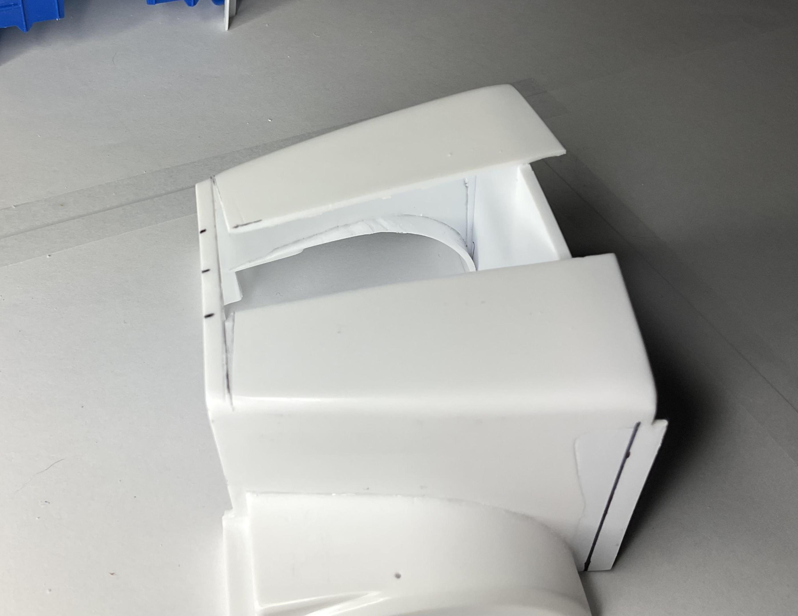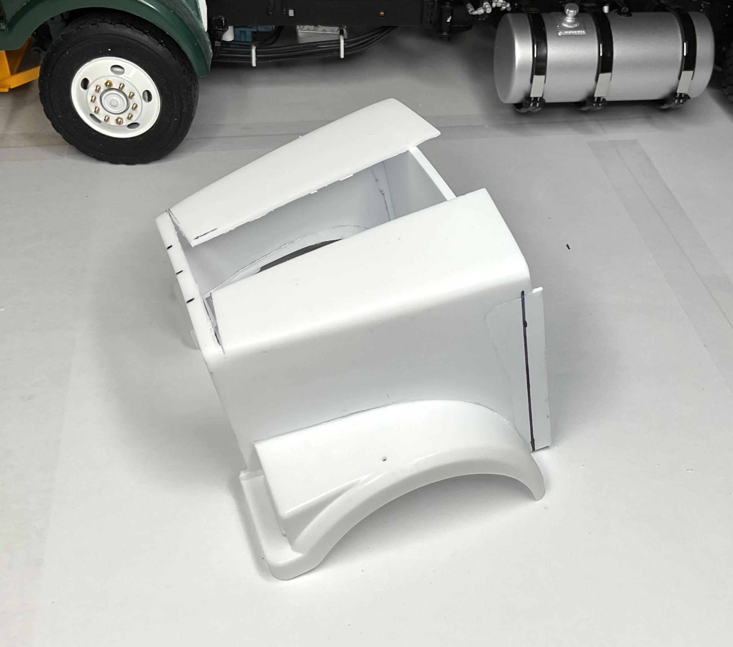 Western Star 4900 FA plow truckBK9300 replied to BK9300's topic in WIP: Model Trucks: Big Rigs and Heavy Equipment Progress being made on the hood - thankfully, things are going back together without too much of a struggle, but a good bit to go yet. Side panels have been glued back in their new position on the fenders - started to mark out the cut line at the back edge of the hood. I also have a 2mm thick profile piece temporarily glued in place to help keep the fenders lined up while the glue sets. Thankfully, there won't be too much putty work need on the fenders - not the same for the top of the hood! Similar to previous pic, but this angle shows better an unexpected benefit from doing the widening at the back of the hood - it will allow for an inner fender very similar to a real WS hood Used hood - may have a go at the inner support brace as well Will carry on with putting the top of hood back together tomorrow!