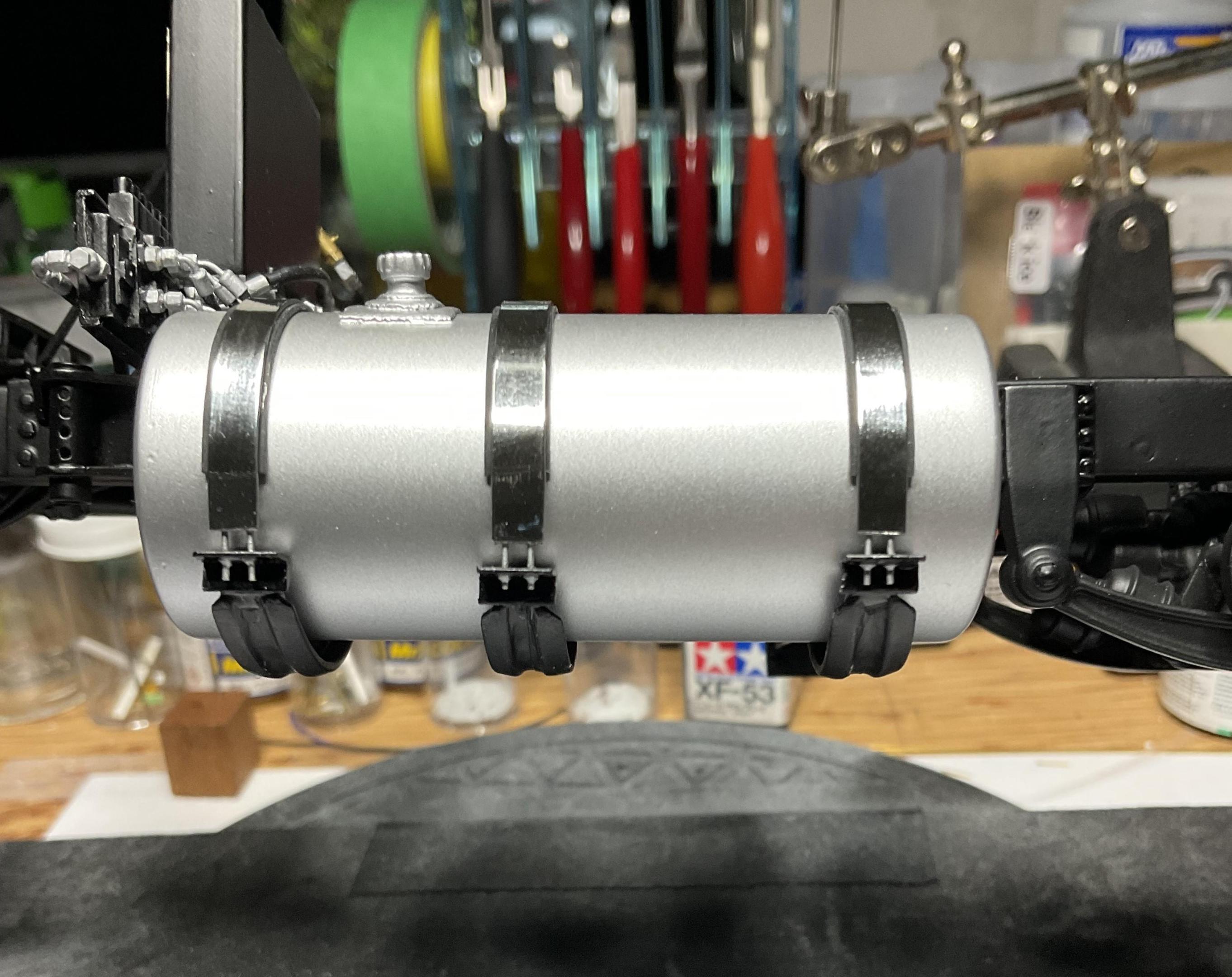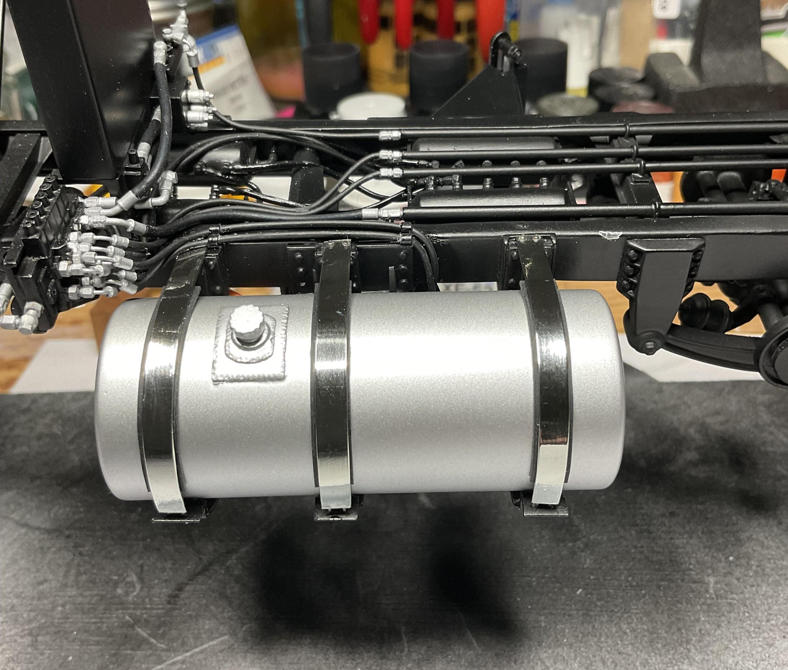 Thanks Guys - appreciate it! Good day today - and a big step towards finishing the fuel tank. Just need to make a semblance of a sending unit and it will be done. Pic of the real truck - this was the goal Very happy with results. . .quite anxious process using slow setting CA glue and not have it leak out the sides of the straps Placed a little blob of epoxy on the bolts, on inside of angle iron to add to some strength to strap. Painted them aluminum to represent the nuts A few hours left today - might get a start on the sending unit! Always appreciate your comments - take care! -