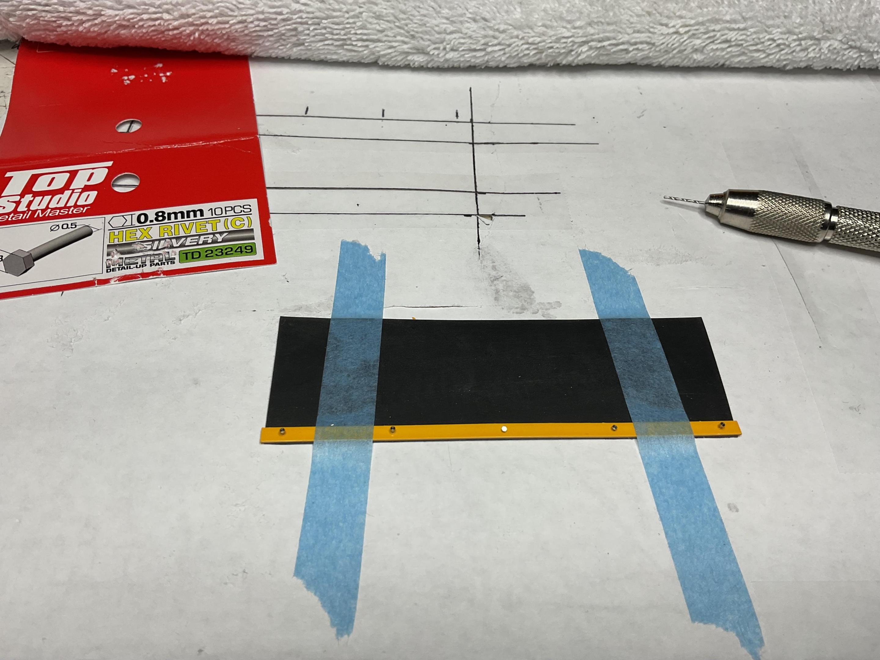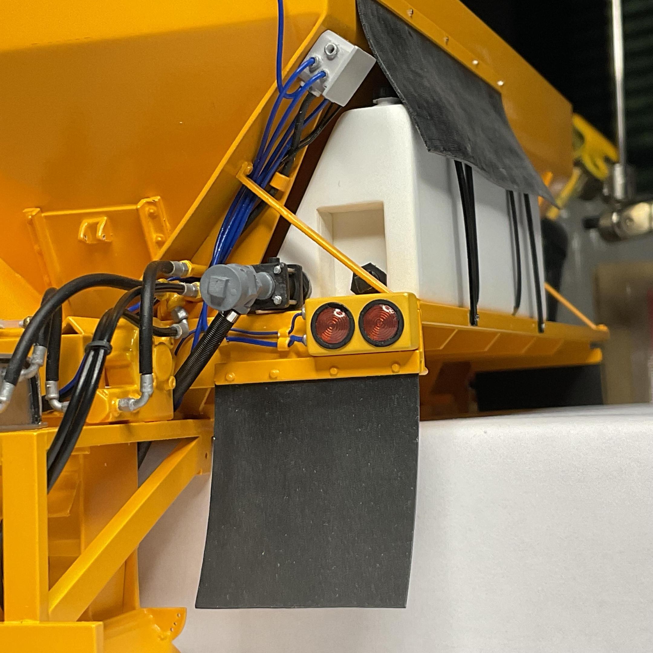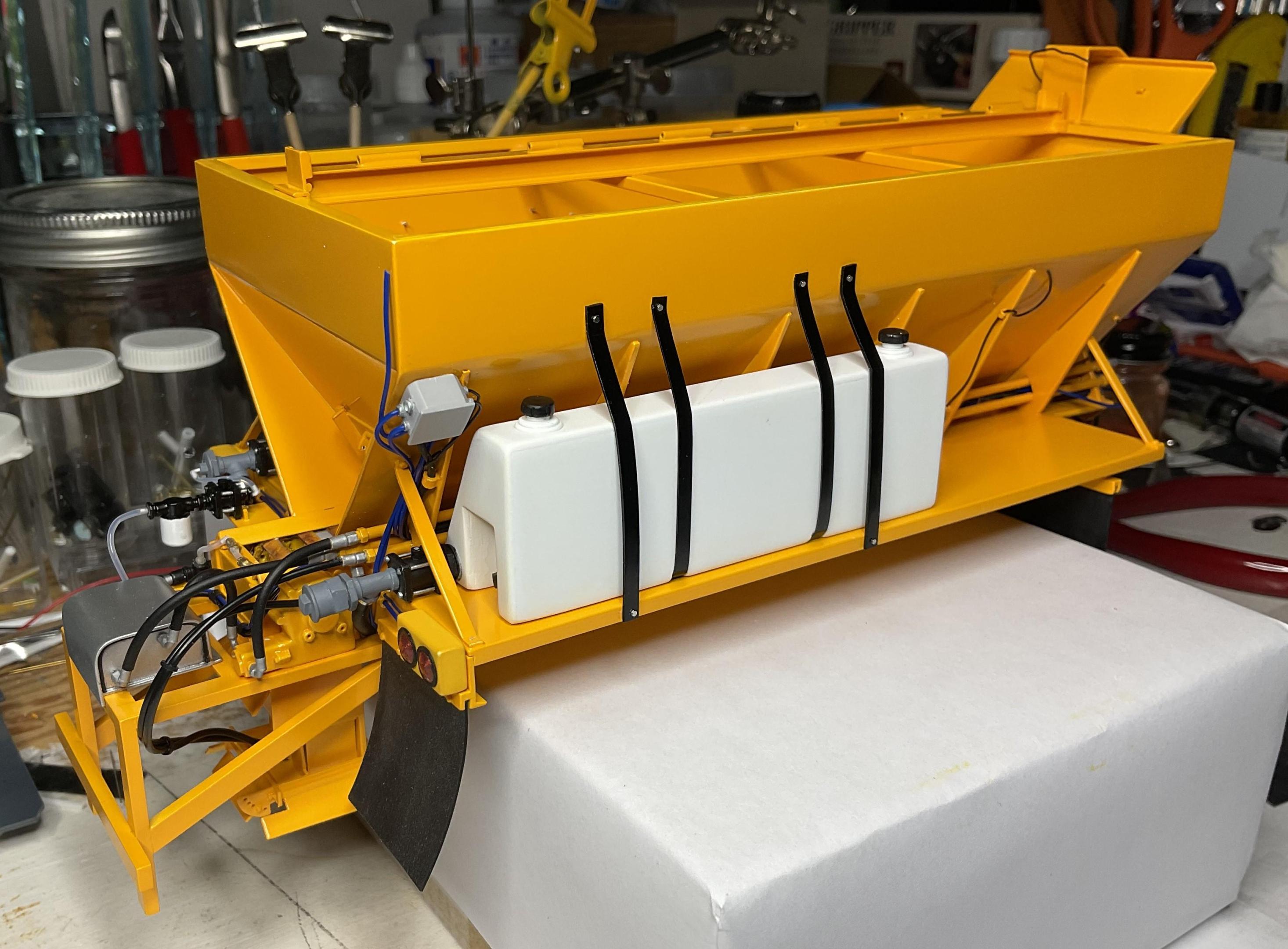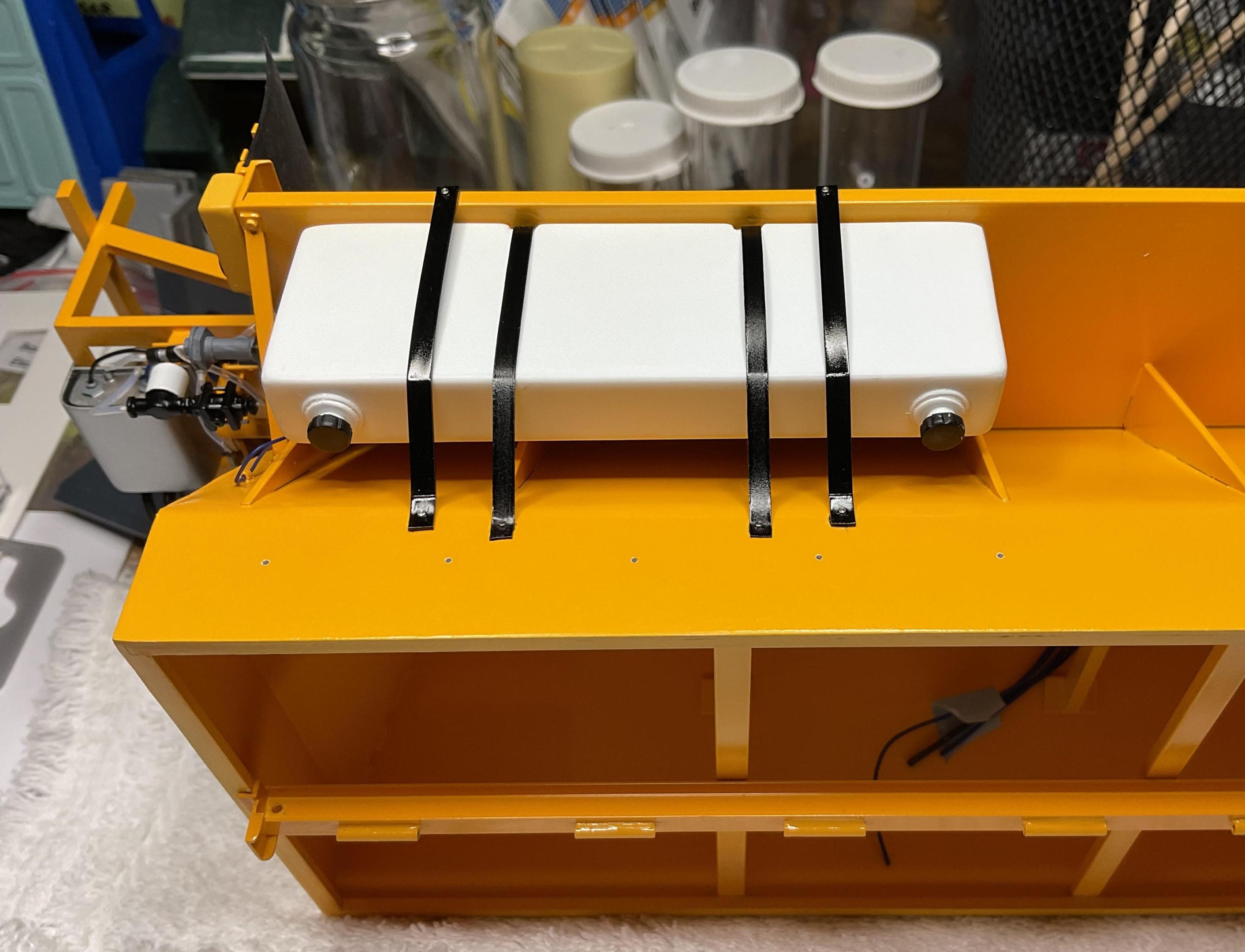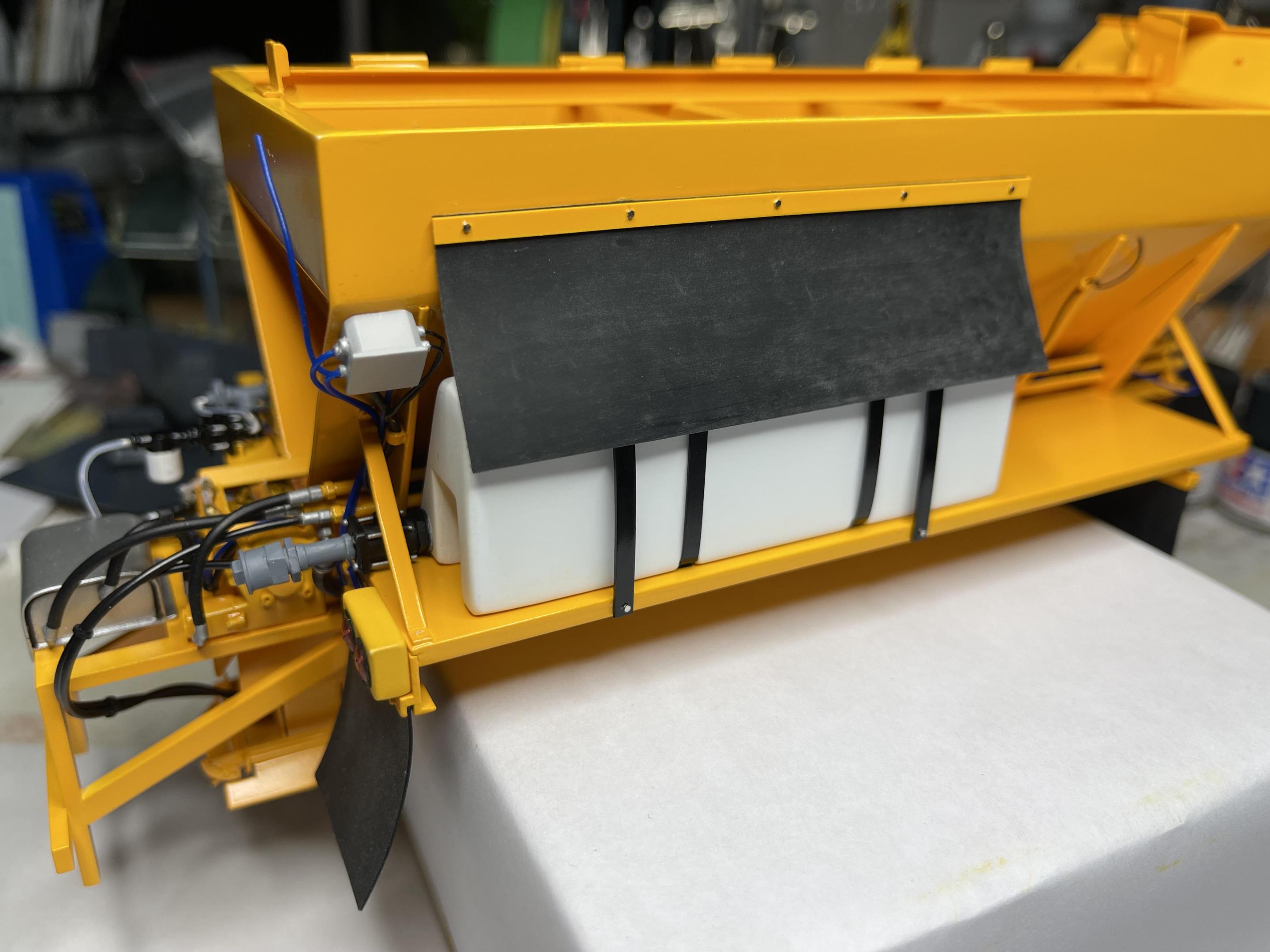 Back at it again. . .Nothing to update on 3D printing the console but I am waiting to hear back from one local company soon. So, I carried on with - you guessed it - the sander. The pre-wet tanks on the sander fenders are held in place with strapping and some brackets that are mounted on the fenders, lower edge of the front and back of the tanks (I still need to make those). The tanks also have a second set of sturdier straps that appear to provide some support for the rubber skirt/cover attached to the side of the sander (I am told these skirts keep sand/salt loaded into the sander from accumulating on top of the tanks). Some pics of the last few days work - Early in the week, had cut out and painted all the strapping needed for the tanks; pre-drilled the skirt support straps and secured Top Studio rivet ('bolts'!) on the end of each one with a bit of CA glue. I also pre-drilled bolt holes in the edge of the fenders for the bolts Support straps bolted in place; the tank hold down straps needed to be glued with styrene glue and left to set before I could handle them and determine where to drill holes for the top of the straps in the sander body; cut out the skirt from my sheet of 0.5mm silicone rubber, scuffed it up and painted a strap to attach it to the sander All support straps and hold down straps (both sides) are now 'bolted' in place Had pre-drilled holes in strap and used them to align slightly smaller pilot holes in the skirt - this made it easier to push the bolts through the rubber, but also held them in place with friction when I went to glue them in place on the sander Slightly bigger diameter bolt holes pre-drilled in sides of sander. I made them a bit bigger so I could apply thin CA glue to the bolts from the inside of sander and have it wick in the bolt holes This was fun - I placed a spot of slow drying CA glue on each of the pre-drilled holes and then had some (lots of!) difficulty getting each bolt into its respective bolt hole in the sander before the glue set too much - more than a little stressful! The real truck has bungee cords at the lower corners of the rubber skirt holding it from flapping around at speed - don't quite know yet if I can make anything at scale that will do that job; I have a couple ideas but first attempt looked too big, so will keep thinking! Decals from STS were shipped yesterday. When I get those in place, will still need to finish wiring lights on back of sander, including front and rear roto lights and attach the ladder to the driver's side of the sander. Getting close to finishing the sander - its been a model unto itself! Still have lots to do on the truck overall and will keep the updates coming! Always appreciate you stopping in! -
