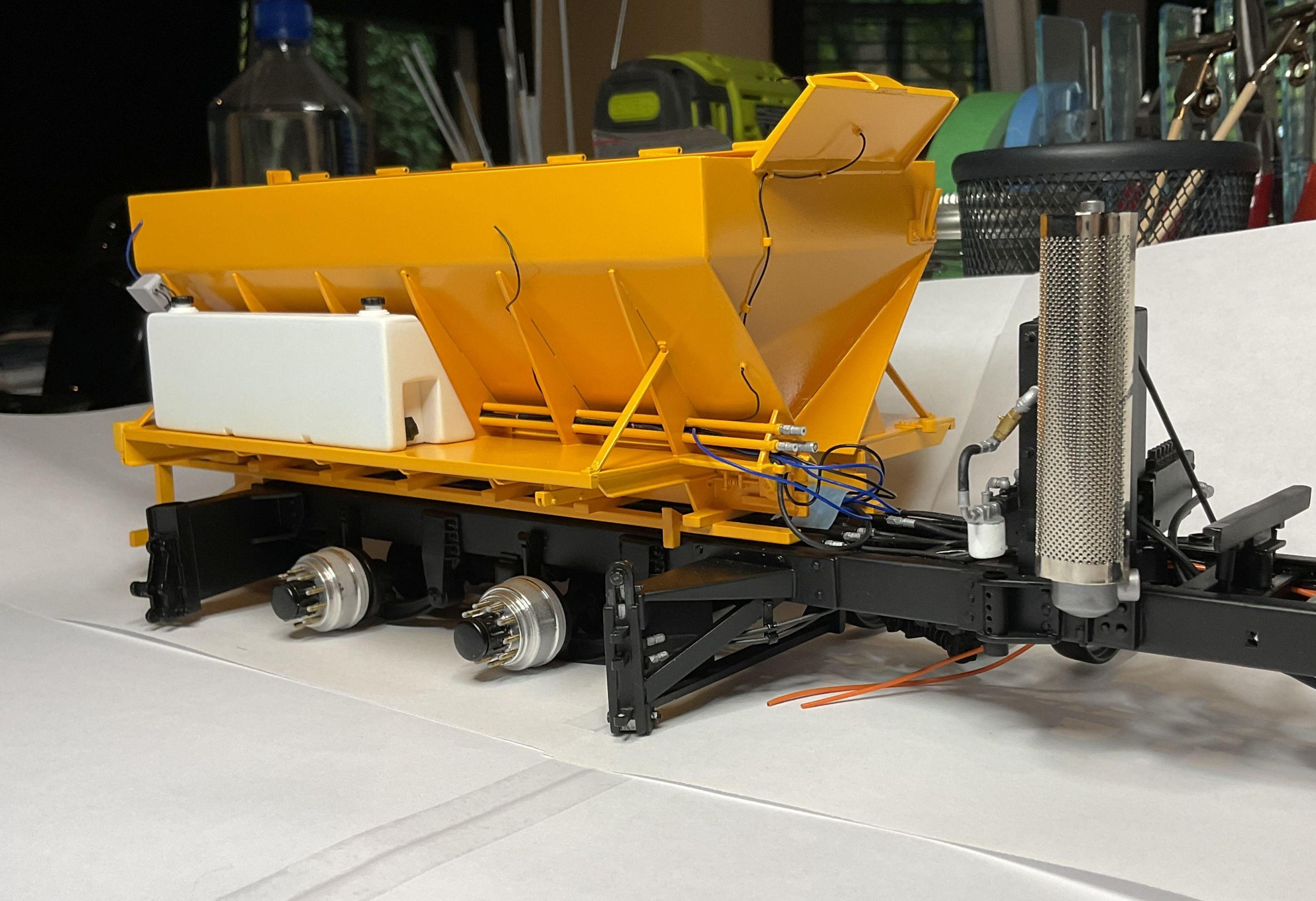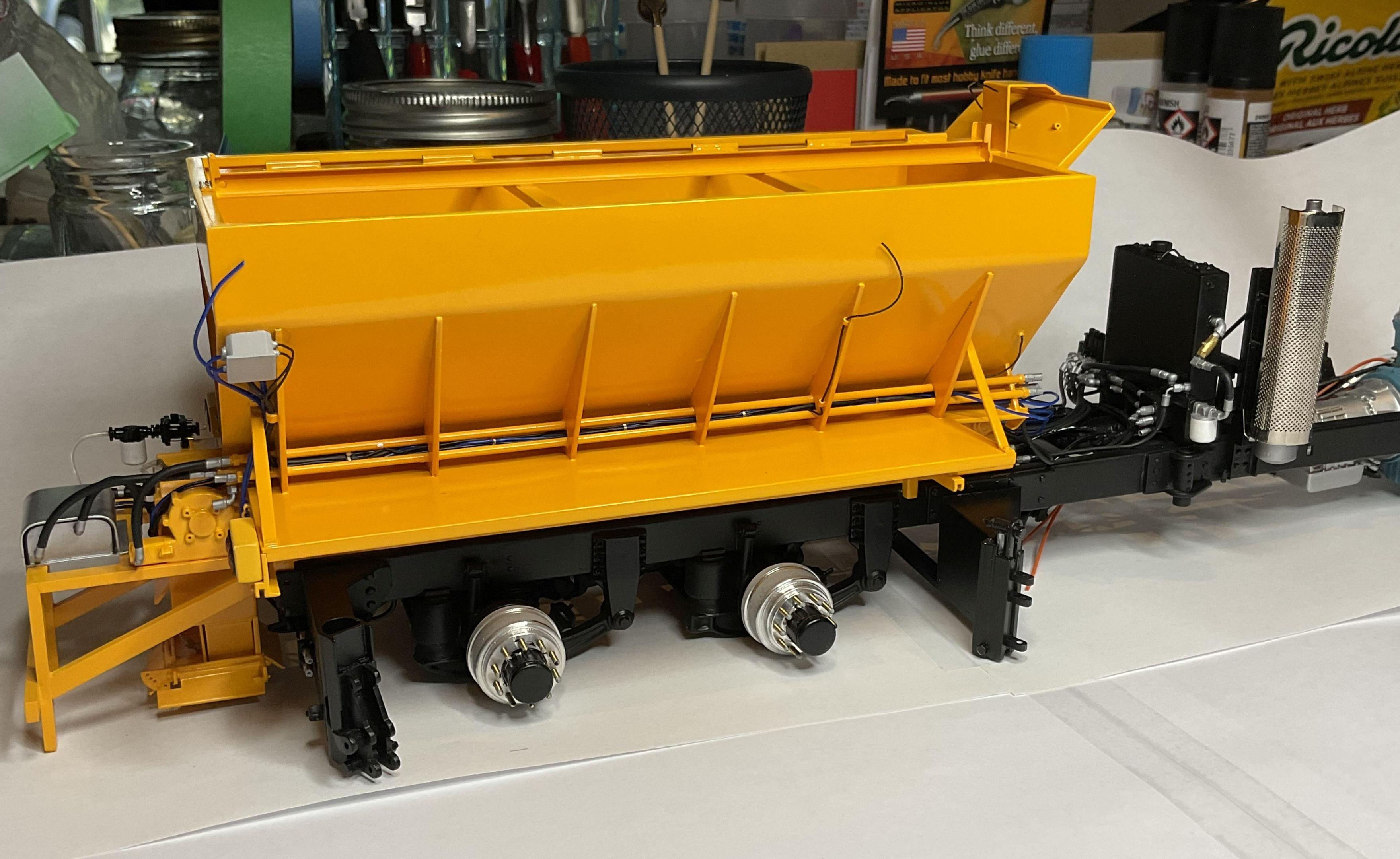 The two remaining hoses at the rear of the sander have been installed (pressure and return line for chute spinner). I didn't have good luck with the CTM photo etch zip ties while doing the previous wiring (just managed to chip paint in a couple places!), so I ran the two hoses for the spinner through two, very thin slices of a bigger rubber hose. If you don't get right up close, the hoses look like they have been wrapped in those two spots. It is a cleaner look to my eye. And, as Jeff reminded me the other day, there are some connectors on the rear drop cross member. I had some CTM couplings and sockets that I had been debating whether or not to install, because they are a bit bigger in scale than on the real truck. I did install them and despite being a bit big, they look good (no rags stuffed in the sockets yet, Jeff!) Two hoses to/from sand spinner are installed Better view of hoses attached to spinner hydraulic motor Drop crossmember sockets and couplers installed - openings in the sockets need to be 'filled' for winter operation! The hydraulic line opening at the top of the cross member will be capped as well, once I am done with needing the frame to be on the rotisserie. Still waiting for some decals to finish lighting and wiring on back panel of sander (need to get that new rotisserie built as well). Thanks for stopping in to have a look! -