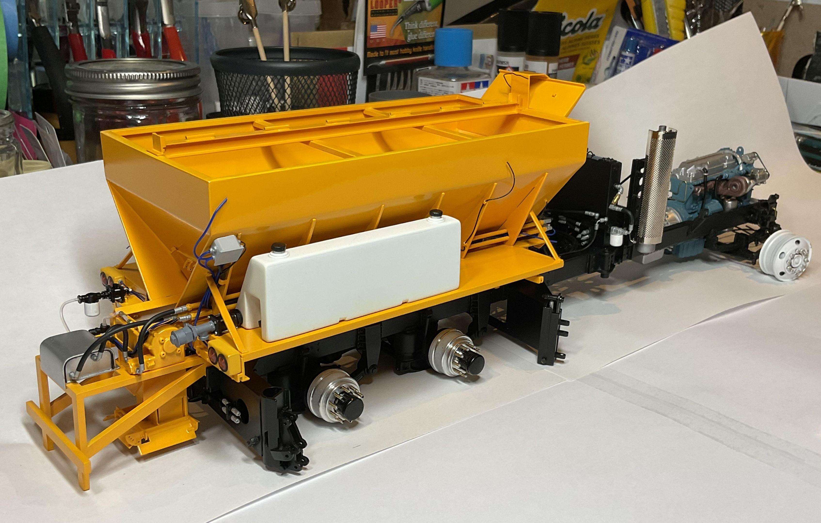 I've been wanting to see what the sander looked like on the truck frame - yesterday I tried to set the sander in place and discovered that the pintle hitch I installed so long ago doesn't clear the sand chute - the real truck doesn't have the hitch attached when there is a sander on the truck (should have checked real truck's pictures more often!). So, had to remove the hitch, repair the area, add a 'plate' to the area, drill the bolt holes that would be used to mount the hitch and re-paint the end of the drop cross member. After all that, the sander fit in place as it should. A few mockup pics of sander sitting on the frame. Next, I'll need to make a different rotisserie, one that will work with the sander mounted on truck, so I can minimize handling during rest of its assembly. Thanks for stopping by! -