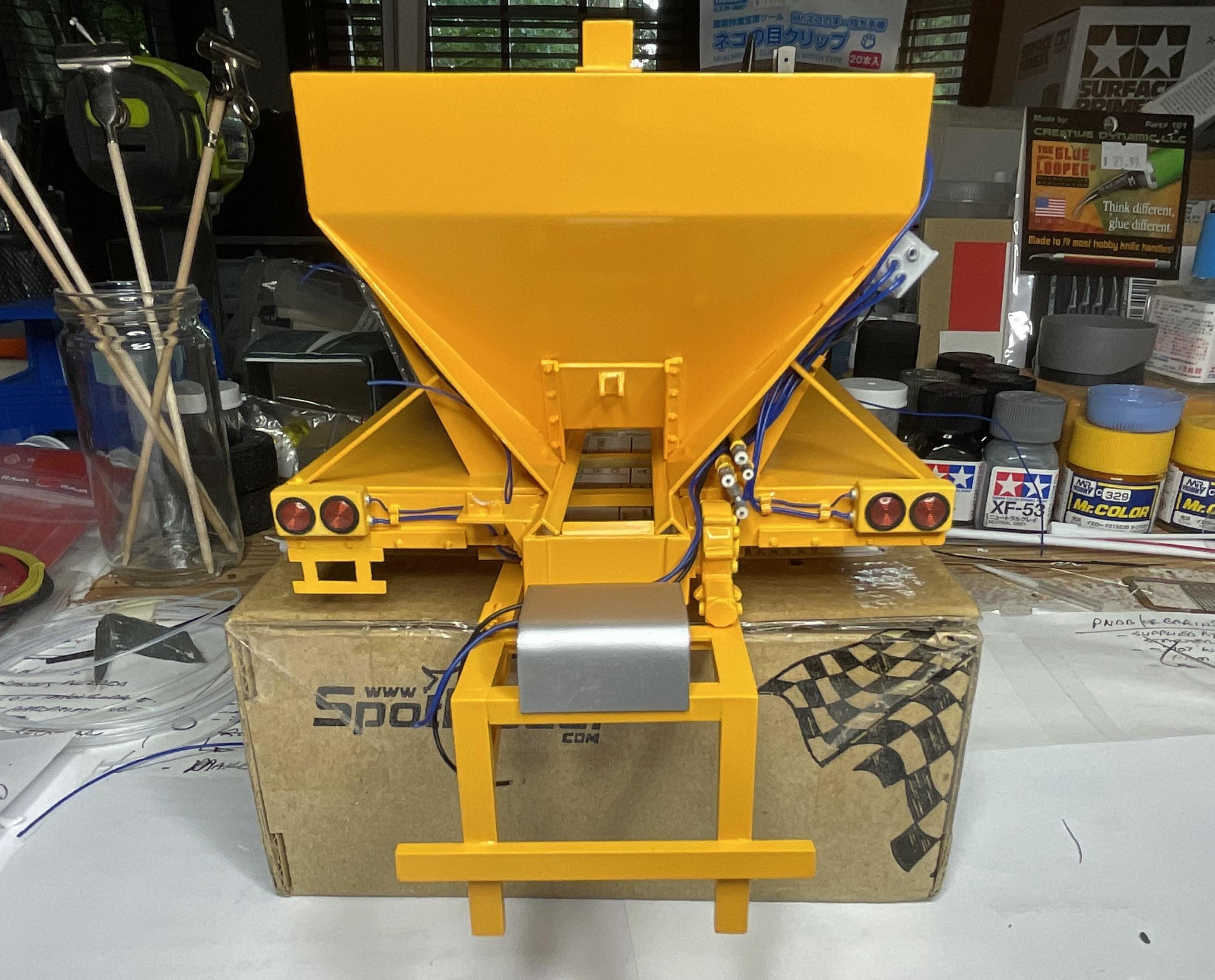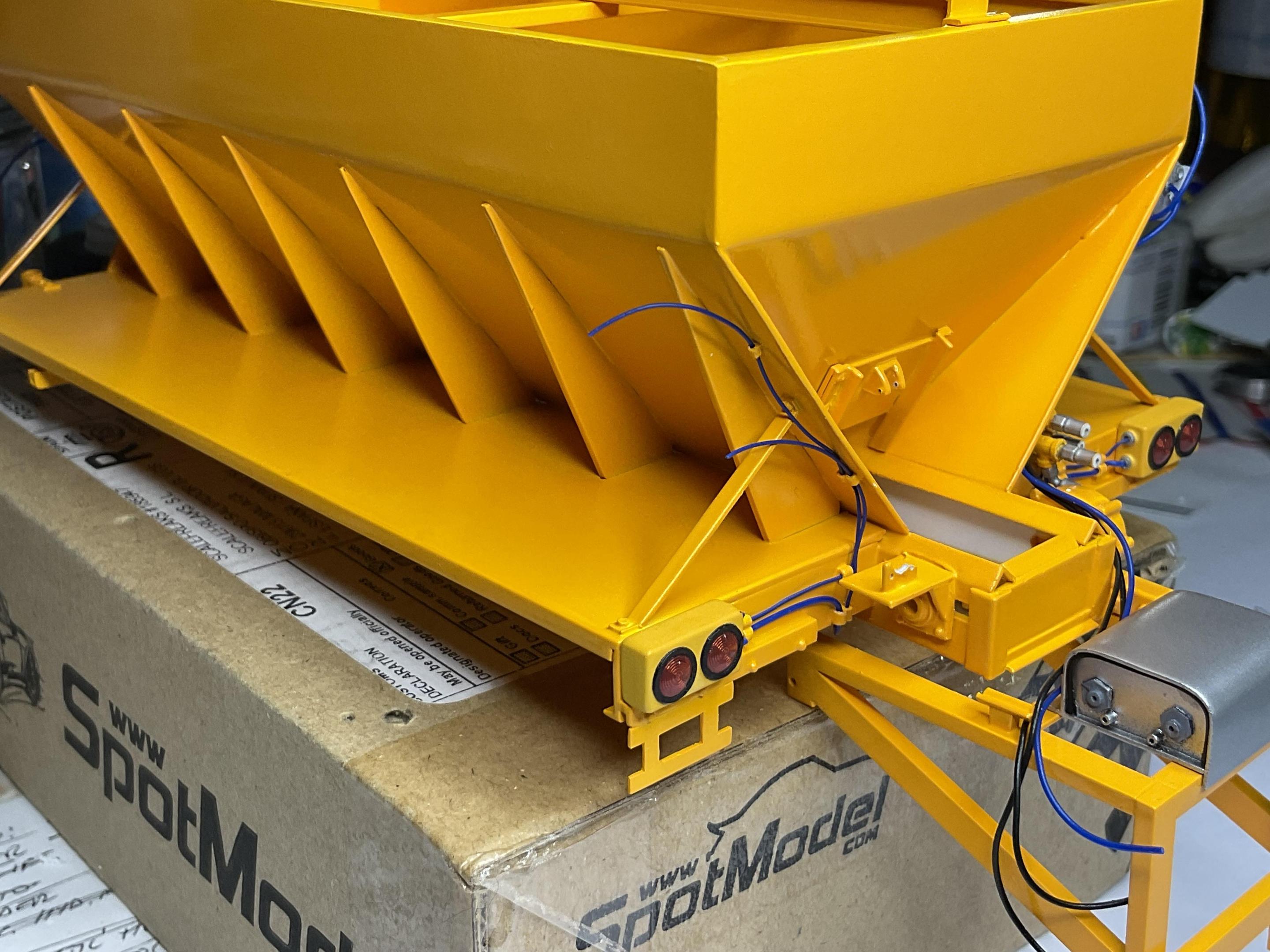 I hadn't noticed the lifting loop before, but there is one on the wing plow of the truck I'm modeling. Haven't done final coat of paint on the wing plow yet, so maybe I can still incorporate one. No extendable underbody, but I am going to try for the work lights in the pic below (quite a flimsy light mount at 1/24 scale on top of hydraulic filter, but maybe I can make a slightly bigger mounting plate). Right hand light shines down on outlet area of underbody Thanks for the suggestion! -
