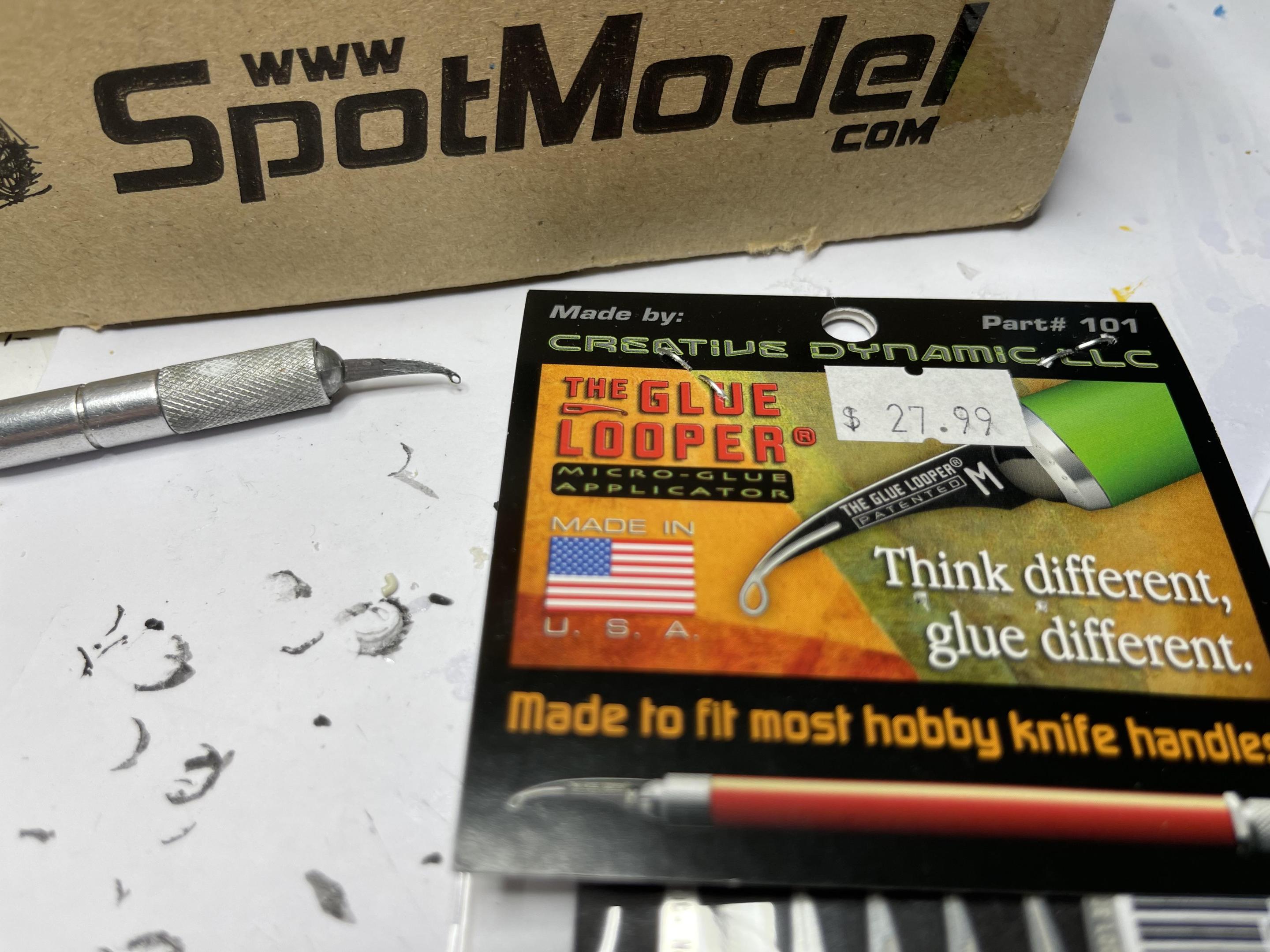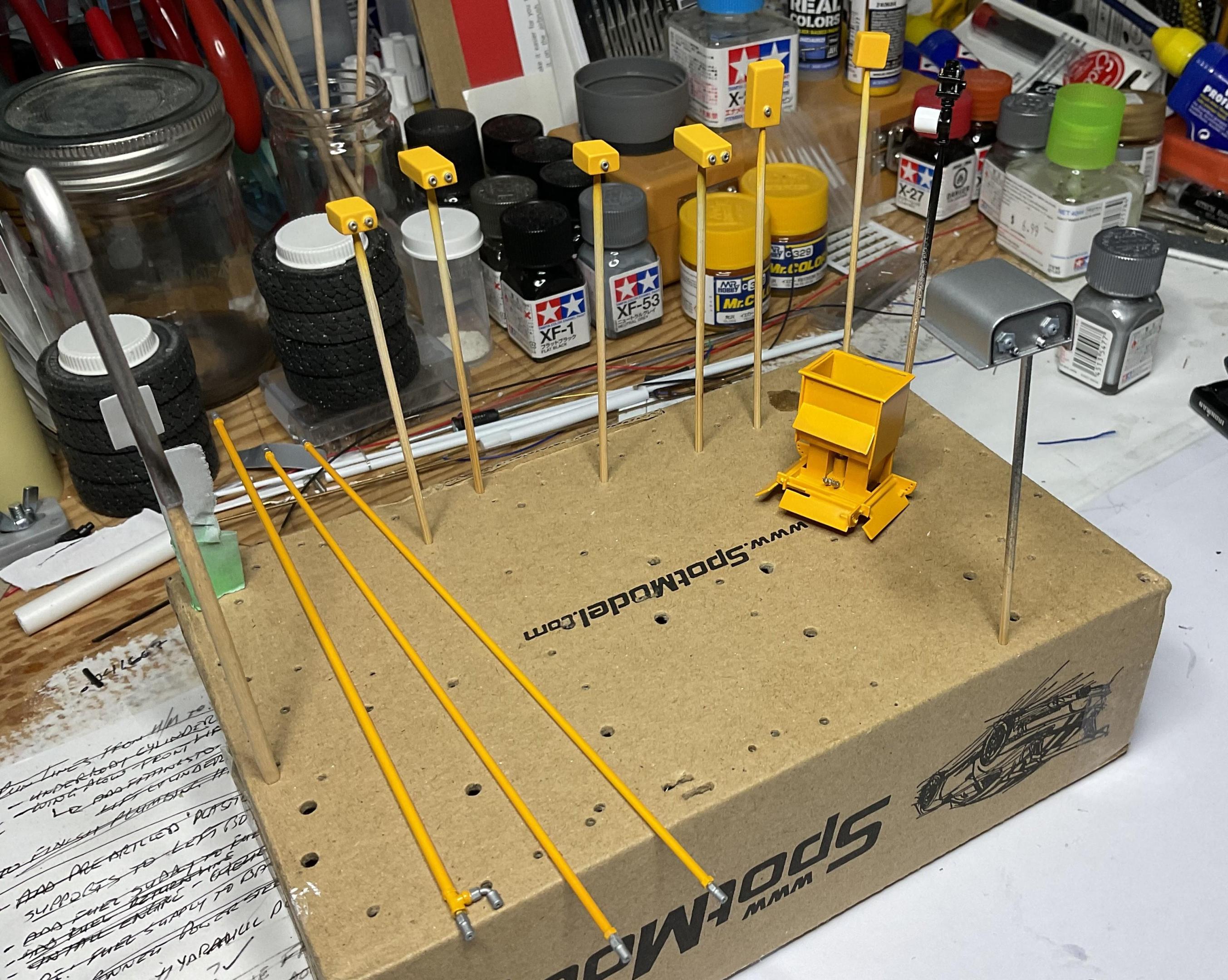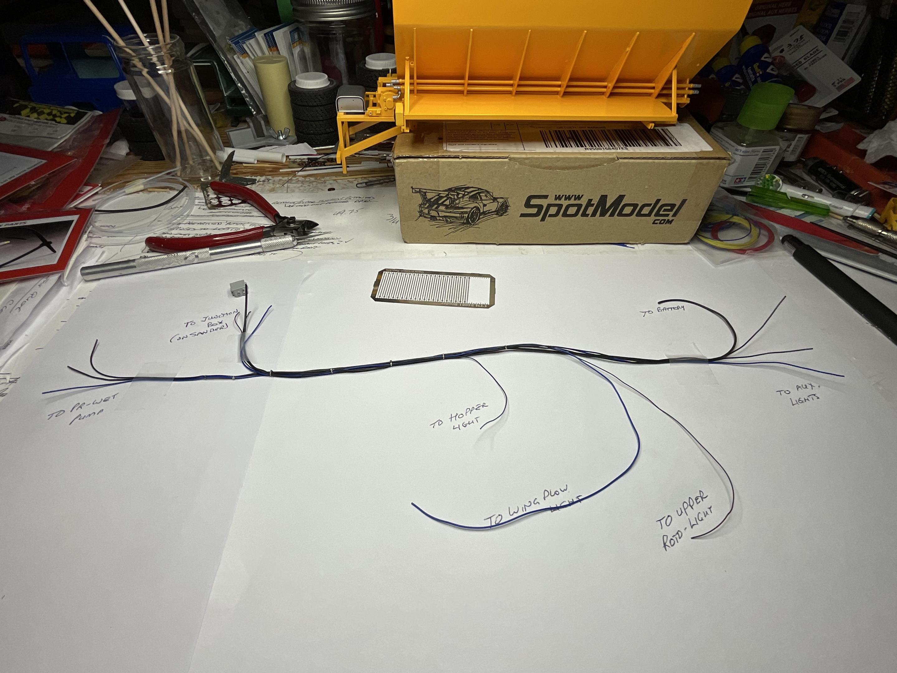 Been carrying on with work on the sander - have spent a lot of time on this part of the build, but there is a lot to build and put together! Before much more could be done, I needed to fix in place the hard line hydraulic runs along the side of the sander. Once they were in place, I started laying out some wiring runs - there's an electrical junction box on the rear/side of the sander, distributing power to various lights on the sander, power to the pre-wet pump housing, as well as amber clearance lights on the wing plow, side of the hopper, over the underbody plow and the sander's roto-lights. First of three hard lines to install - Wasn't sure how I was going to get CA glue into the tight spots on the hopper support ribs to attach hard lines - found this great set of loops (package of 10, PE loops) that allow me to pick up a small amount of CA glue and carefully place the glue where needed. Had to clean the loop out lots along the way, but sure was handy Was able to apply glue quiet easily with this attachment All three hard lines in a quick mock up started laying out lengths of wire for sander's wiring harness - going to try to get some PE zip ties to work! With any (a lot of!) luck, should be able to install the wiring harness tomorrow - it will need to run inside the trio of hard lines - not looking forward to that! -