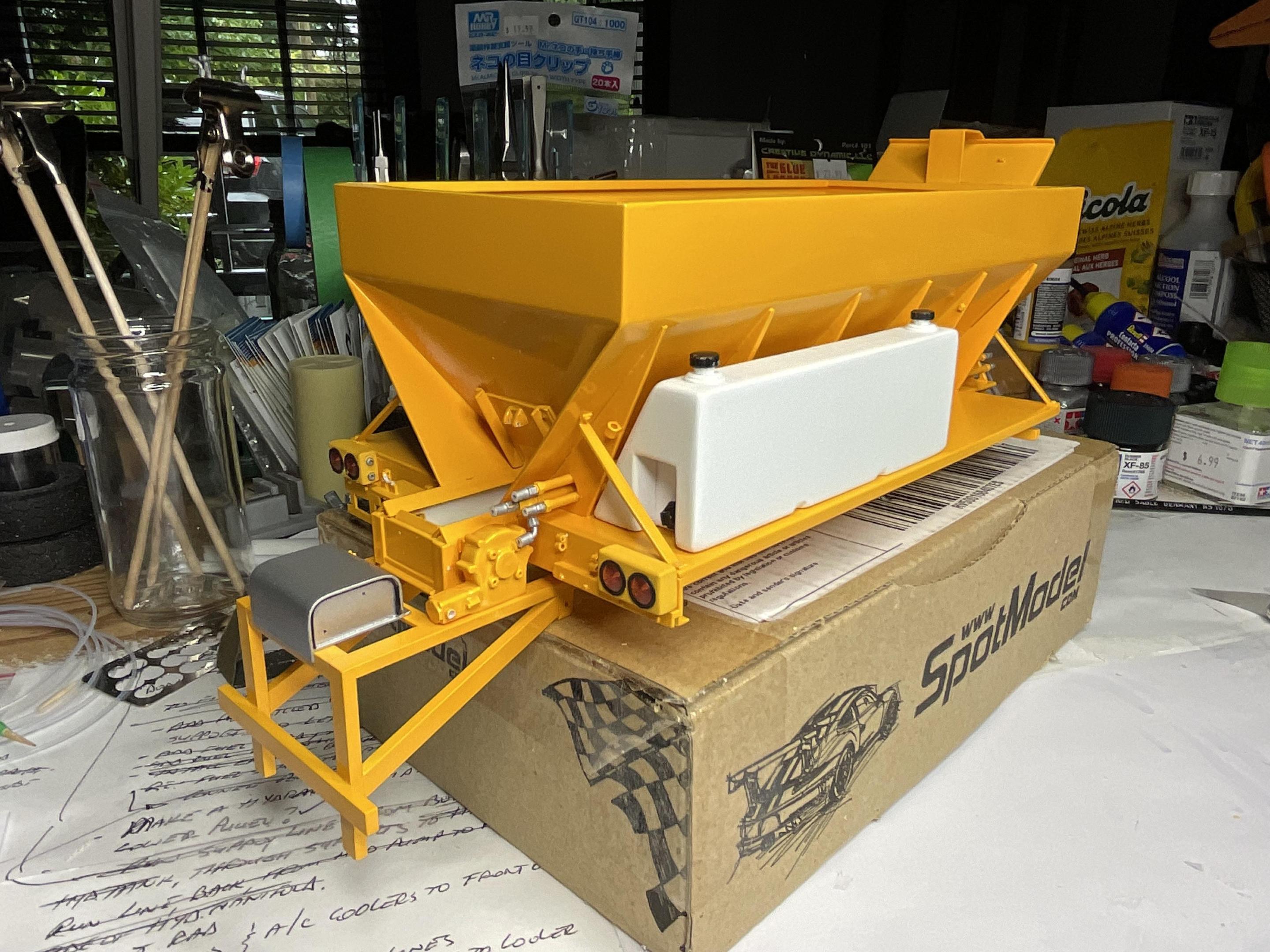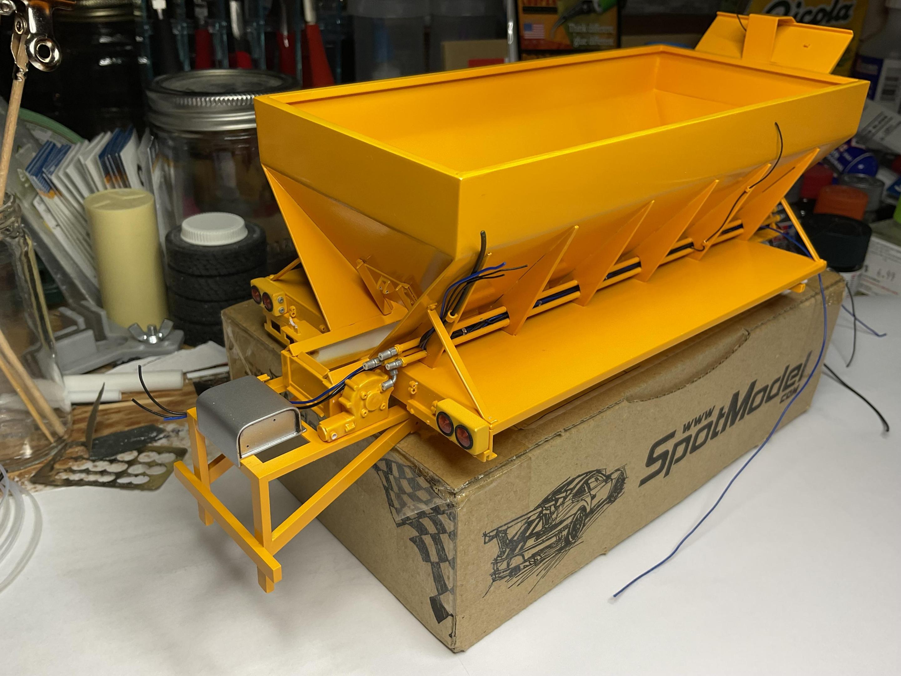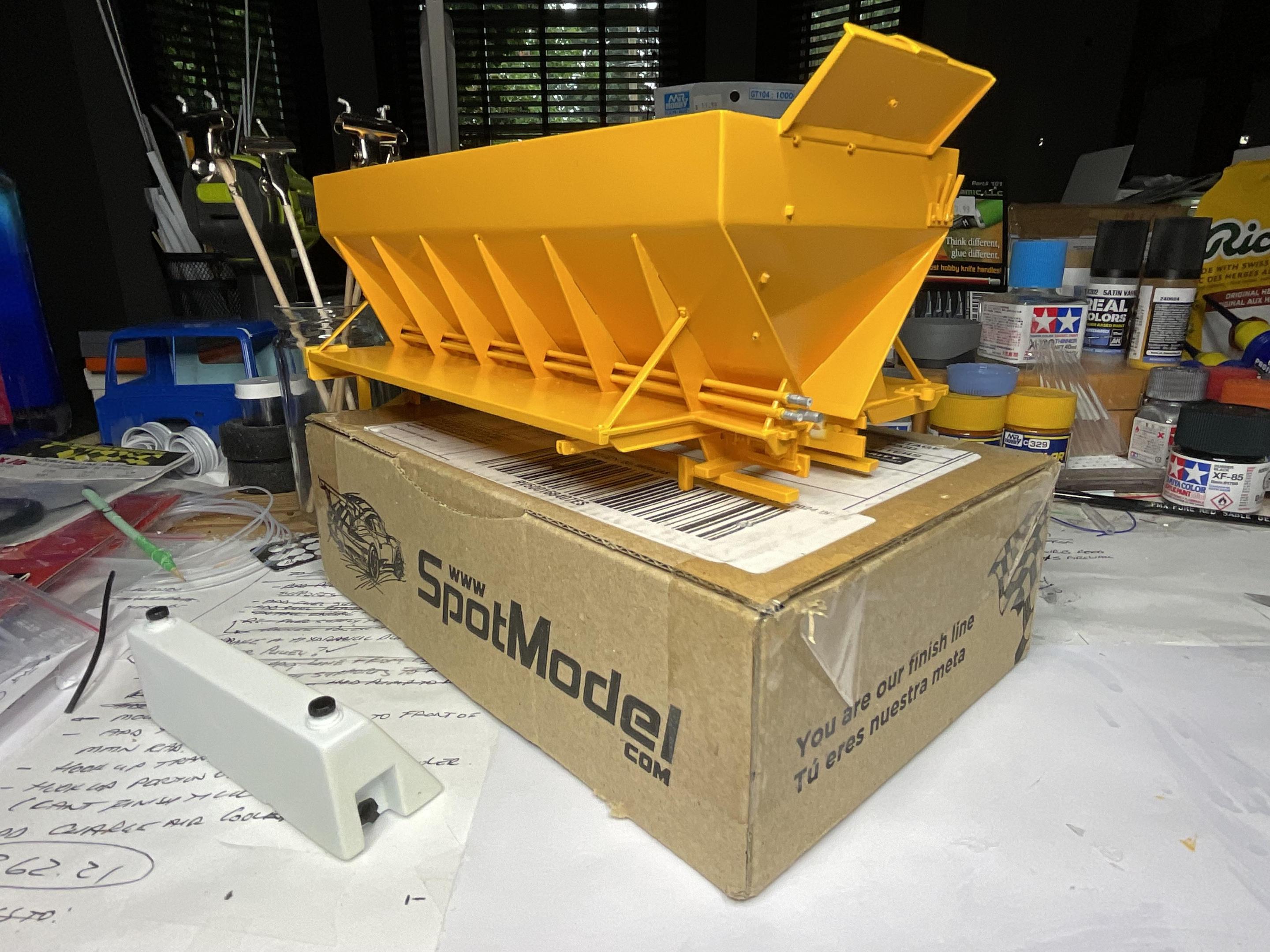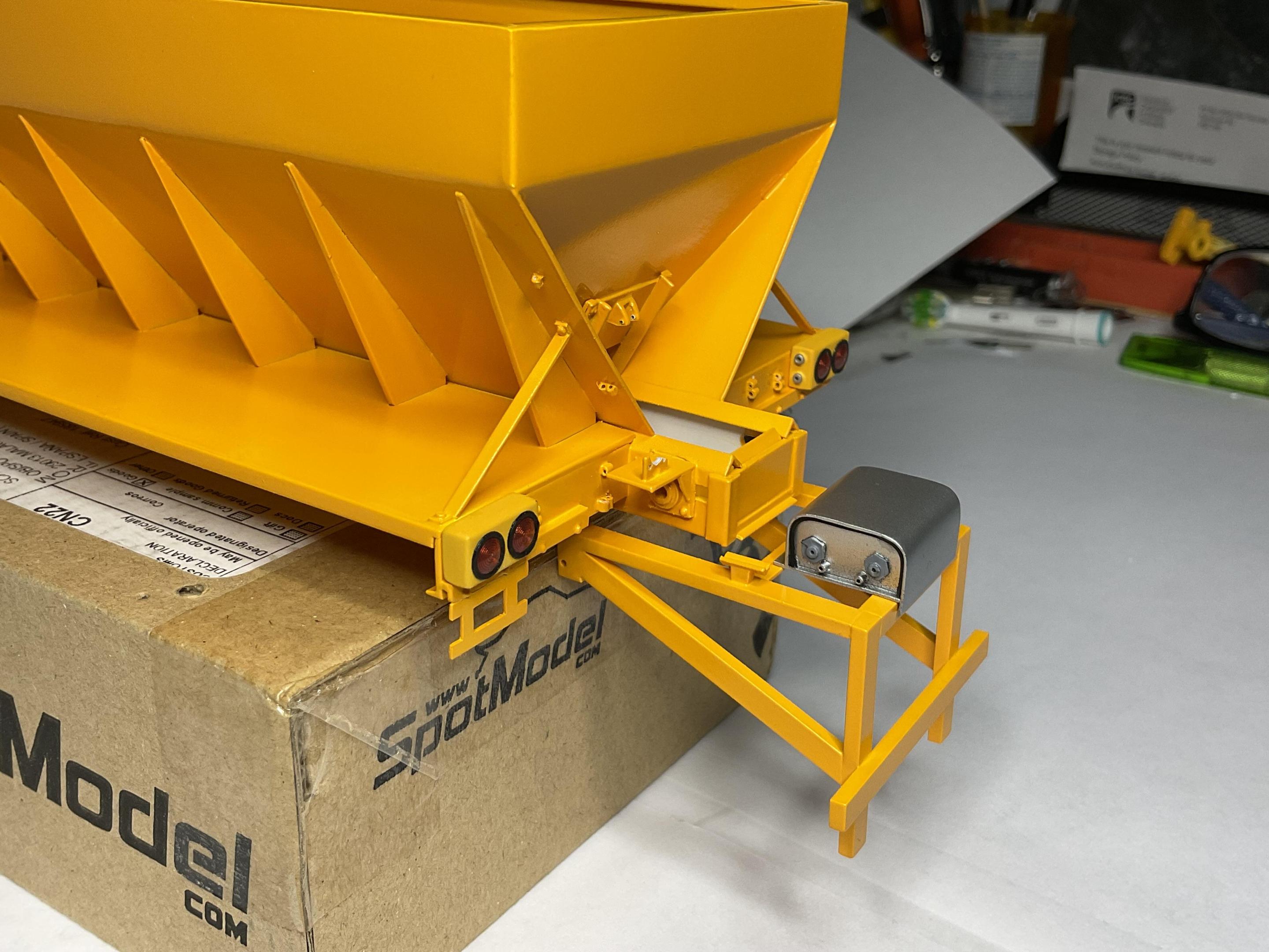 Made a little progress this week, mostly involving detail painting and some minor assembly - getting there bit by bit. Used Alclad chrome on exhaust tip (needs to be recoated); painted fittings on ends of hydraulic hard line runs; flat yellow 'boxes' represent the plastic brake and warning light housings on sander - painted aluminum tips on boxes for electrical connectors; painted fittings on sand spreader; pre-wet liquid pump housing painted aluminum and added rubber gasket around each end housing lid Fuel tank painted - need to make hold down straps and attach fuel lines/fittings attached CTM brake lights to light housings and attached pre-wet unit to sander frame spreader spinner attached Still hoping to get to the hydraulic lines and wiring soon! -