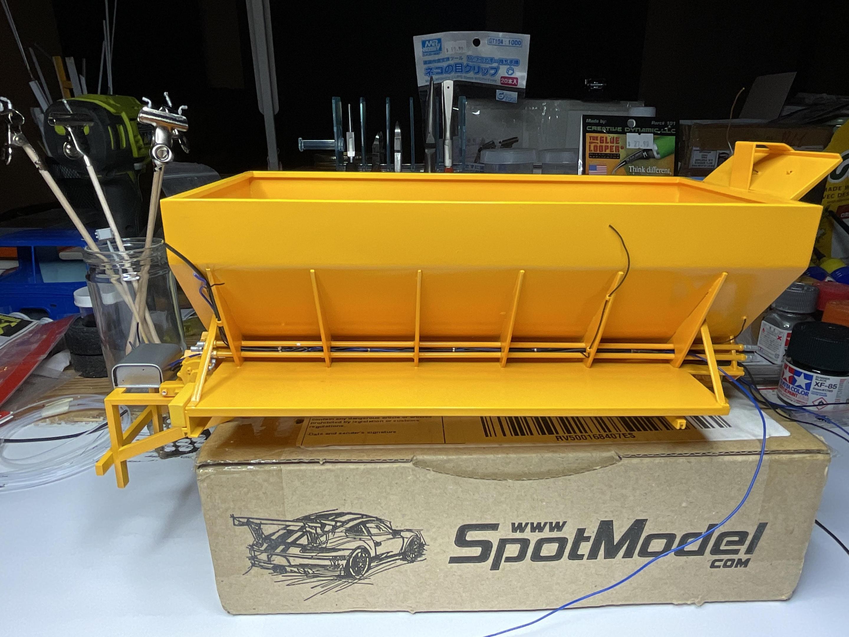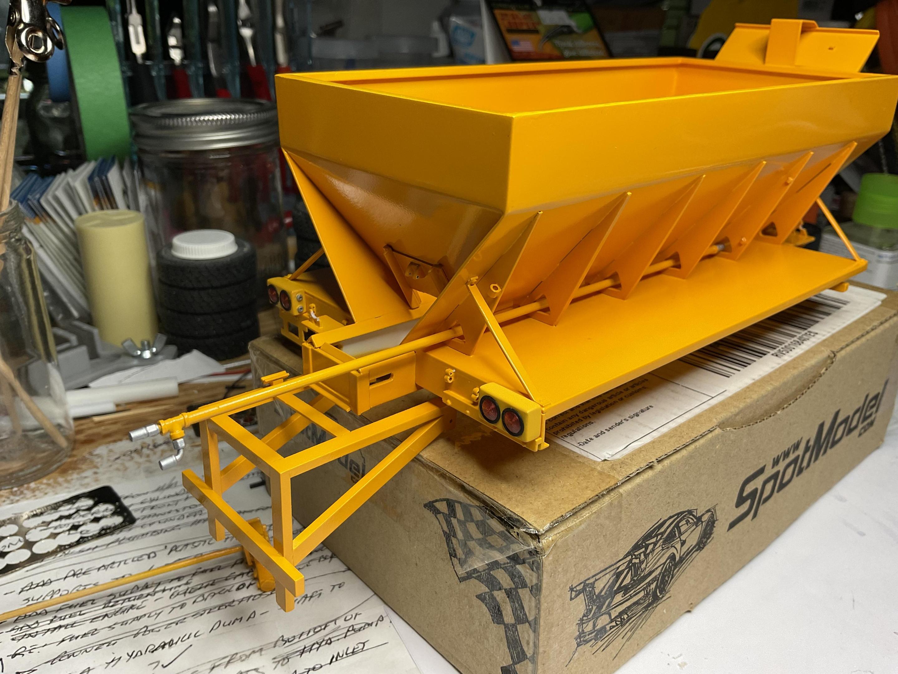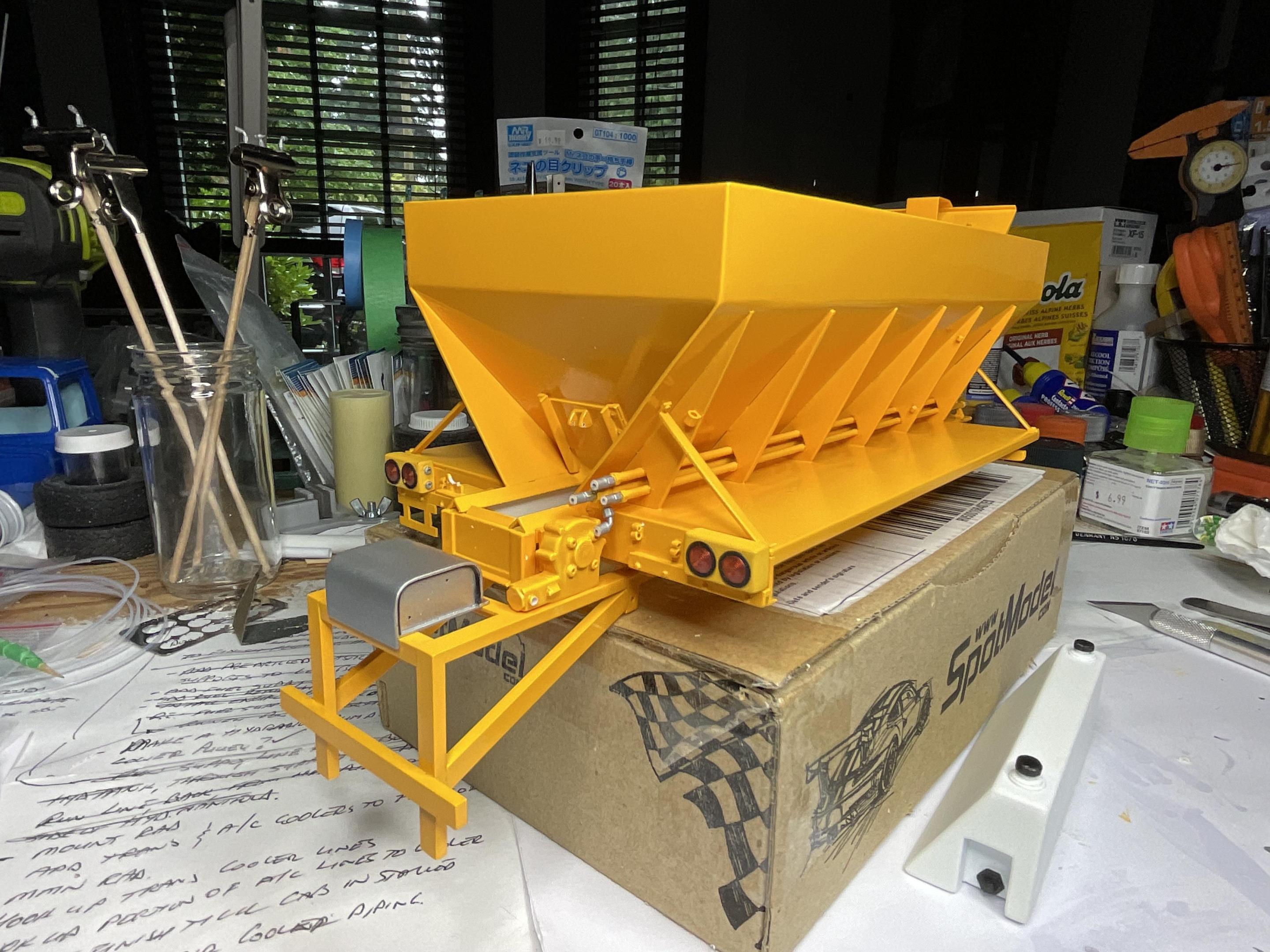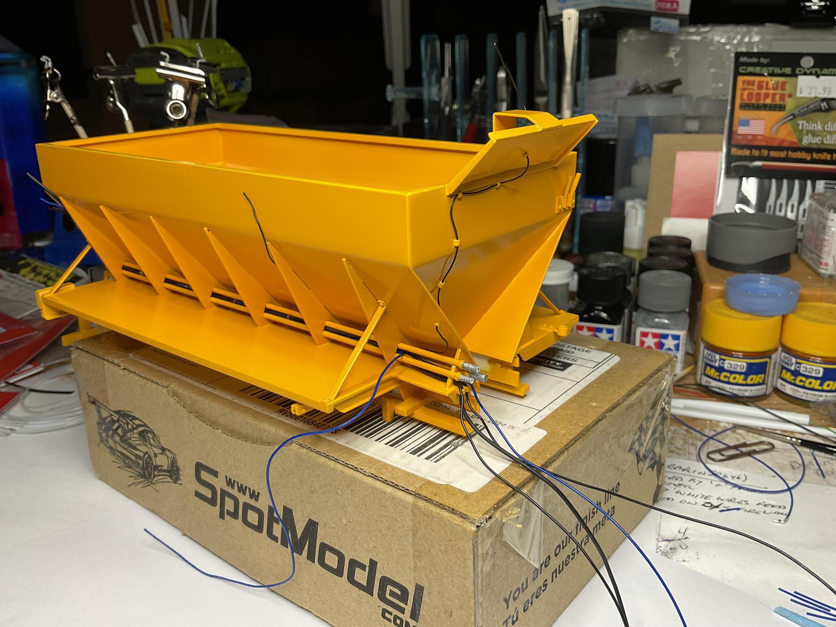 Made a little progress this week, mostly involving detail painting and some minor assembly - getting there bit by bit. Used Alclad chrome on exhaust tip (needs to be recoated); painted fittings on ends of hydraulic hard line runs; flat yellow 'boxes' represent the plastic brake and warning light housings on sander - painted aluminum tips on boxes for electrical connectors; painted fittings on sand spreader; pre-wet liquid pump housing painted aluminum and added rubber gasket around each end housing lid Fuel tank painted - need to make hold down straps and attach fuel lines/fittings attached CTM brake lights to light housings and attached pre-wet unit to sander frame spreader spinner attached Still hoping to get to the hydraulic lines and wiring soon! -