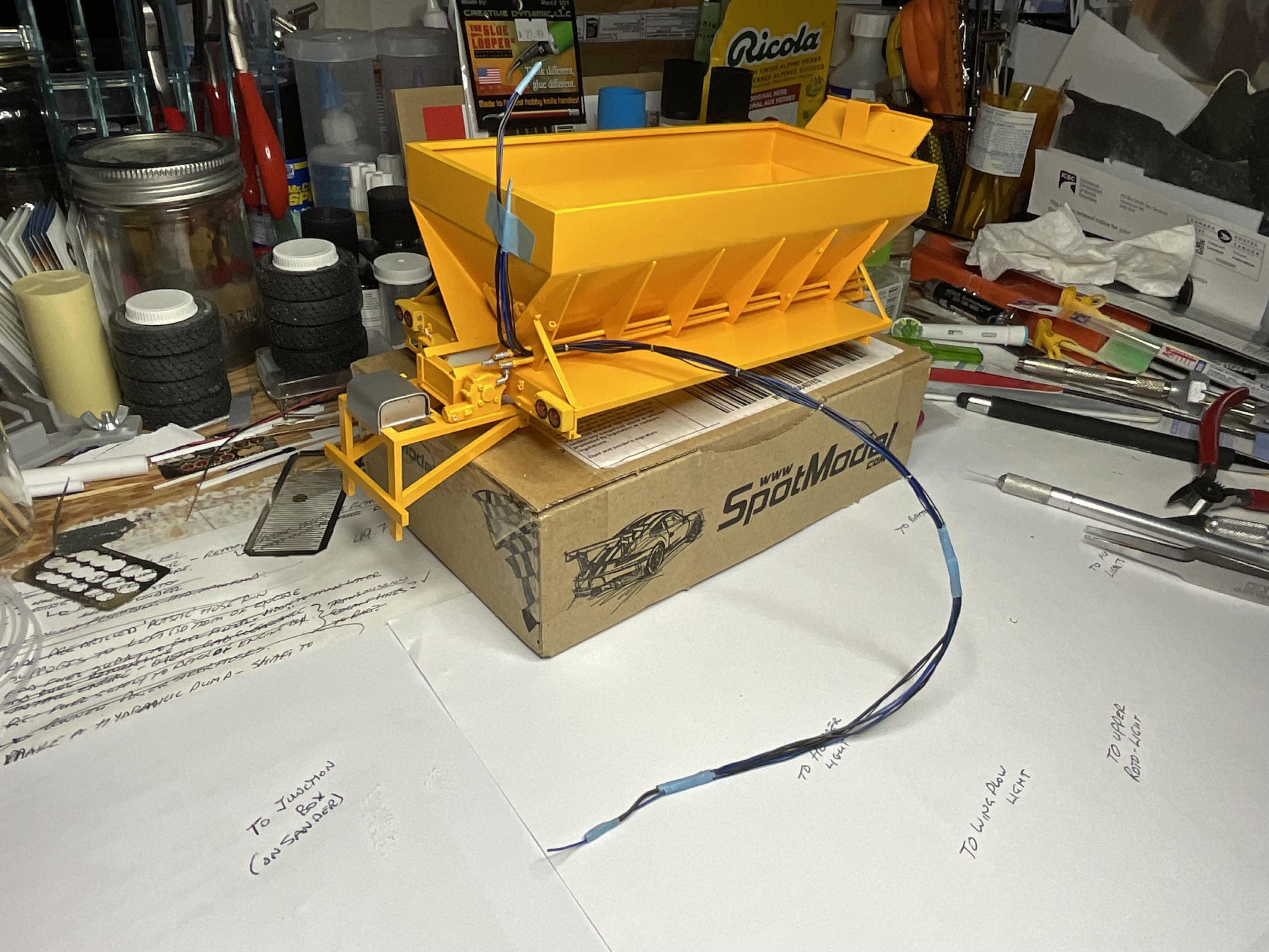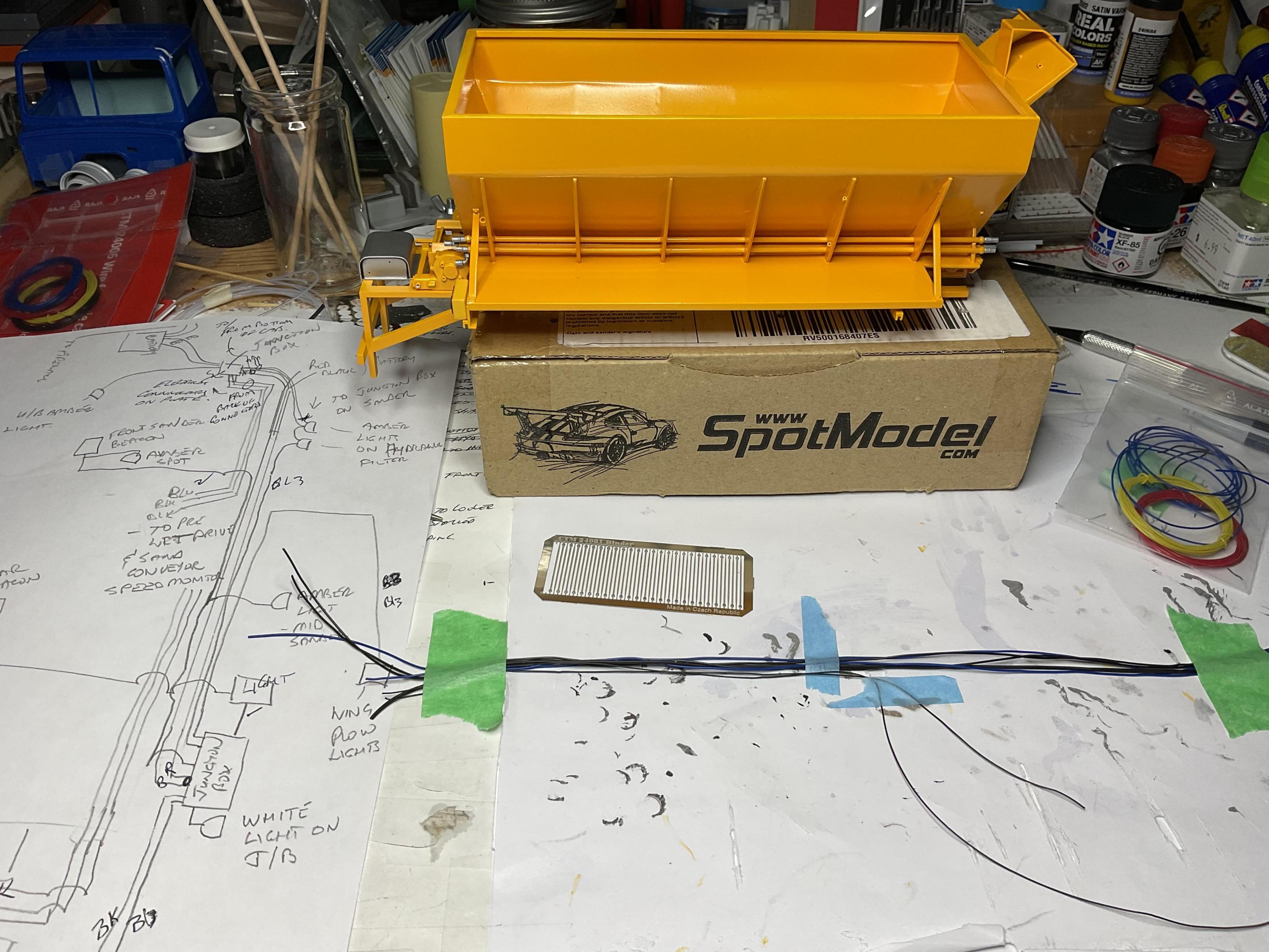 After I made my posting last night, I was cleaning up the work area, getting ready to call it a night, and thought I would try one of the PE zip ties, just to see how much work it might take in the morning. However, one turned out good, so I did a few more, did a photo of the wiring harness and then started in on putting the harness on the sander. I'd gone this far so, after a few hours (2 in the am, I think), I had the harness in. It was a struggle, and some touch up painting will need to be done, but a big step accomplished! Wiring harness zip-tied where needed and labeled to be sure I had the wires I needed - can't (or won't!) replicate every little wire, but the majority of the sander wiring is incorporated in this harness; there will still be wiring to run from the junction box at the back, to the rear brake lights and upper rear sander amber flashing lights The thickest 'wire' is a sheath for the power supply wiring, the blue wire is a three-wire line that runs back to wing plow amber warning light, and the black wires are two-wire runs to the hopper side light and the roto light at the top, front of the sander Had to put some tape on the wires in order to 'pull' them into place After much muttering and angst, the harness was tucked and pulled into space between trio of hydraulic hard lines - black wire up side of hopper is for light to shine on wing plow Wires up side of rear support rib will tie into junction box and three wires continue further back - two for pre-wet pump and one for the sand conveyor speed sensor Blue wire off side of fender will end up at amber warning light on wing plow and you can see a black wire running through side wall of hopper and up to service the roto-light. The other wires will terminate at a couple places under the cab Have to terminate the wiring at the pre-wet pump and then move on to some hydraulic hoses for the conveyor drive motor! Again, lots of pics, so thanks for taking the time to have a look - much appreciated! -