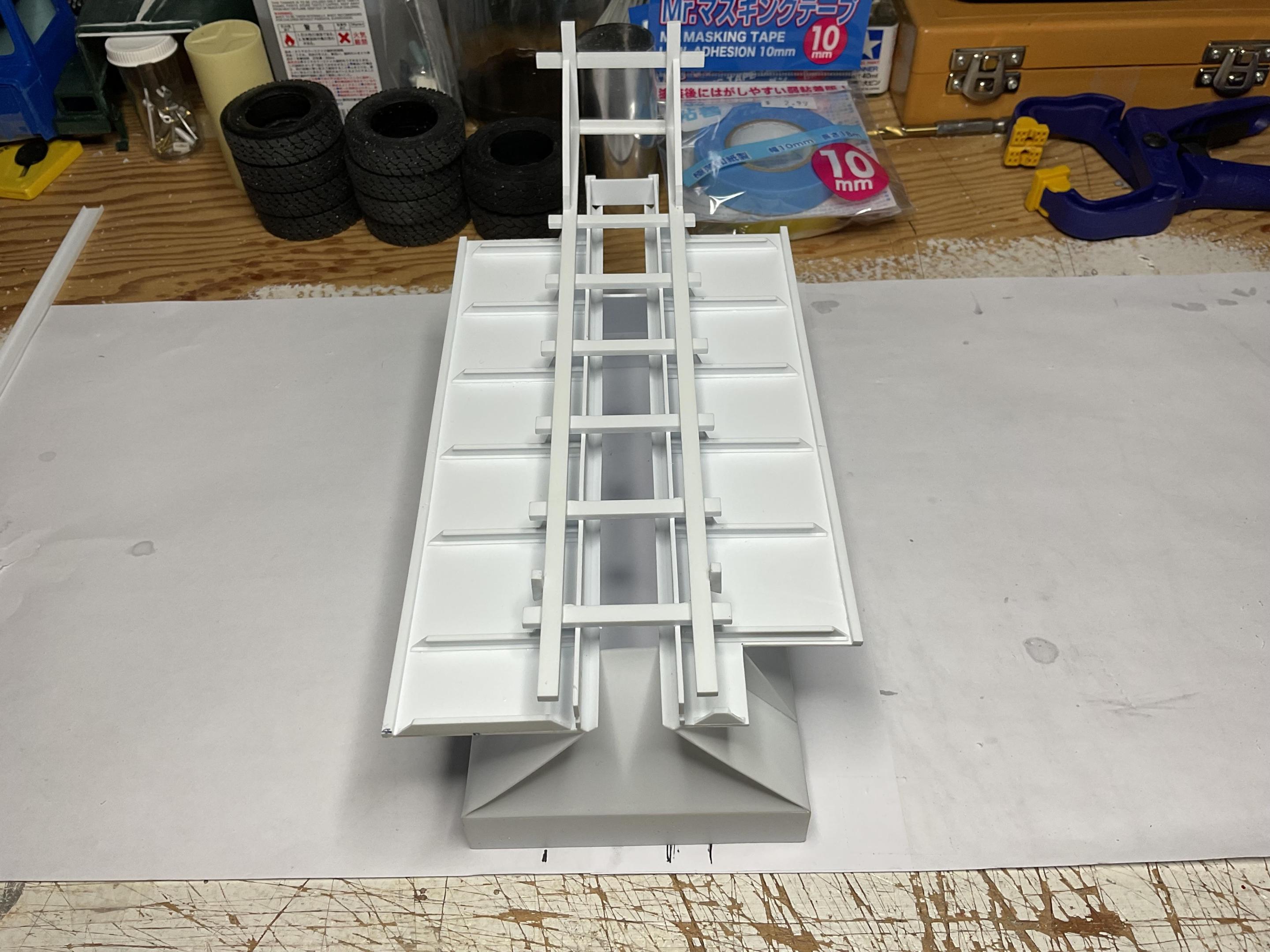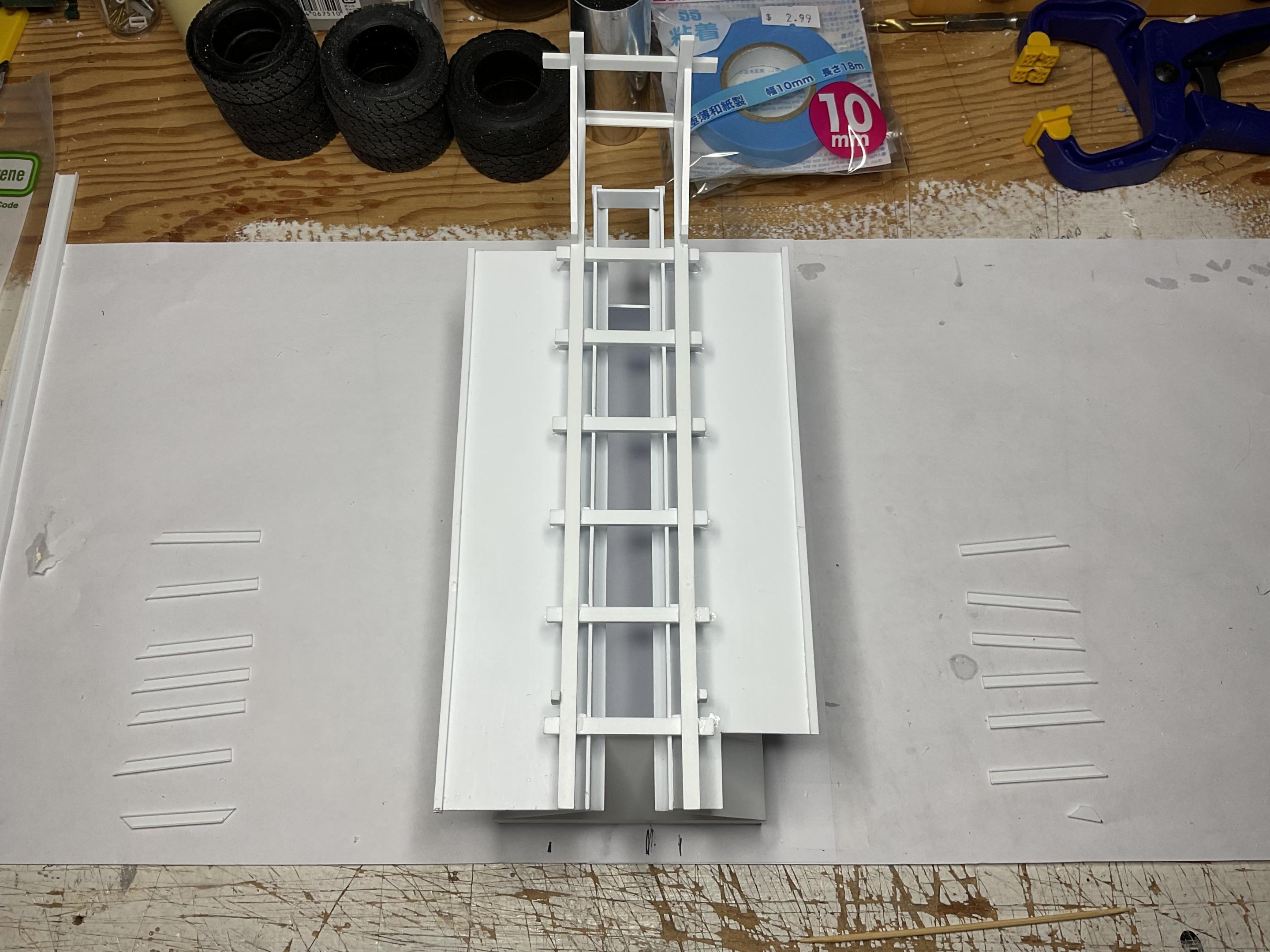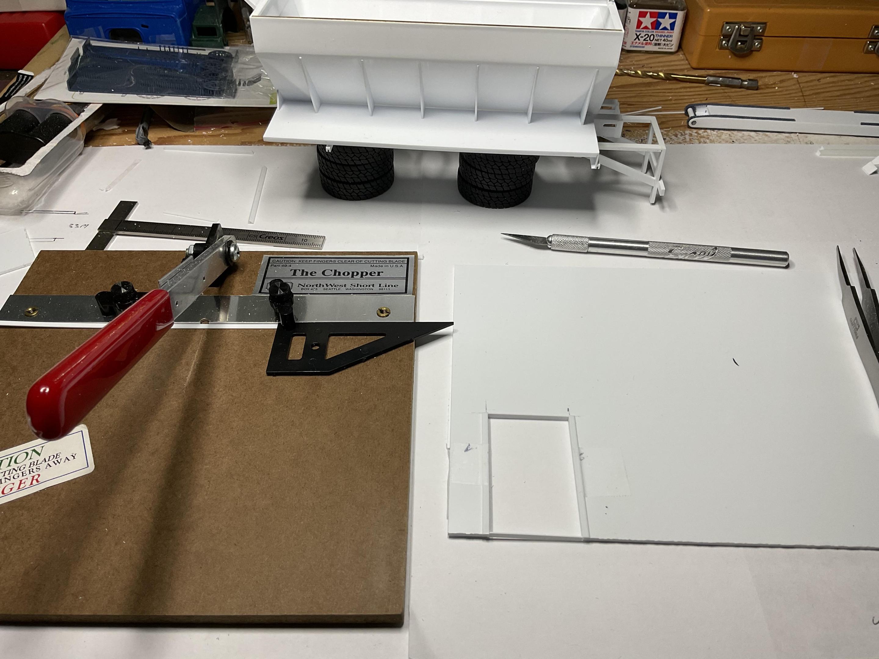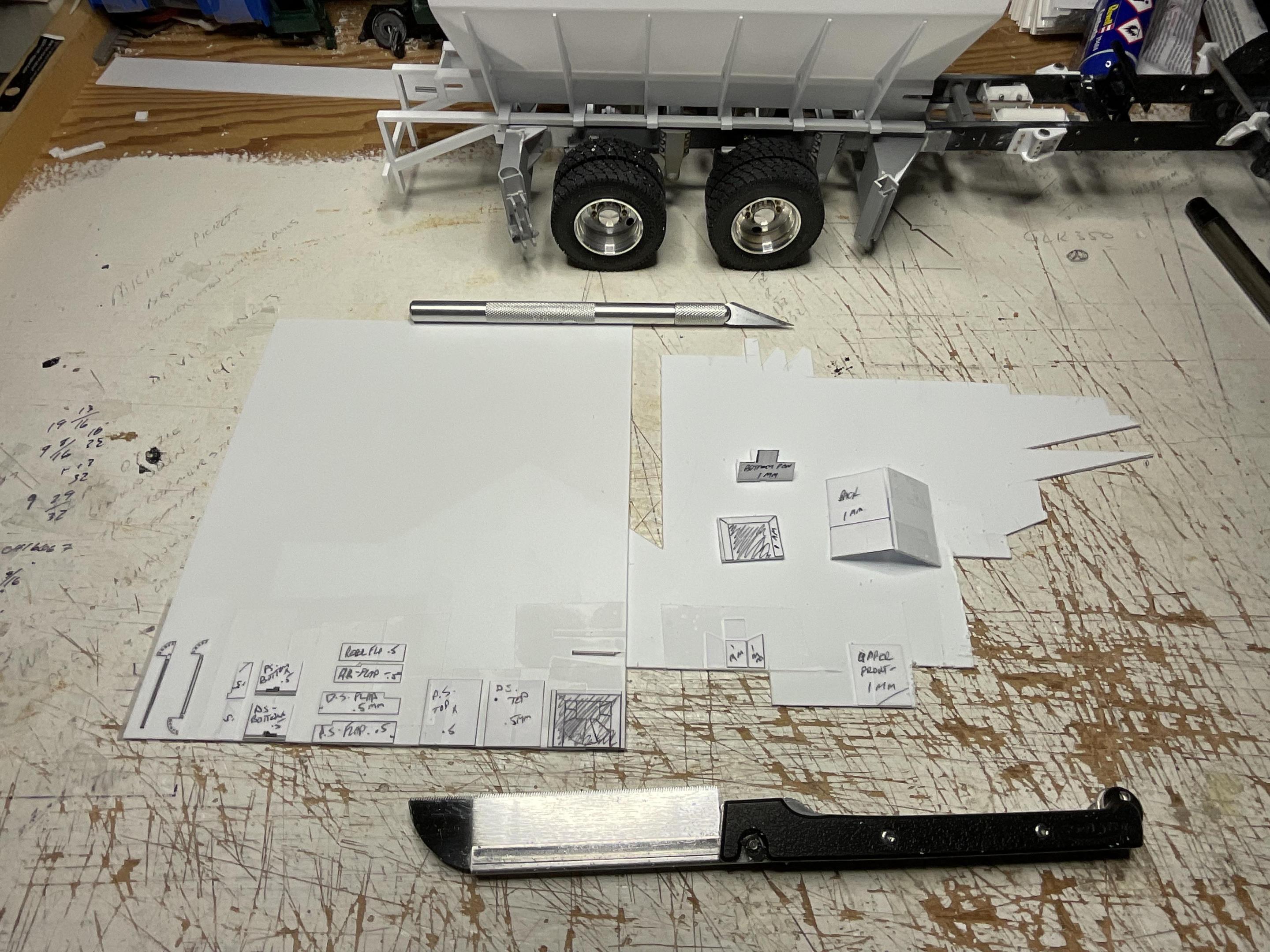 Started work on the sander’s fender mounted, pre-wetting fluid tanks. Our trucks had a system to apply a spray of this liquid, a salt brine, to the sand (sometimes the salt as well) as it fell into the spinner chute, in an effort to make it adhere slightly better to the road surface – traffic and big trucks could quickly blow the sand out of the travelled portion of the road. Adding the brine to a salt application at the spinner could help the salt get into a soluble state quicker and begin working on compact snow or ice quicker Patterns for the pre-wet tanks - one on each fender of sander assemble tanks - the sand conveyor drive motor has been started; the square and rectangular blocks represent plastic electrical boxes for the sanders/plows lights (brake lights, flashing lights on wing plow, etc). A portion of the sand conveyor is seen in upper right filler spouts and caps for tanks added; most of ladder finished - needed to add stair tread to ladder steps and used CTM mesh tank mocked in place; ladder taped in place with lower portion unfolded lower portion of ladder folded up sand conveyor hydraulic motor mocked in place had to have a shovel at the ready! more on the sander in the next post - thanks! -