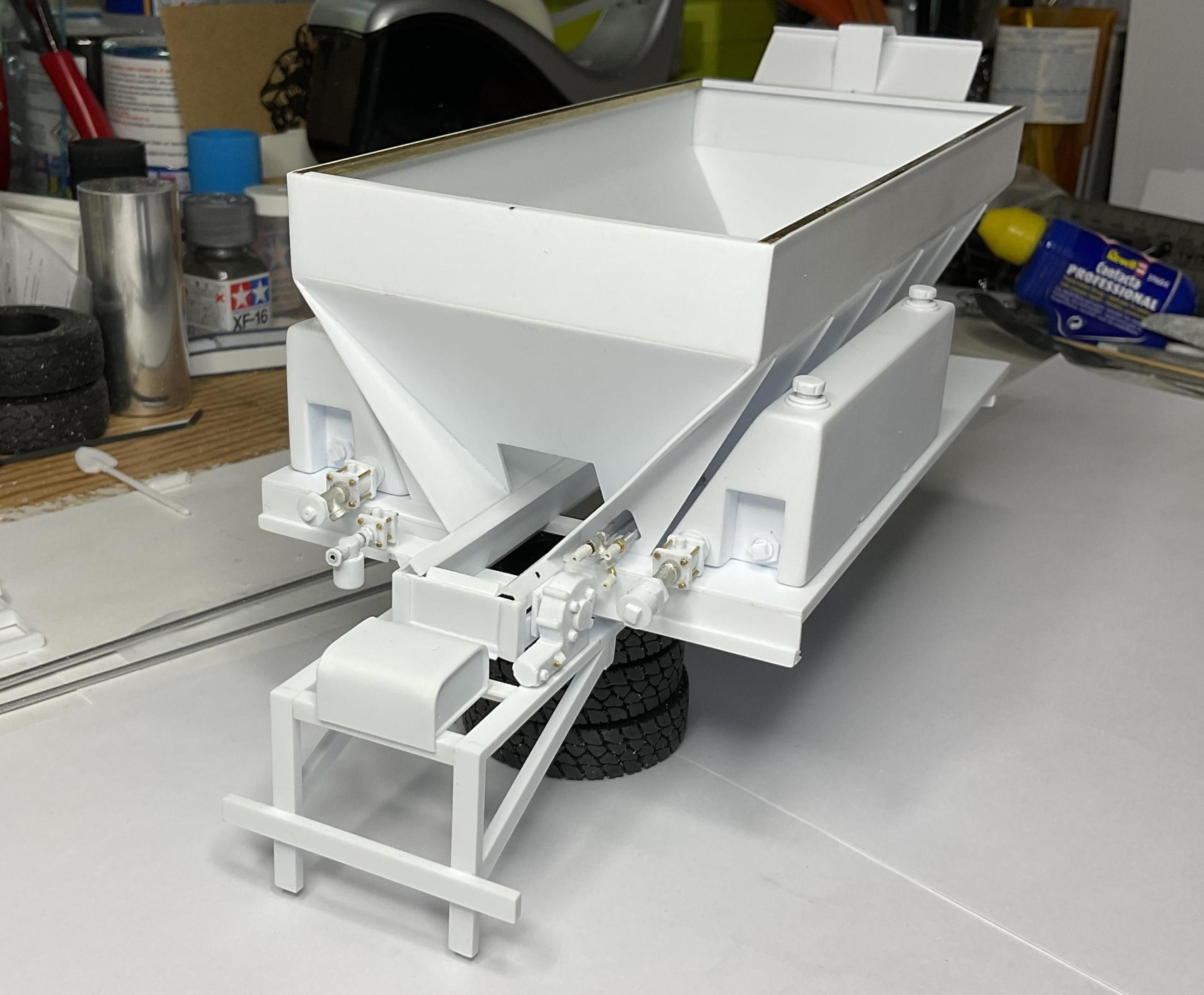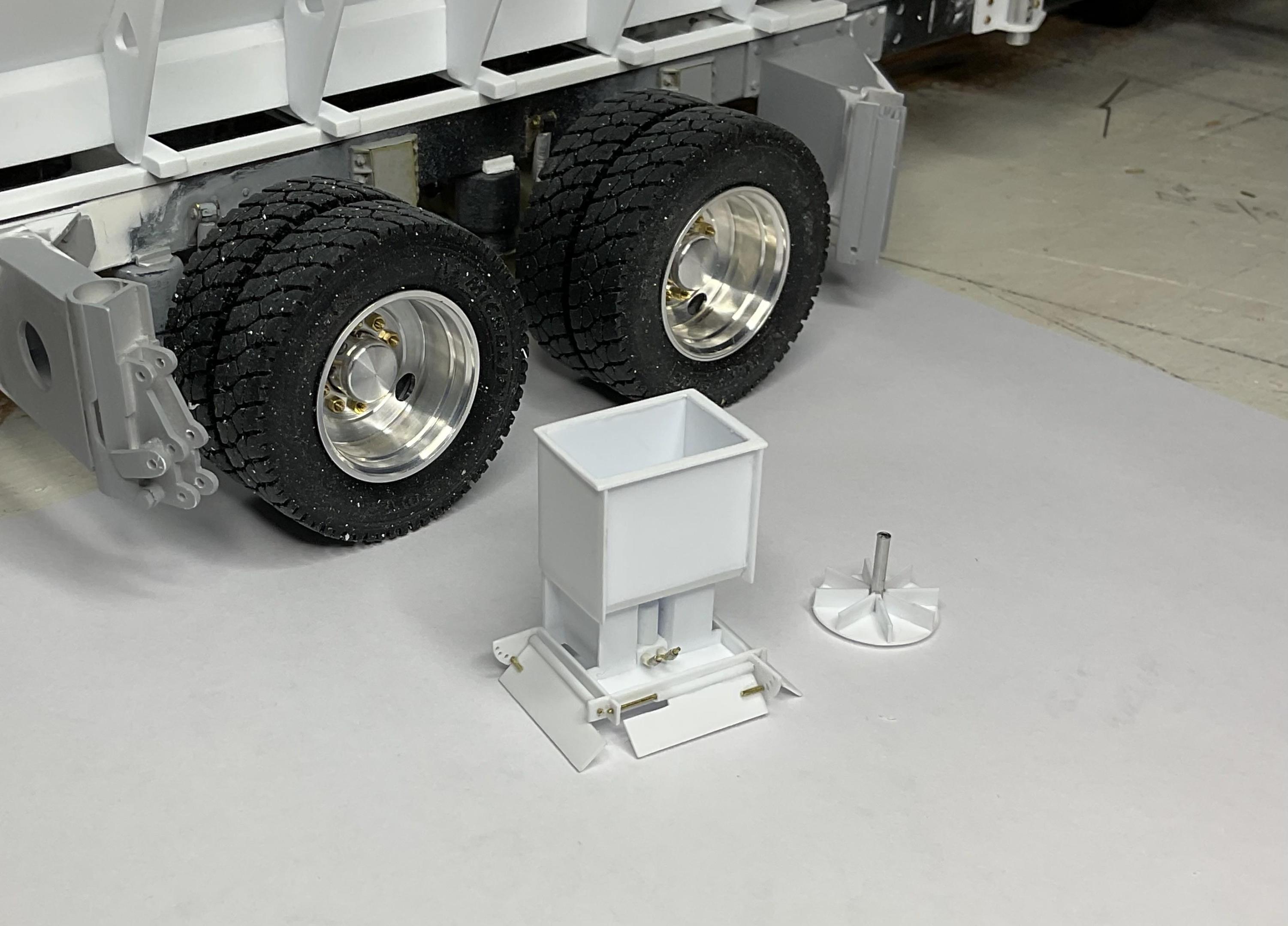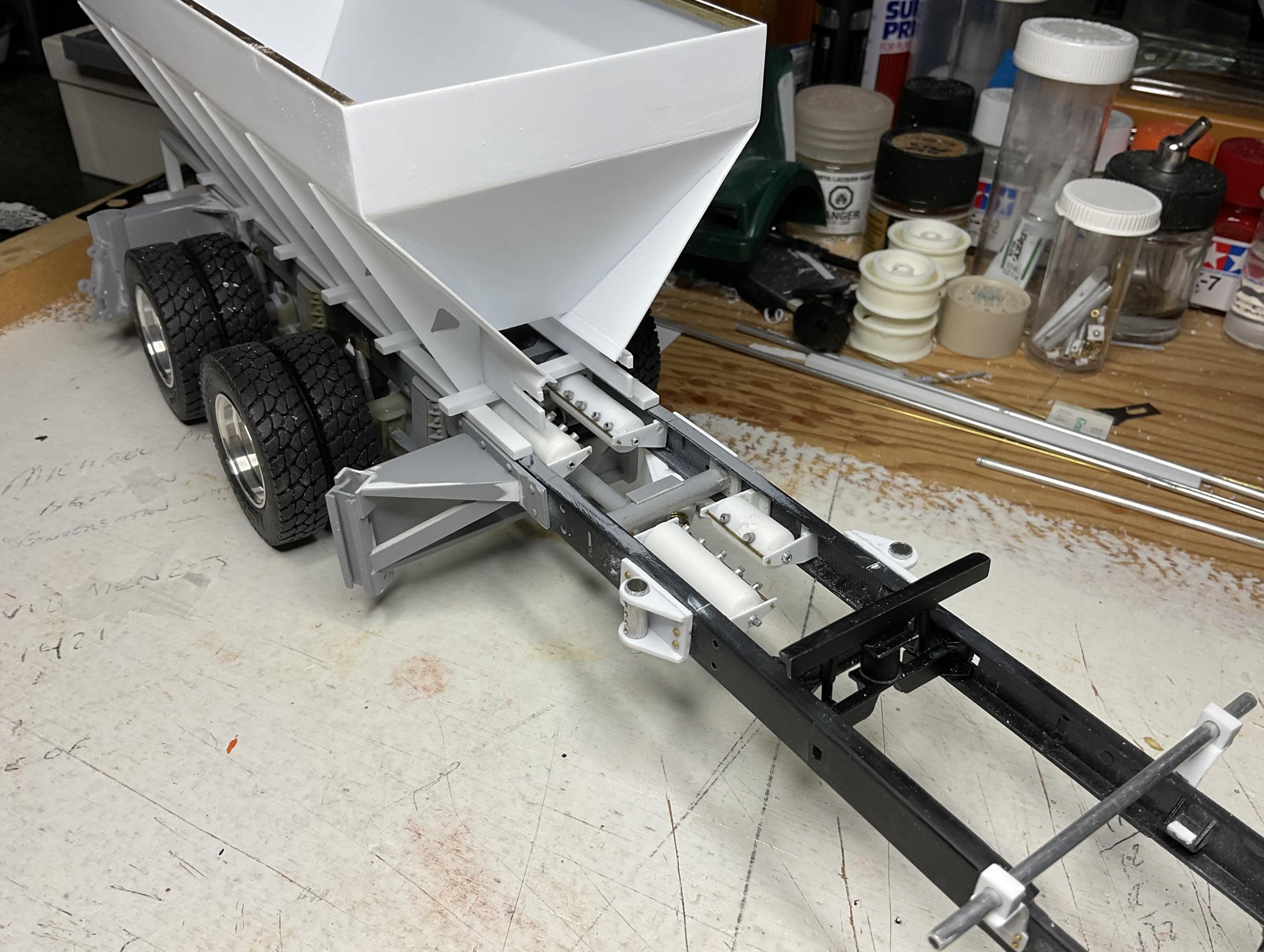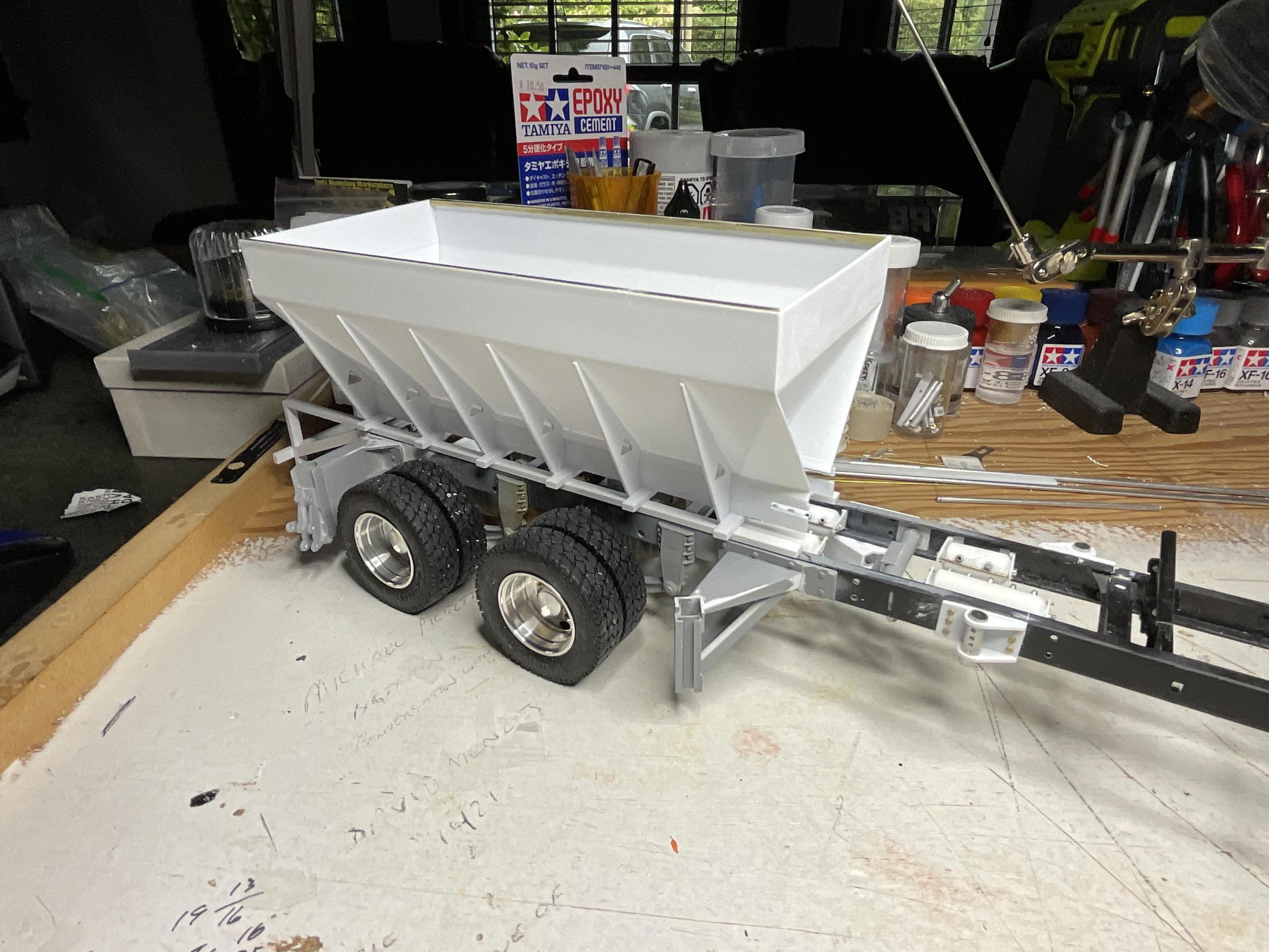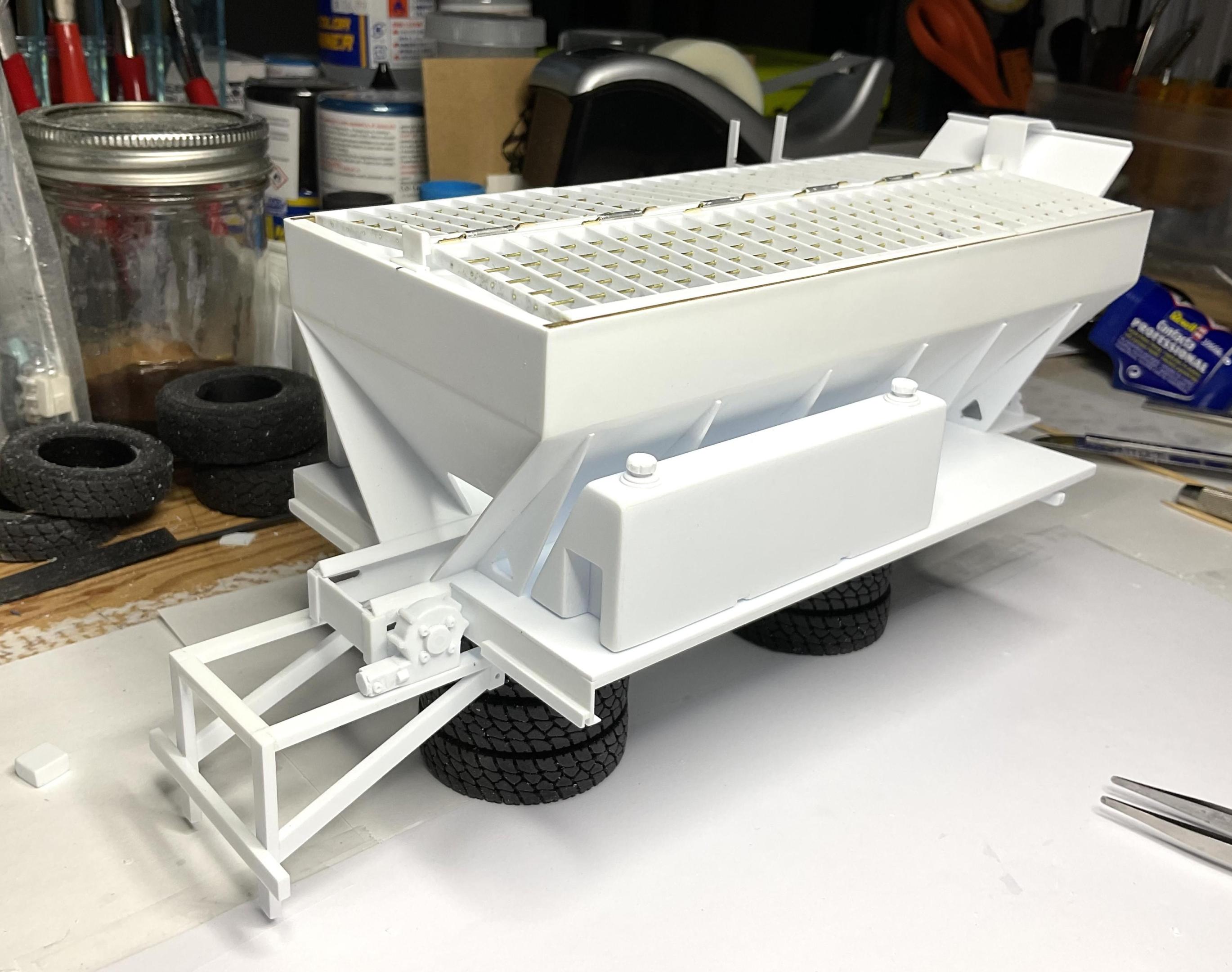 I don't know if there is such a thing on this forum as too many pictures, but I have lots for this build and I do appreciate you dropping in to have a look. So, more pictures ! . . The main build work on the sander is going to be a couple more postings yet and then a couple more in the future, once I get to the hydraulic lines and wiring. Work in this post deals with construction of the six, grate screens on top of the sander – they have an interesting hinge system – they’re not bolted hinges - that allows them to be opened to scrape frozen bits from the side of the sander, or to remove them entirely, if maintenance inside hopper is needed. Also added sand conveyor tension adjusters at front sides of conveyor frame made a little jig (bottom center) to place the 'angle iron' for the grate - needed to make, and drill, lots of cross pieces for the grating rods to go through another little jig (bottom right) to make sure each grate cross piece drilled at same location grate rods fixed in place with CA glue, then onto the next one (of six) the center "I" beam is where the hinge system will be - the upright, vertical sections of channel at both ends of "I" beam, along with the hinges and the weight of the grates, keep the grates in place. this might seem obvious, but when lifted to vertical, the end grates can be slid into the one inch edge of the channel and out of their tubing hinges hinges in place and the open grate can now be slid (to the right) and removed from the sander - other grates on this side can now be removed as well sand conveyor tension adjusters - the end on view of the channel piece under the fender is for a future mud flap Off to do some test painting in the little paint booth I ordered (no lacquer painting in house, so out to little studio shed in back yard) Thanks! -