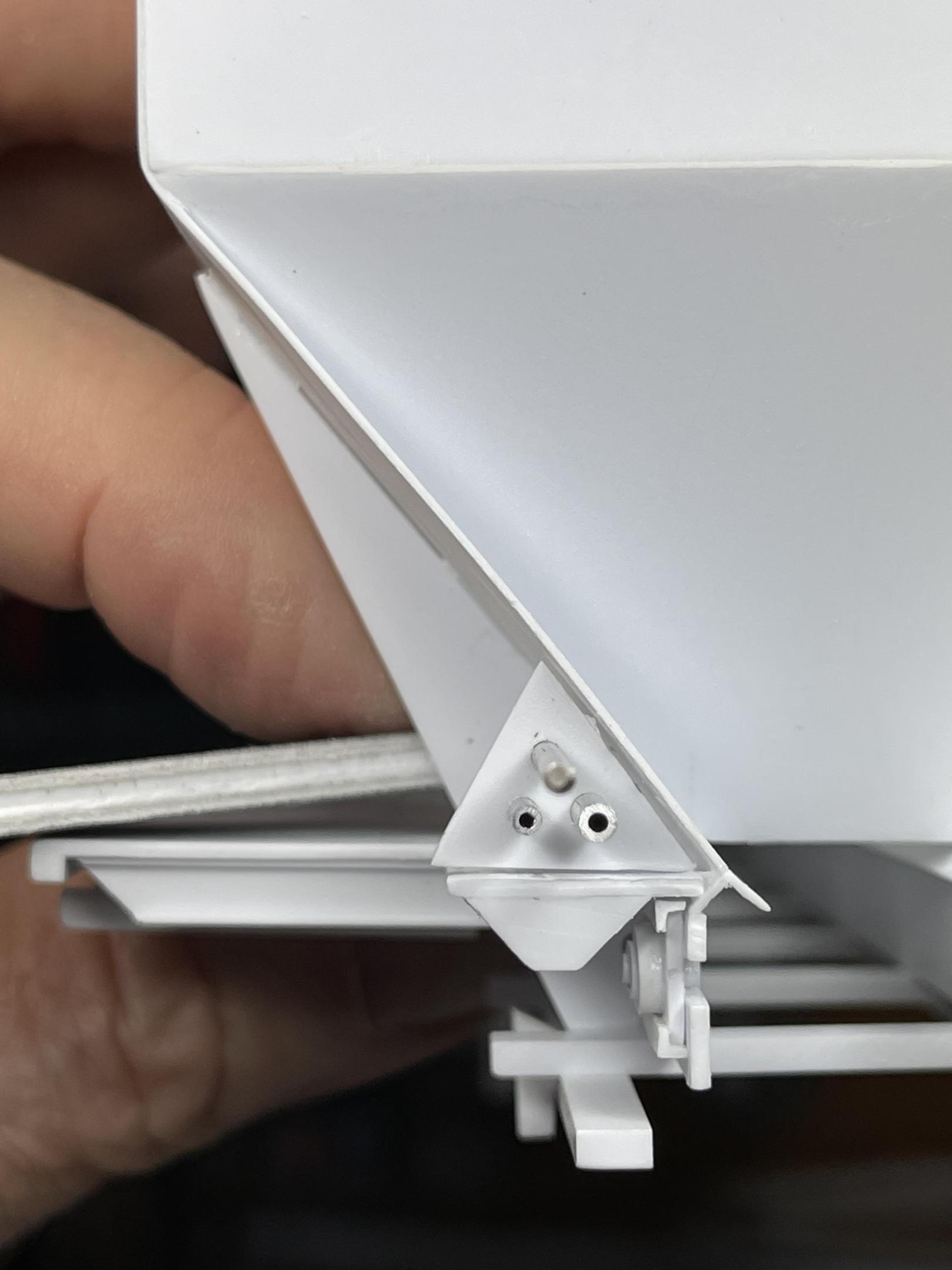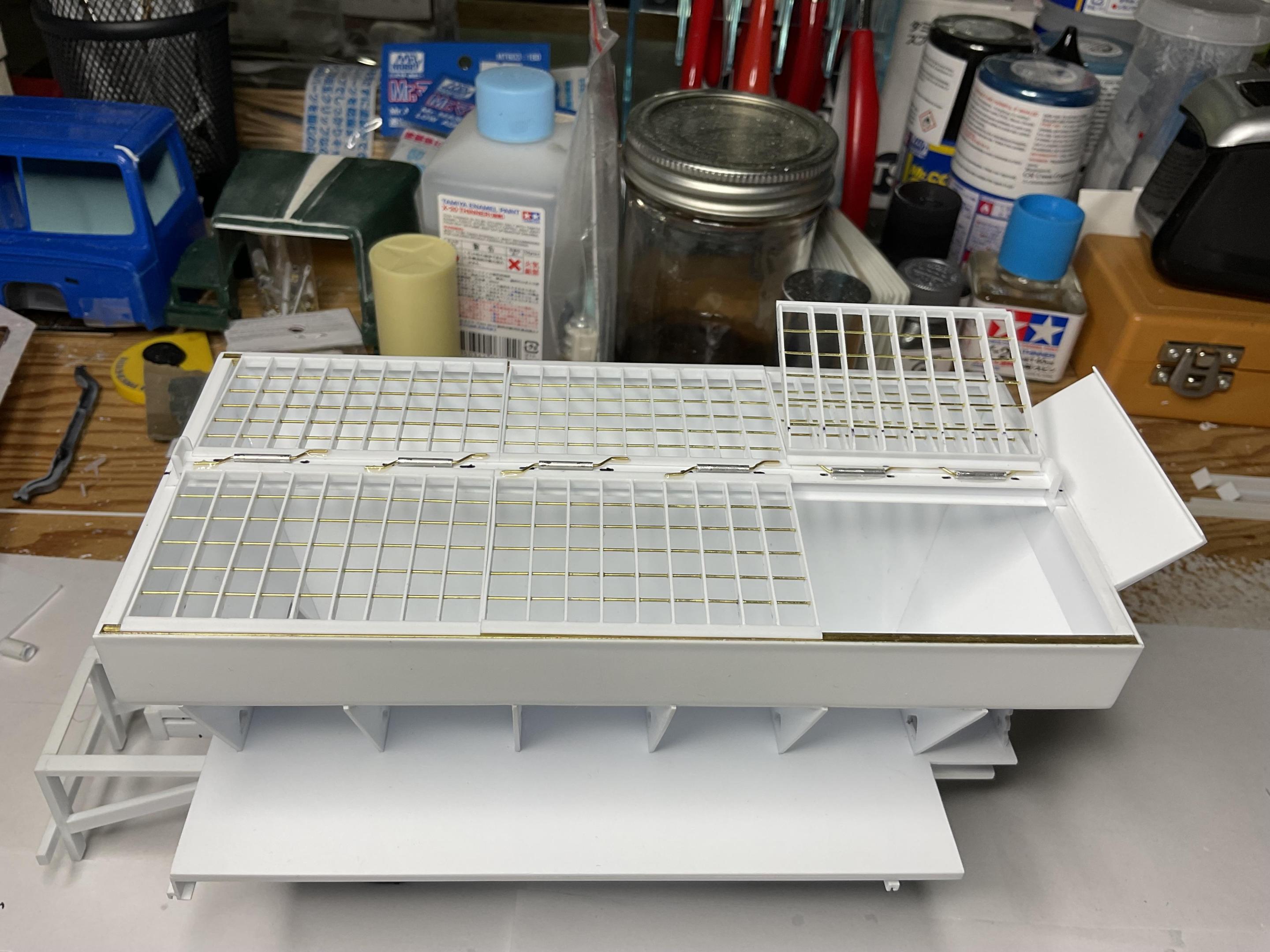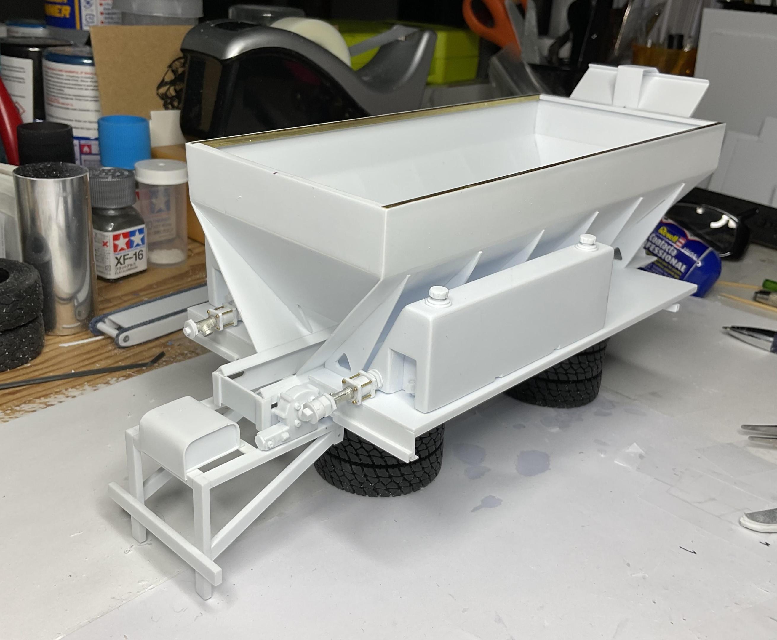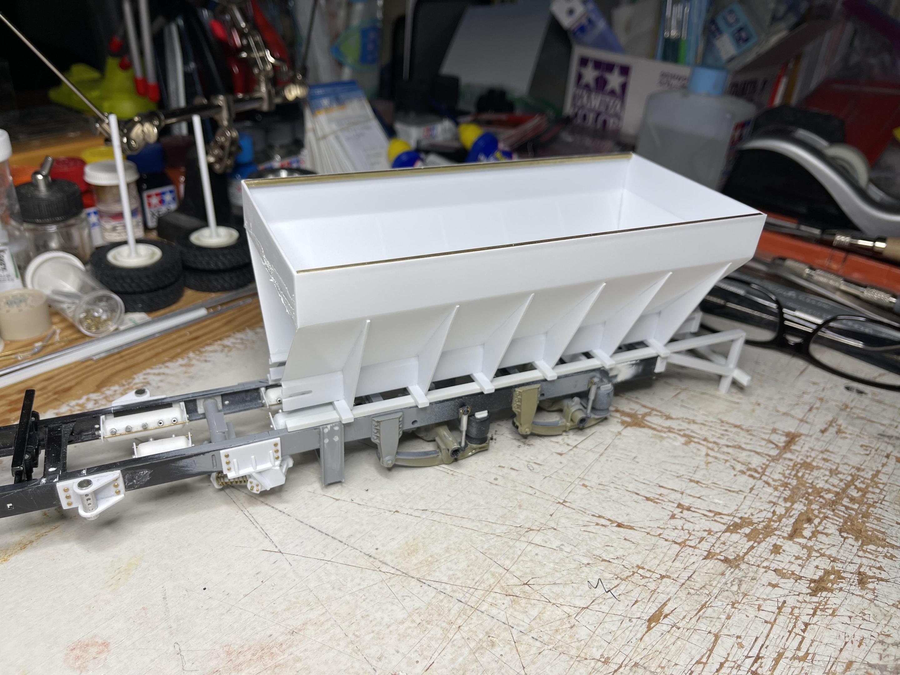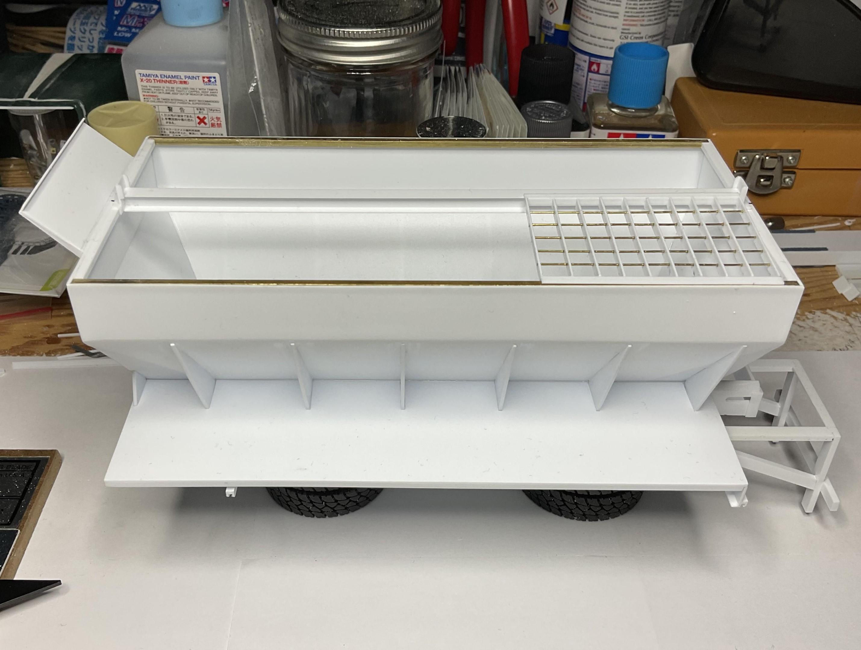 I don't know if there is such a thing on this forum as too many pictures, but I have lots for this build and I do appreciate you dropping in to have a look. So, more pictures ! . . The main build work on the sander is going to be a couple more postings yet and then a couple more in the future, once I get to the hydraulic lines and wiring. Work in this post deals with construction of the six, grate screens on top of the sander – they have an interesting hinge system – they’re not bolted hinges - that allows them to be opened to scrape frozen bits from the side of the sander, or to remove them entirely, if maintenance inside hopper is needed. Also added sand conveyor tension adjusters at front sides of conveyor frame made a little jig (bottom center) to place the 'angle iron' for the grate - needed to make, and drill, lots of cross pieces for the grating rods to go through another little jig (bottom right) to make sure each grate cross piece drilled at same location grate rods fixed in place with CA glue, then onto the next one (of six) the center "I" beam is where the hinge system will be - the upright, vertical sections of channel at both ends of "I" beam, along with the hinges and the weight of the grates, keep the grates in place. this might seem obvious, but when lifted to vertical, the end grates can be slid into the one inch edge of the channel and out of their tubing hinges hinges in place and the open grate can now be slid (to the right) and removed from the sander - other grates on this side can now be removed as well sand conveyor tension adjusters - the end on view of the channel piece under the fender is for a future mud flap Off to do some test painting in the little paint booth I ordered (no lacquer painting in house, so out to little studio shed in back yard) Thanks! -