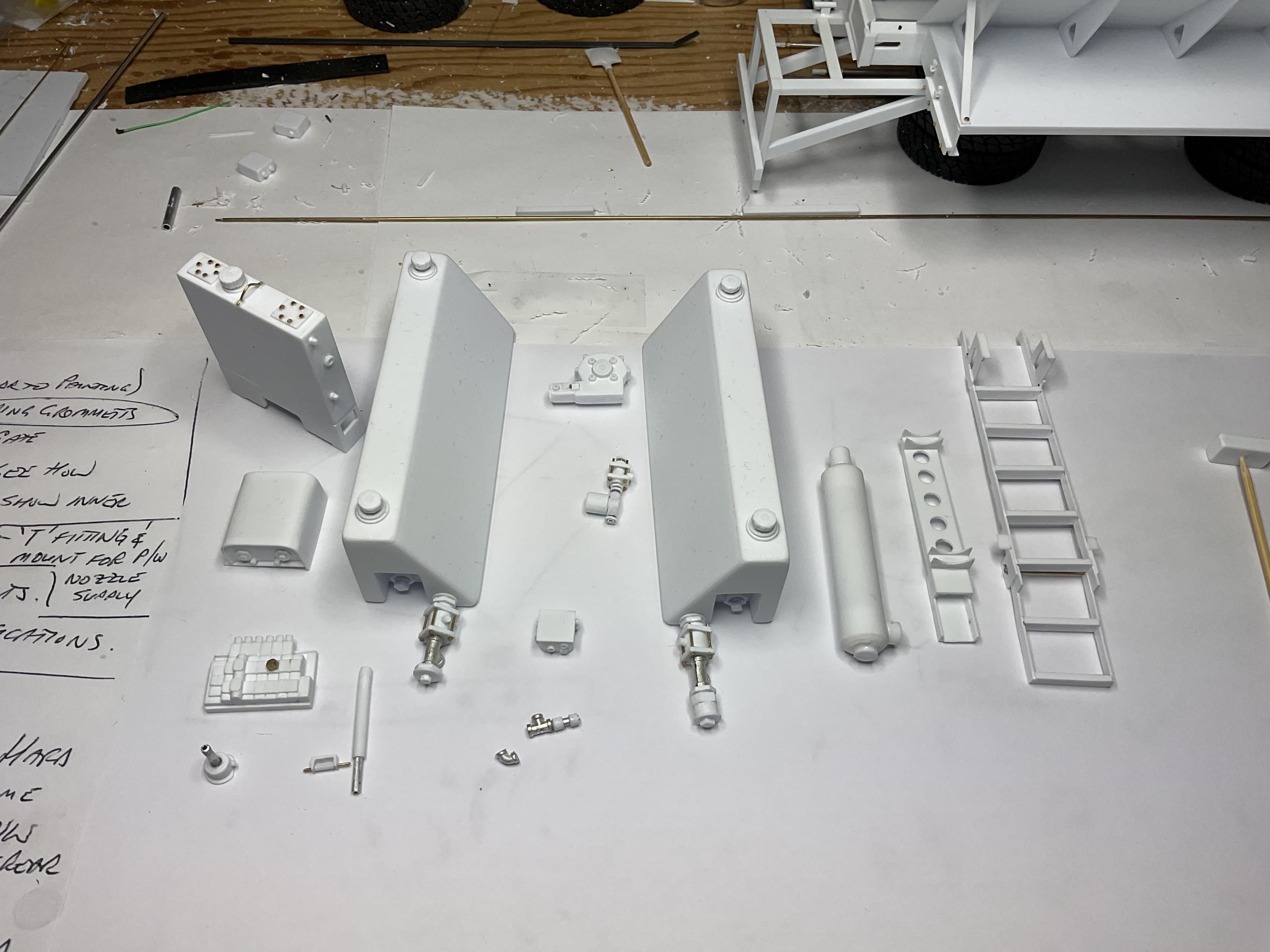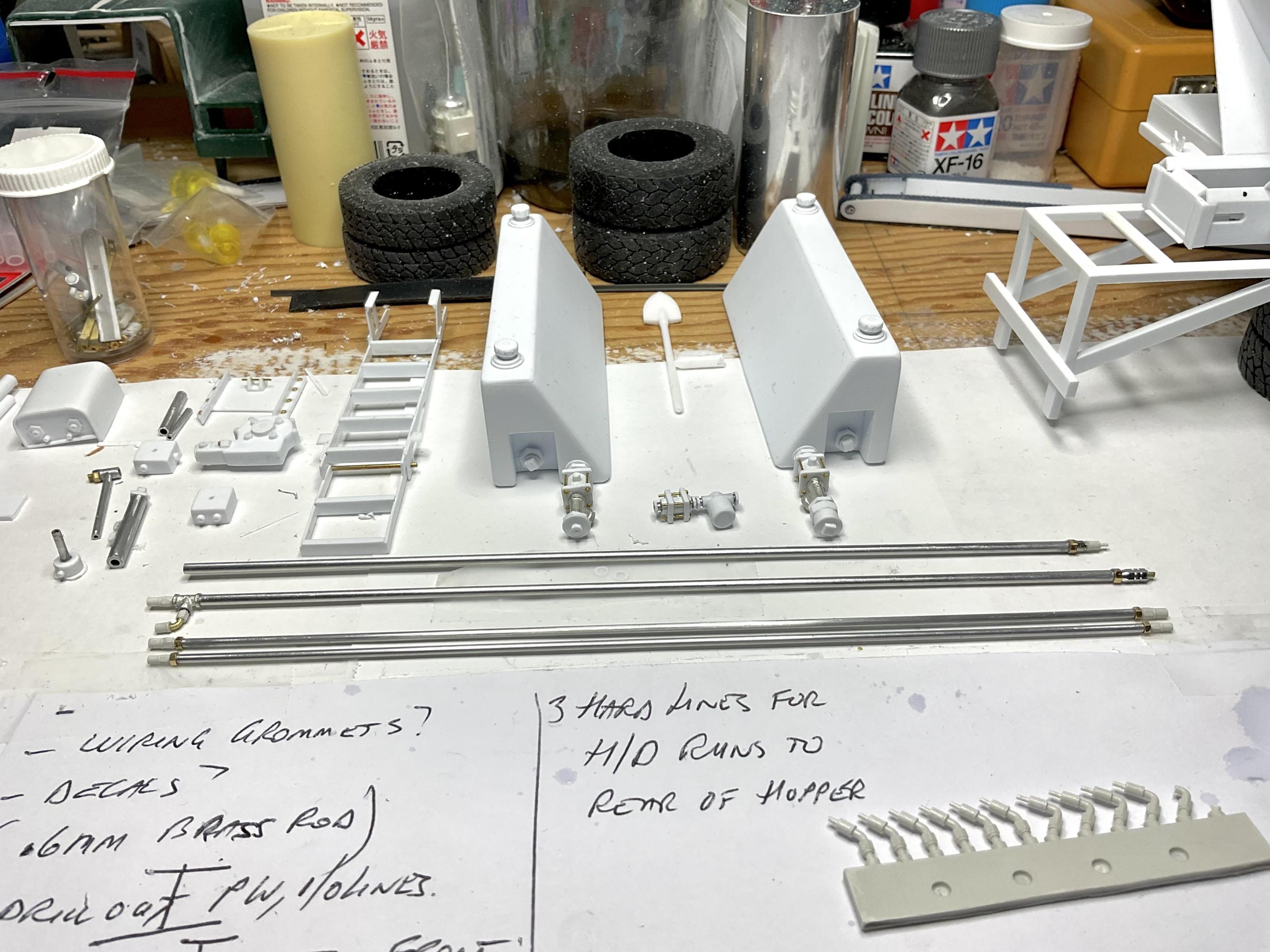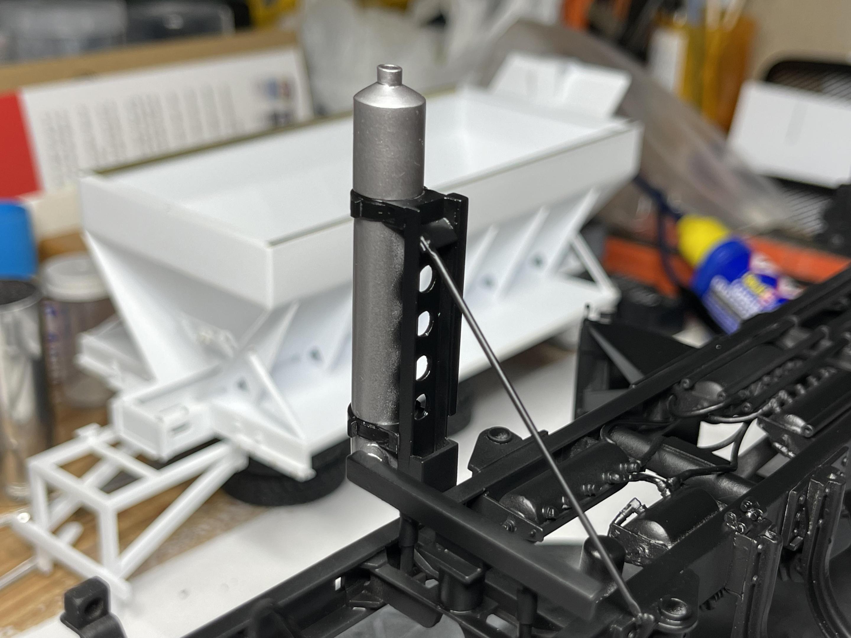 Finished work on the conveyor hydraulic drive motor; worked on hydraulic hard lines and fittings along side of sander; fabricated the pre-wet fluid pump box and the valves for the pre-wet tanks. Got a good start on the truck’s main hydraulic tank and valve body manifold; made the exhaust muffler and mounting bracket. Lots of small stuff made here, but took more hours that I thought would be needed! I kept breaking the resin hose fittings from Top Studio, so, I drilled them out and used brass rod (1.0mm or 0.5mm) for the 45's or 90's as needed - used aluminum rod for hard line and white metal pipe fittings from Wild West Scale Model Builders bunch of little items in this pic, from left; pre-wet pump unit; hopper end-gate and lift cylinder; sand conveyor speed sensor; finished conveyor hydraulic motor; ladder; hard line runs; pre-wet tanks and their related valving (and part of an ever changing punch list of things left to do!) some other items added (prior to painting) - main hydraulic tank; valve body manifold (lower left); muffler and bracket support pre-wet tanks and valving mocked in place start of front support for hard line runs two of three hard lines mocked in place valve bodies, hydraulic conveyor motor, pre-wet hydraulic pump unit mocked in place the white metal "T" fittings will be joined by a hose that equalizes fluid levels in the tanks Lots of plumbing to do after painting - thanks again for your comments! -