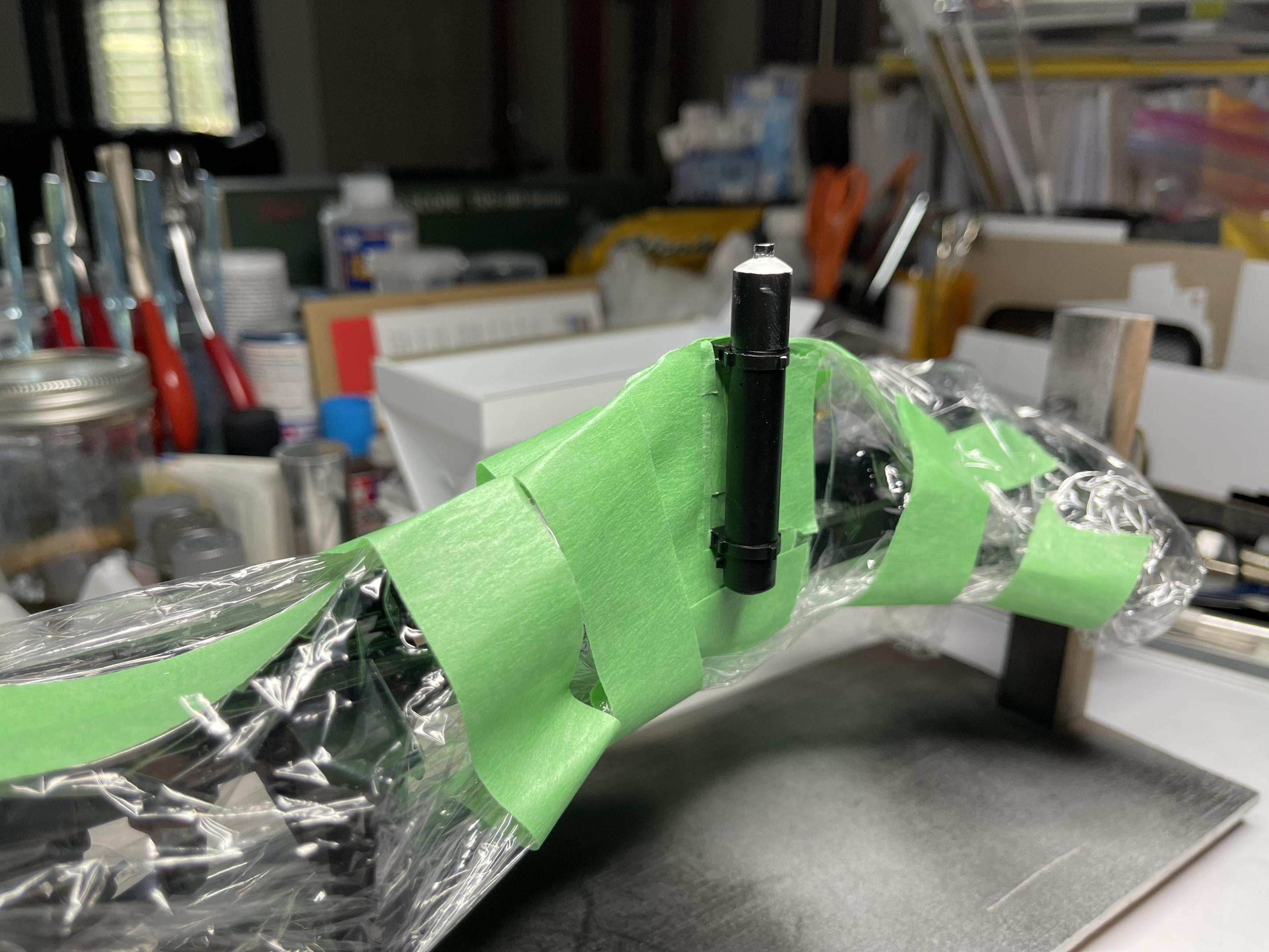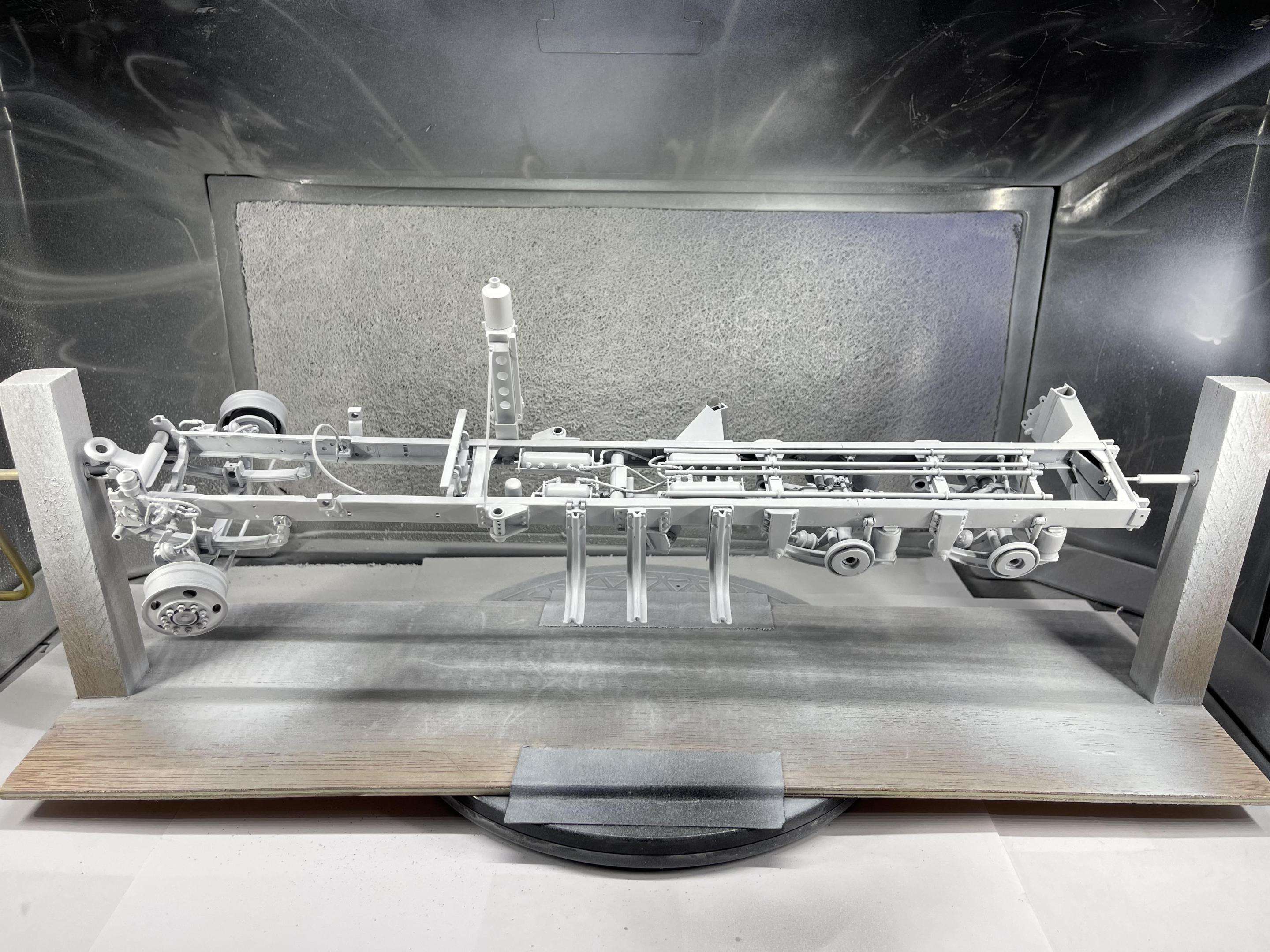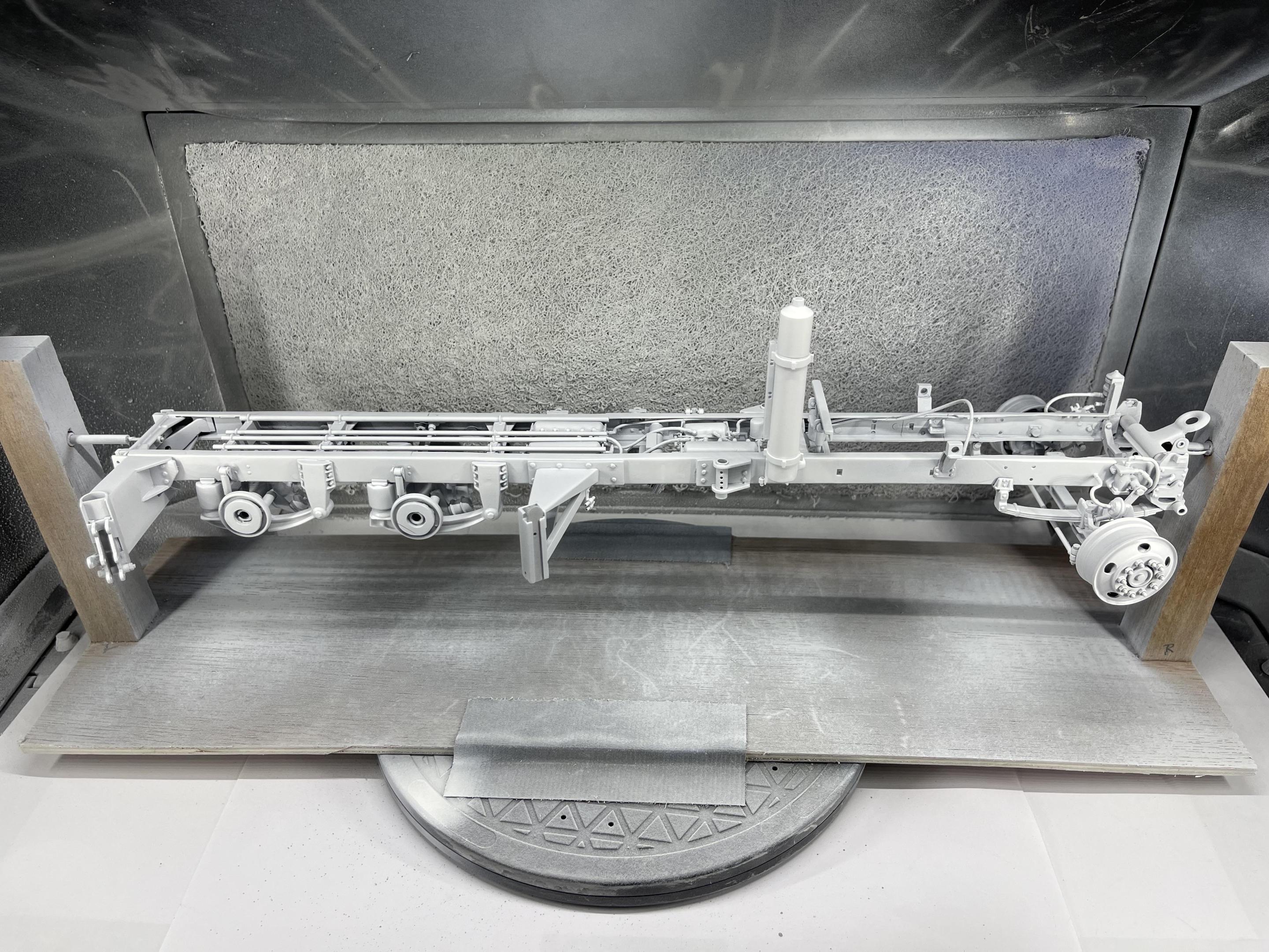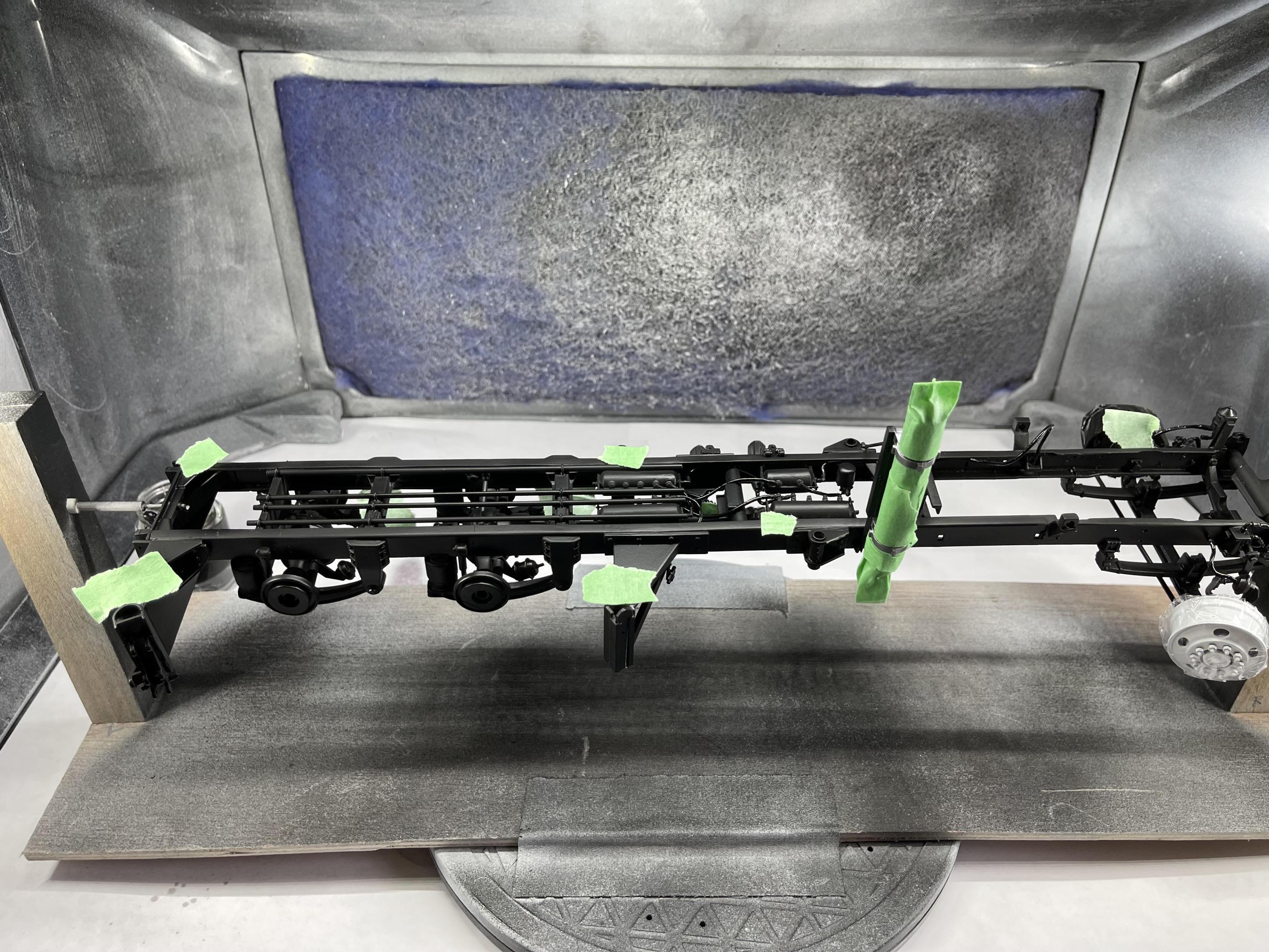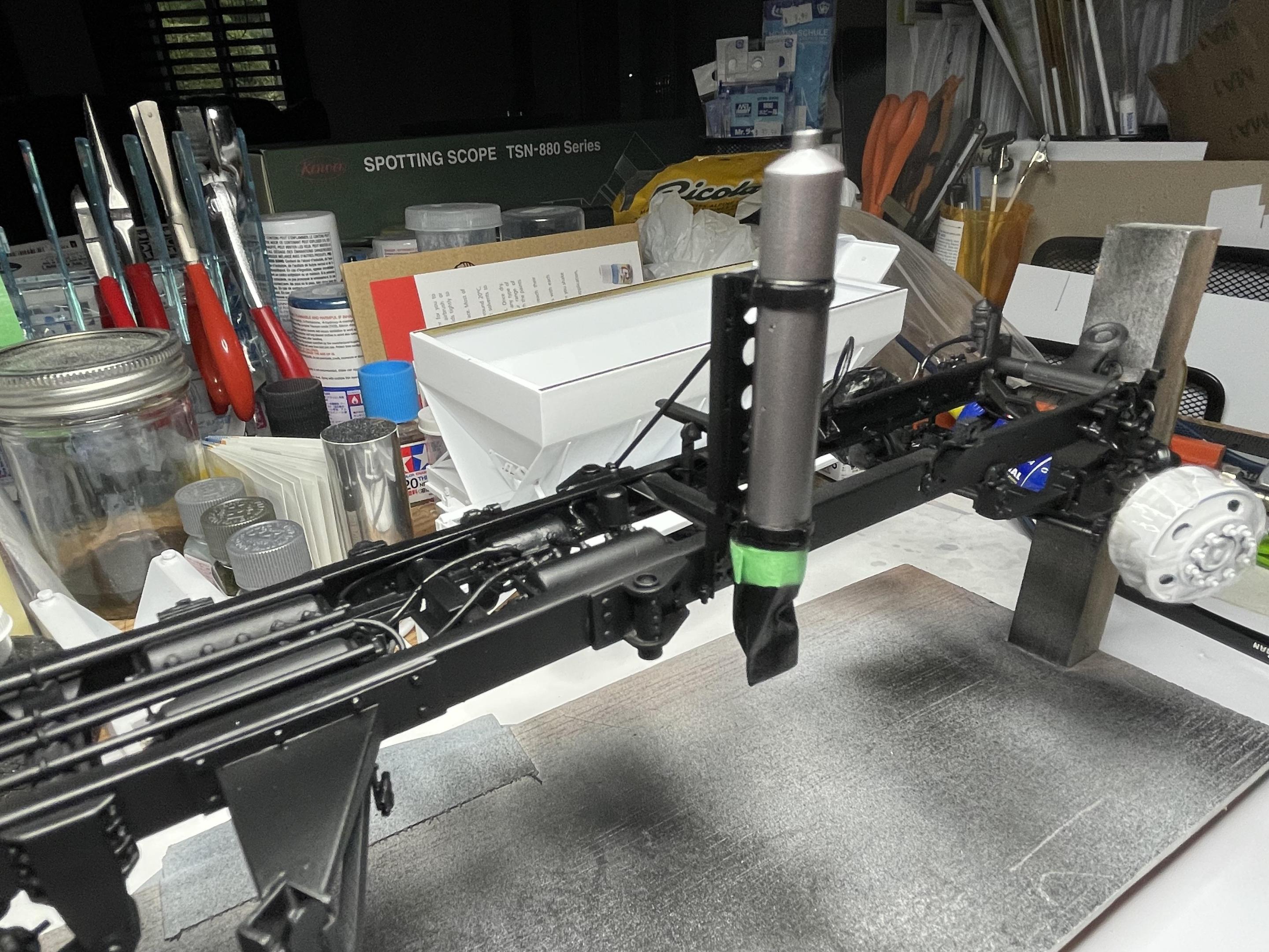 At this point with the pictures, I’m at about eight months into the build (October 2023) but had a break from it for June - August of 2023. Was waiting for some parts initially and that turned into a bit of a loss of momentum. Still, lots of motivation from looking in at the forum and work on the sander had me going again in September. Flow of work was beginning to change from building to painting and detailing. Plans for new work included adding the muffler bracket, the muffler and it’s shield, working on the hydraulic system, finishing the engine to the point where it could be installed, and painting all the attachments. So, more priming and painting – and pictures! frame dusted and ready for primer (rear wheels were going to be primed separately) couldn't figure out how to handle frame and paint at same time, so made a rotisserie could turn the frame 360° I duct taped the rotisserie to a small turntable and was able to get at the frame from all angles, using Tamiya, grey fine primer (supposedly good for the metal bits as well) hard to see, but the blue lines/arrows are pointing to temporary pieces inserted to prevent paint buildup, so the wing plow front mount would still slide up and down, and my future hydraulic lines could thread through their supports painted the frame Tamiya satin black - lots of masking to paint muffler muffler's been painted, but now had to mask off muffler and paint muffler support straps (and other places I had missed on frame - green tape!) the muffler is representative of a Donaldson, mounted on Western Star's muffler bracket and brace Thanks for hanging in there - more to come! -