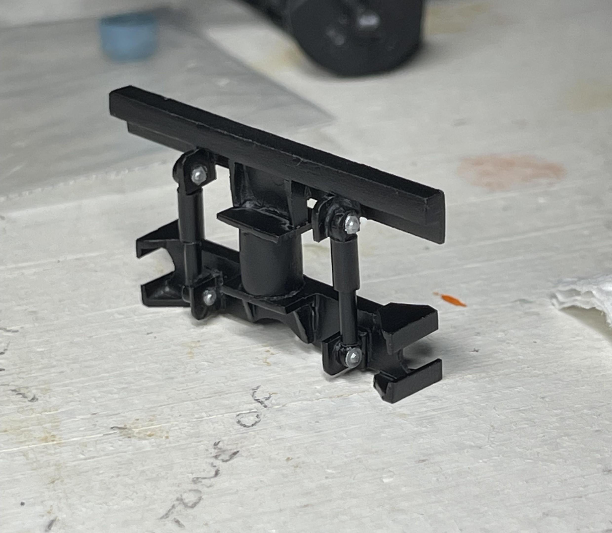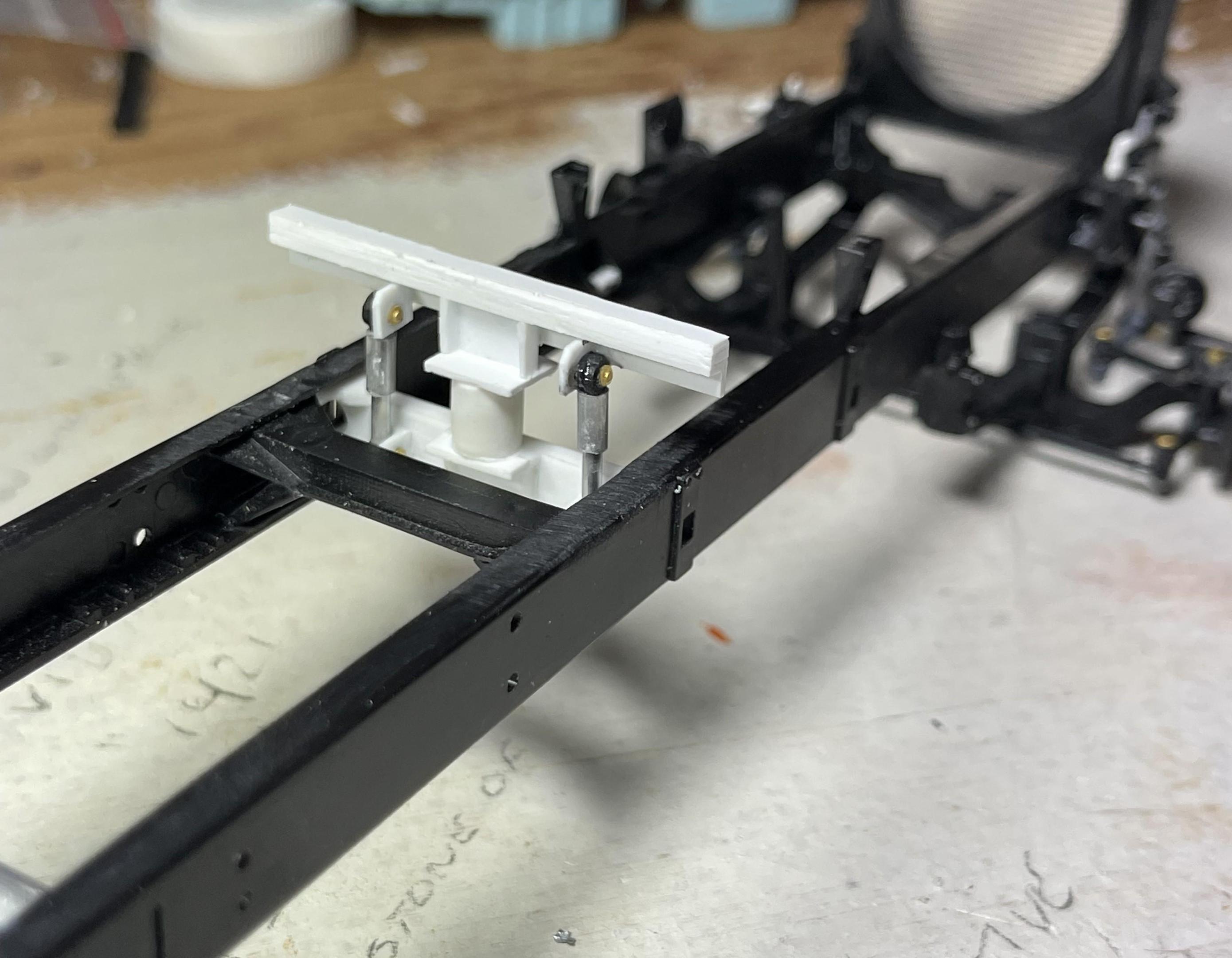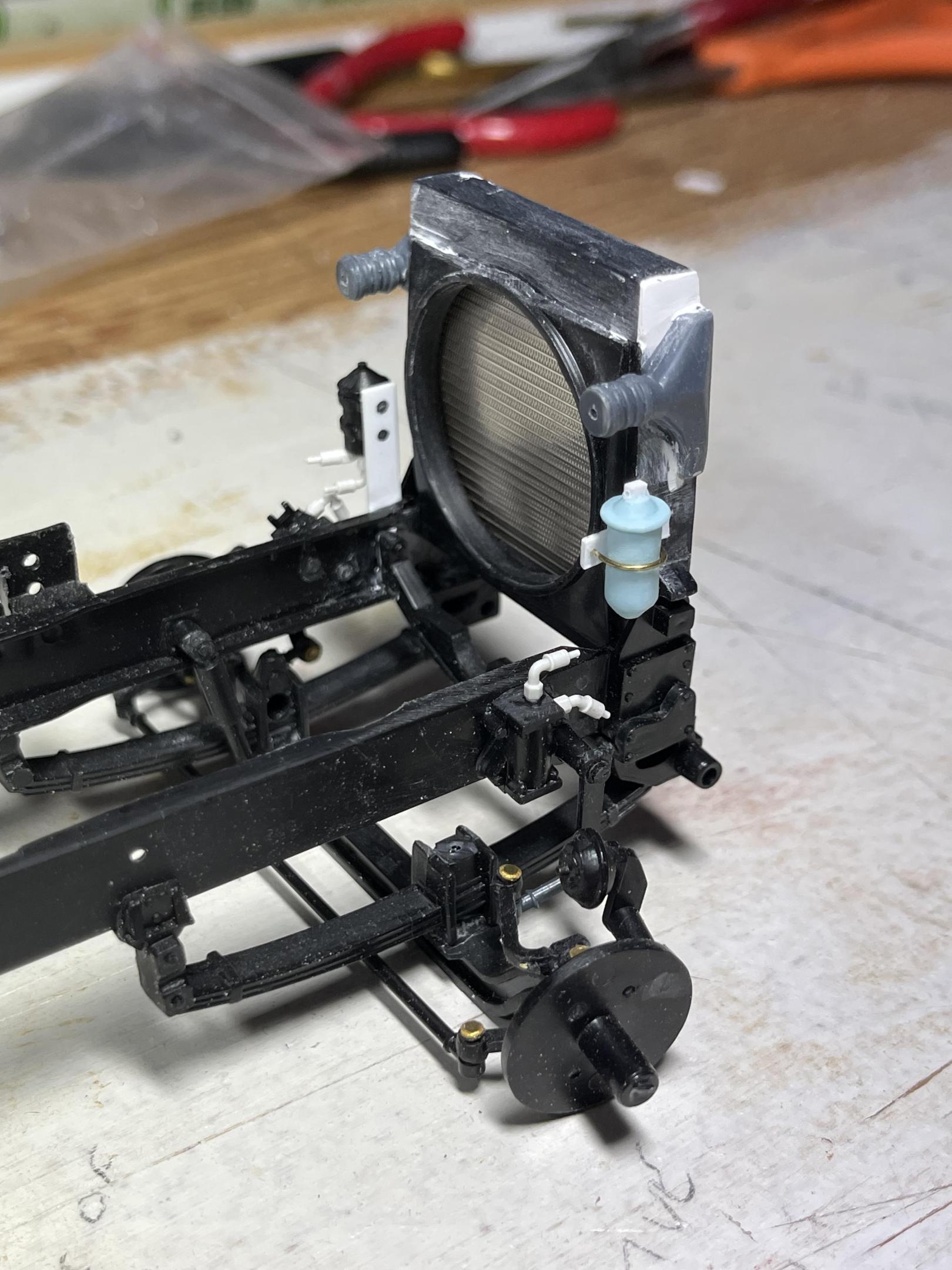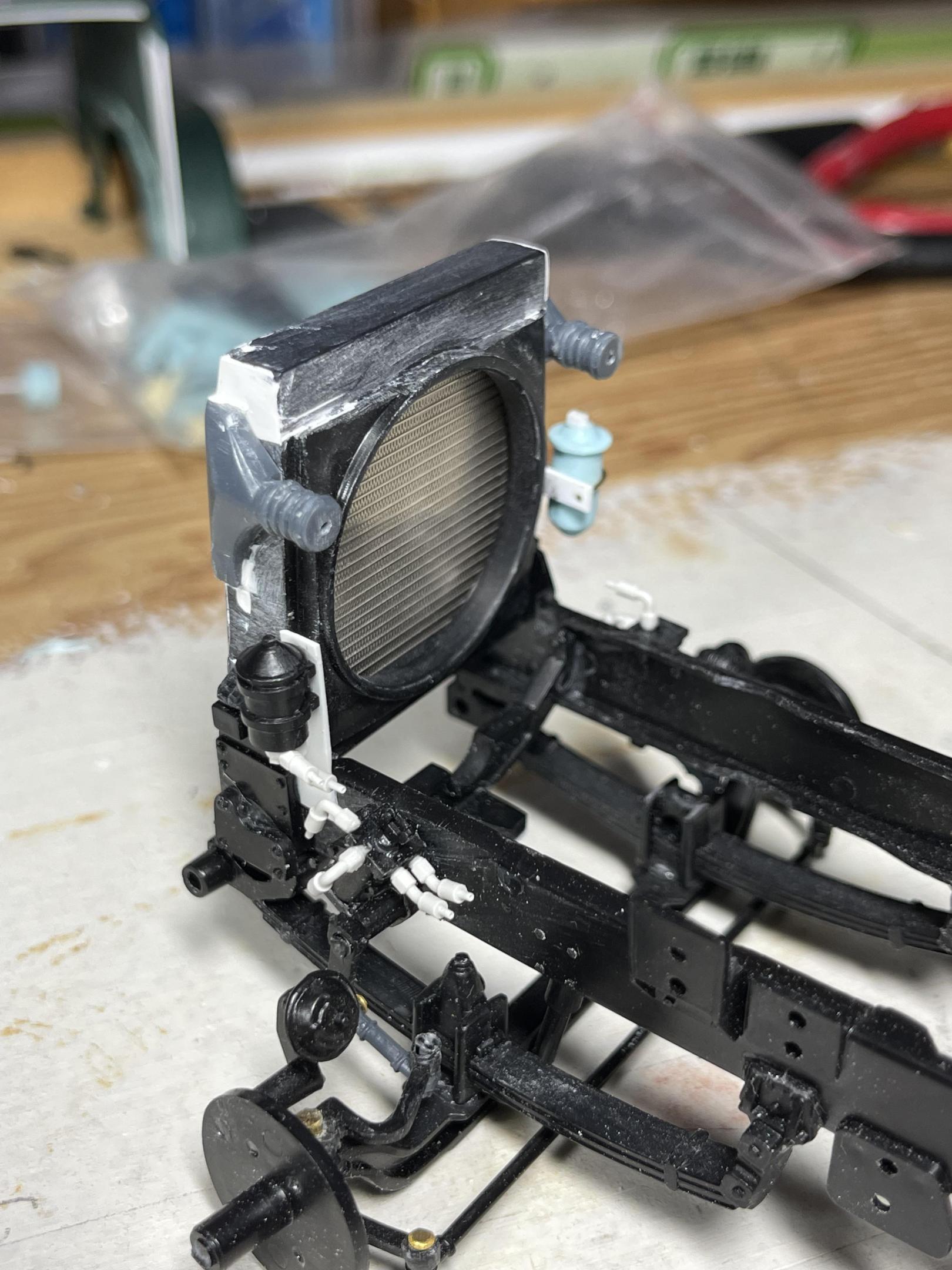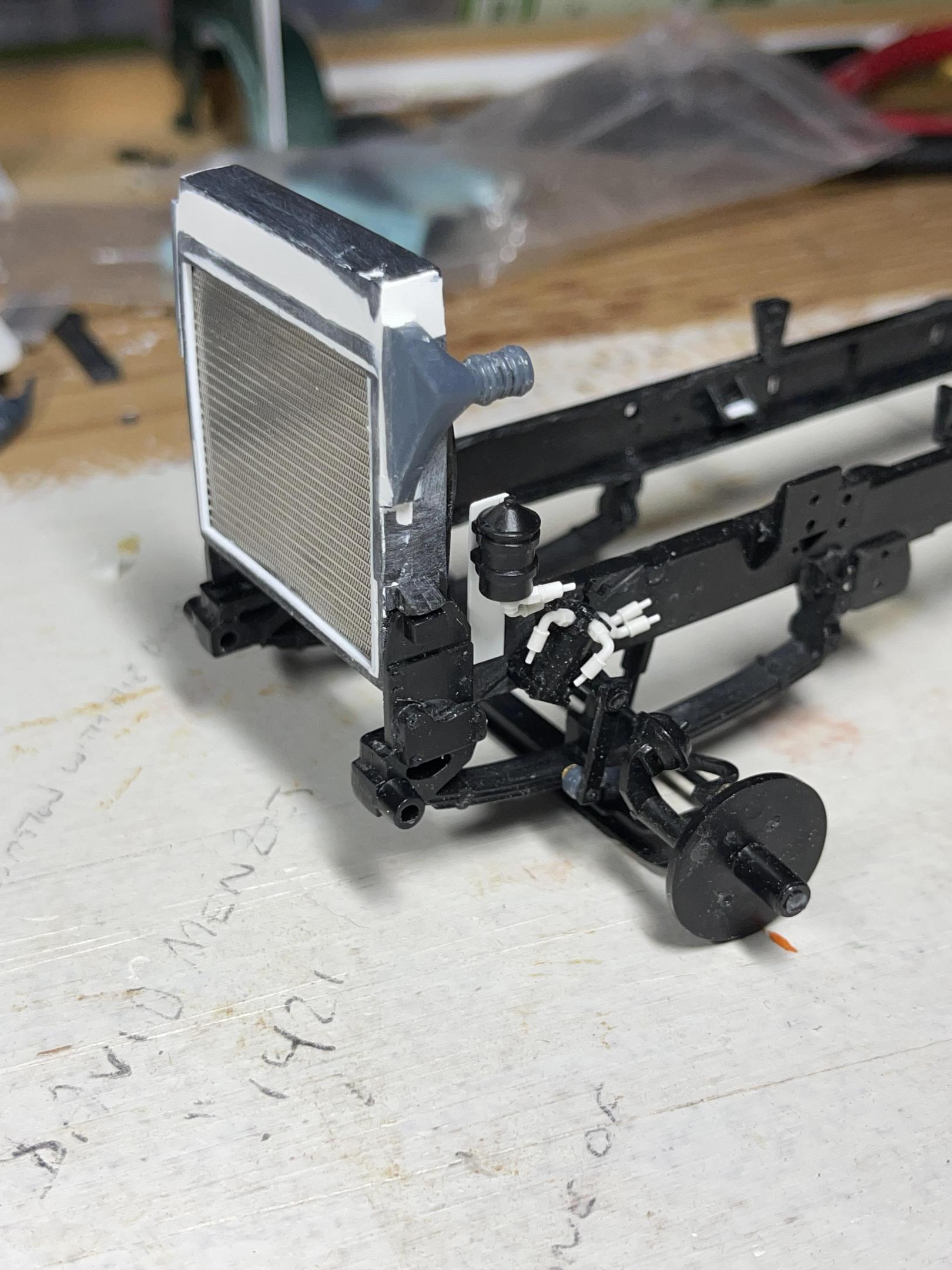 First thing I chose to do with the new model, was to make the cab’s rear, air bag/shock support and cross member. Re-worked the radiator, increasing the top tank height, adding PE mesh from CTM, the air conditioning receiver/dryer, and the charge air cooler inlets. Added fittings to the power steering racks(?) - there was one on each side of the real truck - and the power steering fluid reservoir and fittings