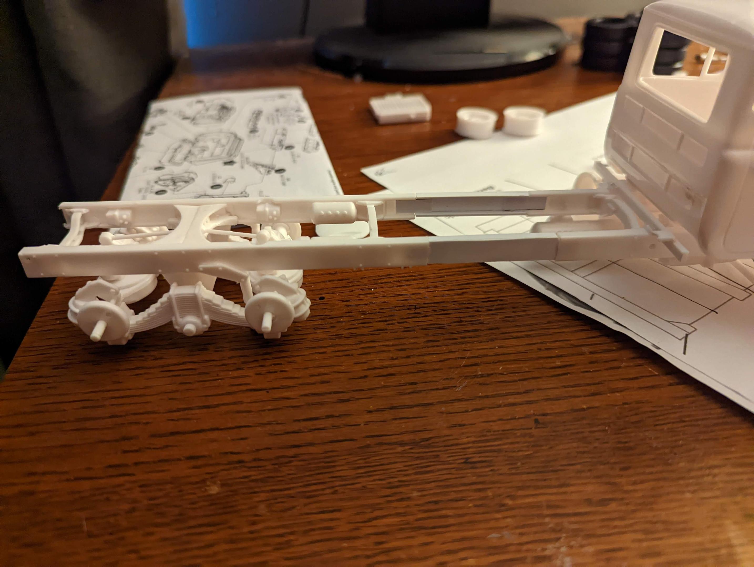 Didn't mean to let half a year get by, but this project got away from me. Getting back to work on it now, got the chassis pretty much done, just needs final assembly which I've been working on. Gonna make this a curbside model, so the engine is crudely painted. Getting ready to start on the Leach body. If anyone has any scale drawings they'd be willing to share, that would be appreciated, and if not I can make my own. -