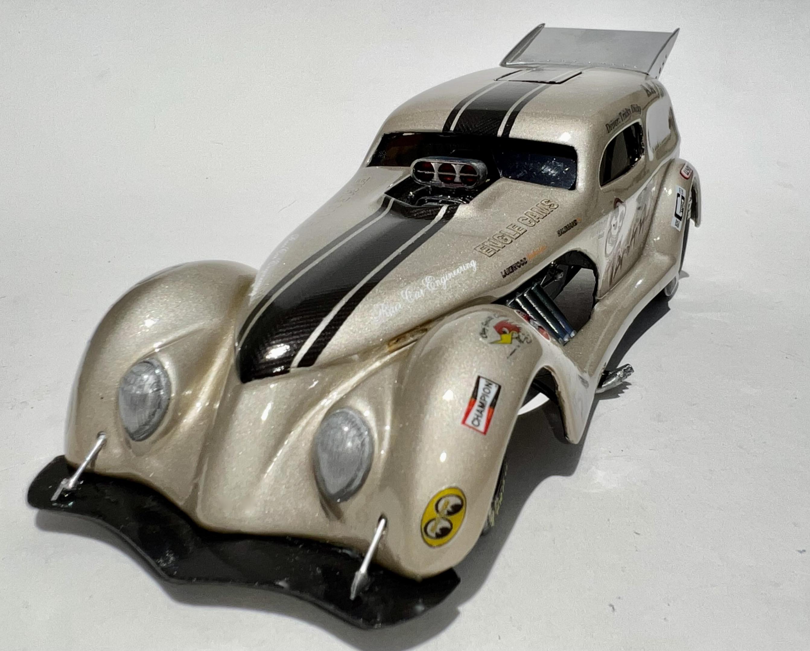 What would a highly customized 1938 Custom Ford Delivery Funny Car look like? This project was one of those what-ifs that turned into a reasonably complicated, challenging build, hence the name. I try to include just enough realism to be plausible. In the end, I am happy with the results, which is the point of all this craziness. Enjoy, and thanks for looking. Donor Kits Lindberg 1:24 Scale 1938 Custom Ford Van - body o Body Mods Top chopped addl. 3” chop on already chopped 4” kit Body lengthened approx. 1.25 scale ft, smoothed and sectioned 6” Wheel openings reshaped Side vent cut-outs Hood blower lip Tinted windows - smoke Front Splitter & Rear Wing – styrene sheet Escape Hatch Revell 1:24 Scale McDonald’s Olds Funny Car - chassis Chassis Mods Posable Front Suspension – scratch built Fire Bottles, Black Box and Fuel Tank repositioned Engine Mods Plug Wires & Injector Plumbing Blower Pulleys & Belt – Pro Tech Add-Ons 5 Point Racing Harness Twin Parachutes – scratch built Paint Tamiya Titanium Silver TS-88 (body) Tamiya Light Gun Metal TS-46 (chassis) Tamiya Gun Metal TS-38 (engine block) Tamiya Black TS-14 (wheels) Tamiya Matt Black TS-6 (body underside) Tamiya Clear TS-13 Rust-Oleum Bright Coat Chrome (rear wing, tinwork, headers, fuel tank) Testors Gloss Red, Gloss Black, Flat Black, Med Silver, Zinc Chromate Molotow Chrome pen Decals – custom inkjet, model kit & carbon fiber