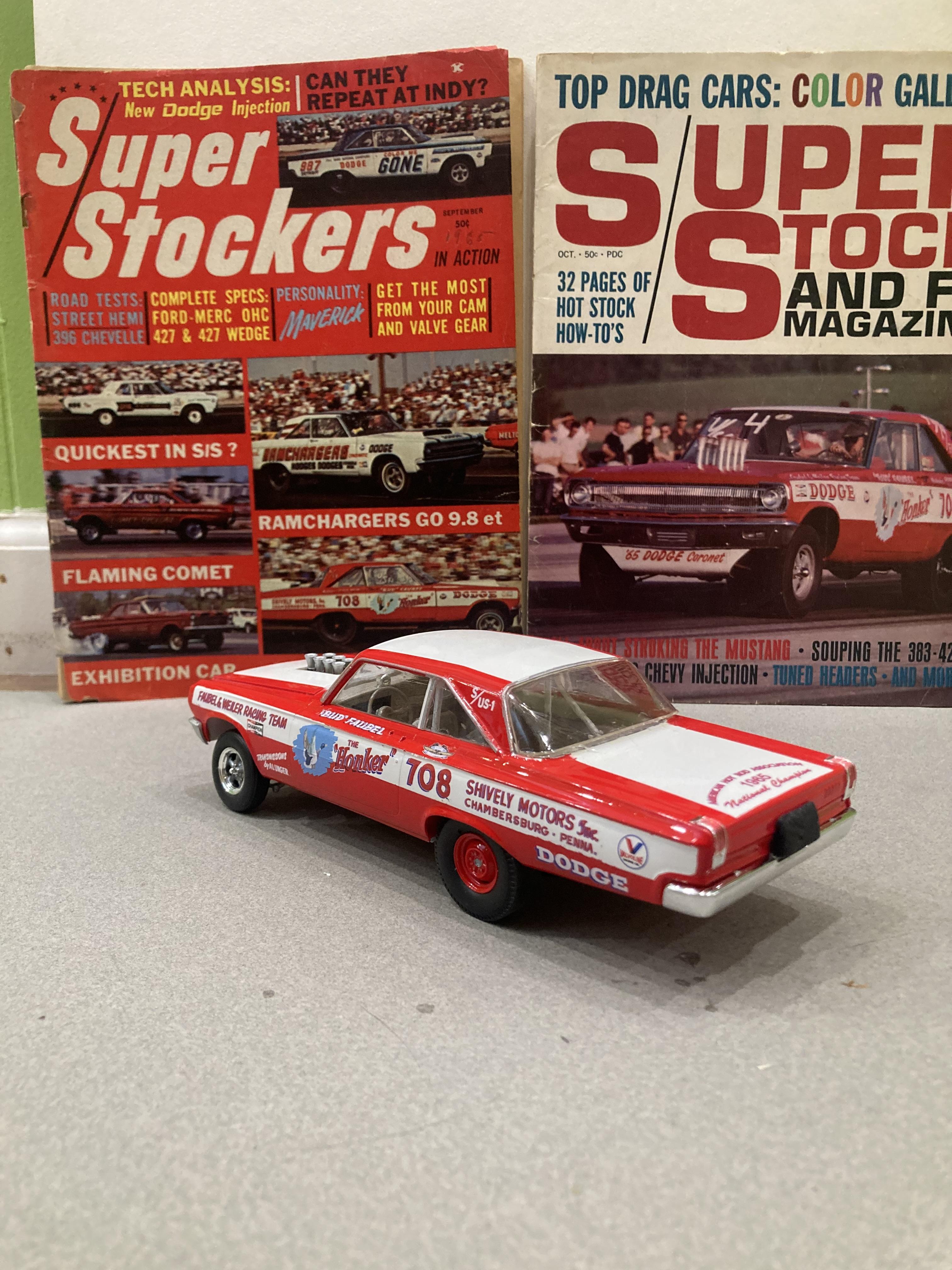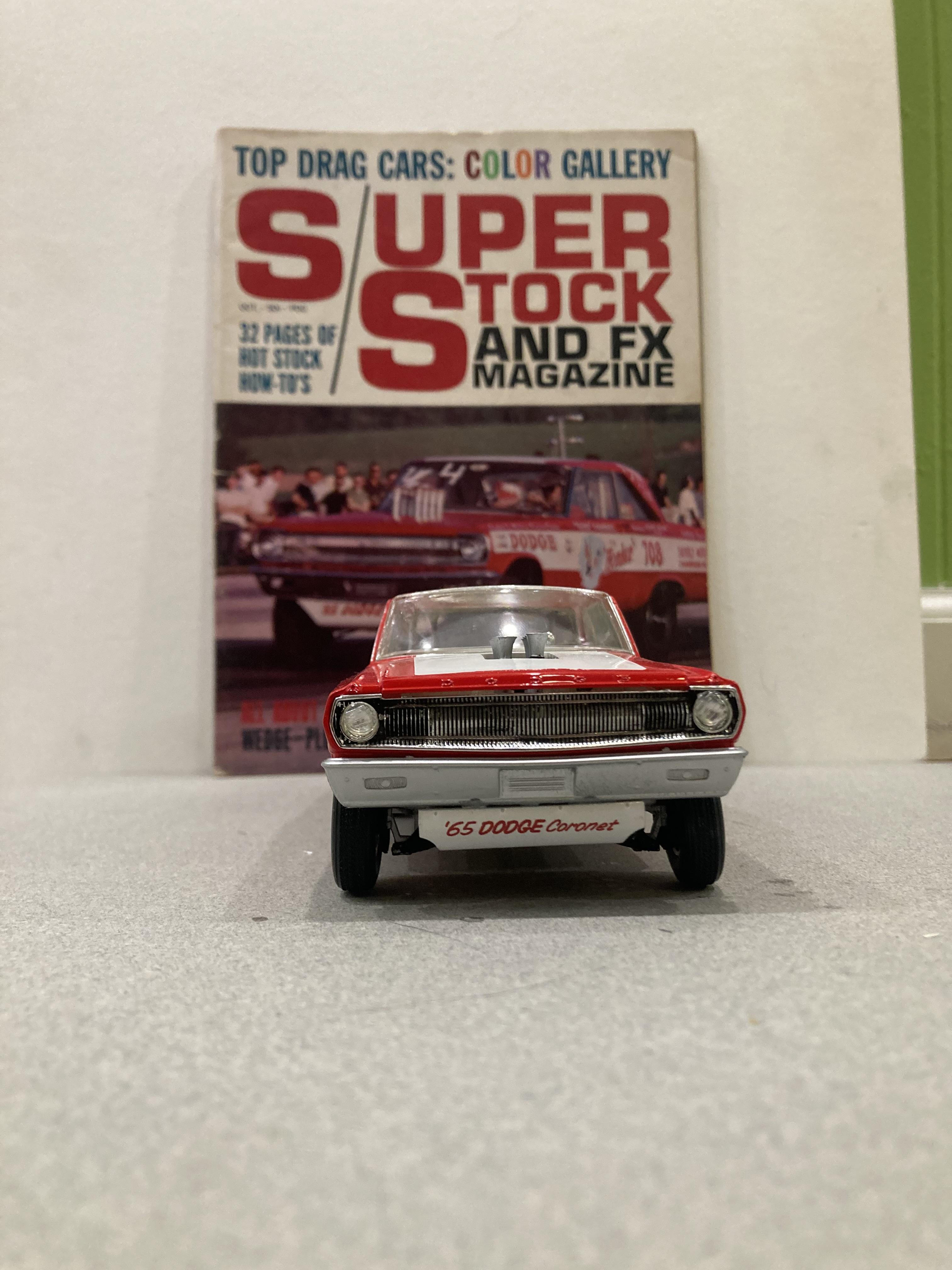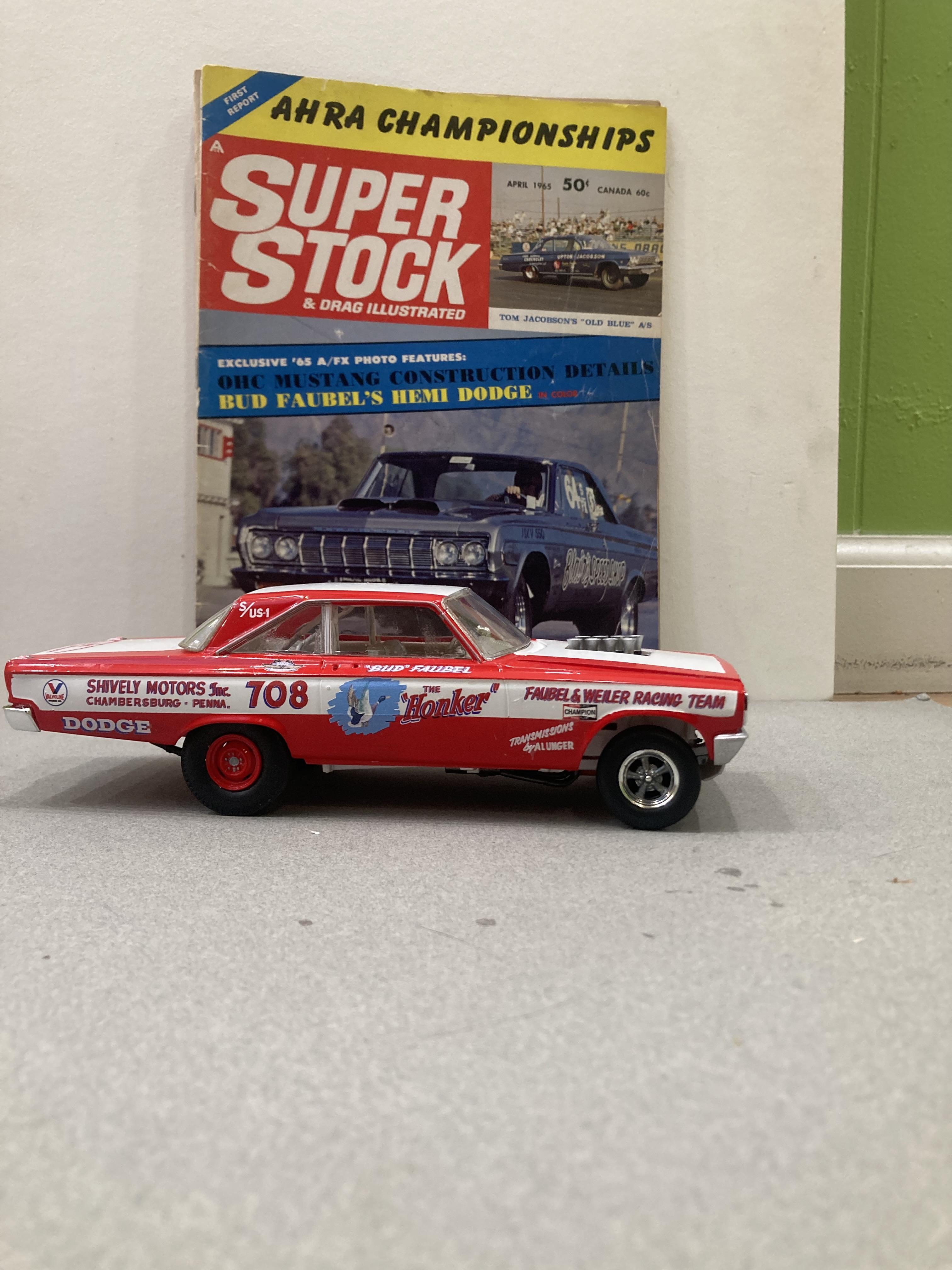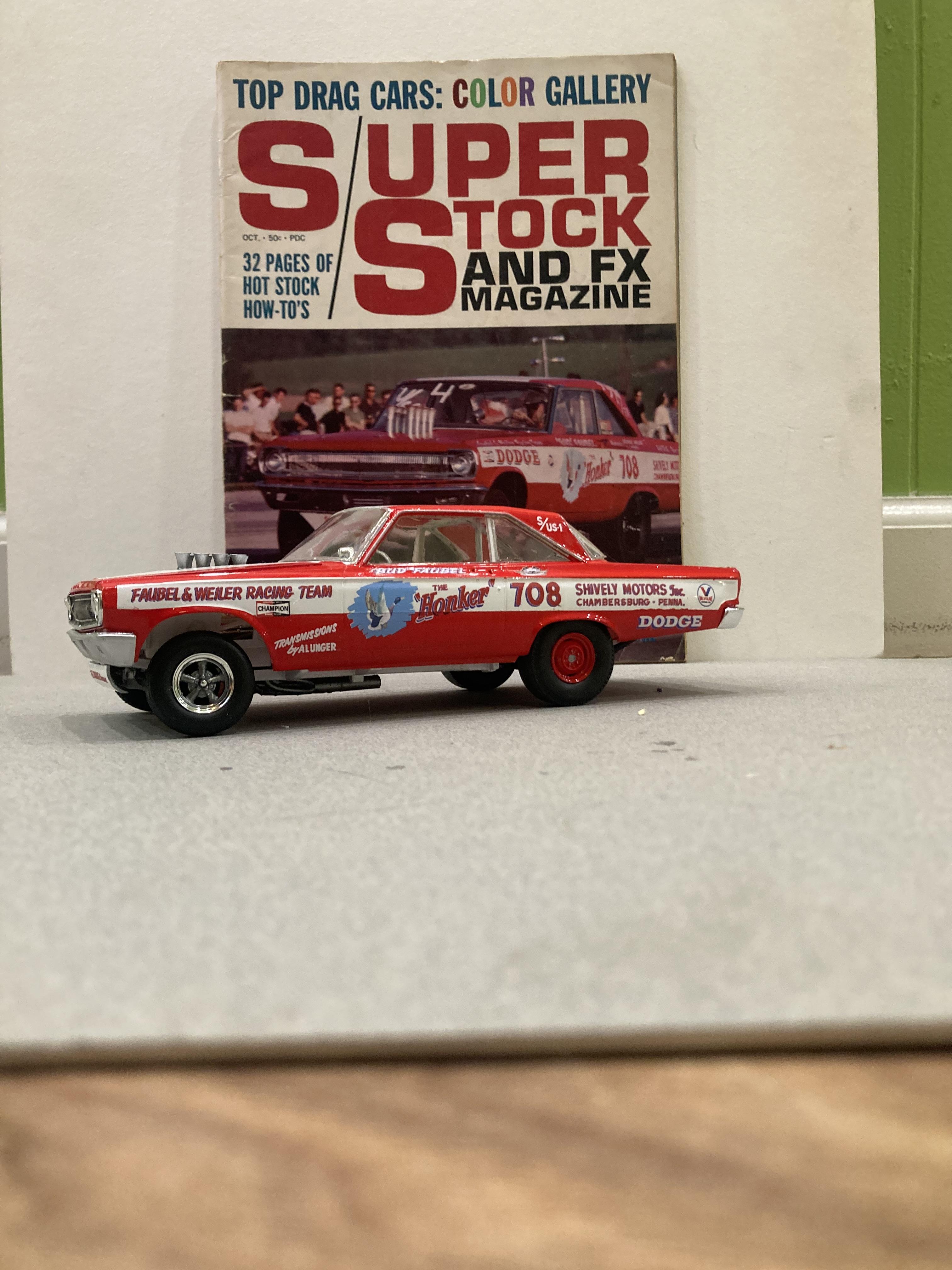 The fantastic Moebius kit sprayed with Tamyia white and bright red topped with a set of Chris Walsh decals . The version I built is the later in year into 1966 version . The magazine reference photos show the early season carbureted version which I will most likely build down the road sometime. Chris Walsh has decals to do both versions. In my opinion this was the best looking of all the Awb Mopars . This is the very first issue of my dads old super stock magazines I got my hands on I think I was 12 or 13 years old it still remains as my favorite issue I can still remember drooling over the full color center fold . until next time thanks for looking, Mike