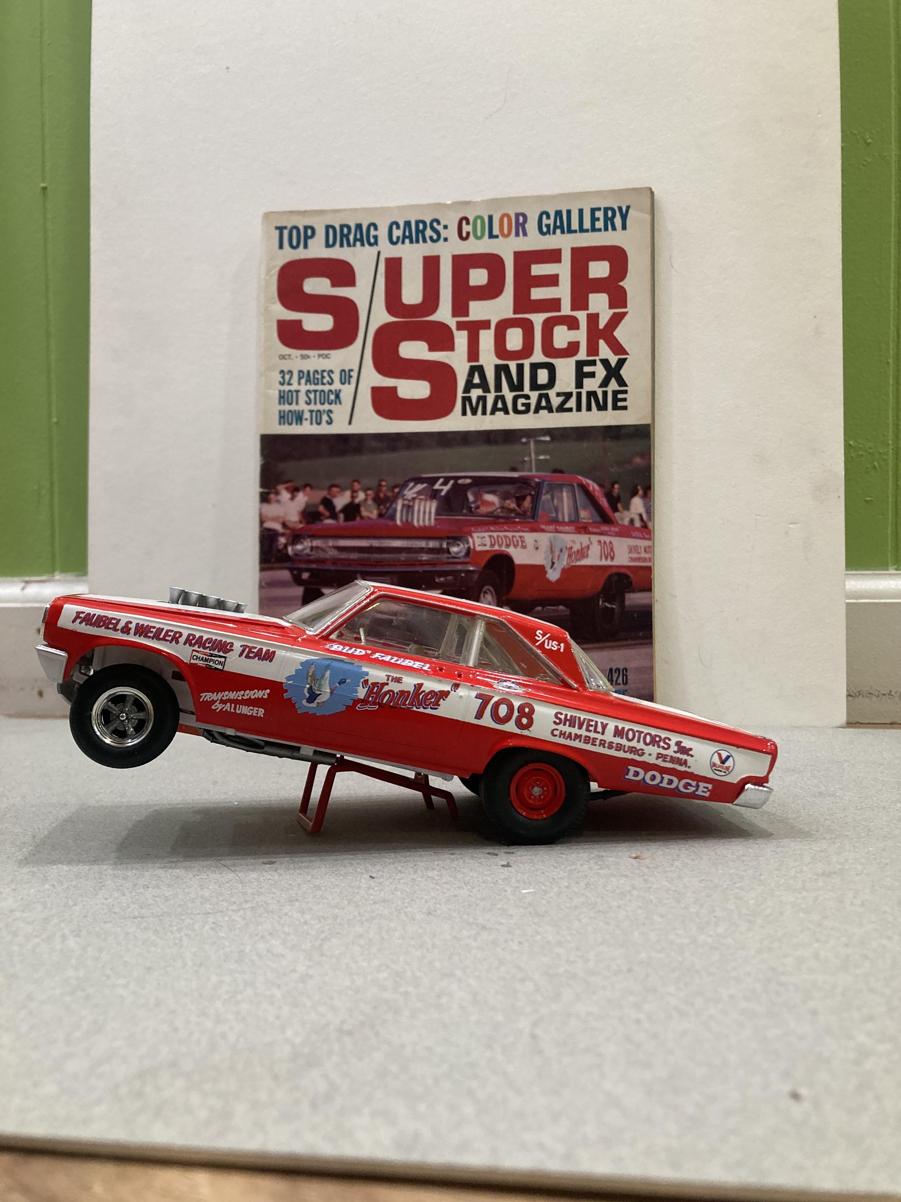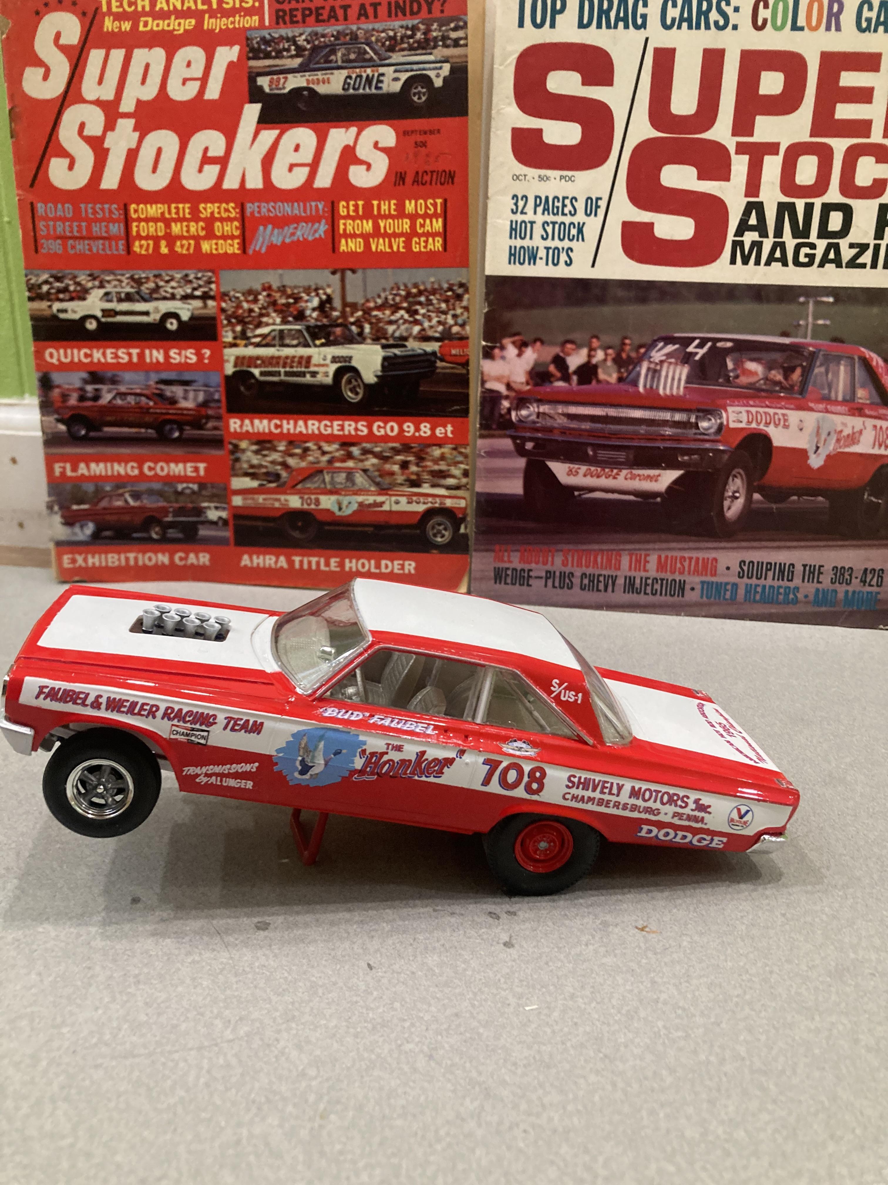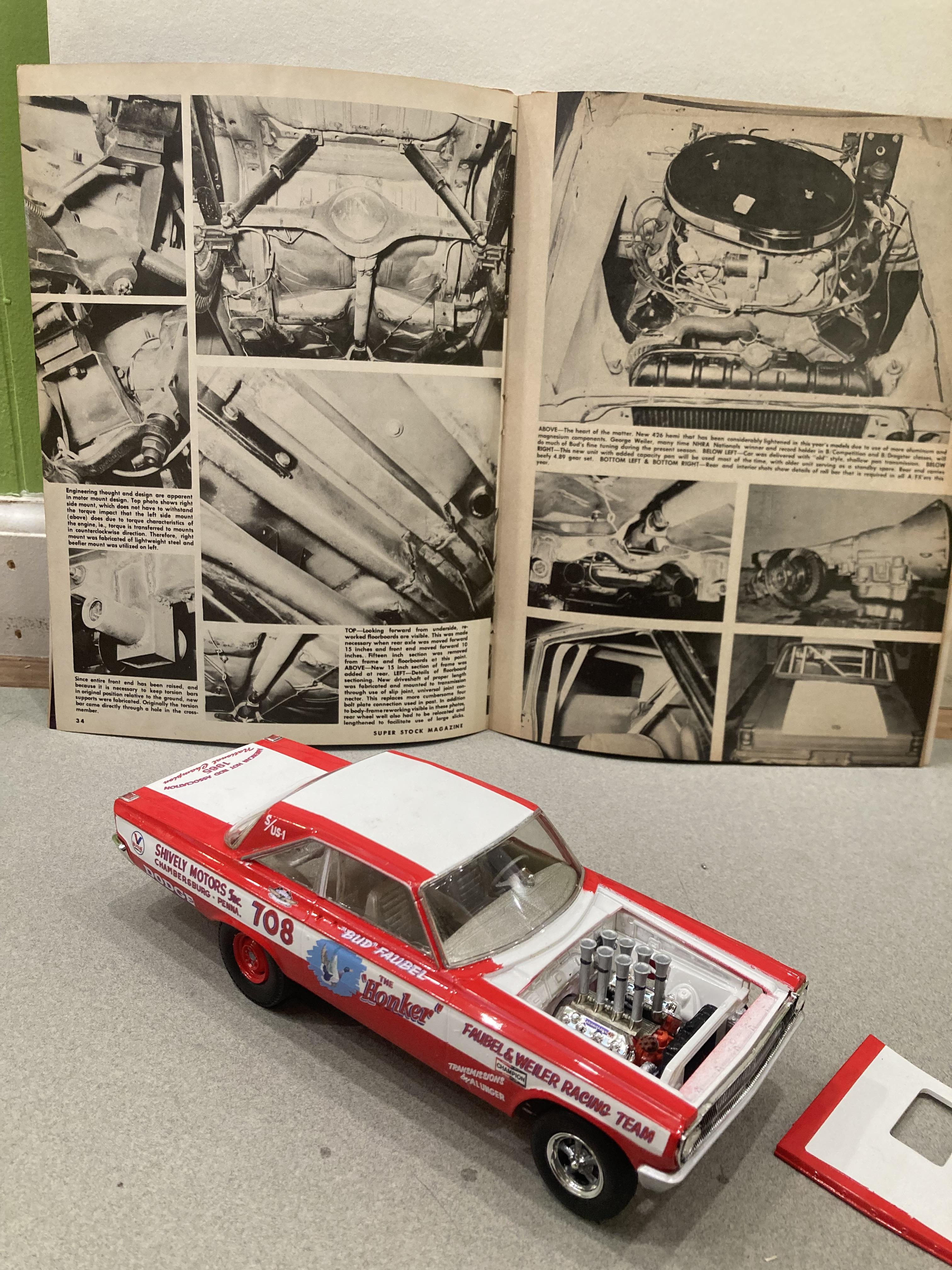 The fantastic Moebius kit sprayed with Tamyia white and bright red topped with a set of Chris Walsh decals . The version I built is the later in year into 1966 version . The magazine reference photos show the early season carbureted version which I will most likely build down the road sometime. Chris Walsh has decals to do both versions. In my opinion this was the best looking of all the Awb Mopars . This is the very first issue of my dads old super stock magazines I got my hands on I think I was 12 or 13 years old it still remains as my favorite issue I can still remember drooling over the full color center fold . until next time thanks for looking, Mike