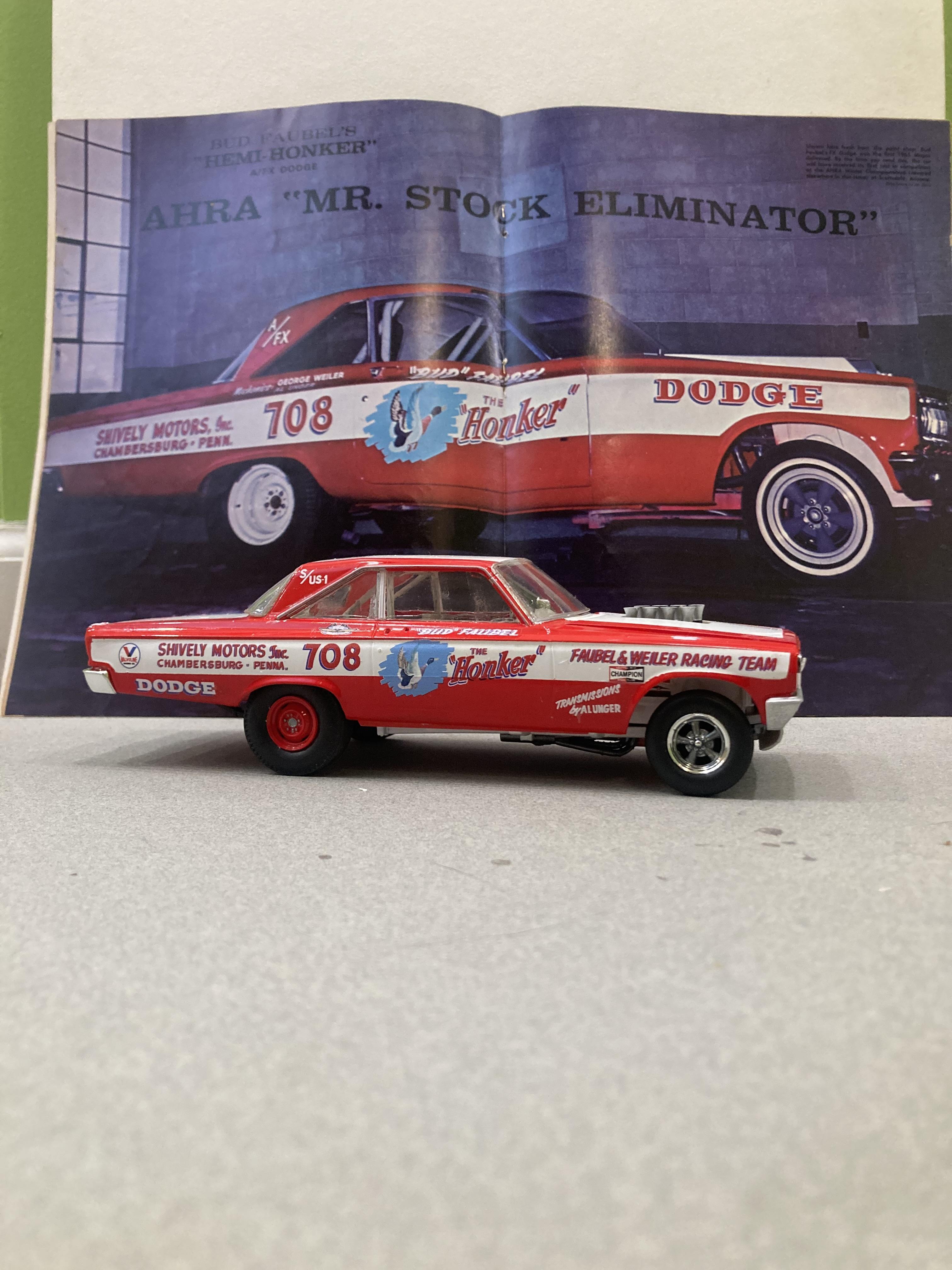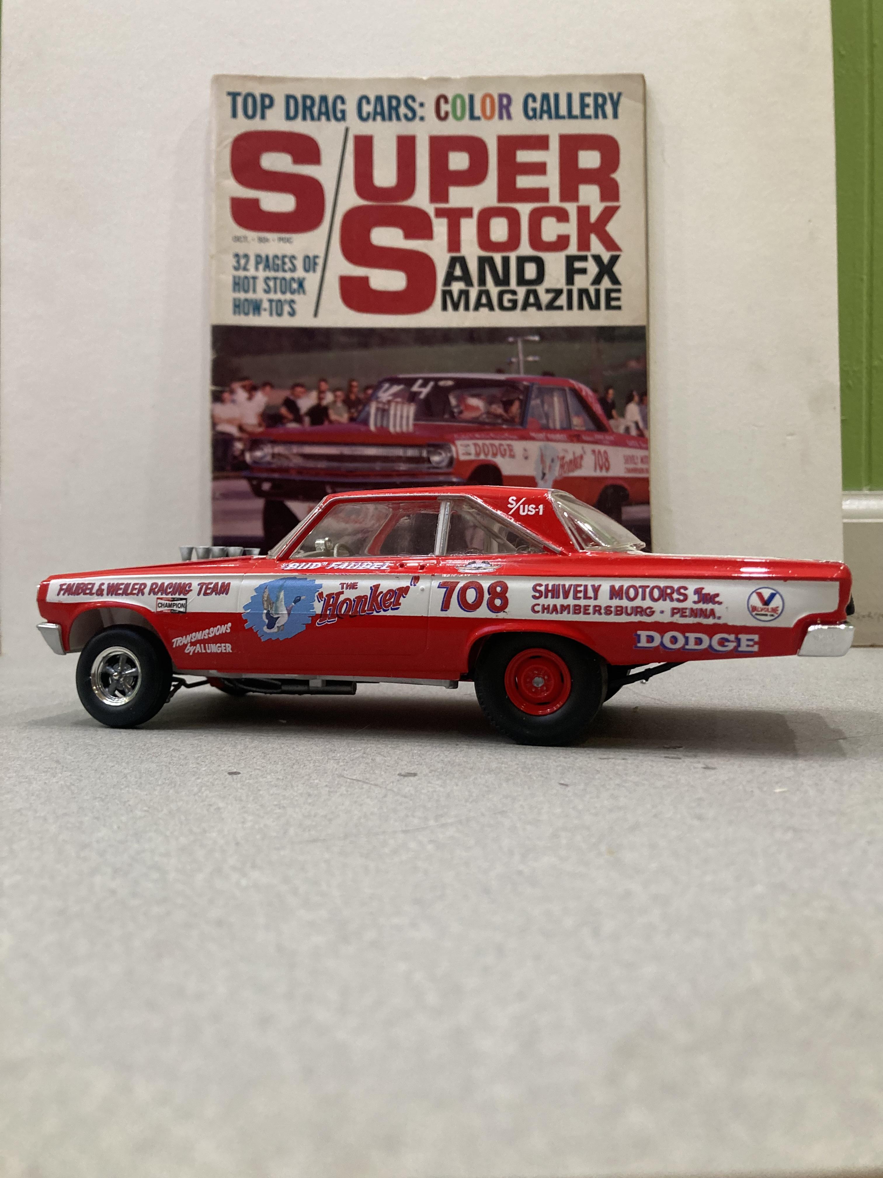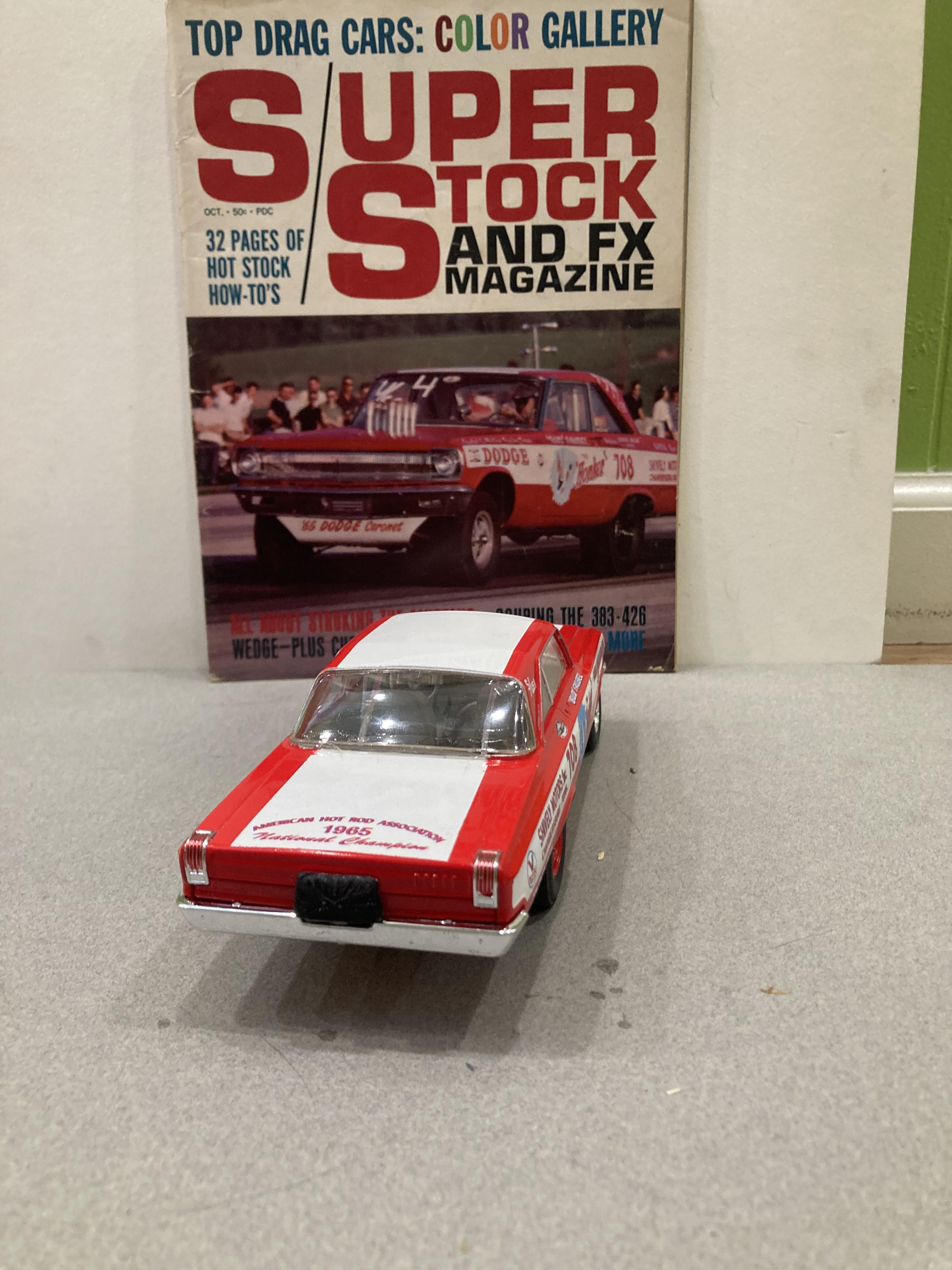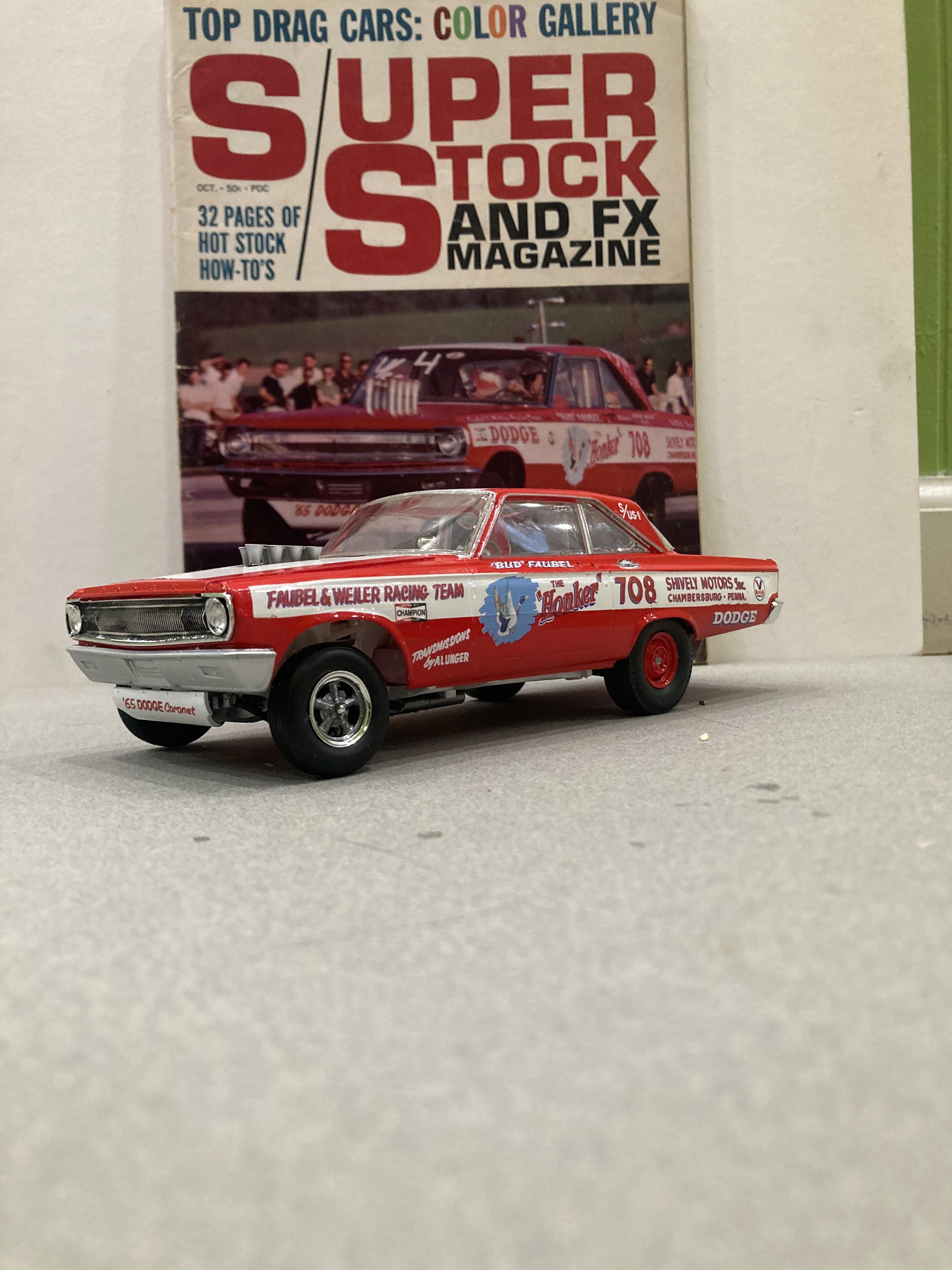 The fantastic Moebius kit sprayed with Tamyia white and bright red topped with a set of Chris Walsh decals . The version I built is the later in year into 1966 version . The magazine reference photos show the early season carbureted version which I will most likely build down the road sometime. Chris Walsh has decals to do both versions. In my opinion this was the best looking of all the Awb Mopars . This is the very first issue of my dads old super stock magazines I got my hands on I think I was 12 or 13 years old it still remains as my favorite issue I can still remember drooling over the full color center fold . until next time thanks for looking, Mike