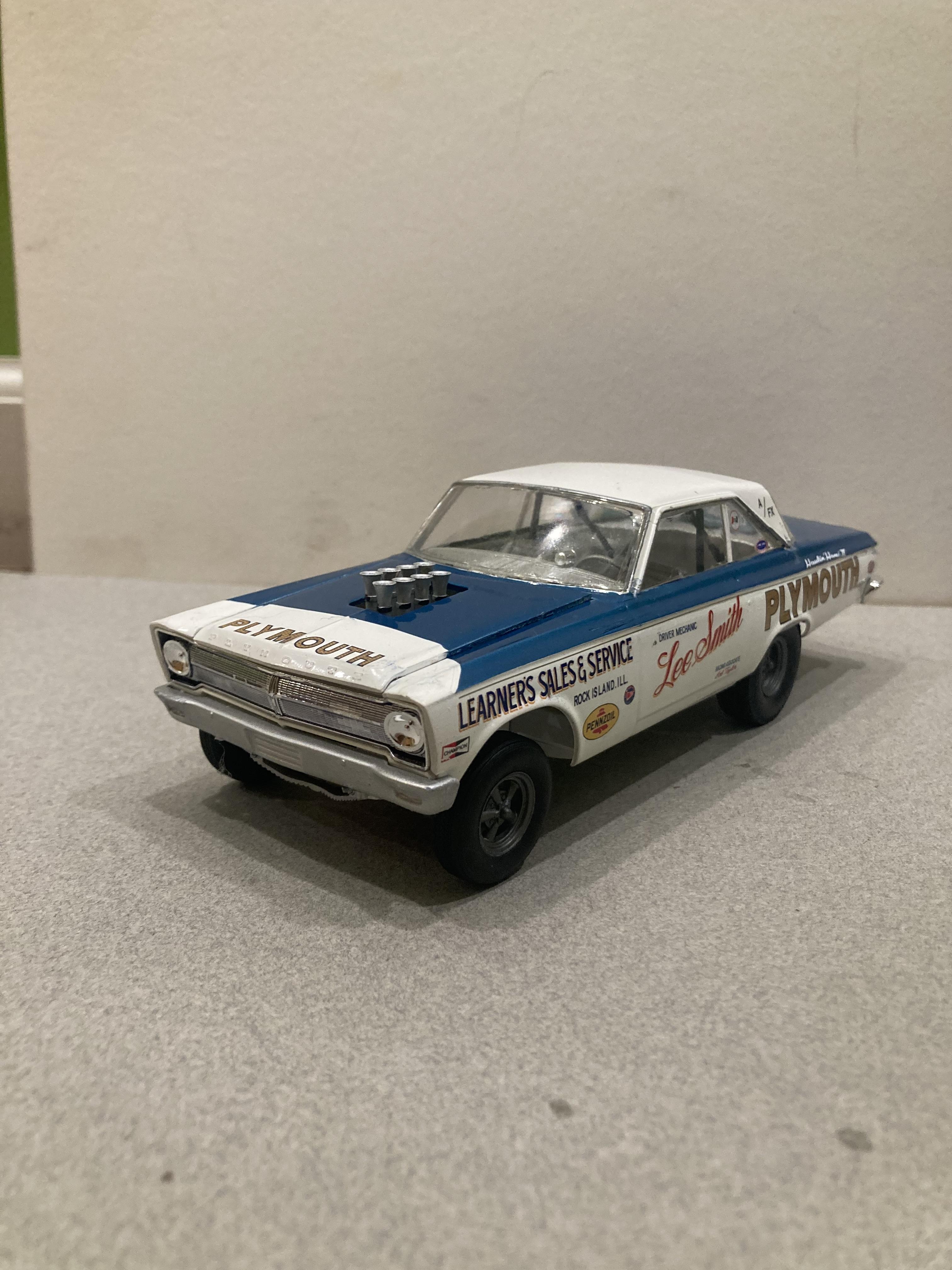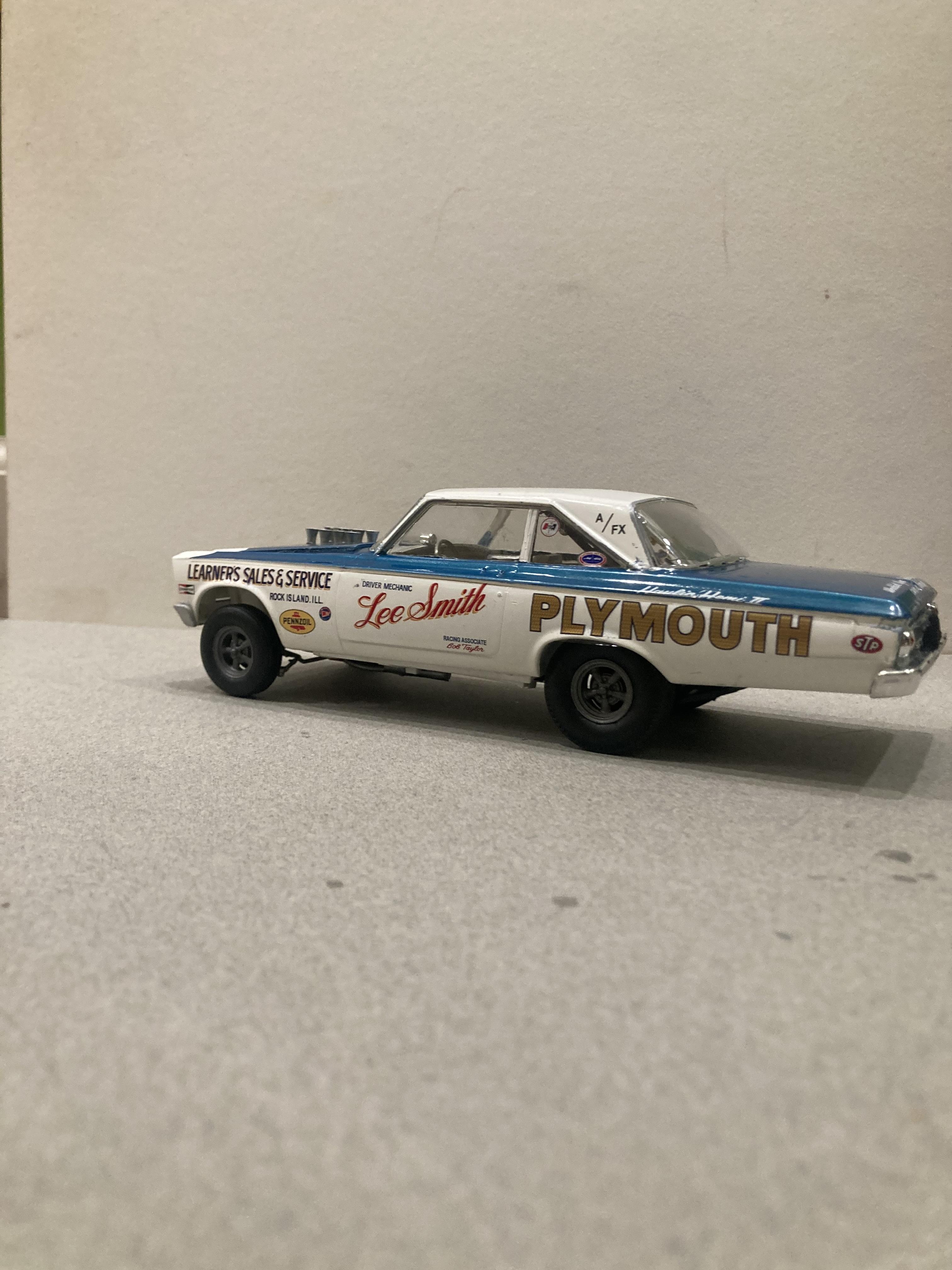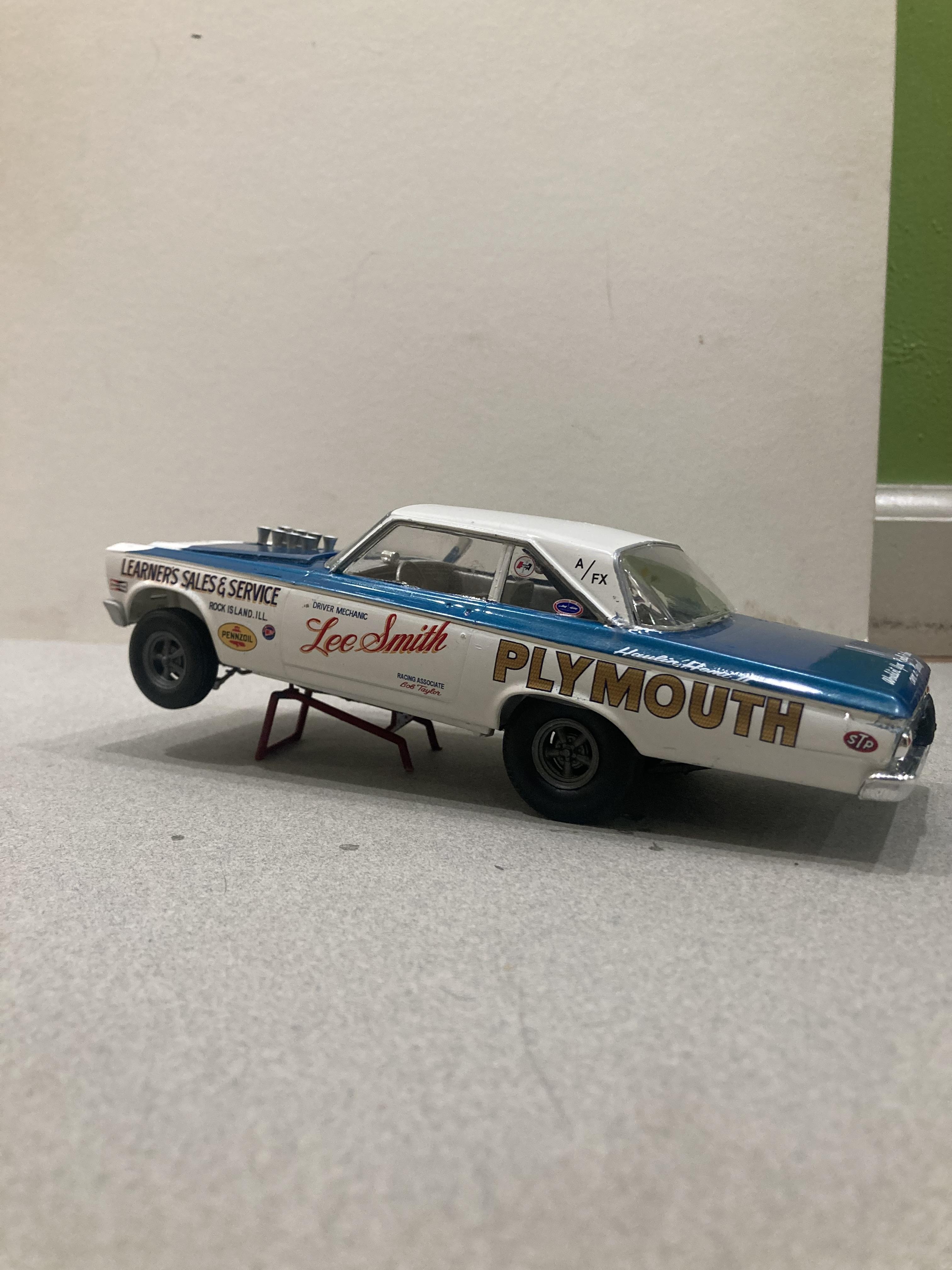 17. This one’s all Moebius I used Testors white enamel , and decals from 2 Moebius sheets that I was able to purchase separately. The ones that came in the super stock kit. These are really nice decals plus they have the right shade of metallic blue . I’m really having a blast building these 65 AWB MOPARS . Until next time thanks for looking, Mike