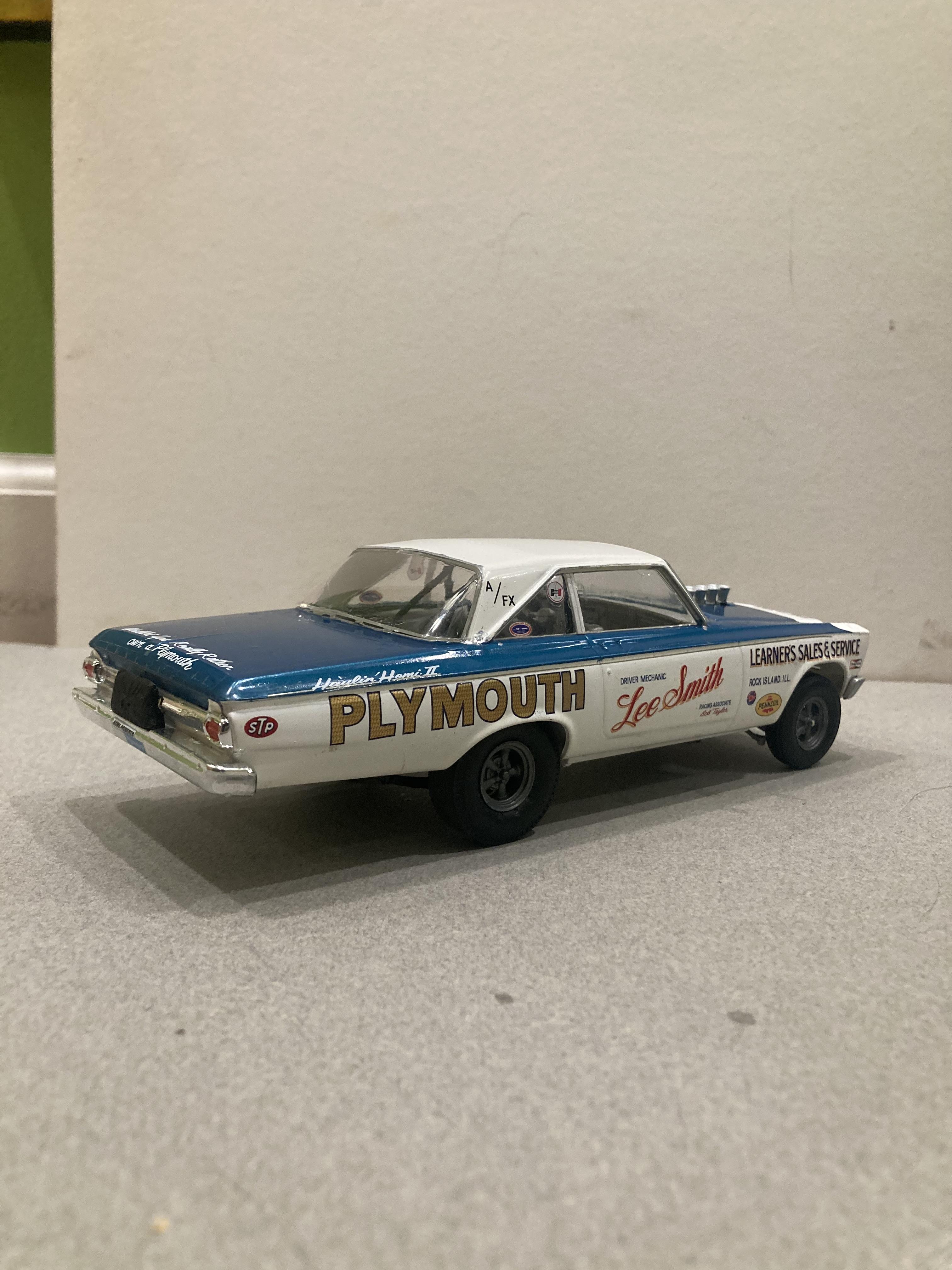 23. When my dad built this kit he had to be about 17 or 18 years old and already owned his 64 super stock dodge . He said it was such a cool kit that was basically the same body style of his street car . Because the Ramchargers car was white he saw no reason to waste paint on the body . So he painted the engine and the interior then on went the decals . On the shelf it went . I inherited this car when he gave me his collection in 1984 . Then it moved to my shelf where it has lived ever since . To get it ready for photos I cleaned the years of dust and cigarette smoke discoloring with my favorite cleaner Meguiar’s spray quick wax . I left the original 59 years of dust on the interior , and the decals show their original patina. I can still faintly smell the cigarette smell on it. It now provides endless happy memories of the builder my dad . This kit has good relevance right know with all of the AWB 65 Mopar kits I’ve been building lately. In my opinion the original box art is some of the best ever . until next time , thanks for looking , Mike