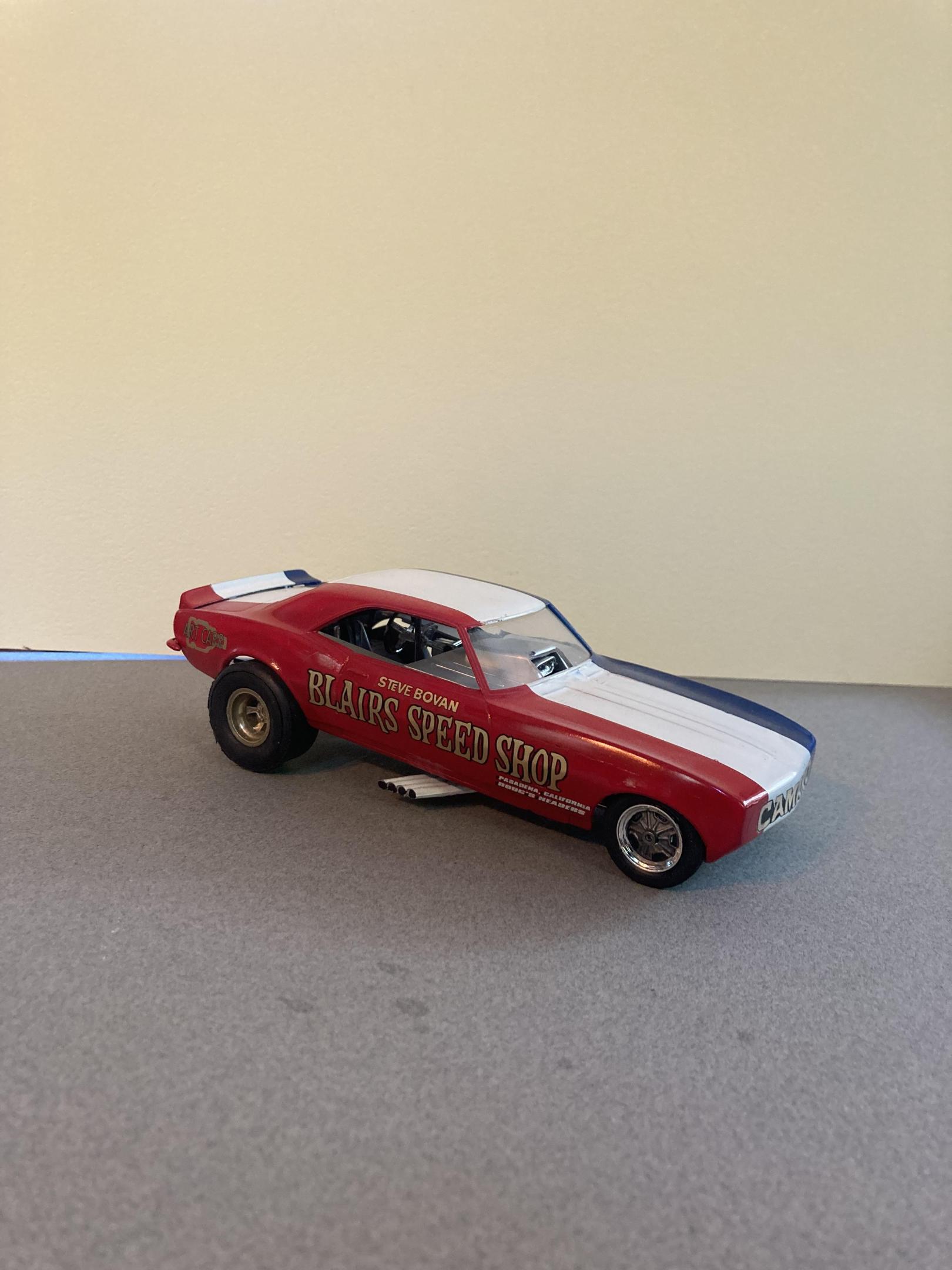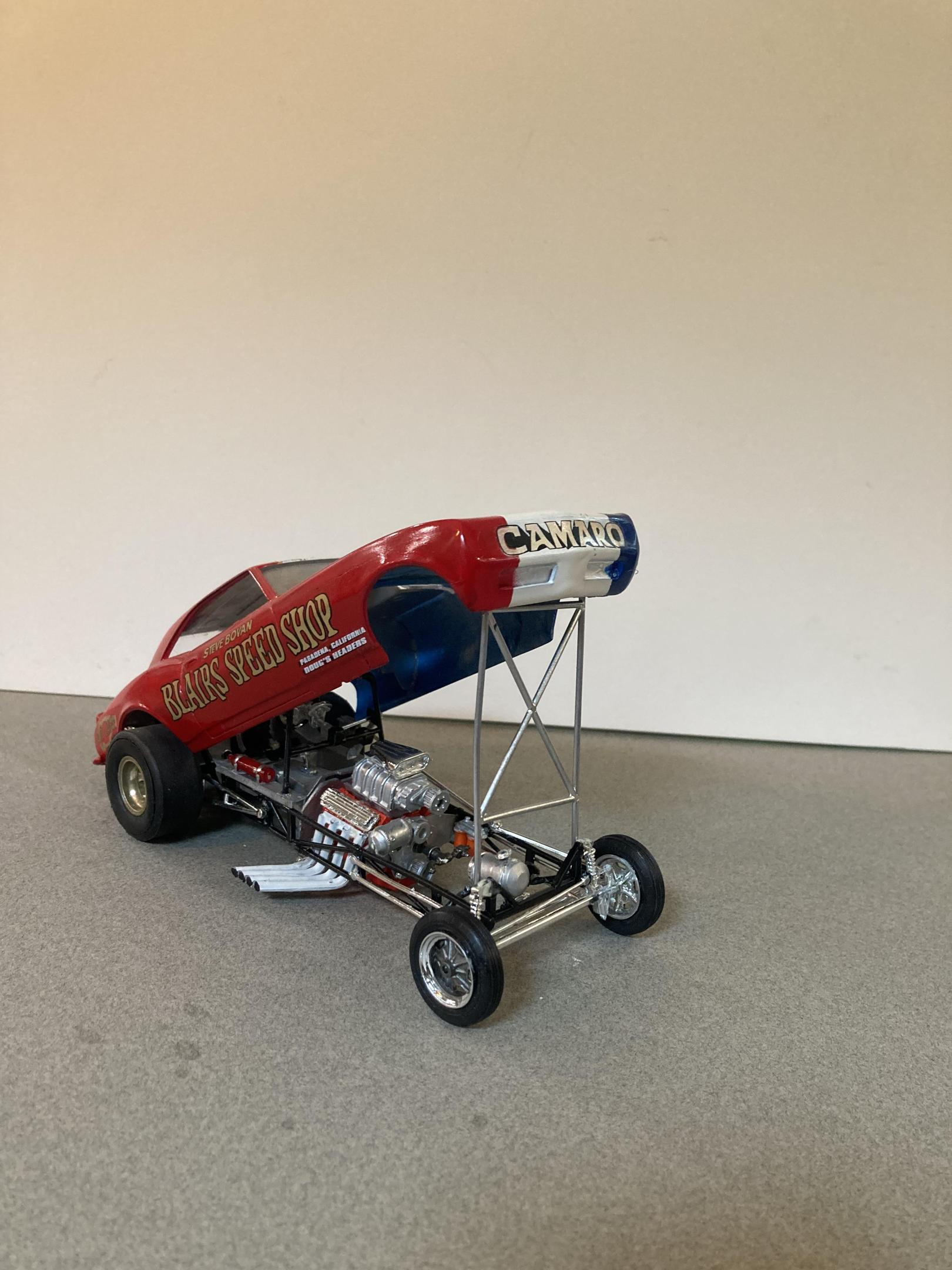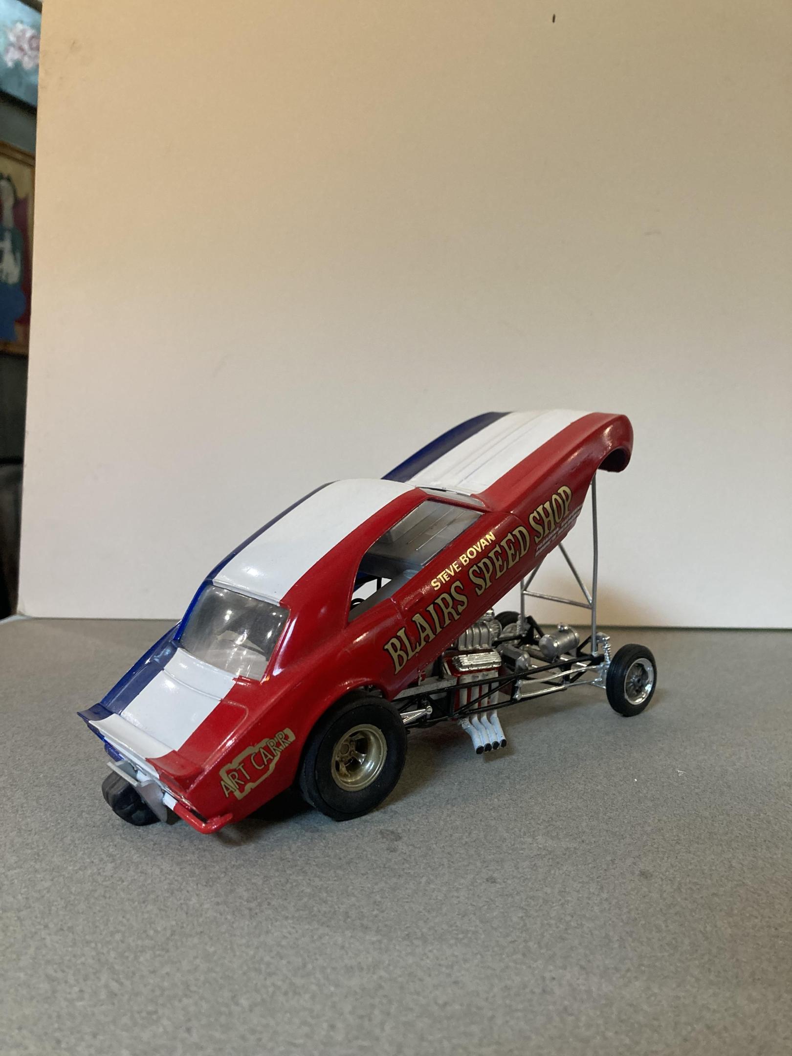 This is one of my favorite funny car builds based on how it came out. I started out with the amt 1968 kit . I moved the front wheel wells forward using patches from a donor body . Then I painted the body with tamyia red , white & mica blue topped with a coat of clear. The decals came from joe at freemont resin I highly recommend his stuff as it’s top shelf quality. For the chassis and the tin work I used my favorite donor kit the polar lights barracuda funny car . For the engine I used the polar lights hemi with the heads and valve covers from the amt 1963 corvette kit which is a great wealth of parts , and it’s relatively inexpensive when hobby lobby has them for 40% off .!Until next time thanks for looking ?, Mike