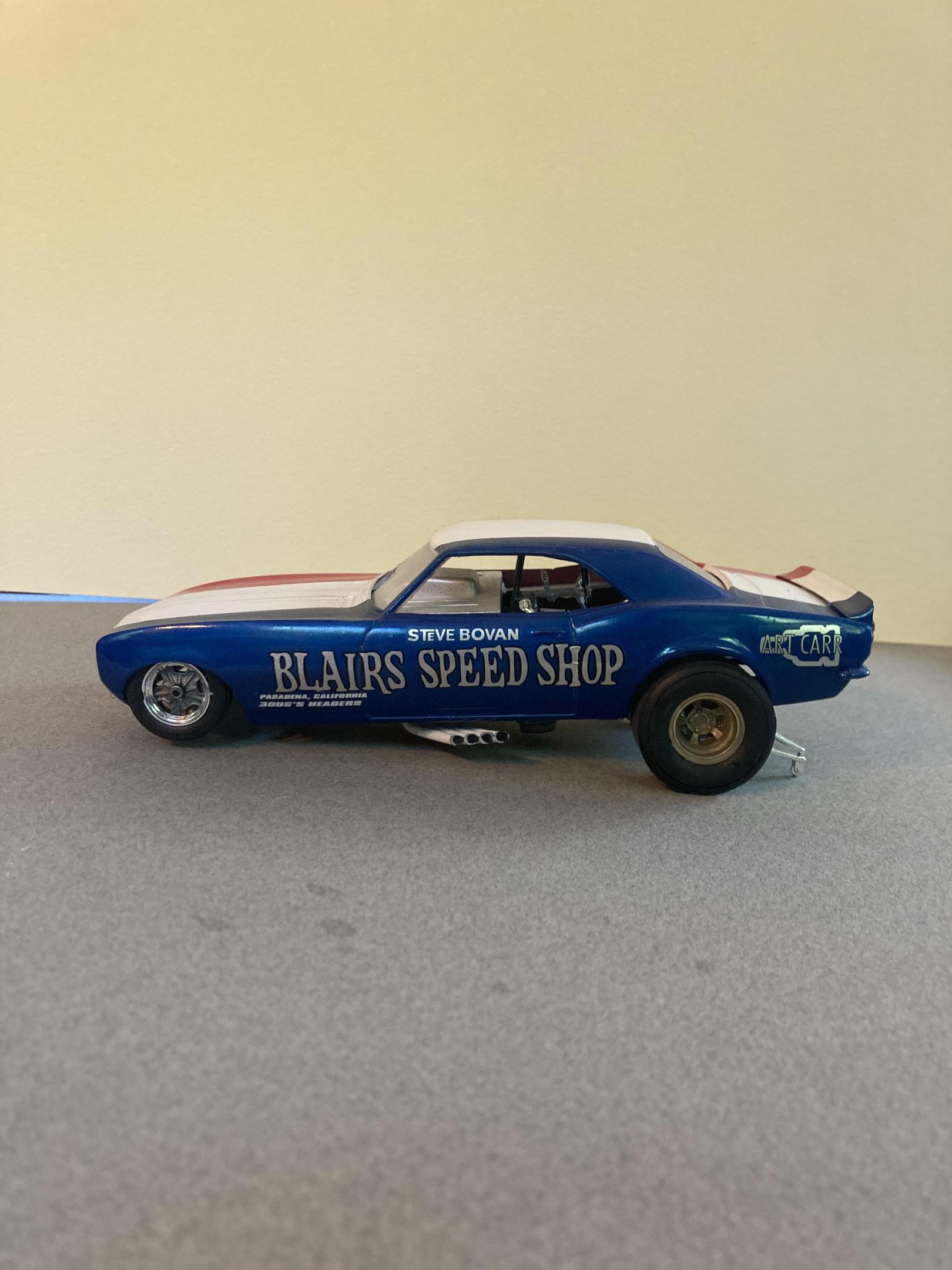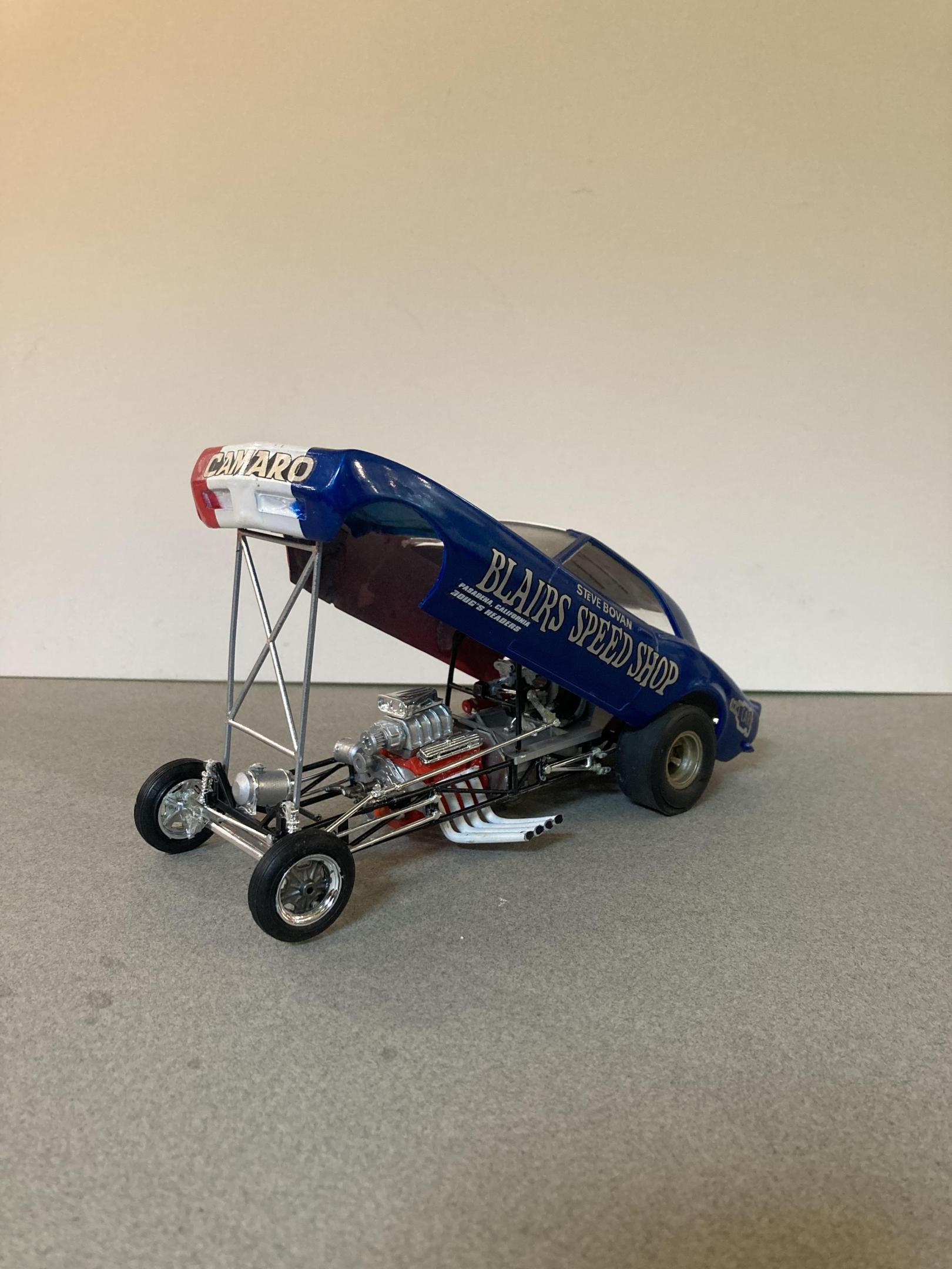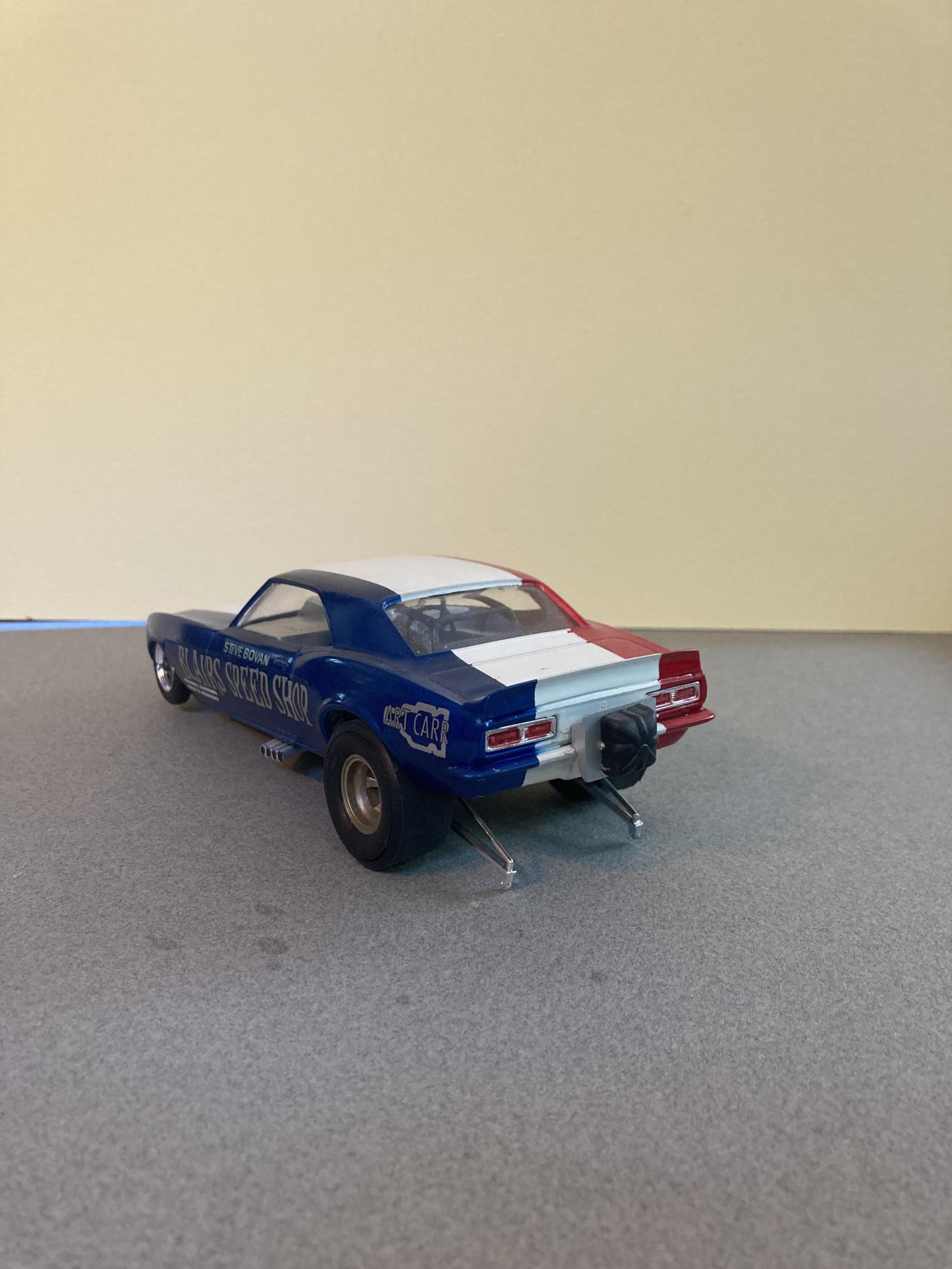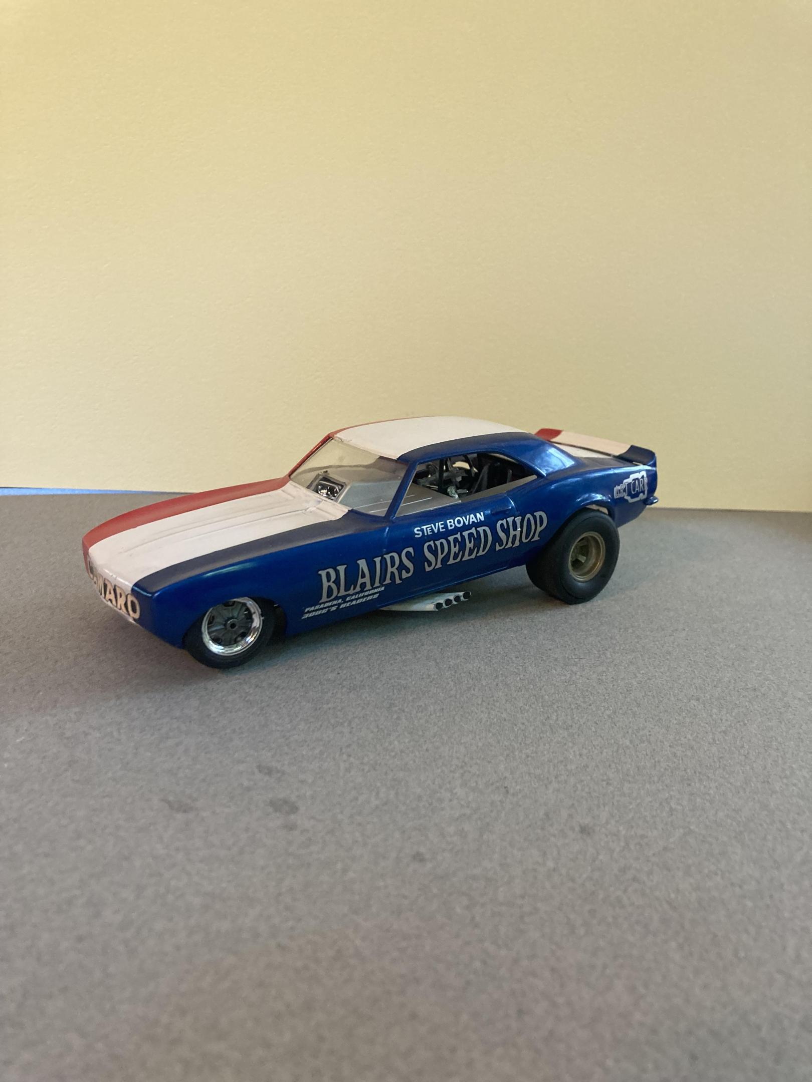 This is one of my favorite funny car builds based on how it came out. I started out with the amt 1968 kit . I moved the front wheel wells forward using patches from a donor body . Then I painted the body with tamyia red , white & mica blue topped with a coat of clear. The decals came from joe at freemont resin I highly recommend his stuff as it’s top shelf quality. For the chassis and the tin work I used my favorite donor kit the polar lights barracuda funny car . For the engine I used the polar lights hemi with the heads and valve covers from the amt 1963 corvette kit which is a great wealth of parts , and it’s relatively inexpensive when hobby lobby has them for 40% off .!Until next time thanks for looking ?, Mike