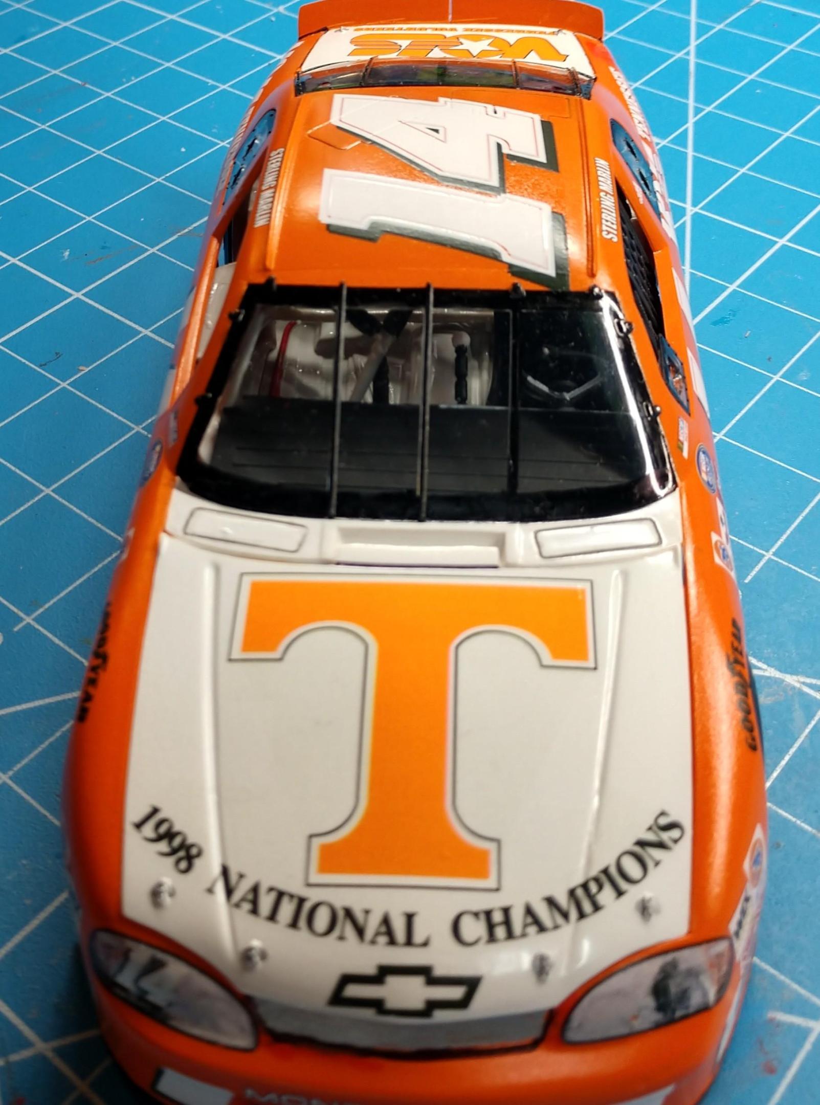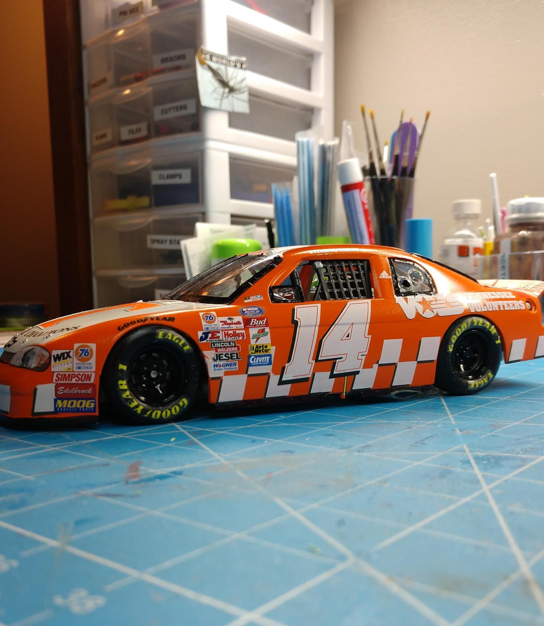 12. Finished my Sterling Marlin #14, Tennessee Volunteer Monte Carlo BGN car. She's not perfect by any stretch, but looks great on the shelf. I'm a life long TN Volunteer fan or VFL (Vol for Life). Edit: Heck, I saw my friend Duane Garner's reply and realized that I forgot to give him credit for the hood. The original kit hood crazed very badly, the worse I've ever experienced. He sent me a new hood to complete the build.