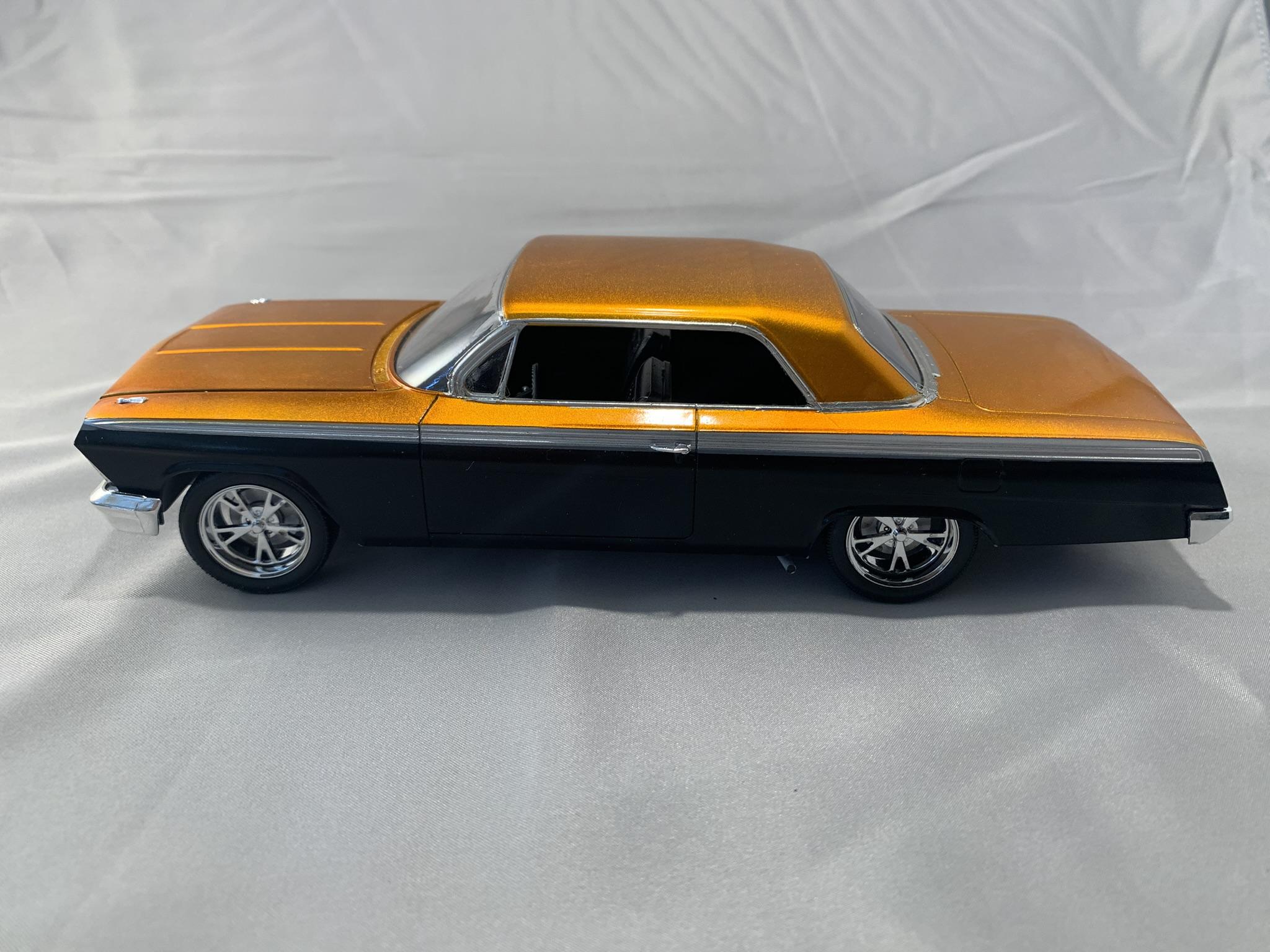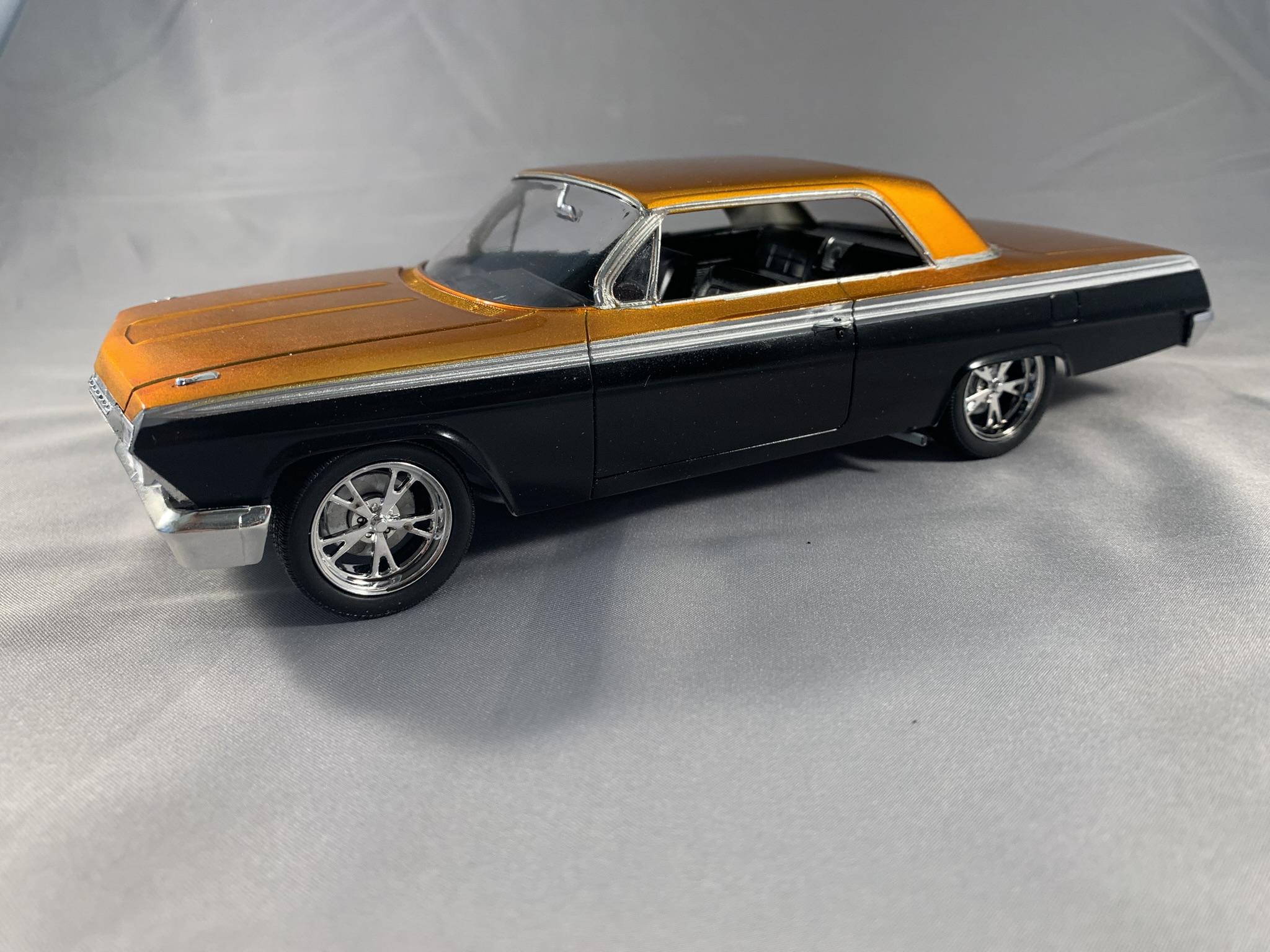 Revell 1962 Chevy Impala This is kit is built out of box stock, all parts are a very good fit , easy assembly Paint : Duplicolor gray sealer /primer All paints Tamiya lacquer , upper parts : Tamiya sparkling silver with top coat of clear orange / lower gloss black , clear coat silver trim masked between top and bottom window trim all bare metal foil Thanks for looking