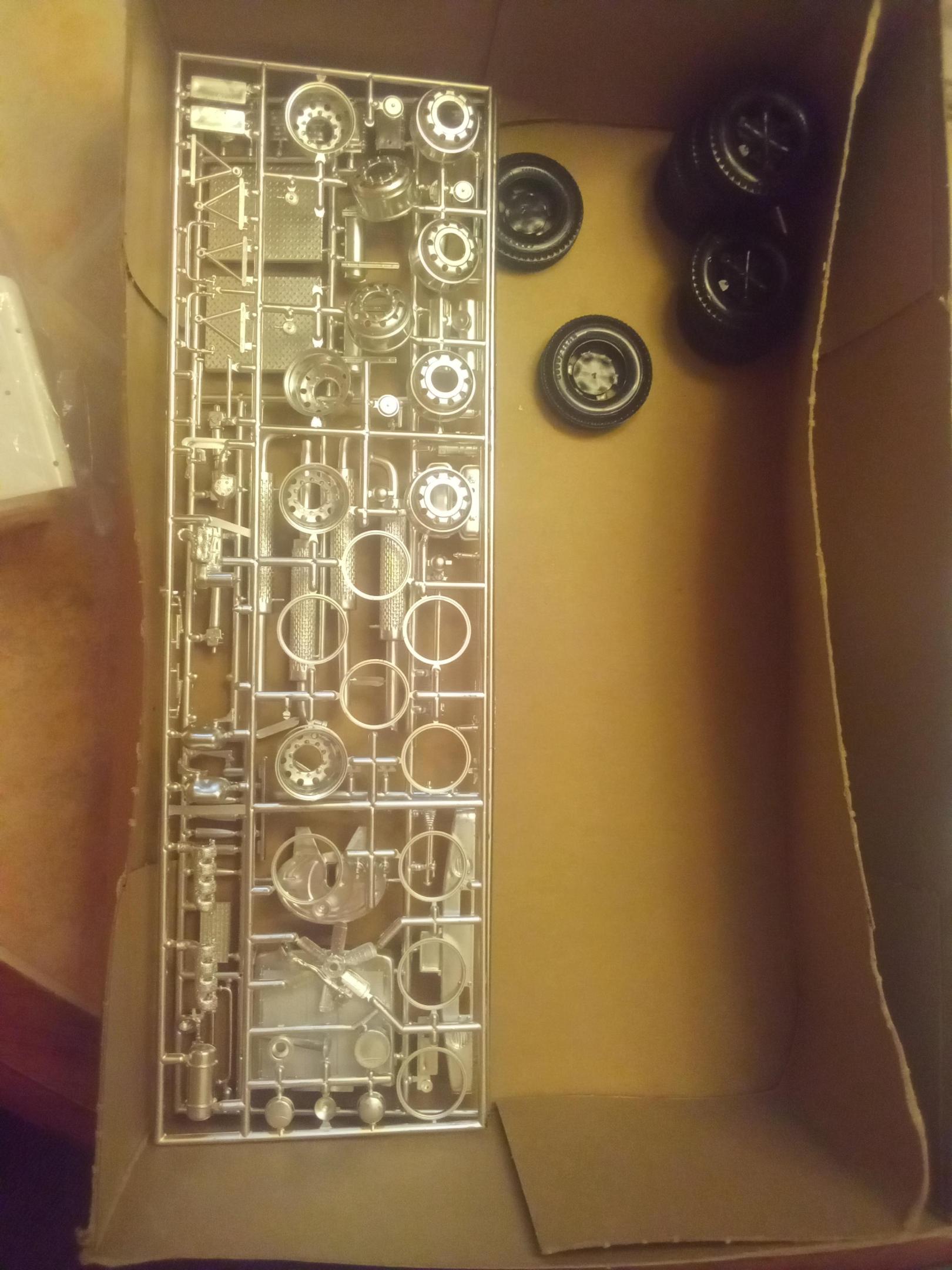 I think it's in great shape still in the box a couple of corners are barely worn. It has been opened not assembled. It basically has had the plastic tool off the box but the contents inside the box are still in the plastic. It has a Hurst first hemi under glass brochure. It has good year brochure saying torturing truck tires in Texas. And it has decals for the truck. And on the decals chrome trim pinstriping. The Goodyear tire sizes is 10.00-20 and they are black. The casting of the truck is white and it has Chrome trim pieces in Green tinted glass. I will send some pictures.