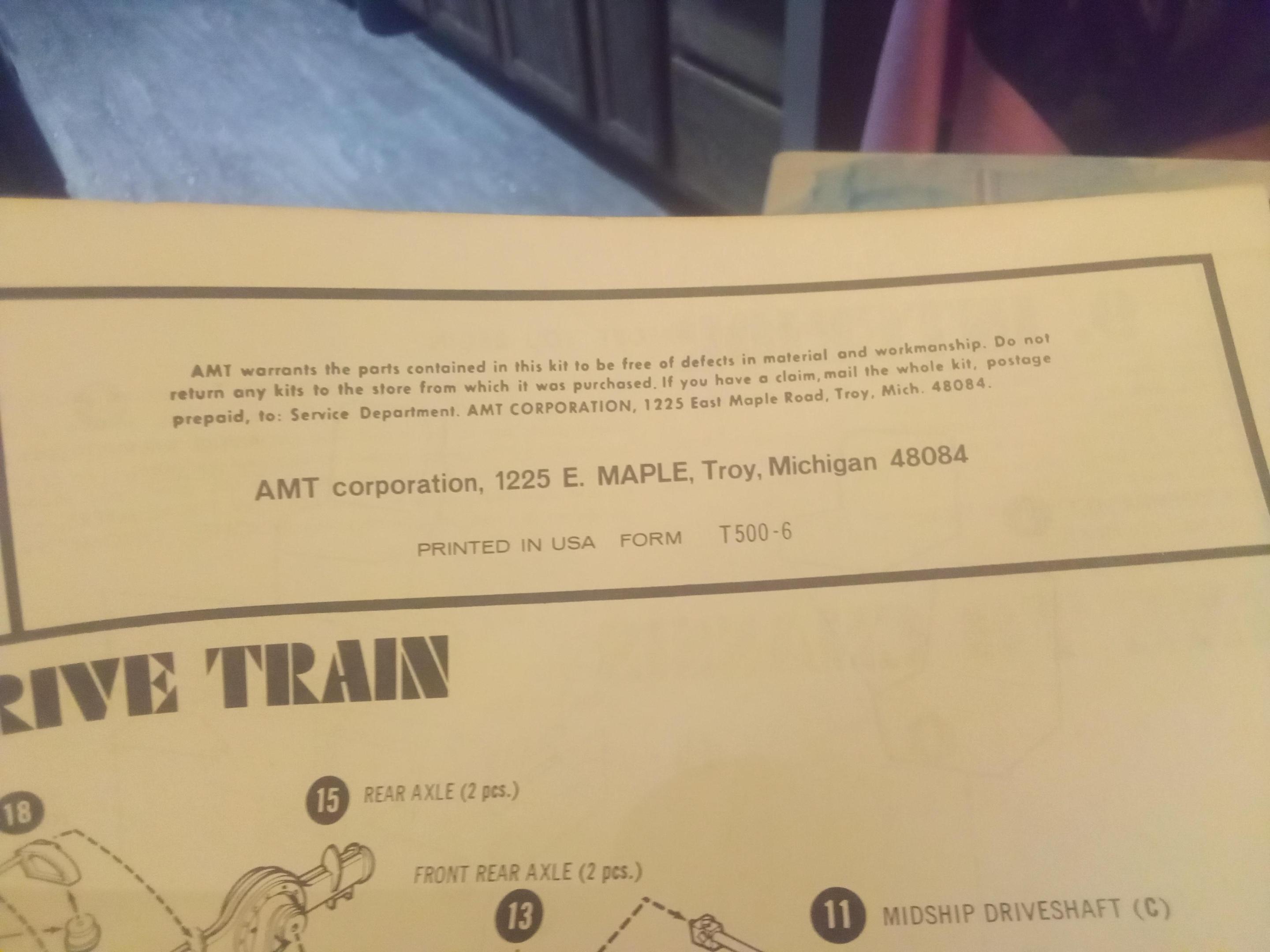 I have recently found a original 1969 AMT Peterbilt 359 t500 500 still in the box with all contents. Box opened but not assembled great shape. Green tinted glass Goodyear tires 10.20-20,, Goodyear stickers, Hurst first hemi under glass brochure, and a good year tire brochure, and decals but I did not see a mail-in form. Trying to find out the value of something like this don't know a lot just for what I've been reading recently. -