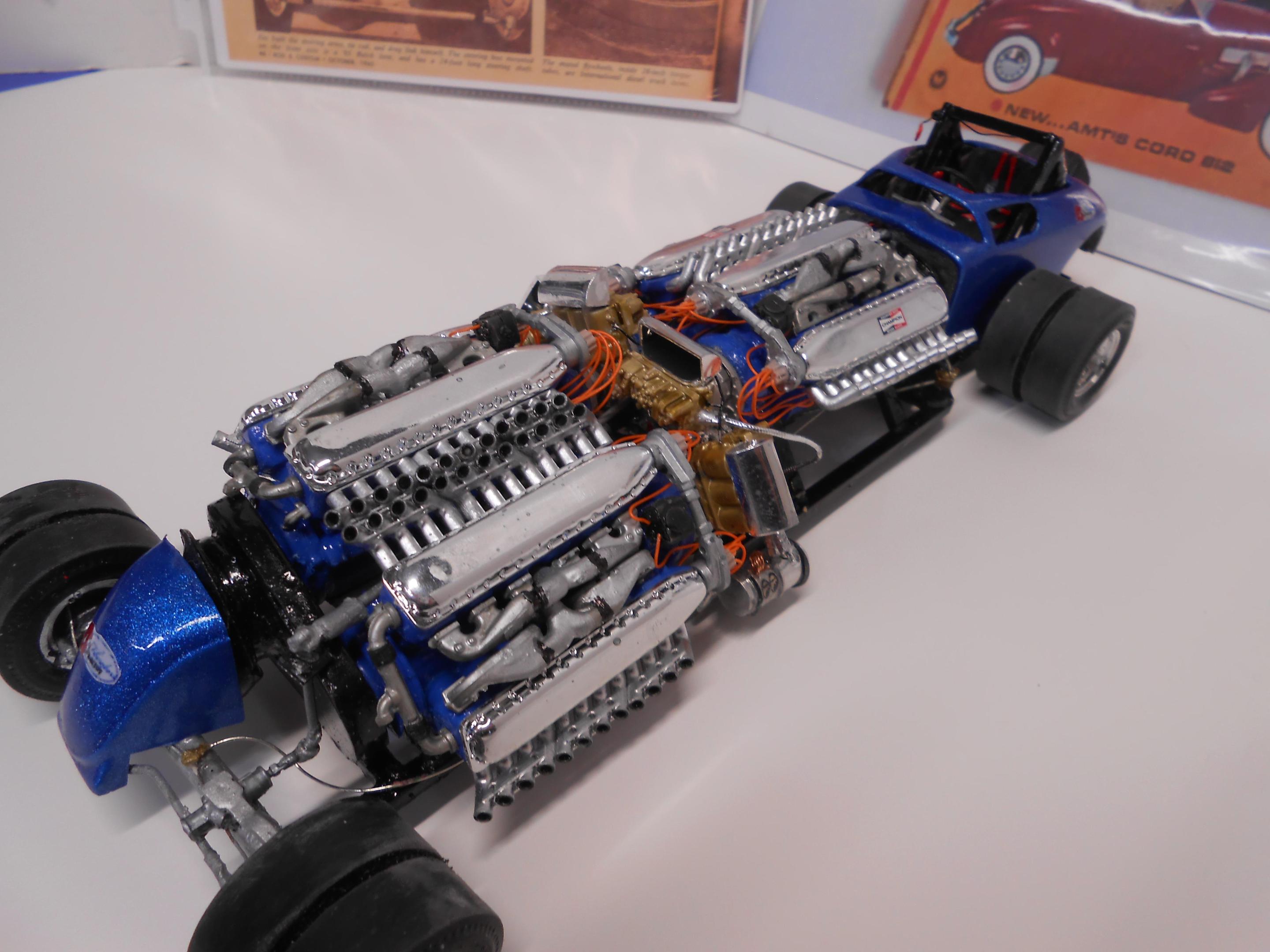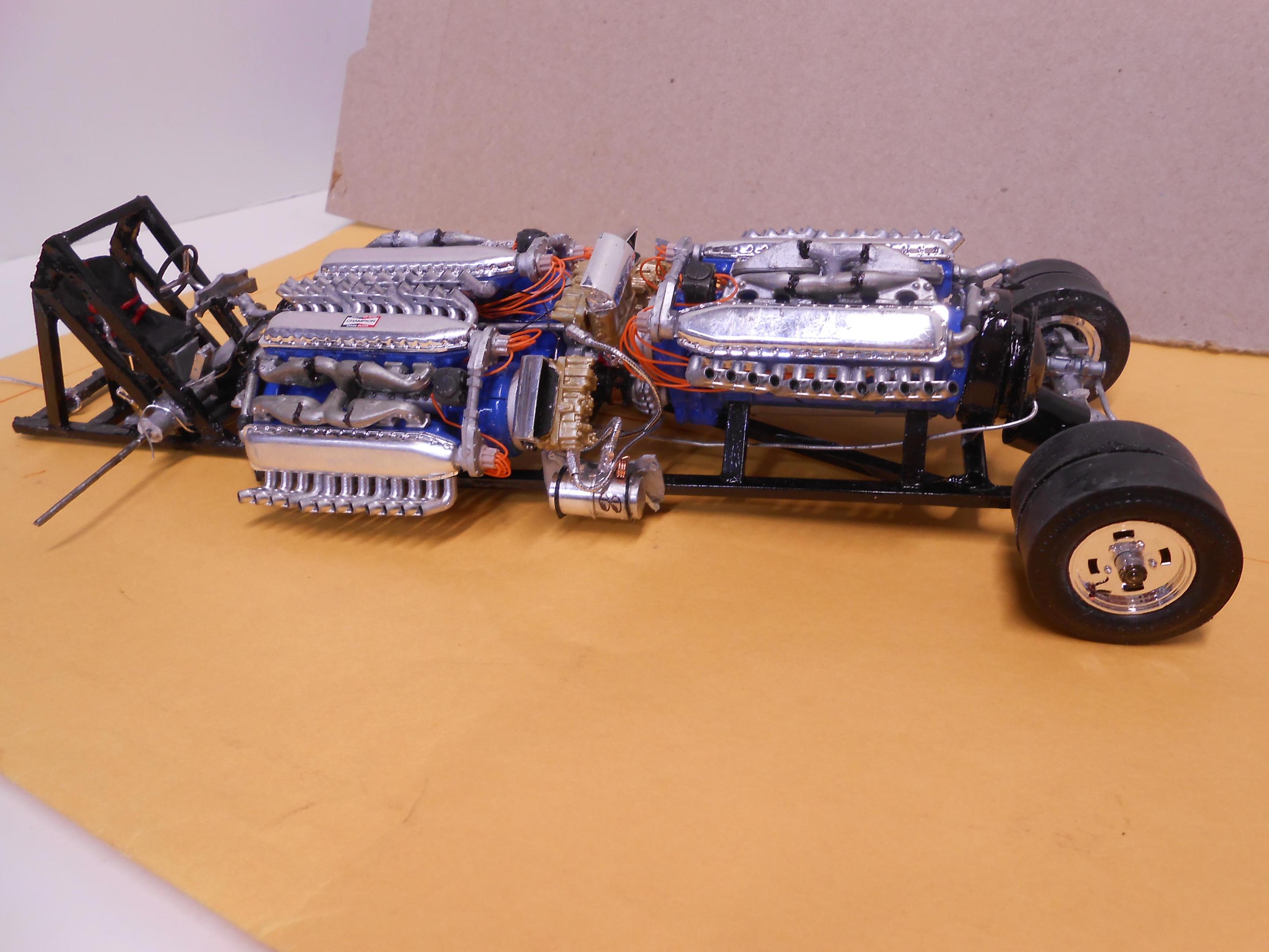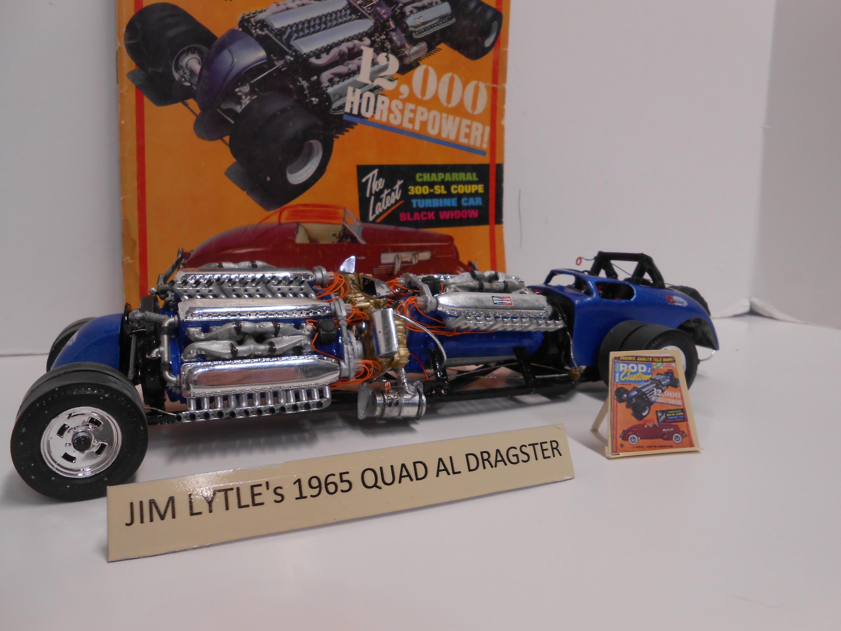This is a model of Jim Lytle's Quad Al dragster from the mid 1960's that i just finished custom building. The model has (4) V1710 Allison air plane engines, I Chopped the Fiat body, Custom built chassis and drive train, Including some misc. parts from the Revell Tommy Ivo Showboat dragster & The Revell Mickey Thompson Challenger 1 salt flats race car. I saw the original car last year at a car show and it blew me away, So i had to recreate one for myself. There was a magazine article in the October 1965 Rod & Custom magazine that helped with the reference's in building this wild dragster. There are also some misc. articles on the web. I started the build in May 2021 and just finished today (January 30, 2022). I tried to wire & plumb it accordingly. Thanks for looking, Jr. Roberts