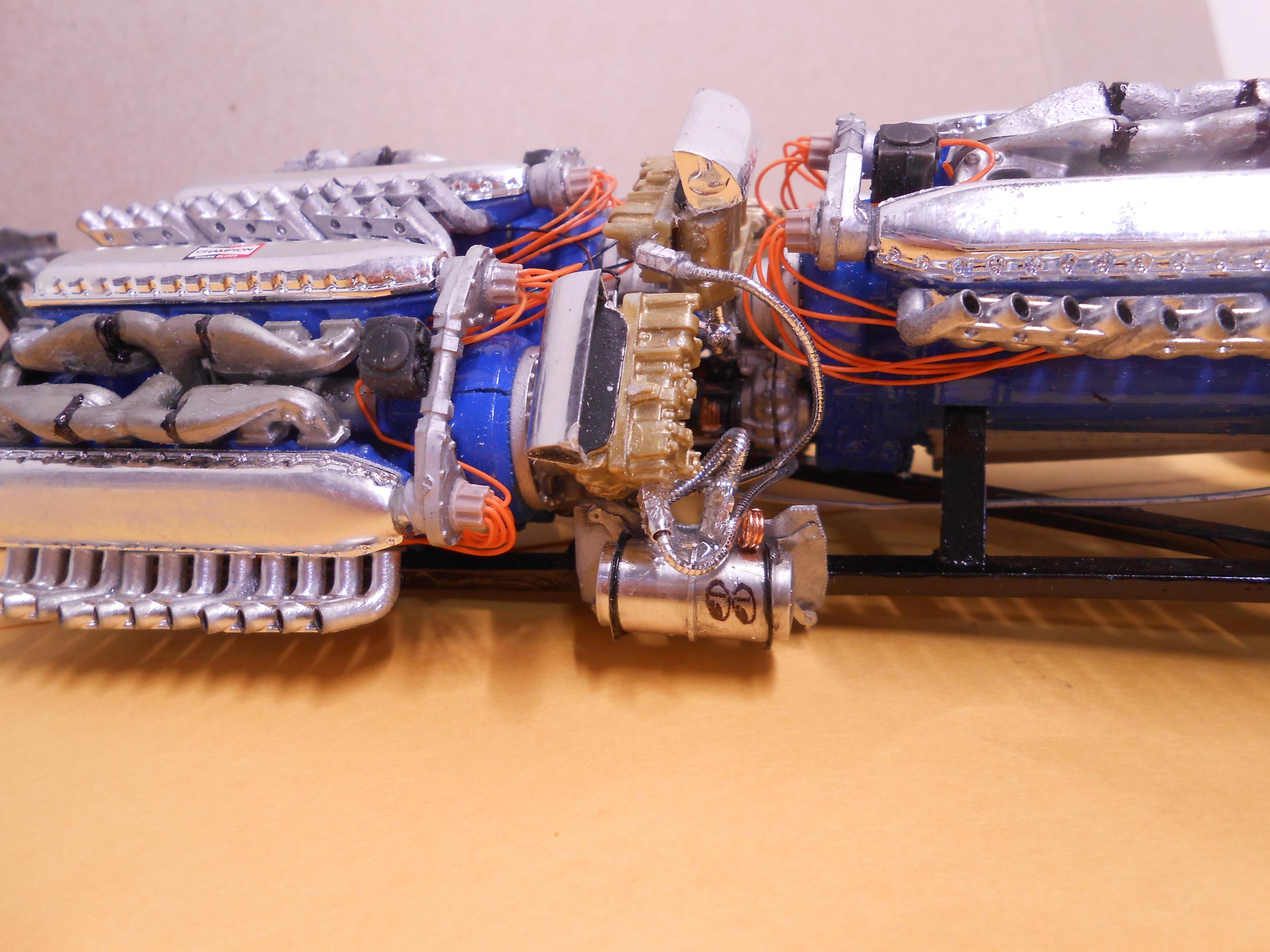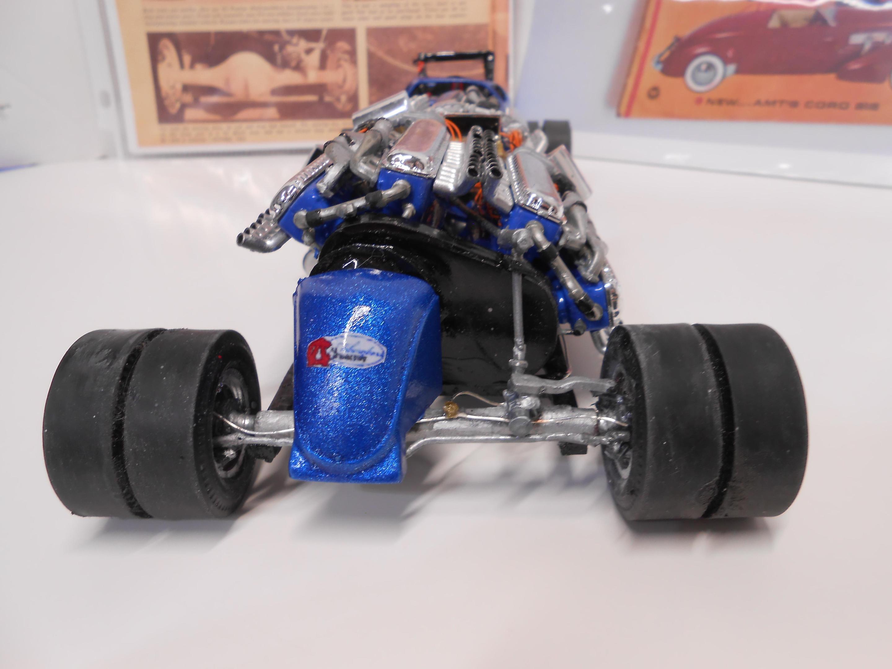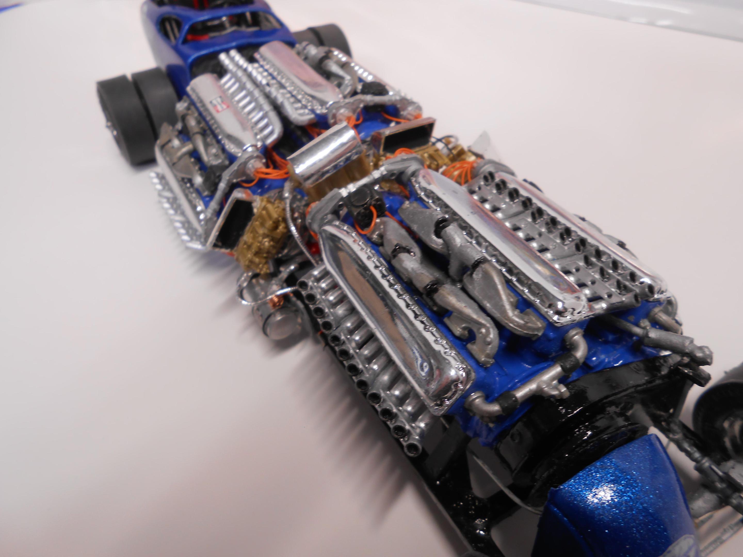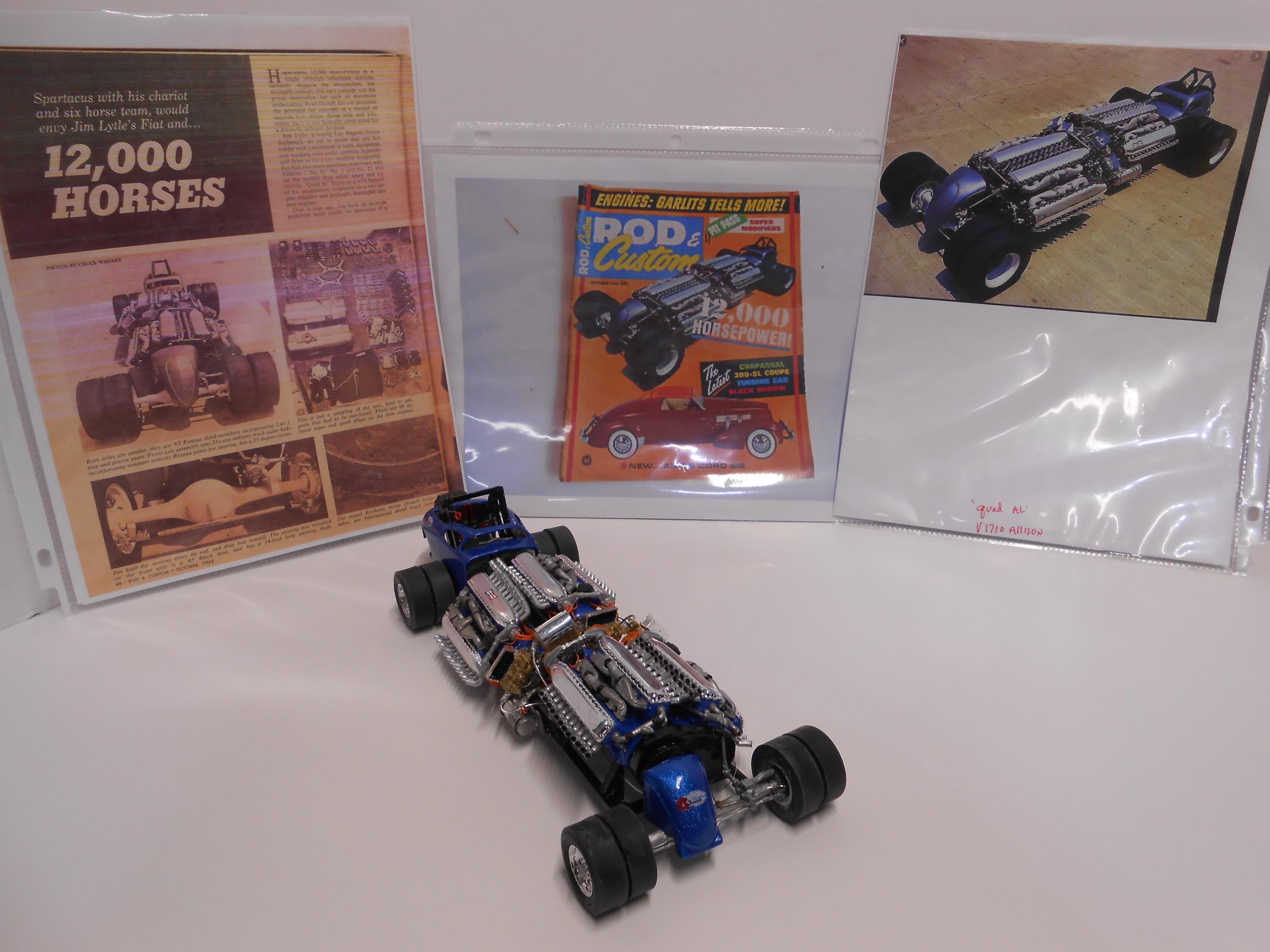 This is a model of Jim Lytle's Quad Al dragster from the mid 1960's that i just finished custom building. The model has (4) V1710 Allison air plane engines, I Chopped the Fiat body, Custom built chassis and drive train, Including some misc. parts from the Revell Tommy Ivo Showboat dragster & The Revell Mickey Thompson Challenger 1 salt flats race car. I saw the original car last year at a car show and it blew me away, So i had to recreate one for myself. There was a magazine article in the October 1965 Rod & Custom magazine that helped with the reference's in building this wild dragster. There are also some misc. articles on the web. I started the build in May 2021 and just finished today (January 30, 2022). I tried to wire & plumb it accordingly. Thanks for looking, Jr. Roberts