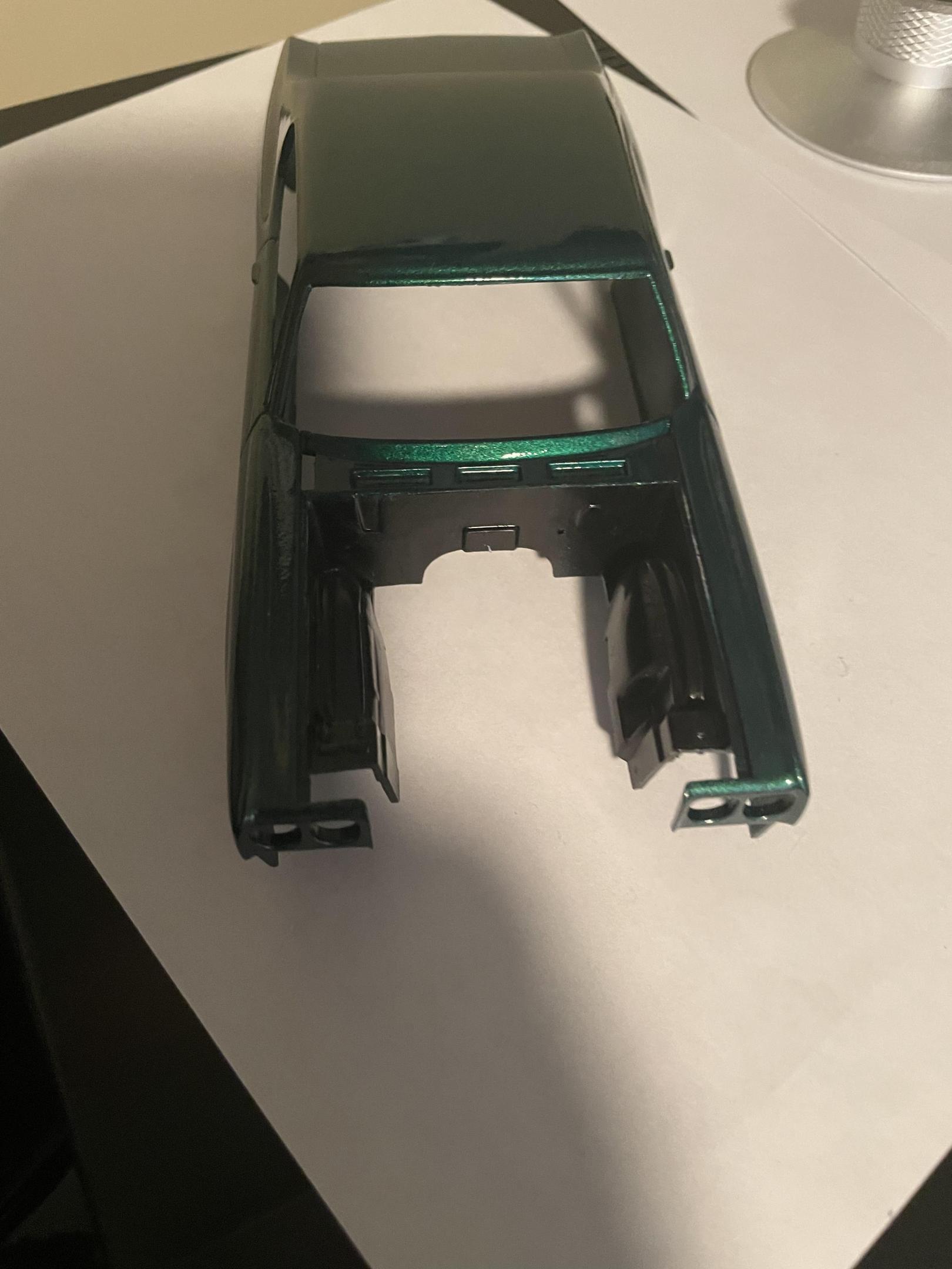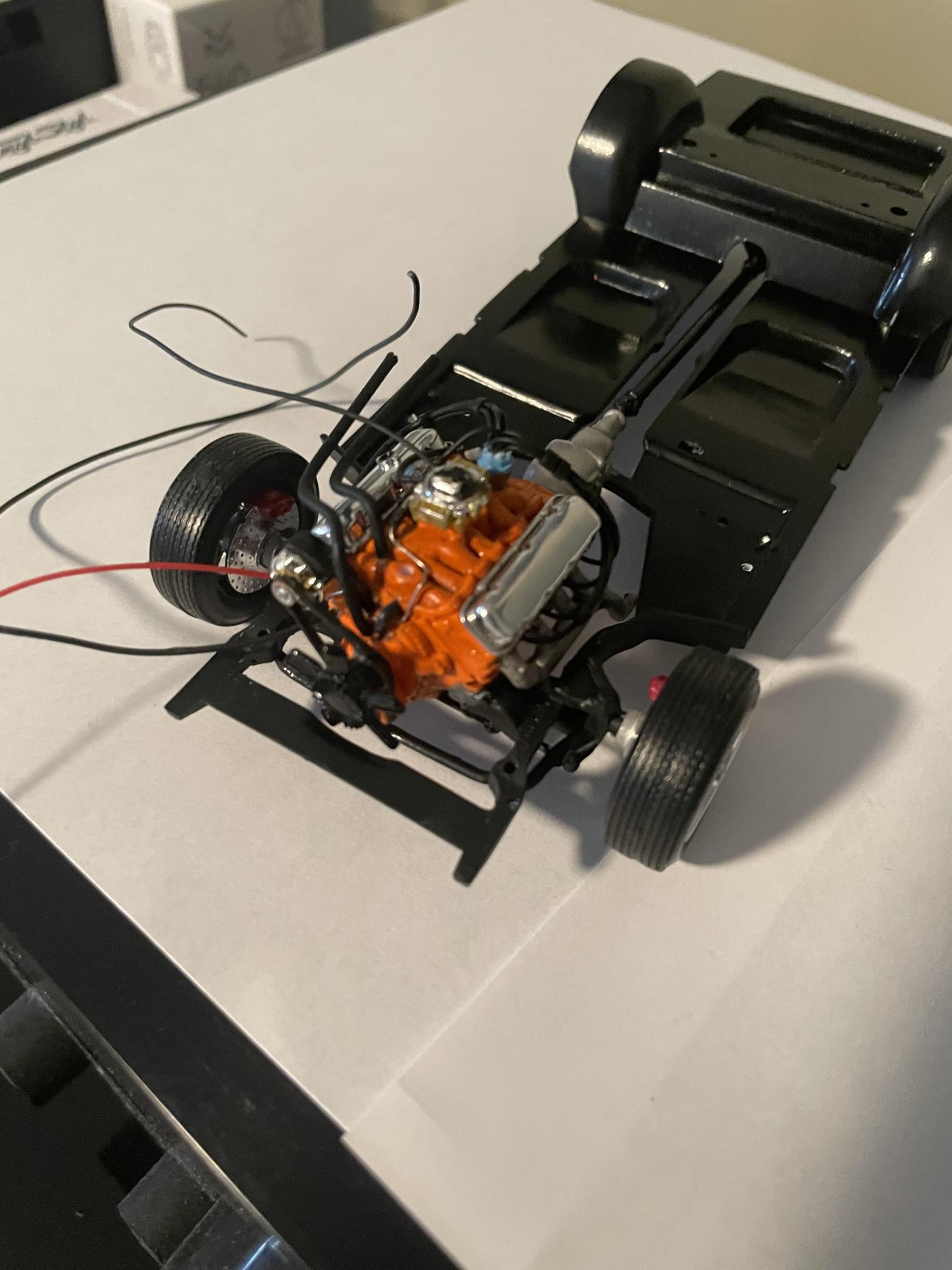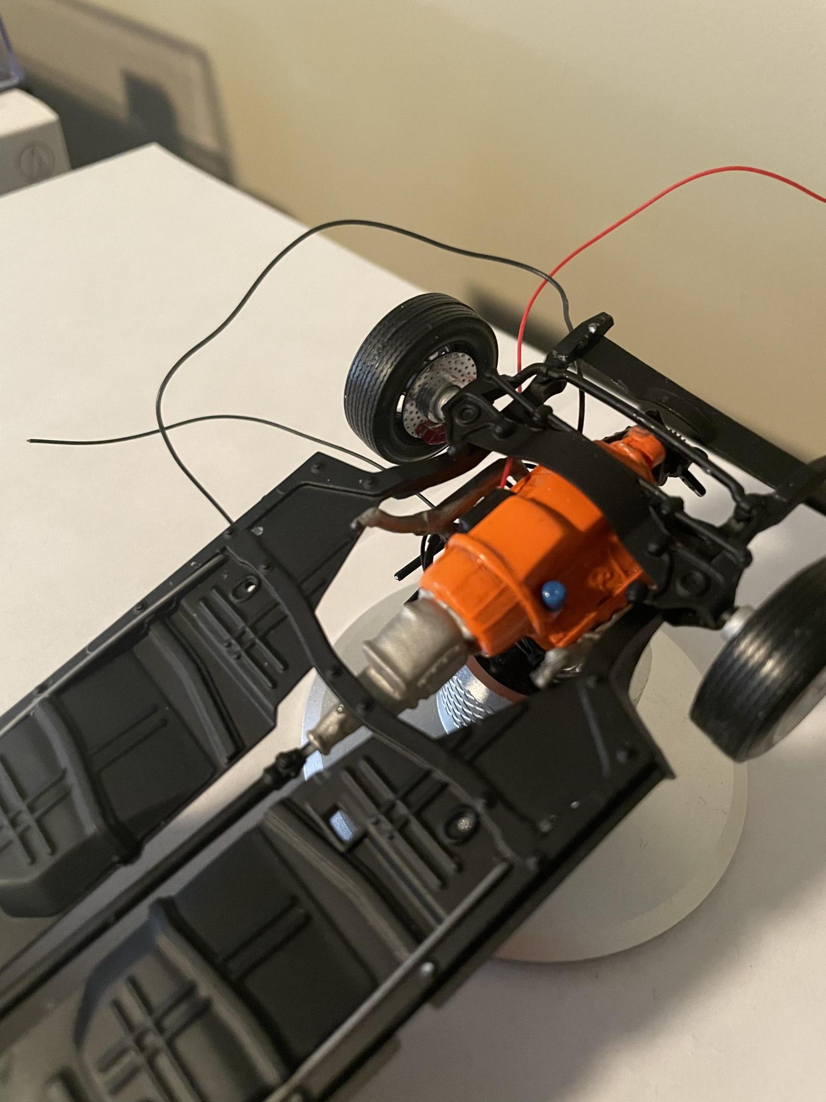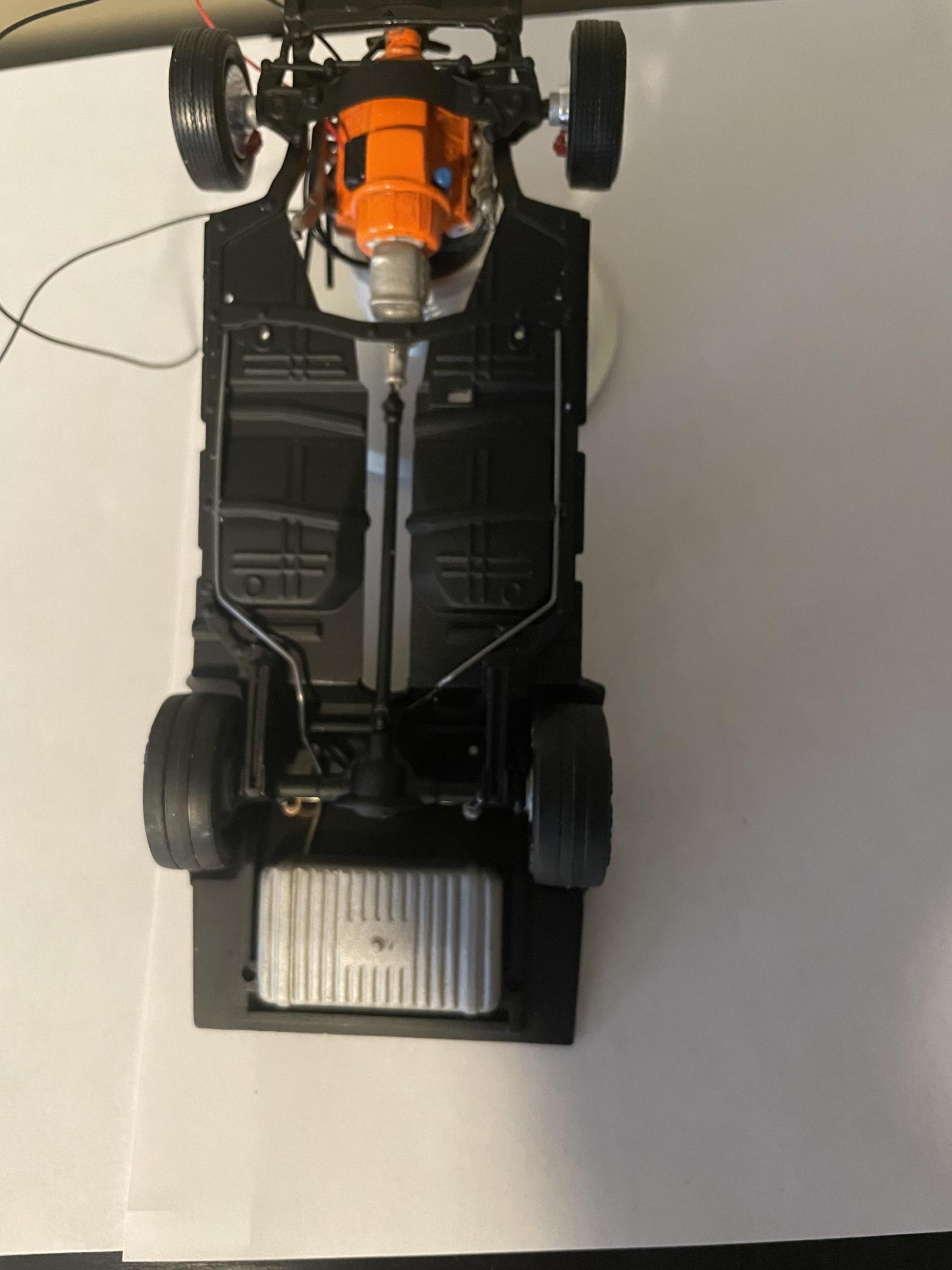 24. Got the chassis painted and the drivetrain installed. This kit didn’t come with shocks and I didn’t have any so I made a couple. They don’t mount on the rear ended like stock but they’ll do. Ran the rear brake lines and the rear section of the fuel line ran, I’m not going to do a return fuel line and I used brass rod for the brake line above the rear ended because I had installed the differential first and the brass was easier to work with in the limited space. Figured out a way to run disks up front. I drilled op through the floor pan to try and simulate the fuel and brake lines running through one of the cross members. I’ve had the body painted with Testors flake green and went to try and rub it out and noticed one door was darker than the rest of the body… don’t know why unless I got a thicker coat right there but weird that it was only on a door. Anyway, I sanded it with 800 the 1500 and resprayed it, will see if it turns out, Luther wise I guess it’s going in the pond. Thanks for looking. Dave.