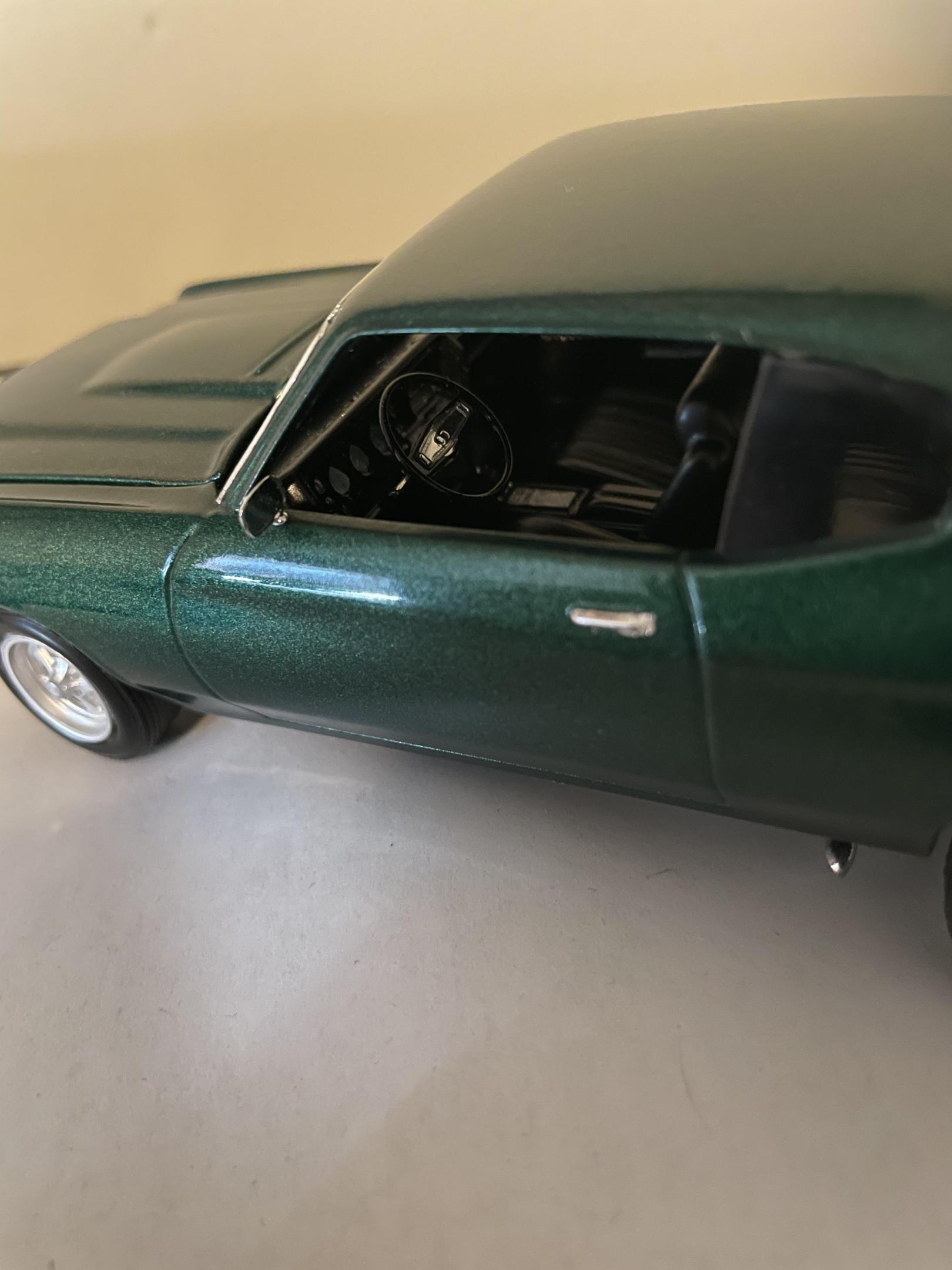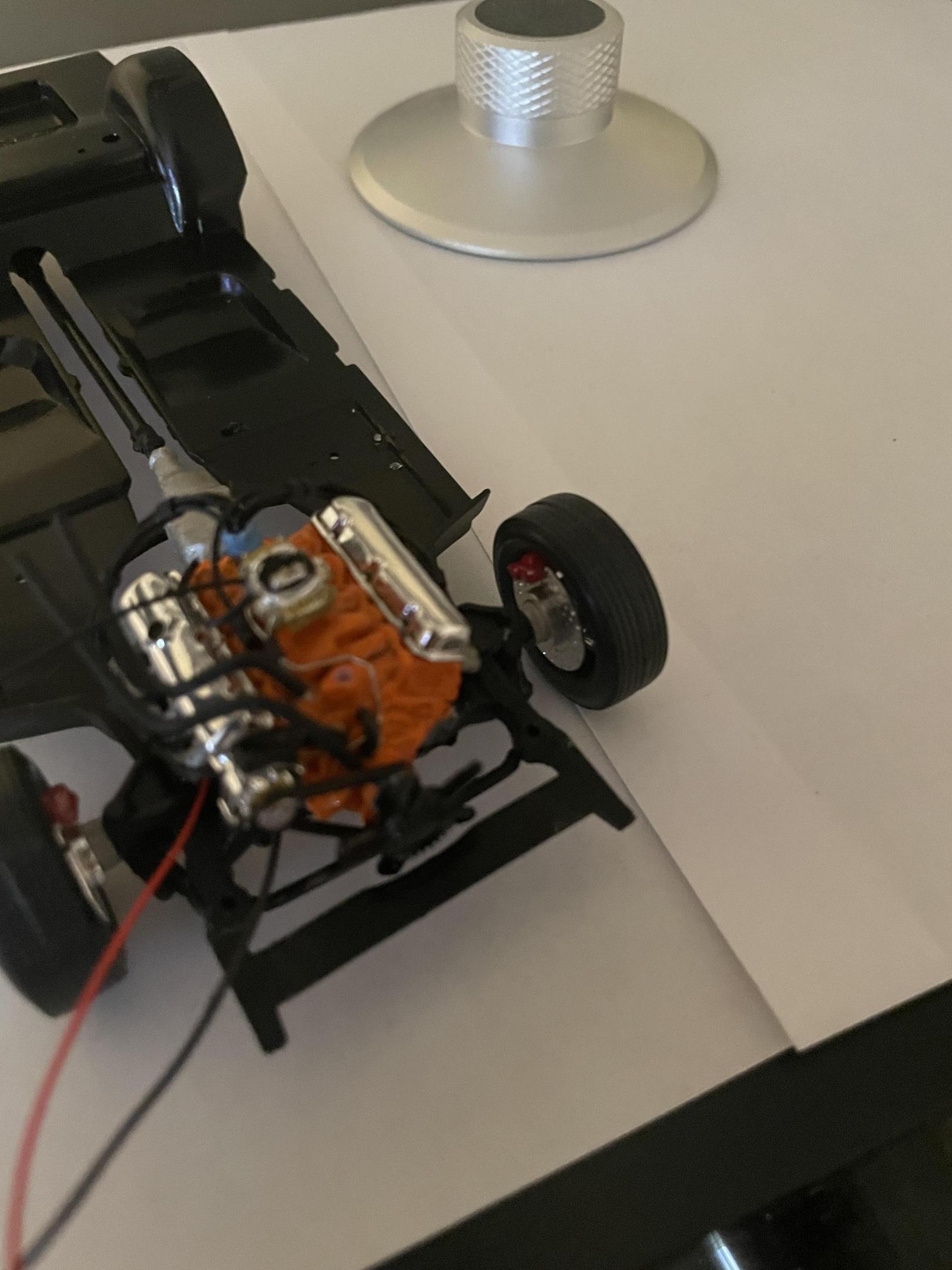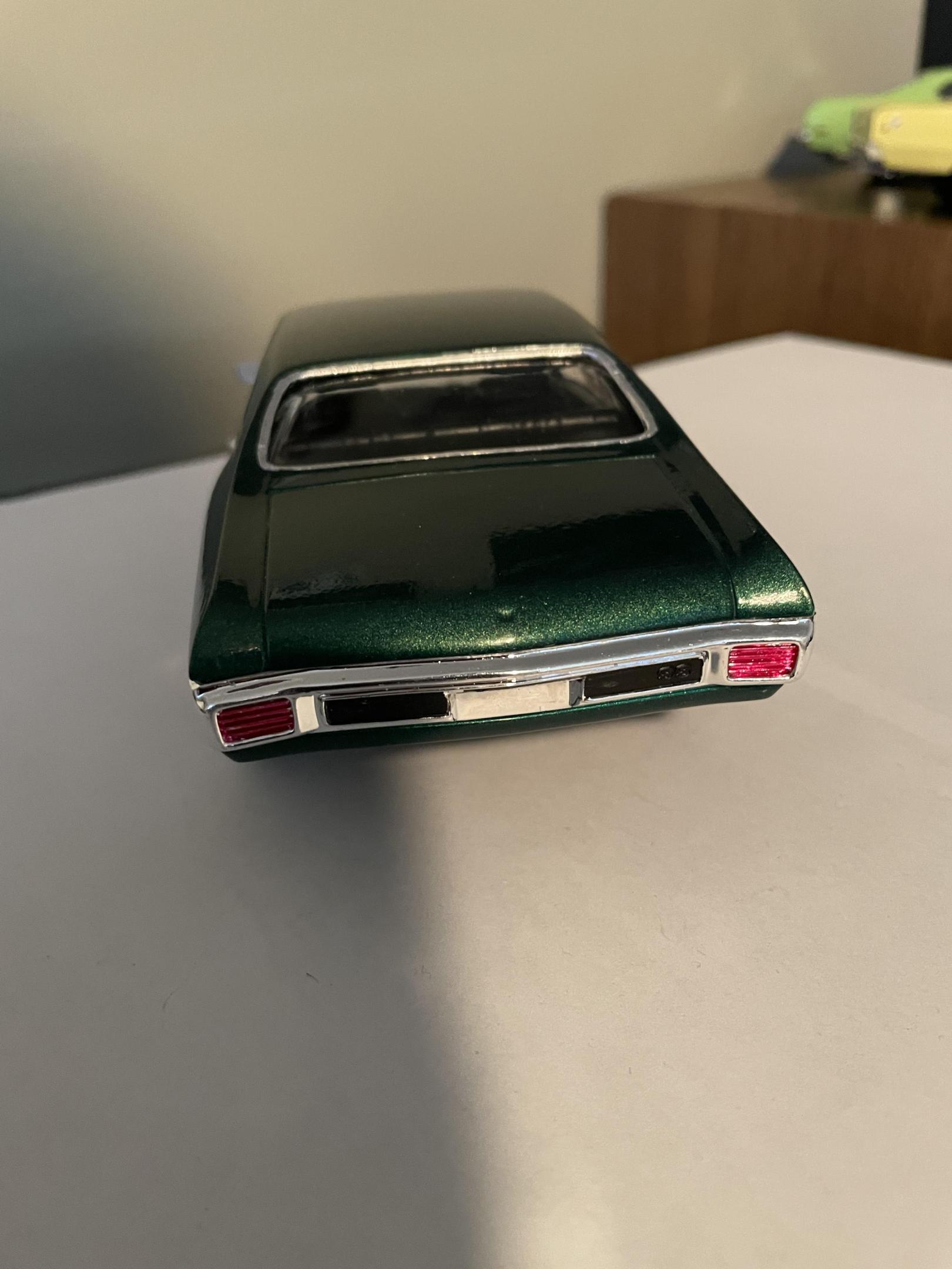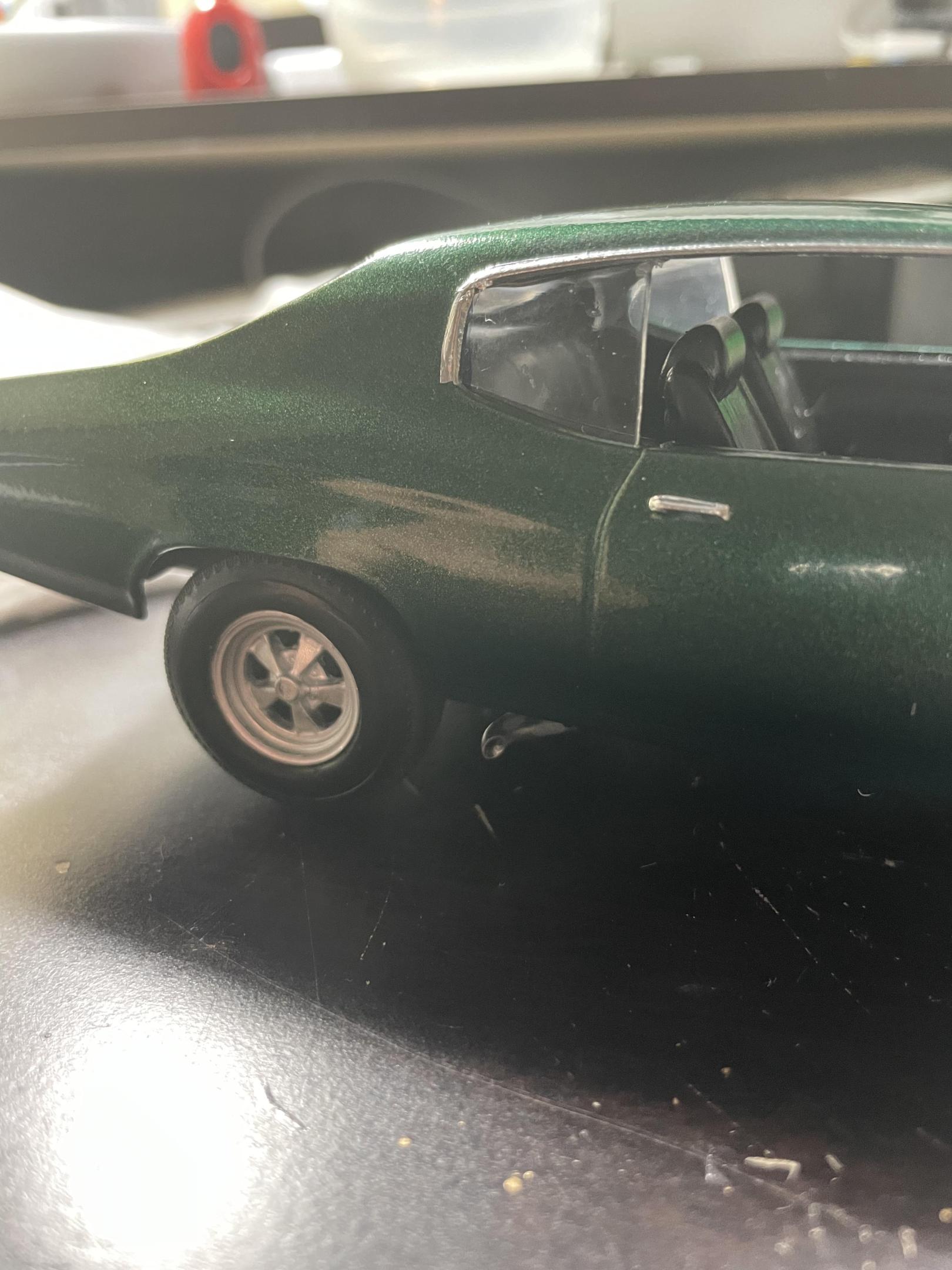 24. Got the chassis painted and the drivetrain installed. This kit didn’t come with shocks and I didn’t have any so I made a couple. They don’t mount on the rear ended like stock but they’ll do. Ran the rear brake lines and the rear section of the fuel line ran, I’m not going to do a return fuel line and I used brass rod for the brake line above the rear ended because I had installed the differential first and the brass was easier to work with in the limited space. Figured out a way to run disks up front. I drilled op through the floor pan to try and simulate the fuel and brake lines running through one of the cross members. I’ve had the body painted with Testors flake green and went to try and rub it out and noticed one door was darker than the rest of the body… don’t know why unless I got a thicker coat right there but weird that it was only on a door. Anyway, I sanded it with 800 the 1500 and resprayed it, will see if it turns out, Luther wise I guess it’s going in the pond. Thanks for looking. Dave.