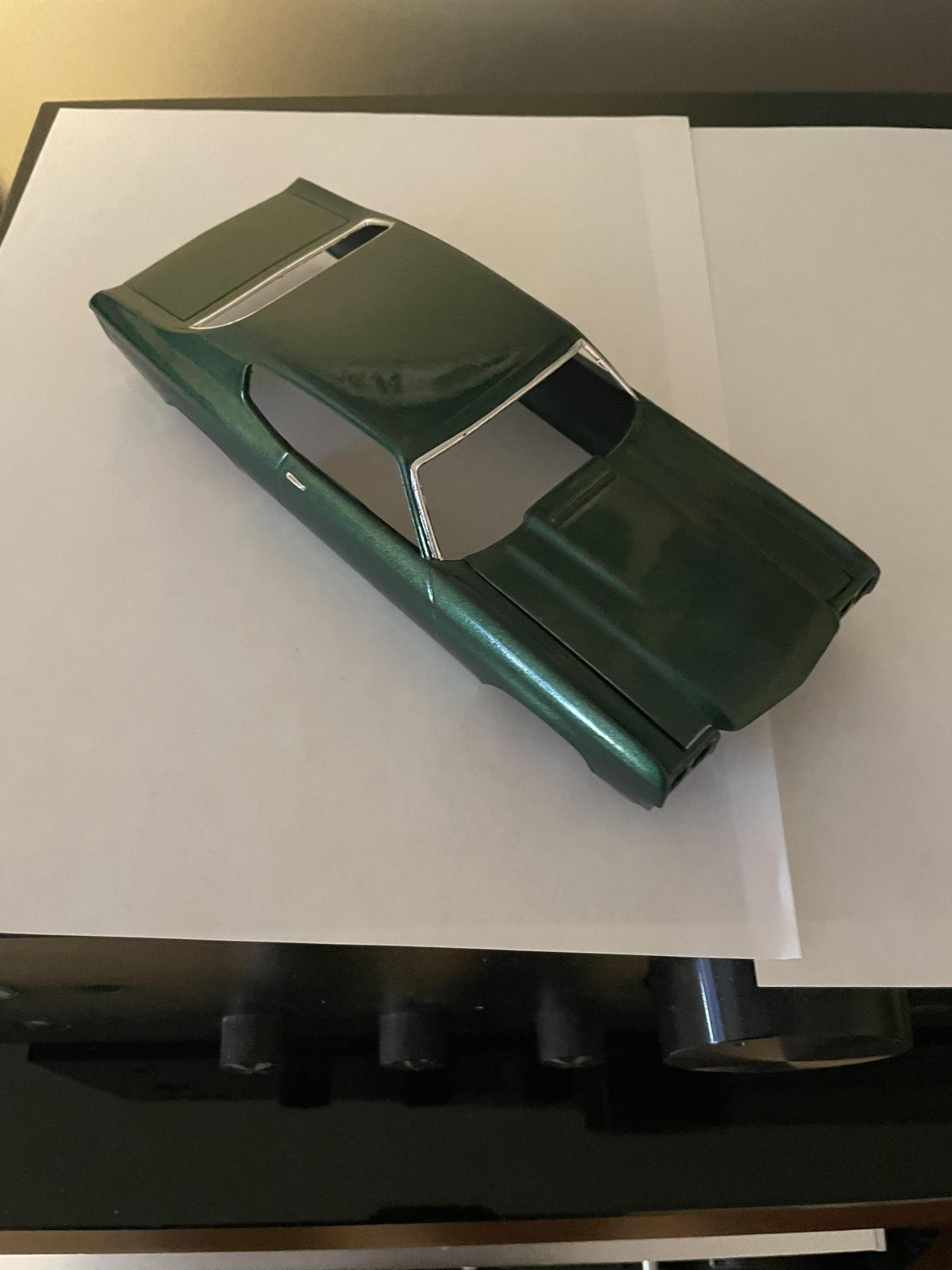 21. I used just a polish on the paint and think it looks okay. Got the foil on the window trim and door handles and set the body on top of the chassis… didn’t want to place it all the way down yet but it gives an idea of the finished look. I’ve been kicking around trying to use the white stripe decals that came with the kit, I really like that look but I don’t know if I want to risk messing up the paint. Thoughts? Dave.