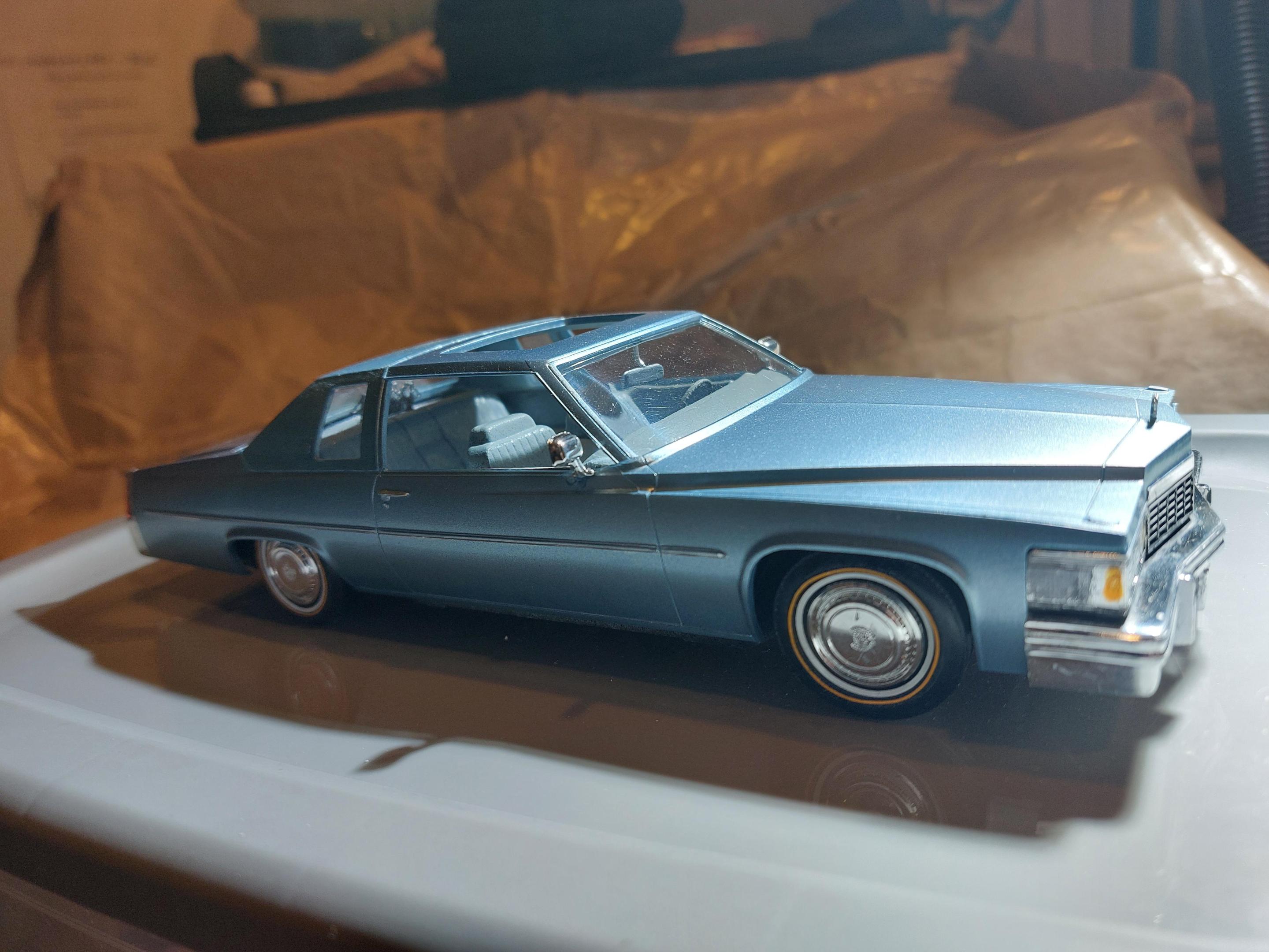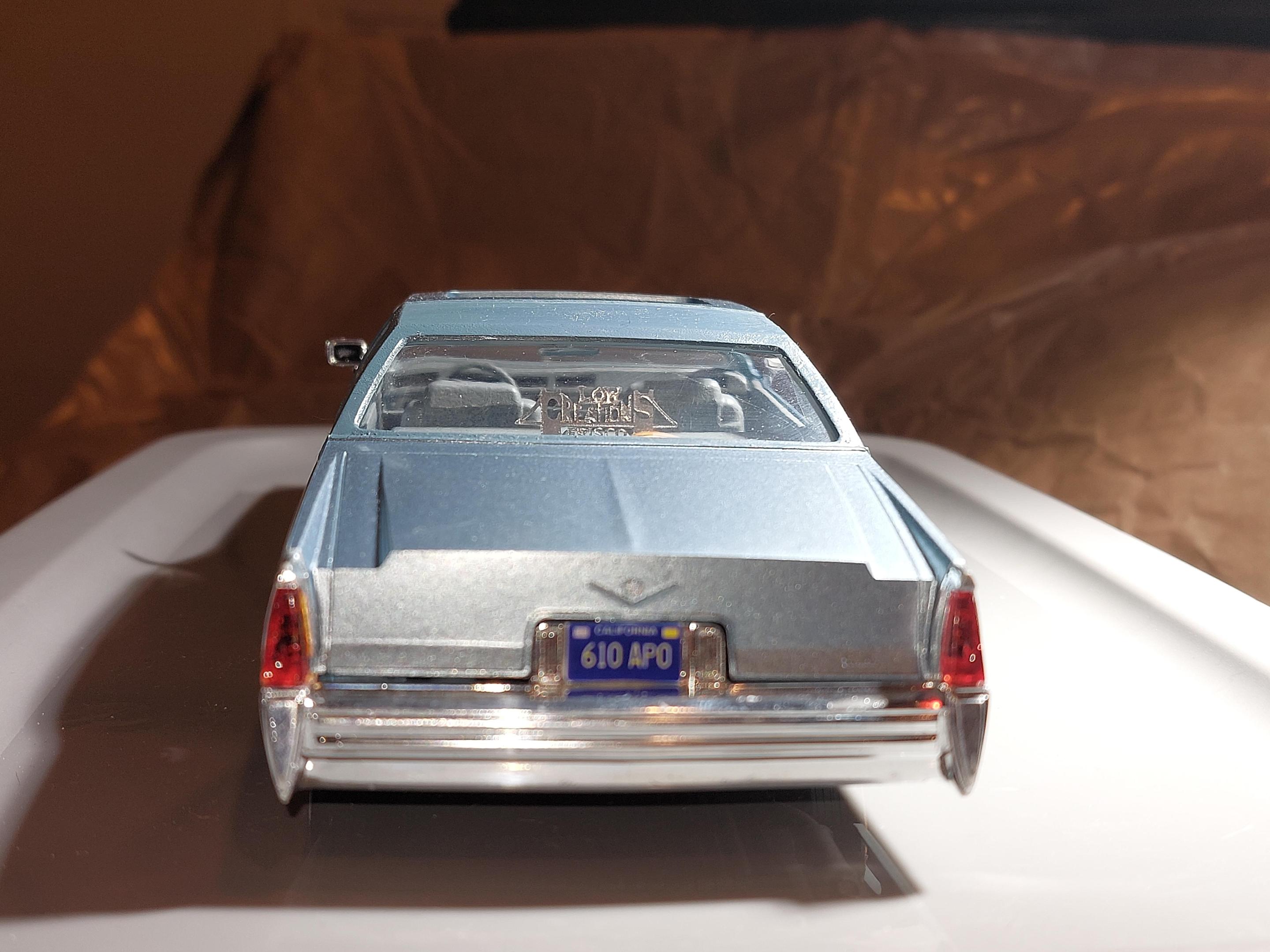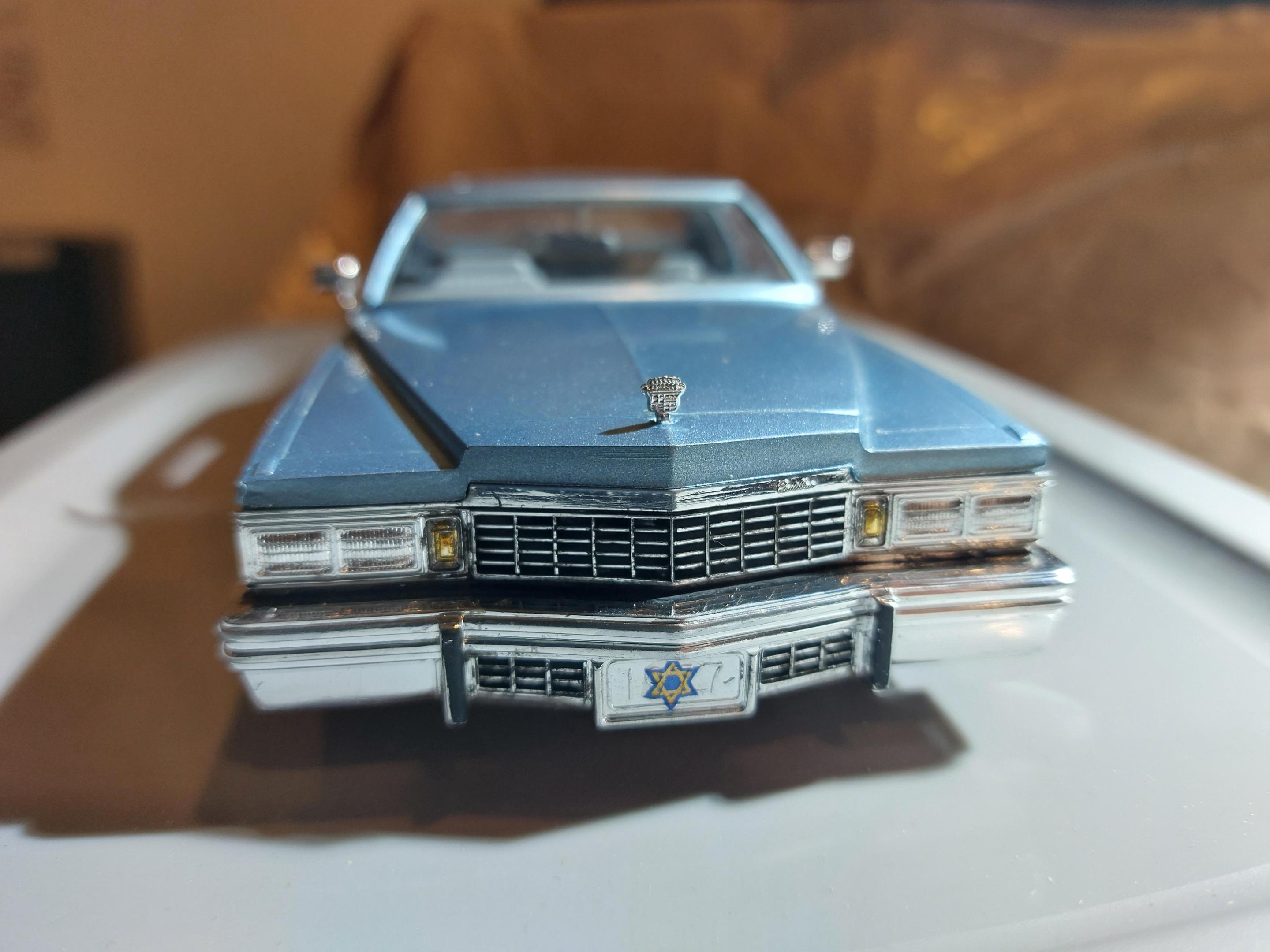 Johan '77 Coupe Deville Promo2NthreequarterSFPD022 replied to Perspect Scale Modelworks's topic in Model Cars I have started a 1979 in black on black. Finished the interior and even have "Guido & Guidette" figurines ready to ride. But I decided to finish this '77 first. I restored it, dropped it to make it a mild custom. I kept the Cerulean blue exterior, and used Model Masters USSR Flanker Blue for the landau roof. I swapped the interior of a '76 Eldorado that I lightly detailed after spraying it in Rustoleum 2X Ice Grey, added a period correct local car club plaque (Low Creations of San Francisco) from Mike Nagatani of 3D Scale Parts, all three mirrors from the Revell Cadillac Lowrider kit, rear license plate from the historic California set from Ken Schultz's 3 Inches And Under, and also from the Jo-Han '76 Eldorado the Jennstar510 wheel set ups. And last but not least, in tribute to all the great Jewish boxers of the past the star of David superimposed on the front plate is a nail art decal from Todd of Moon Sugar Decals. I call it "The NABF Champ's '77" An homage to the champion fighters in the 50's, 60's and 70's that loved their big American "boats" just need to get some custom made miniature stickers, a Carter/Mondale '76 roundel and a Jerry Brown For California bumper sticker.