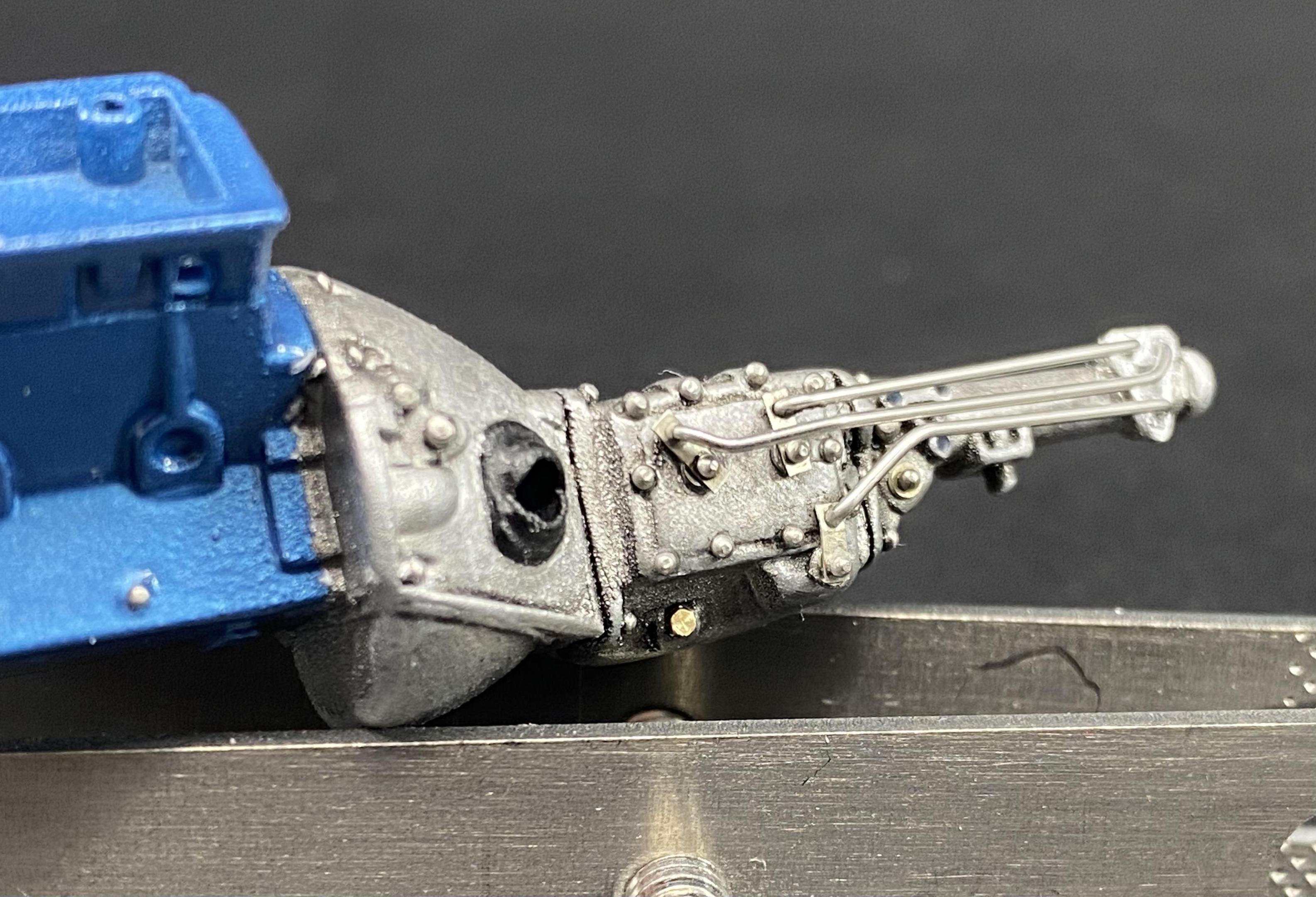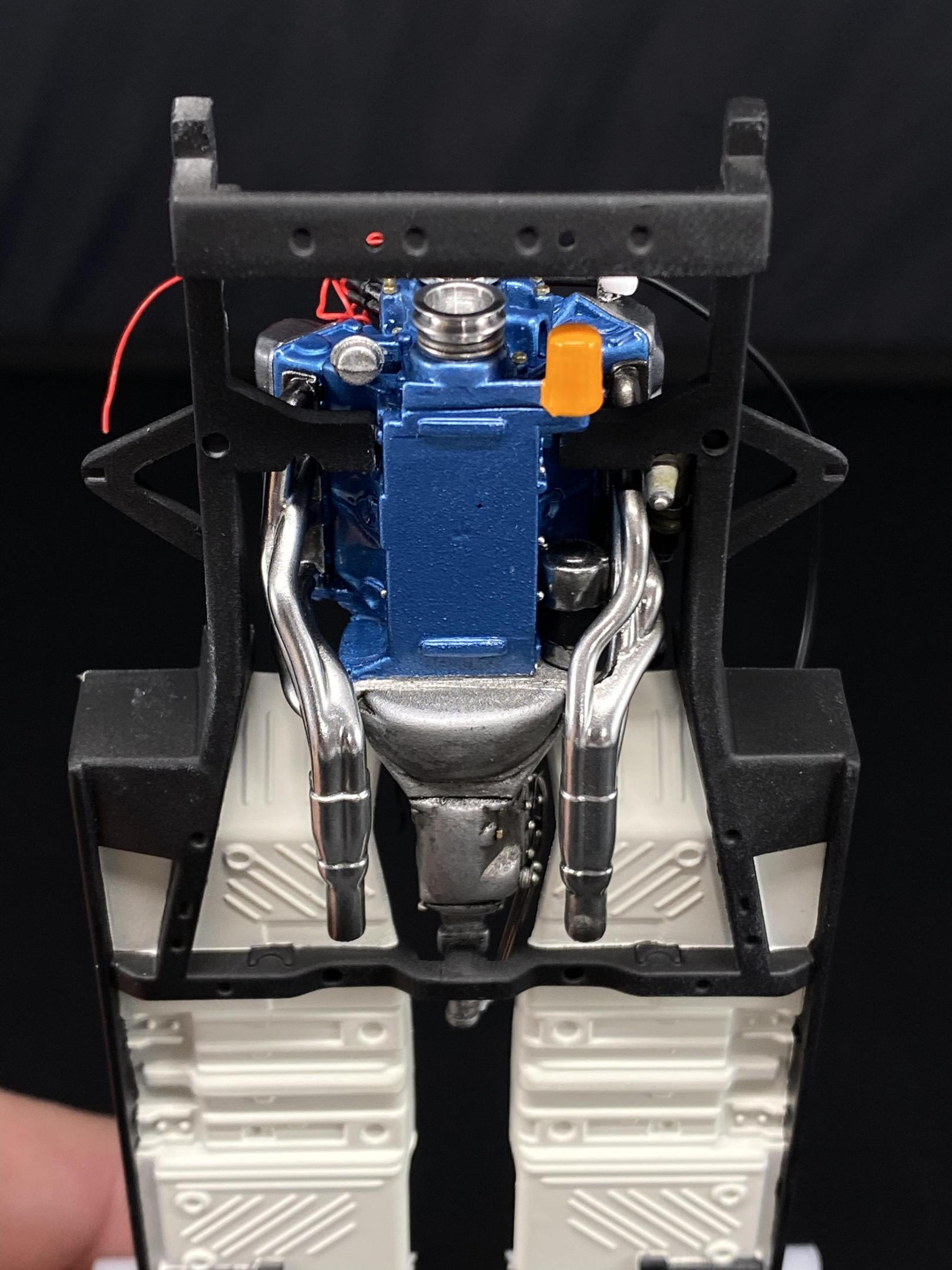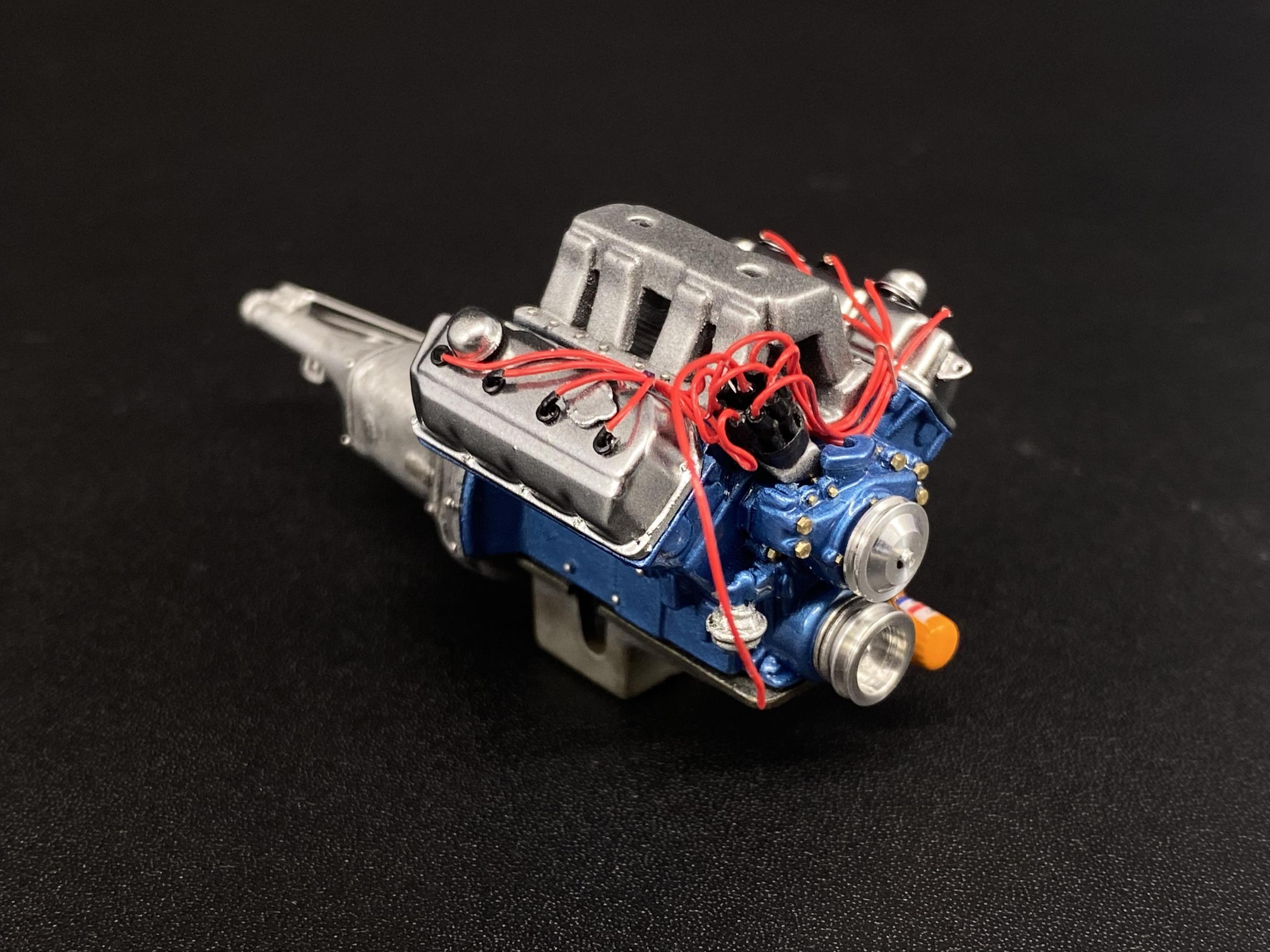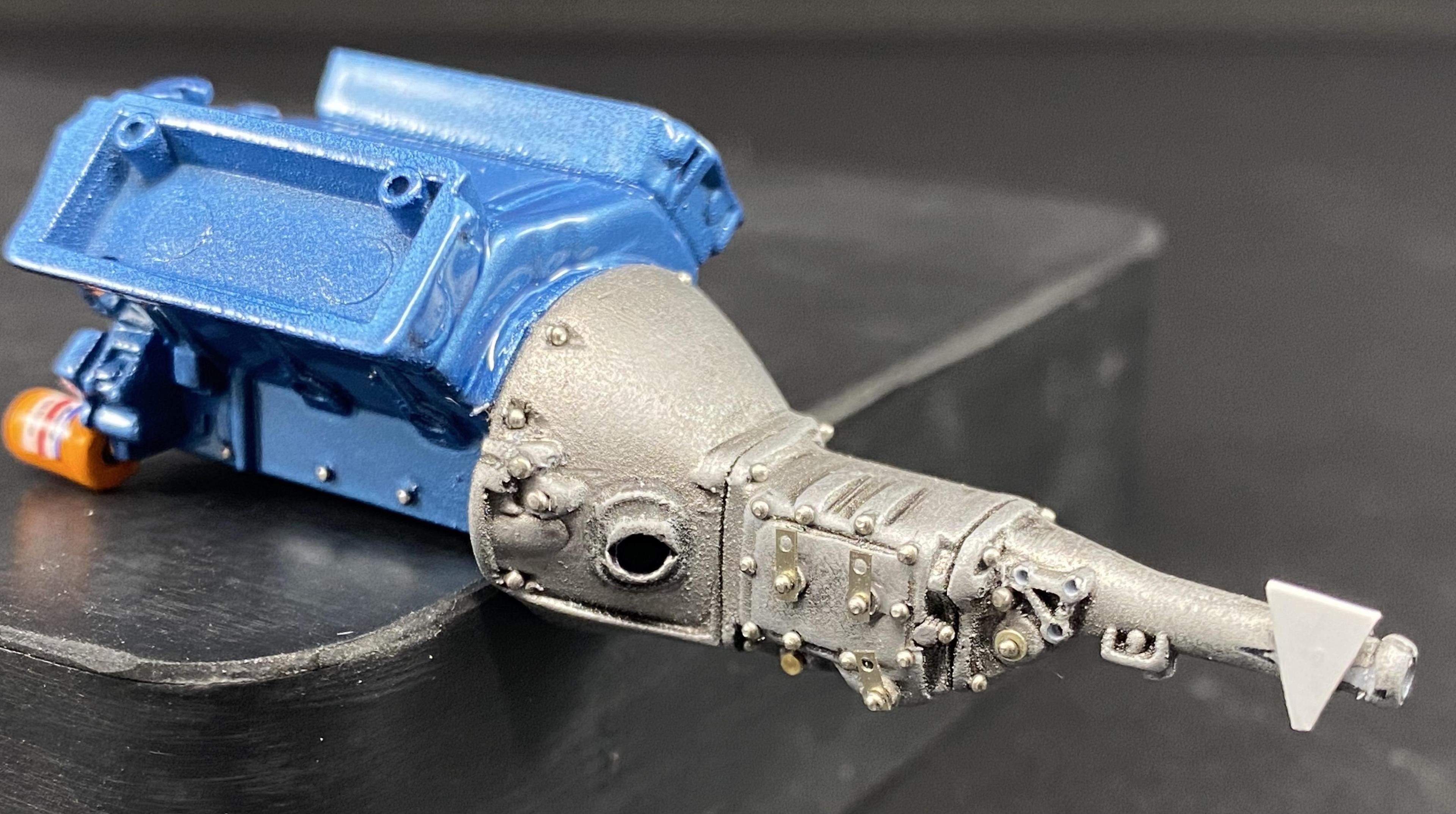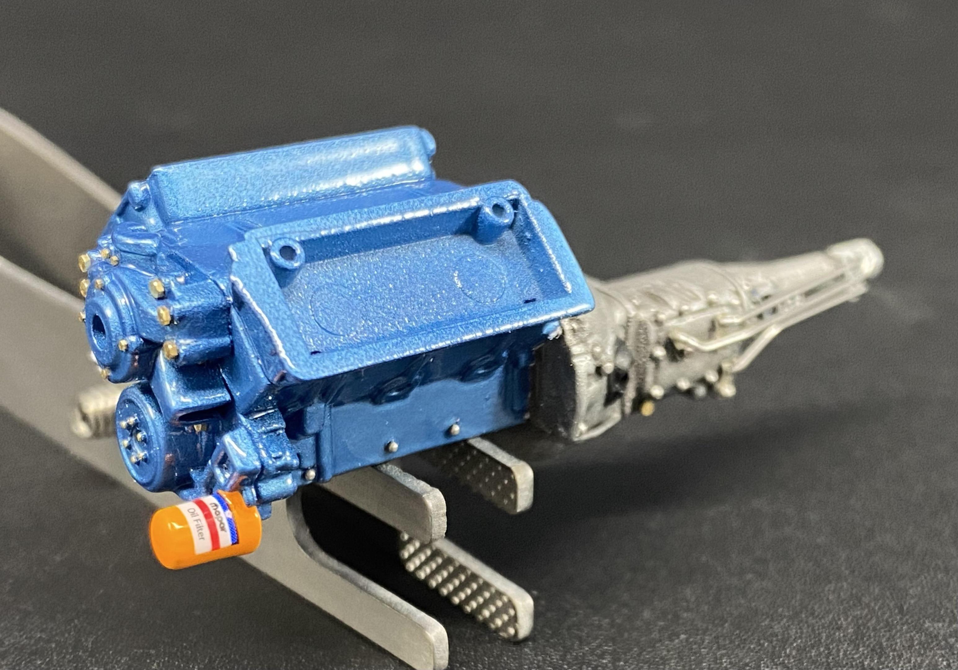 24. I started with the engine. Primed and painted LeMans blue, (which is the wrong color), all the bolts cut, drilled and replaced with brass, trans painted Alclad aluminum, and drilled out all the bolts. i cut up and drilled some holes for the trans linkage, just looking at reference pictures and making it up as I go. the shifter mount on the kit was way to small and fragile, no way to get anything to stick on there, so I glued a new piece in, I’ll get the holes drilled, then I’ll file it down to size.