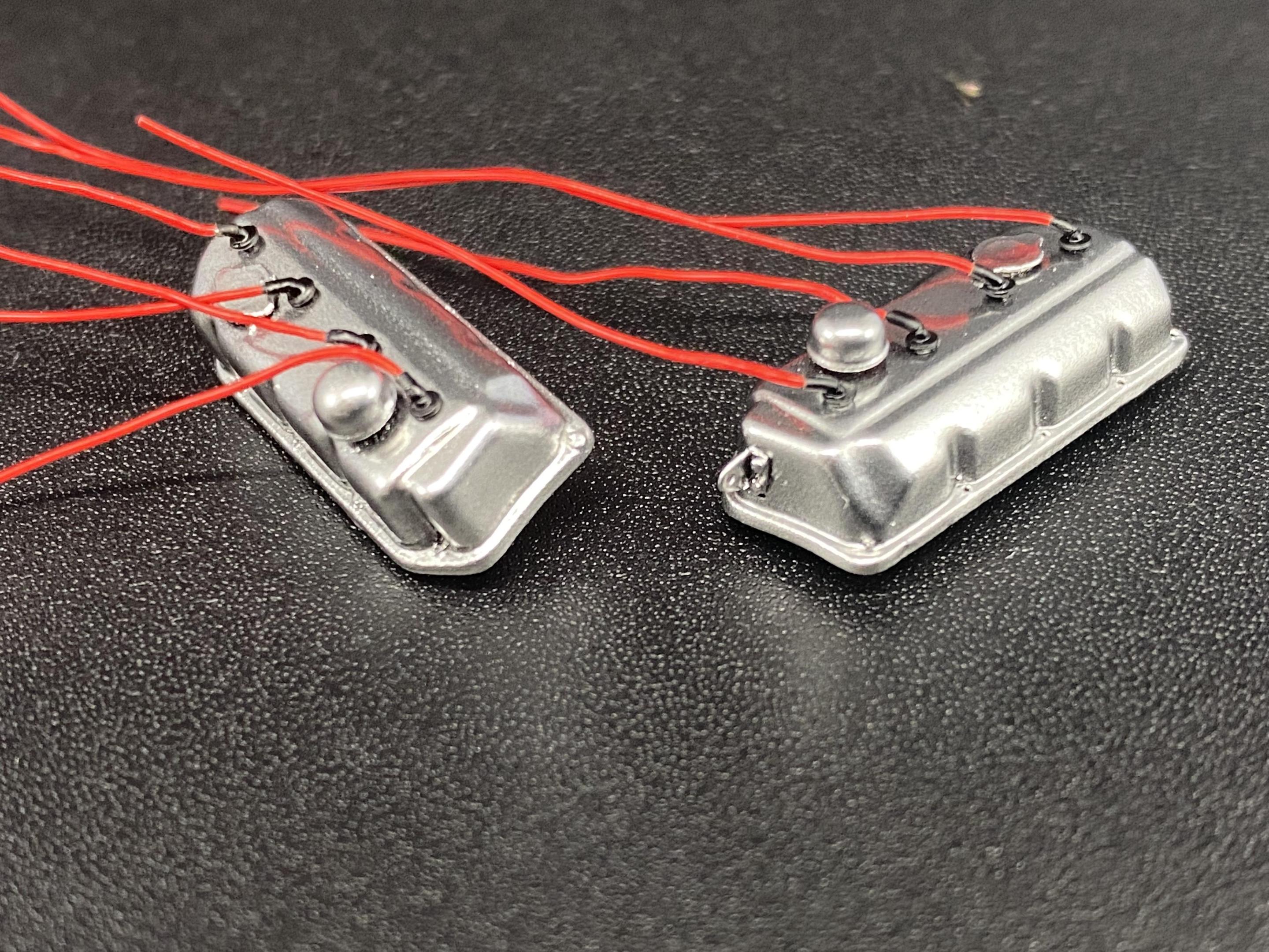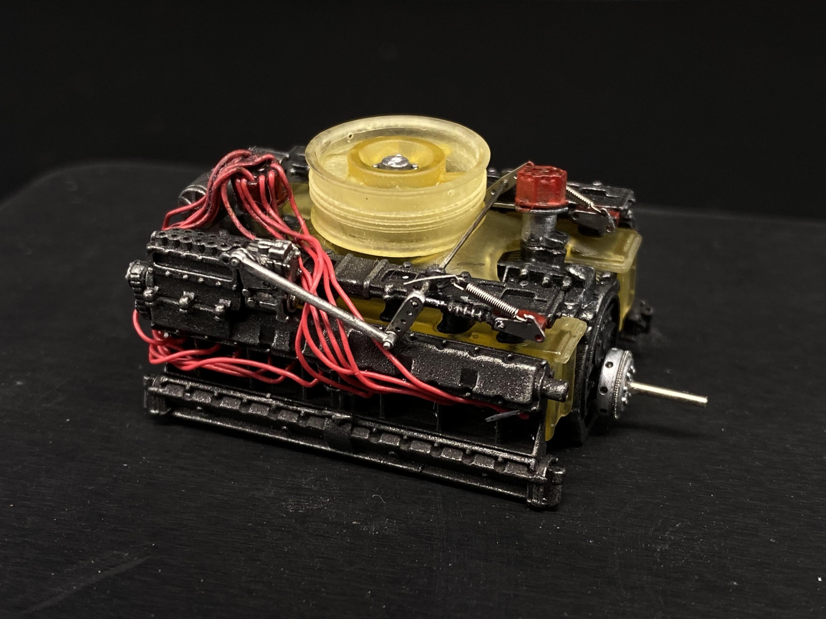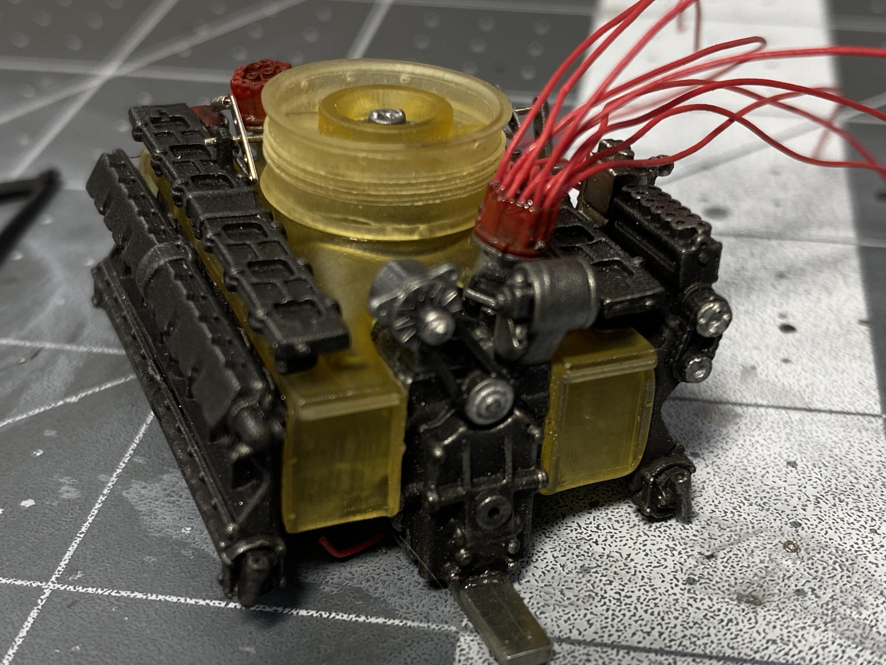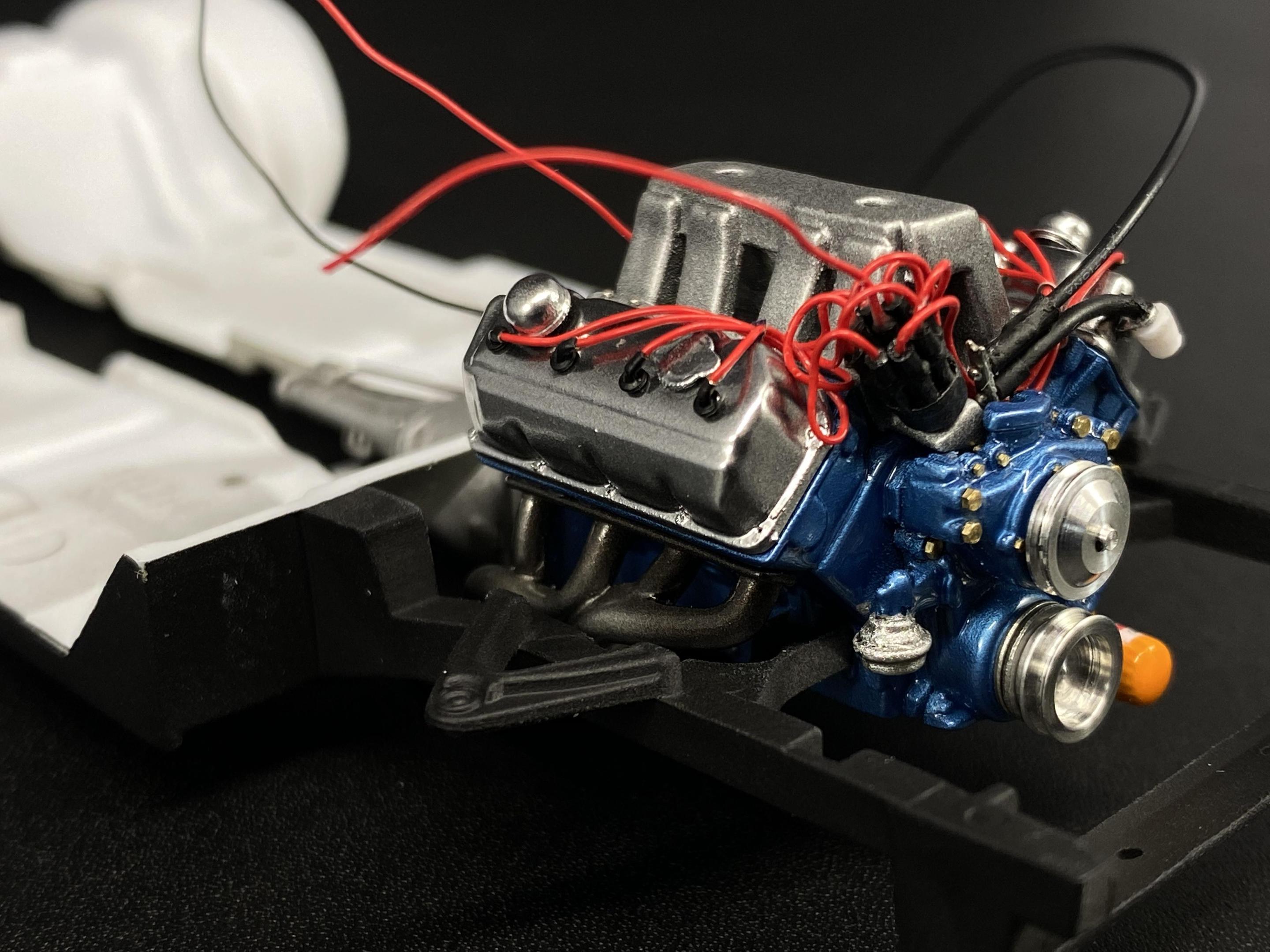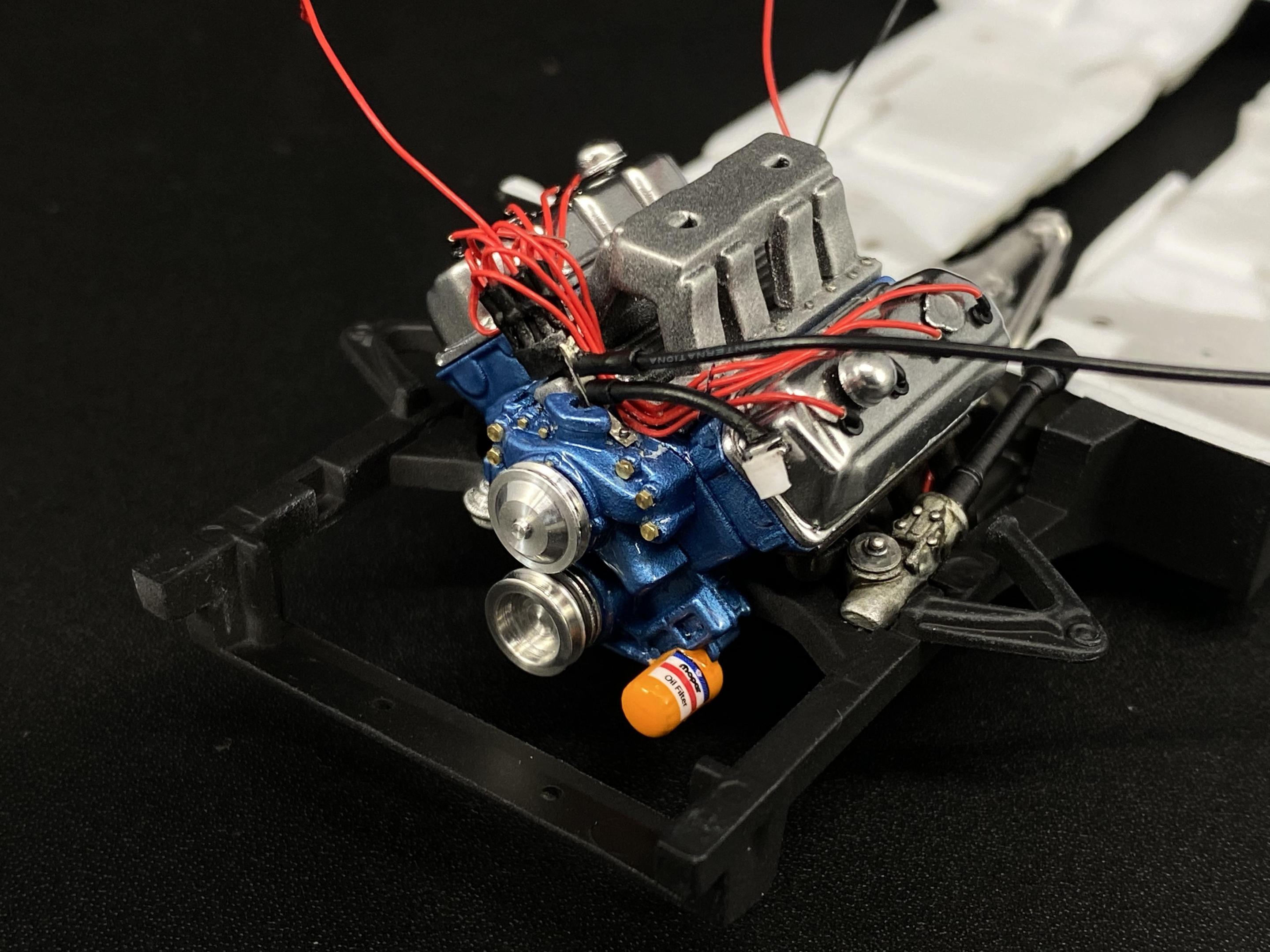 21. Back and forth from the body to the chassis and engine. I got the starter painted in Alclad airframe aluminum for some contrast, and wired up. Scratch built connectors from Albion nickel silver tubing. Drilled out all the bolts on the steering, and made up all the plug wires. Each wire includes the wire, nickel tubing and a washer. Then carefully painted black and installed into the covers, which were stripped and painted Alclad chrome. breathers also replaced with RB Motion parts, and PE oil caps.