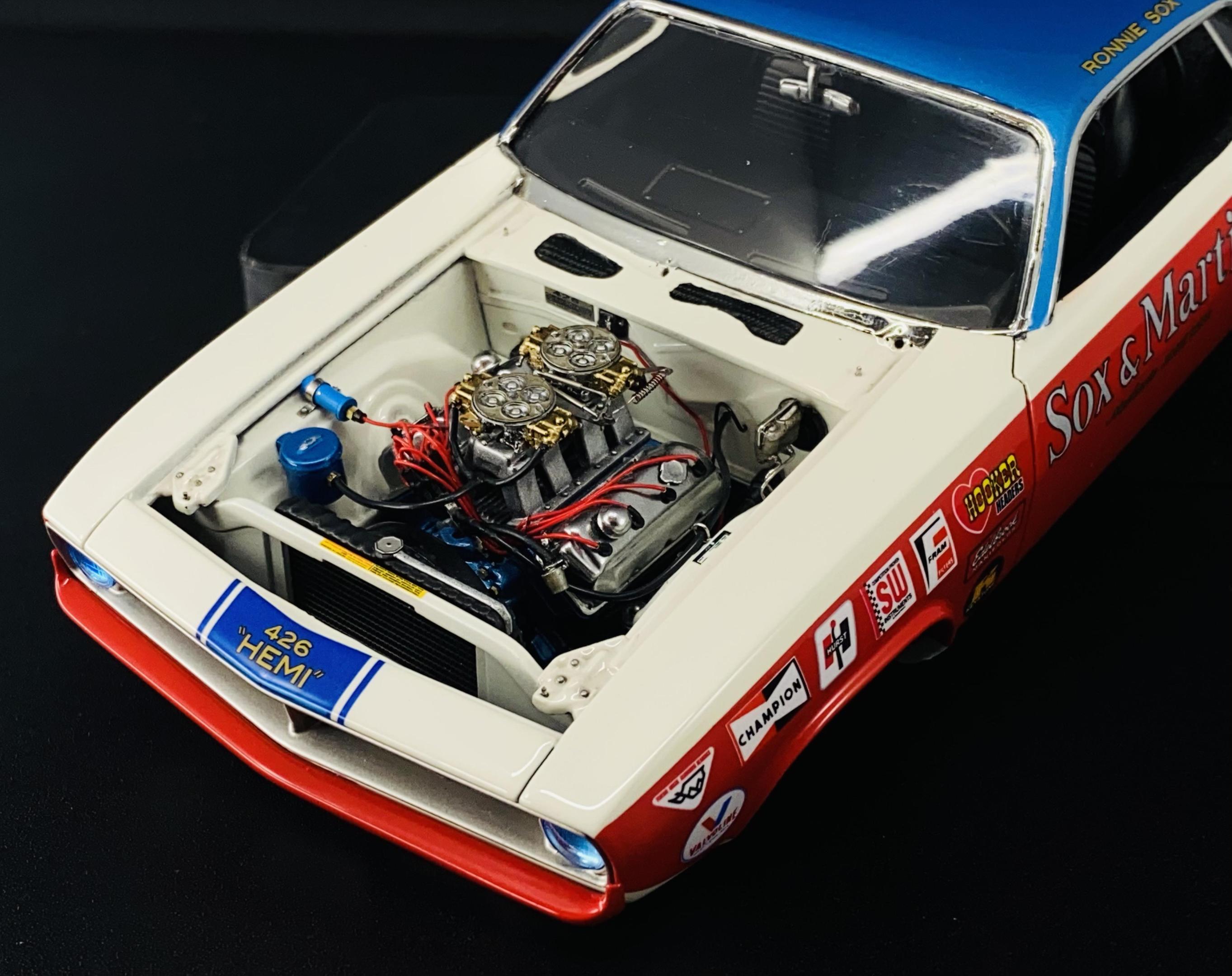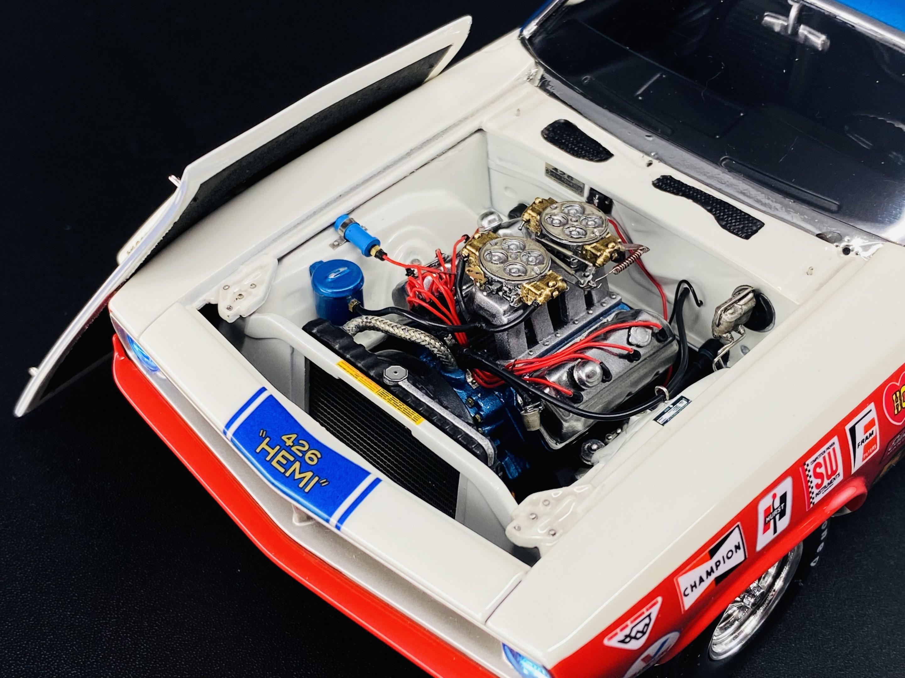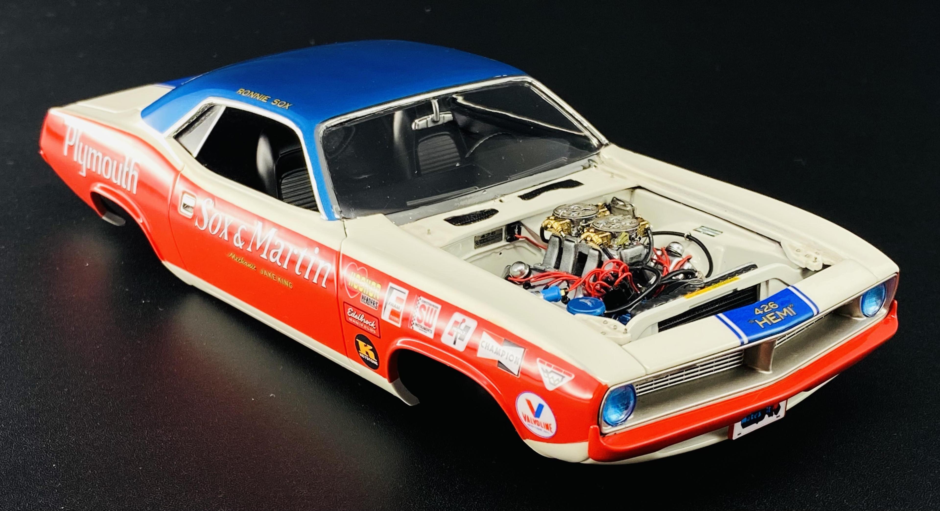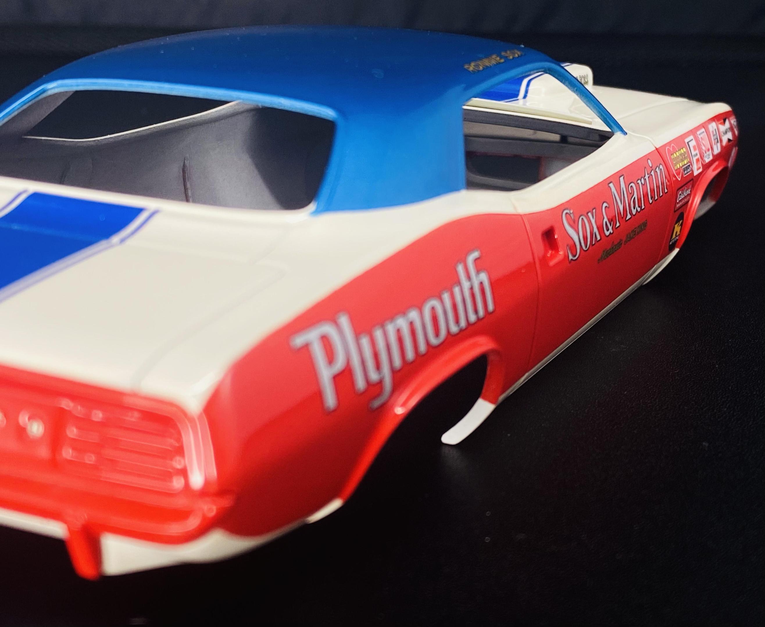 14. Decals on, over a mist coat of 2k clear, then a heavy wet coat. I then sanded that back with 3000 and applied these. the Revell decals may as well have been cardboard, very very thick! in this case, Revell fails horribly and made their decals way, way too short for the stripes. I also had to pull the Fram, champion and Valvoline decals from the Johan kit. Cuda PE part added to rear and a very small PE trunk lock.
