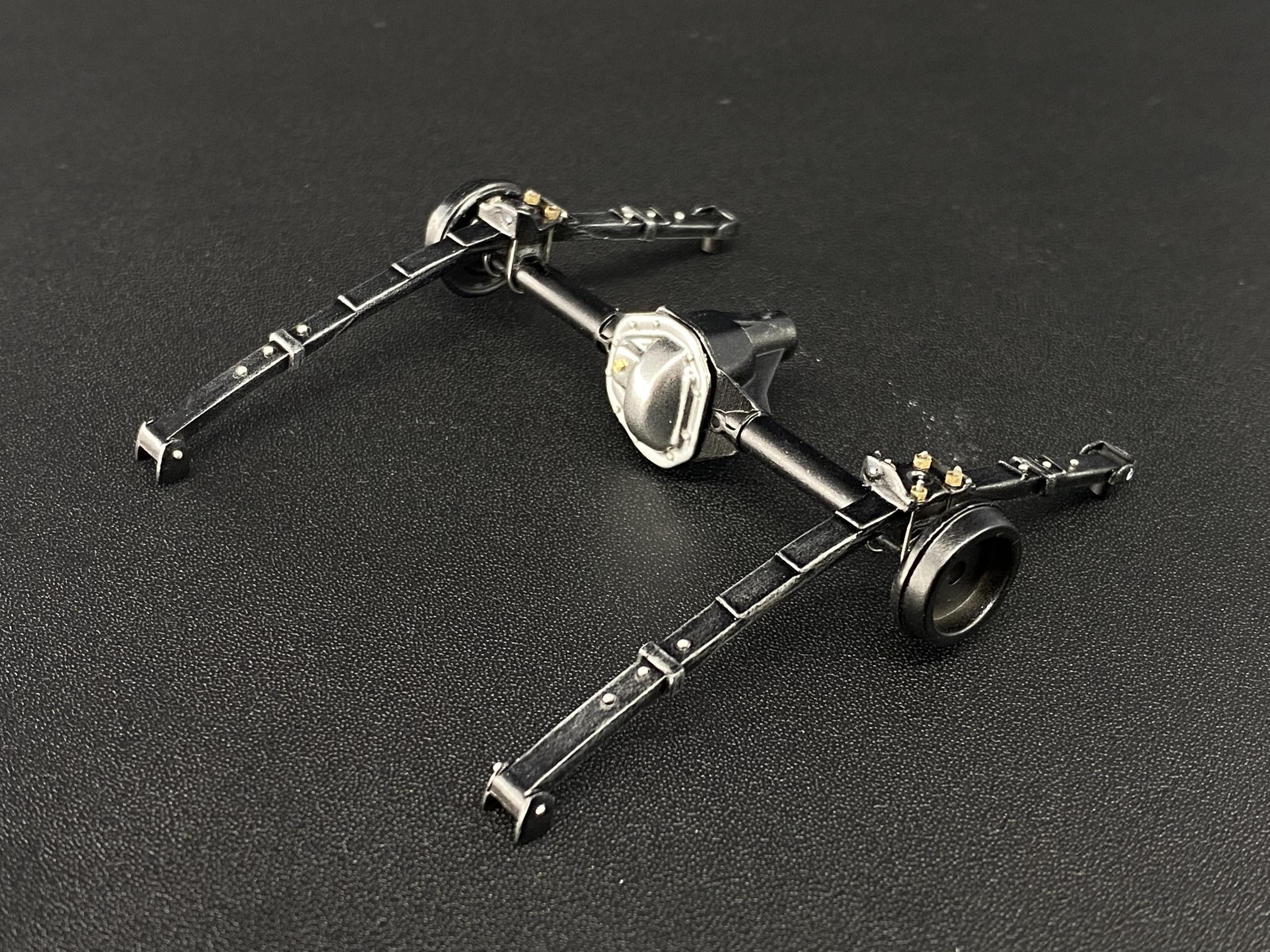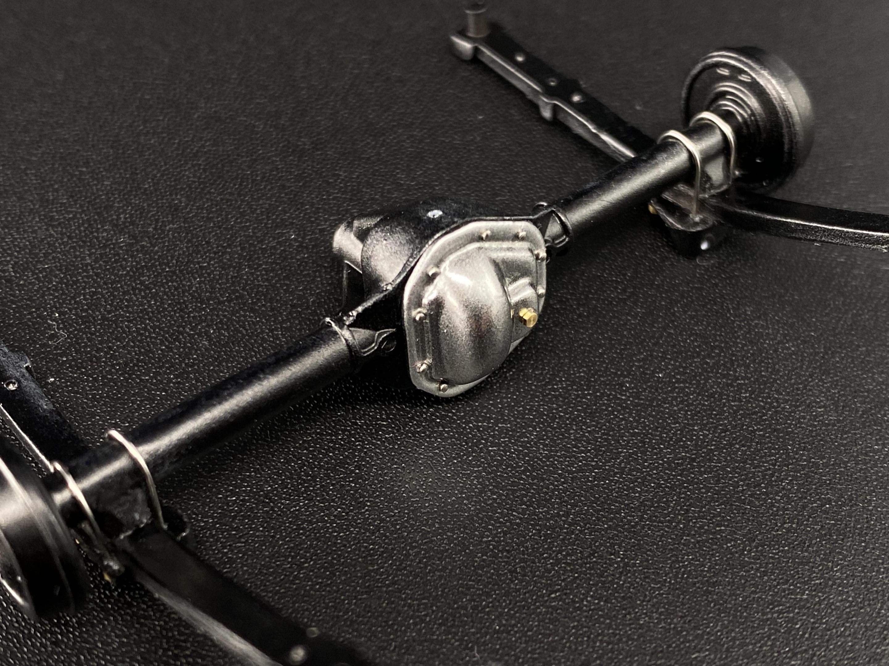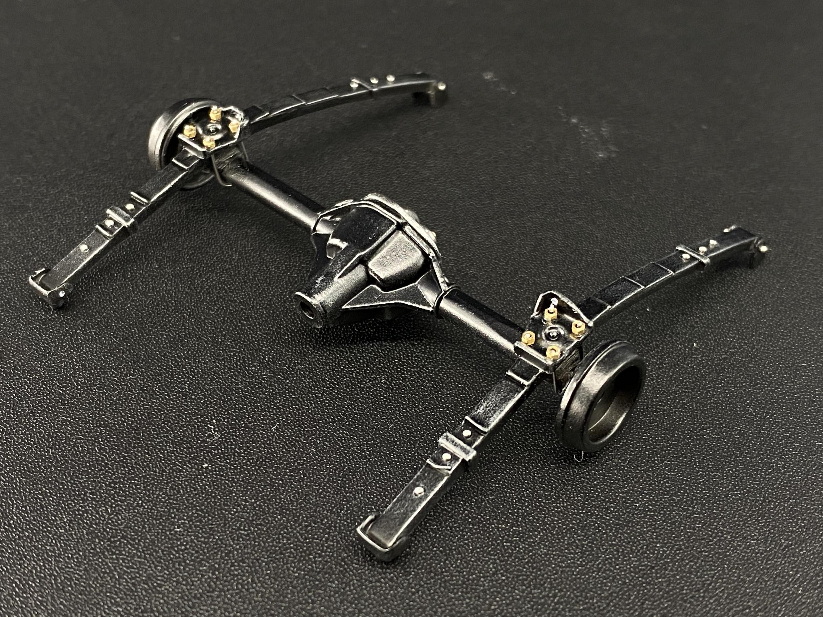 10. Did some work on the rear end this weekend. There are 6 kit parts… 54 total parts for the assembly I shaved off all the molded in bolts, sanded the U bolts off and started going at it with the pin vise.