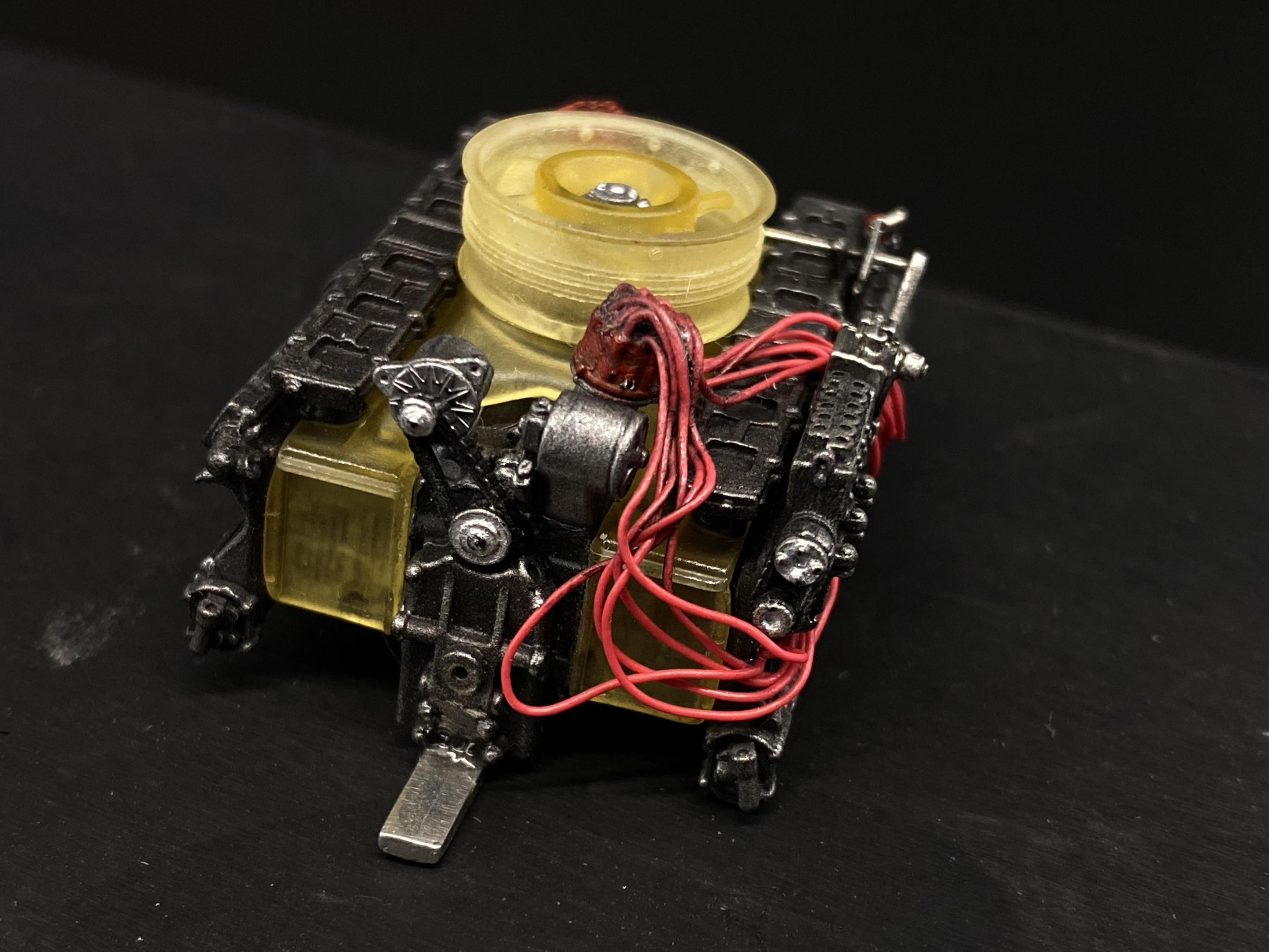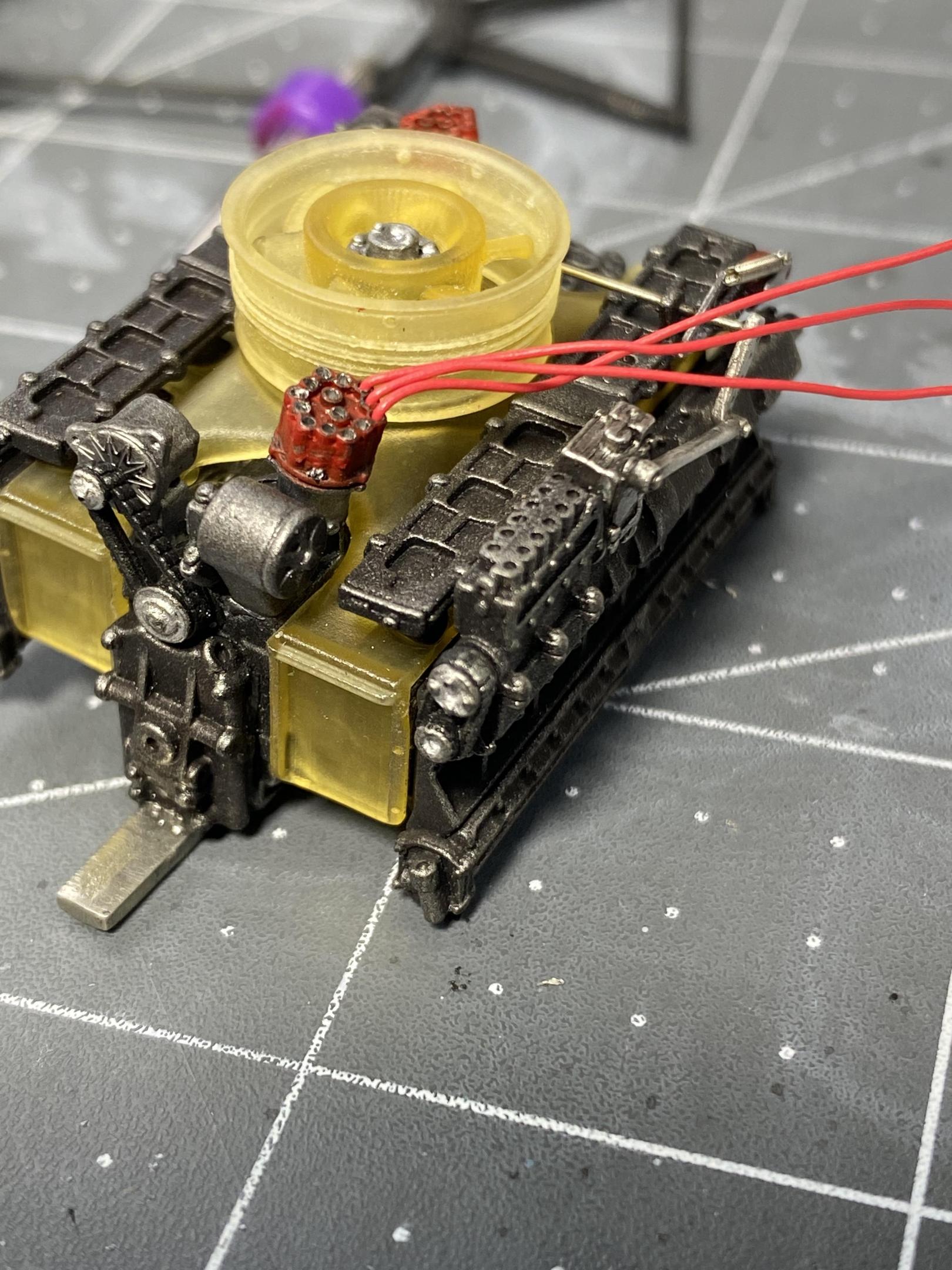 2. After all the polishing, hand sanding and drilling out all the holes, this is where I’m at. Half the engine wires are done. I use Tamiya metal primer from the can on the raw metal followed by Splash Paints primer on everything. Then paint every part with an assortment of Alclad metal colors, and lightly weather.