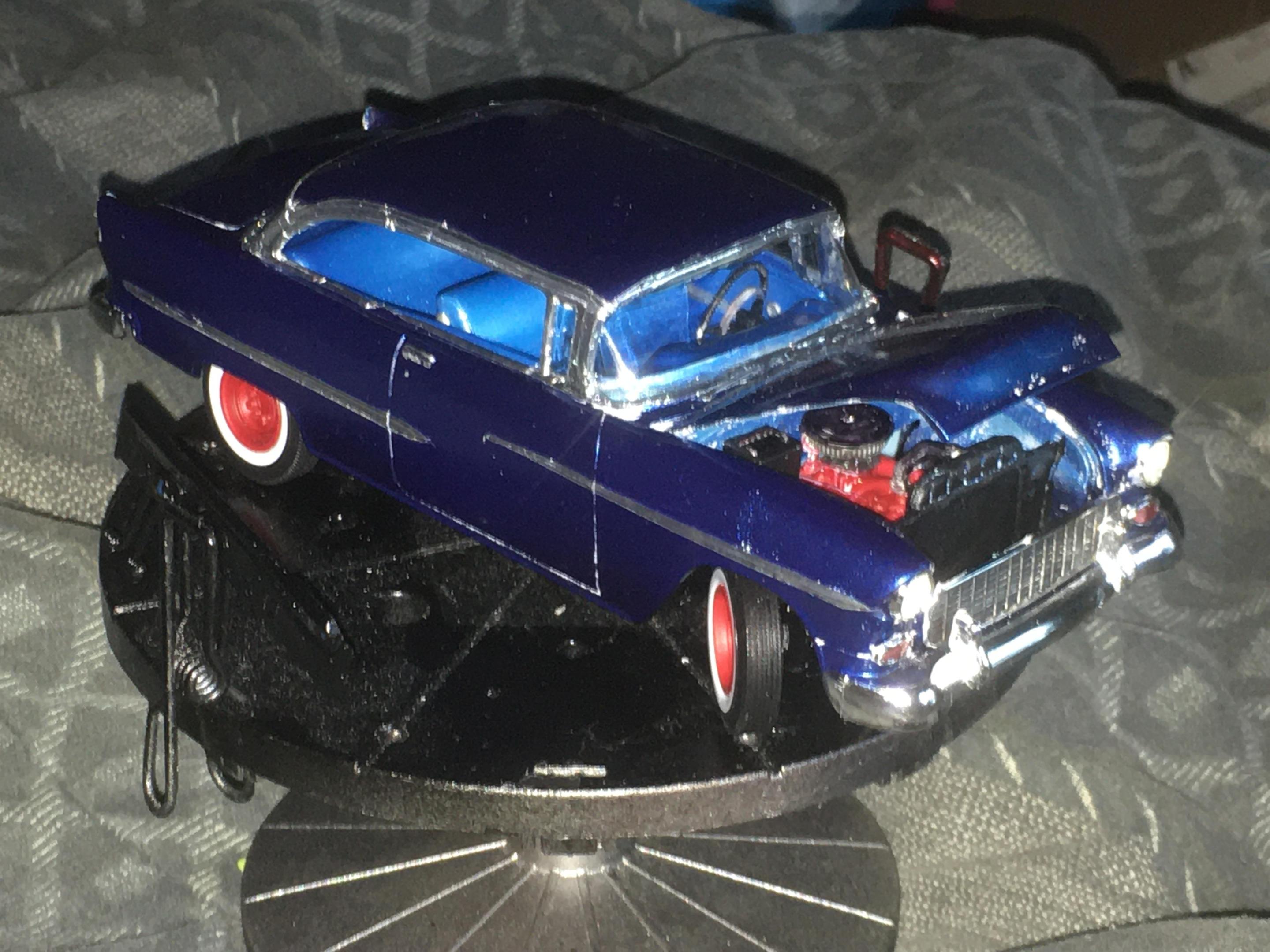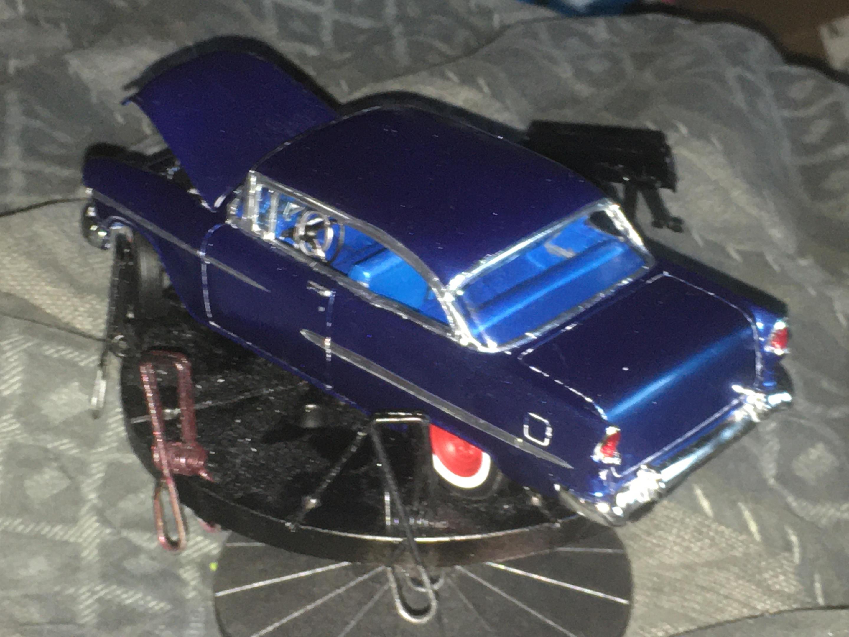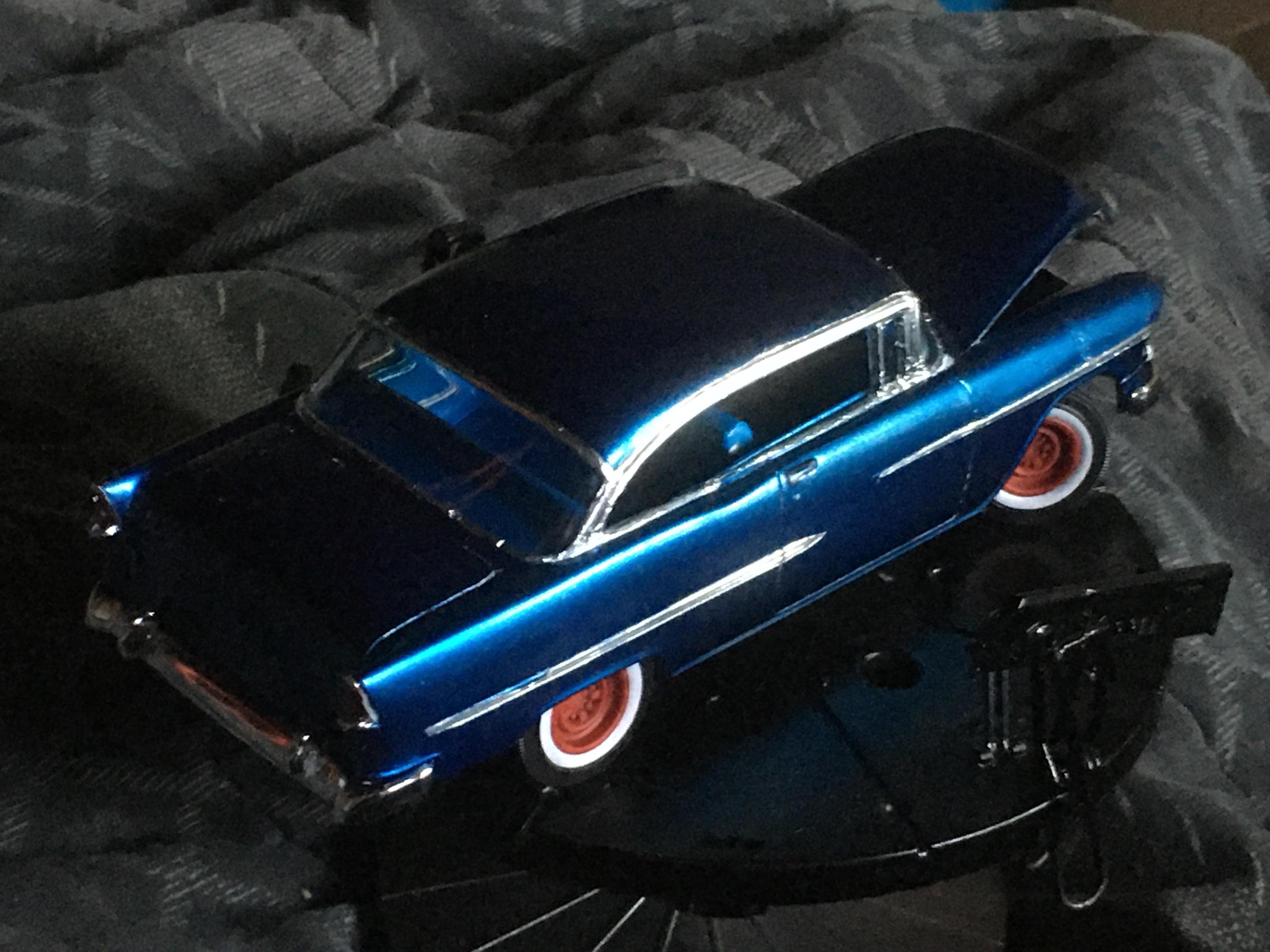 One of my neighbors had a 55 Chevy, I’m guessing back in the ‘60s. This color is as close to the actual blue that I was going for, in the slide picture. The actual color of the car looked blue at night and daylight, but if the sun hit the car just right, it looked green. When he had the car painted blue, it ended up being a Heinz 57 blue color. So here’s a picture of the slide, of the car, the kit I used, and the end result of the build.