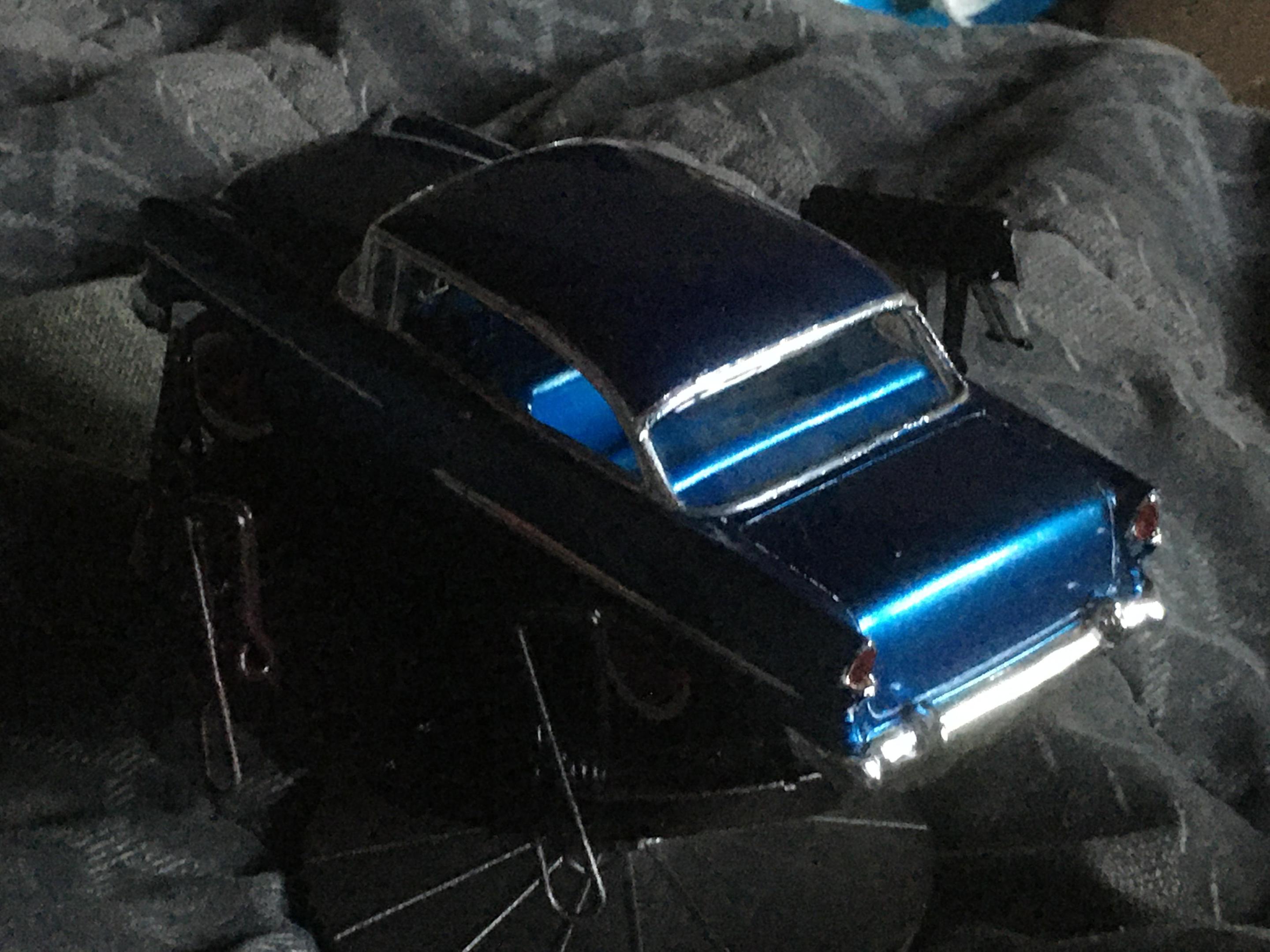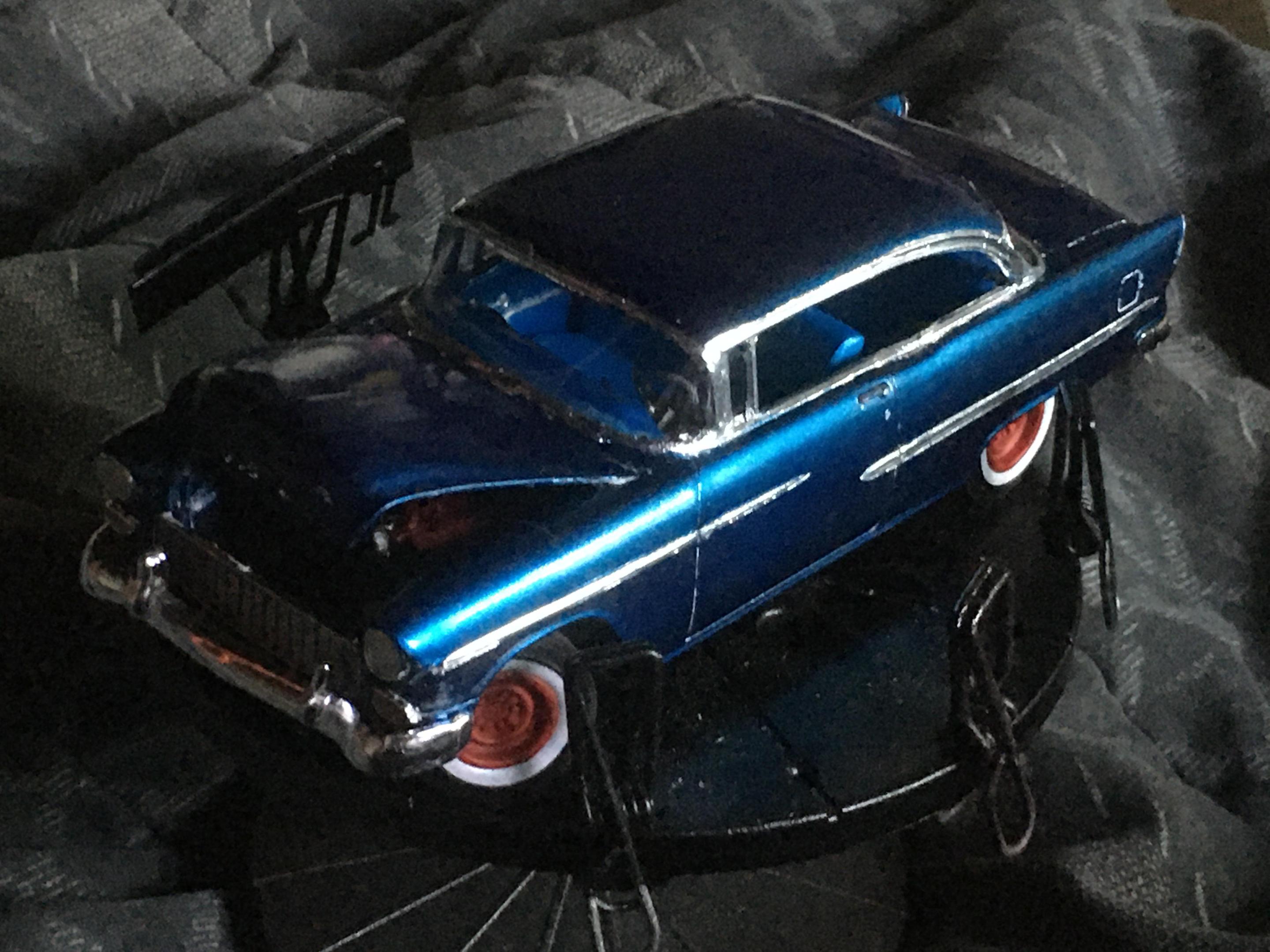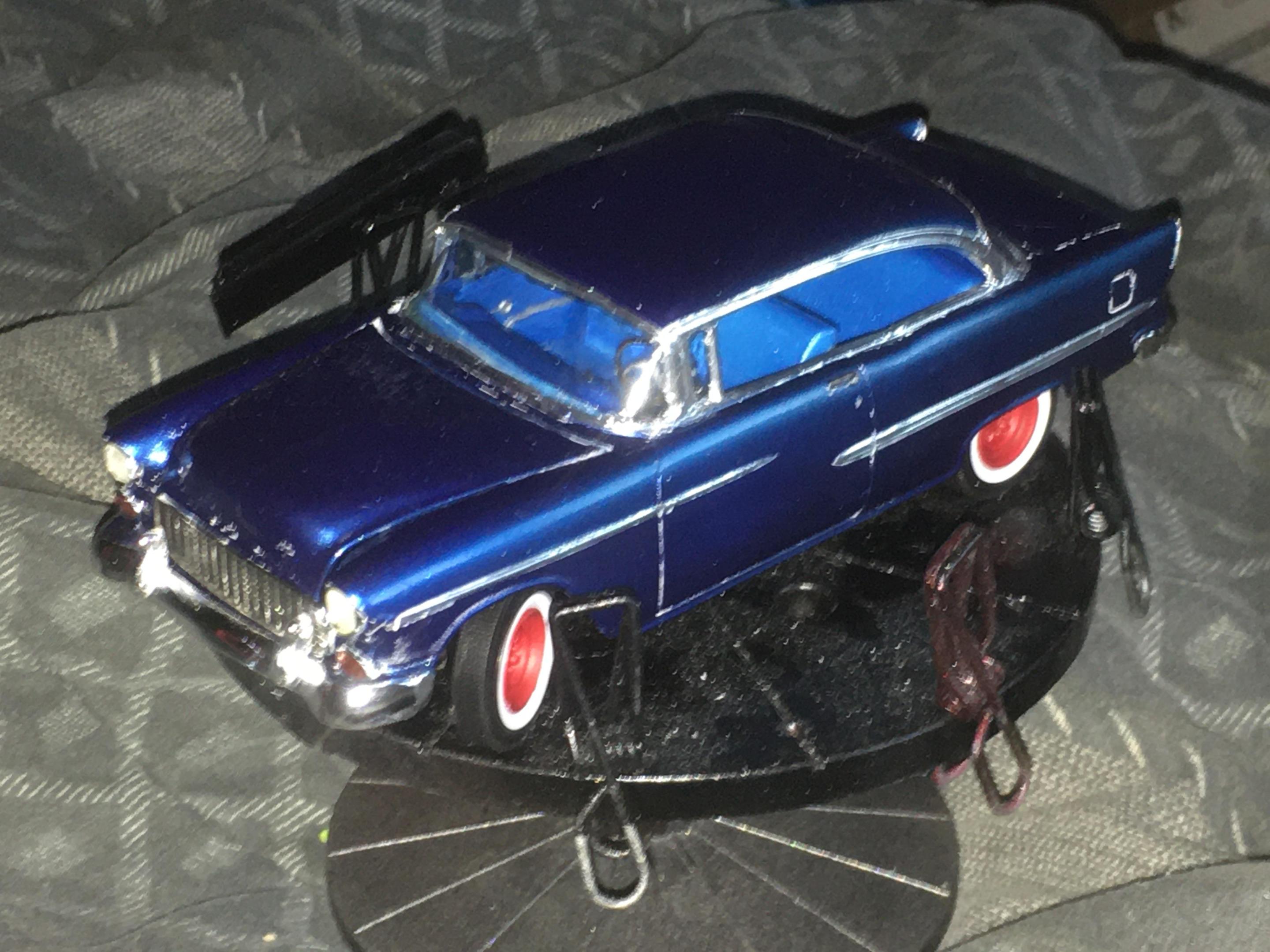 One of my neighbors had a 55 Chevy, I’m guessing back in the ‘60s. This color is as close to the actual blue that I was going for, in the slide picture. The actual color of the car looked blue at night and daylight, but if the sun hit the car just right, it looked green. When he had the car painted blue, it ended up being a Heinz 57 blue color. So here’s a picture of the slide, of the car, the kit I used, and the end result of the build.