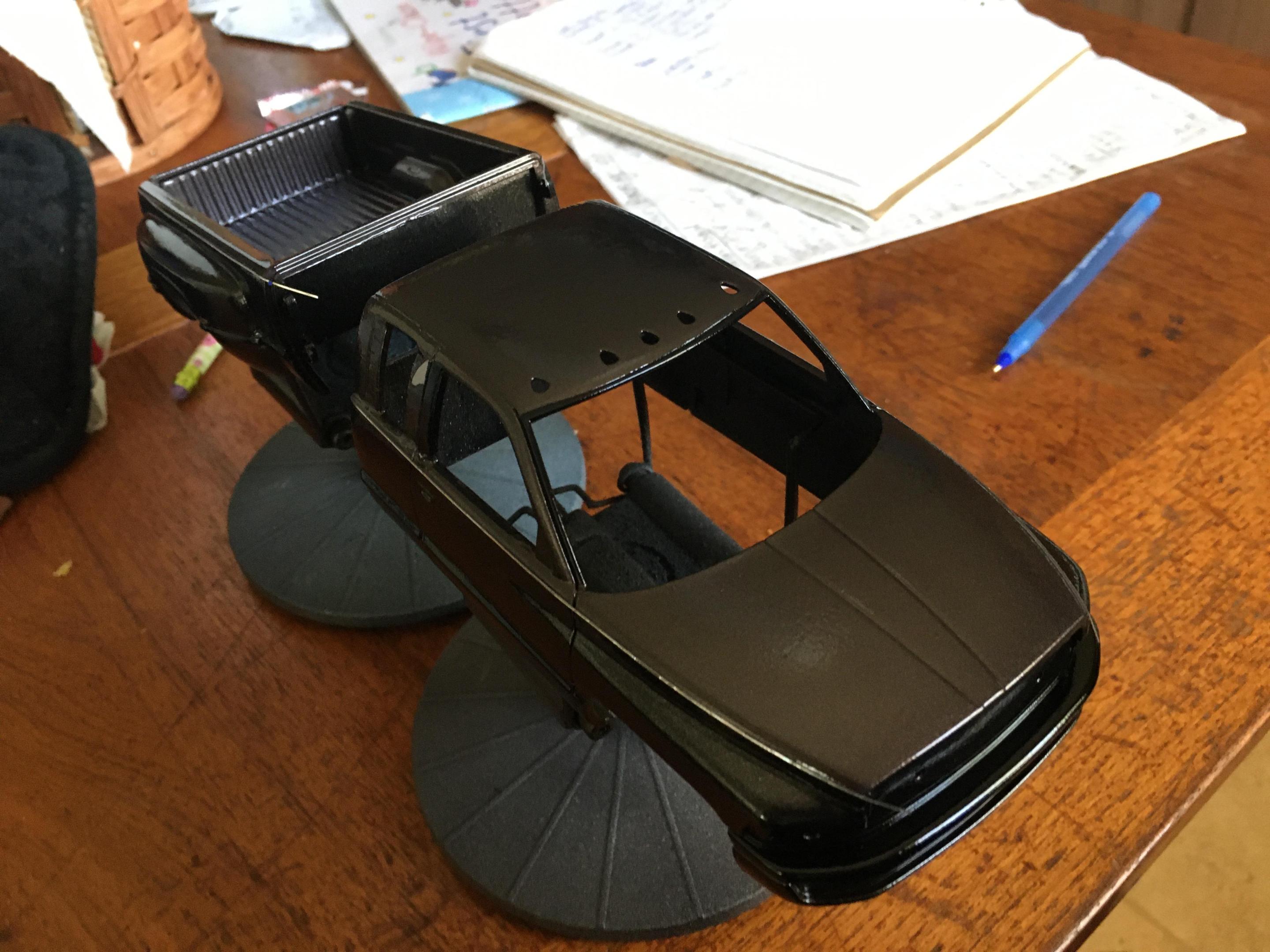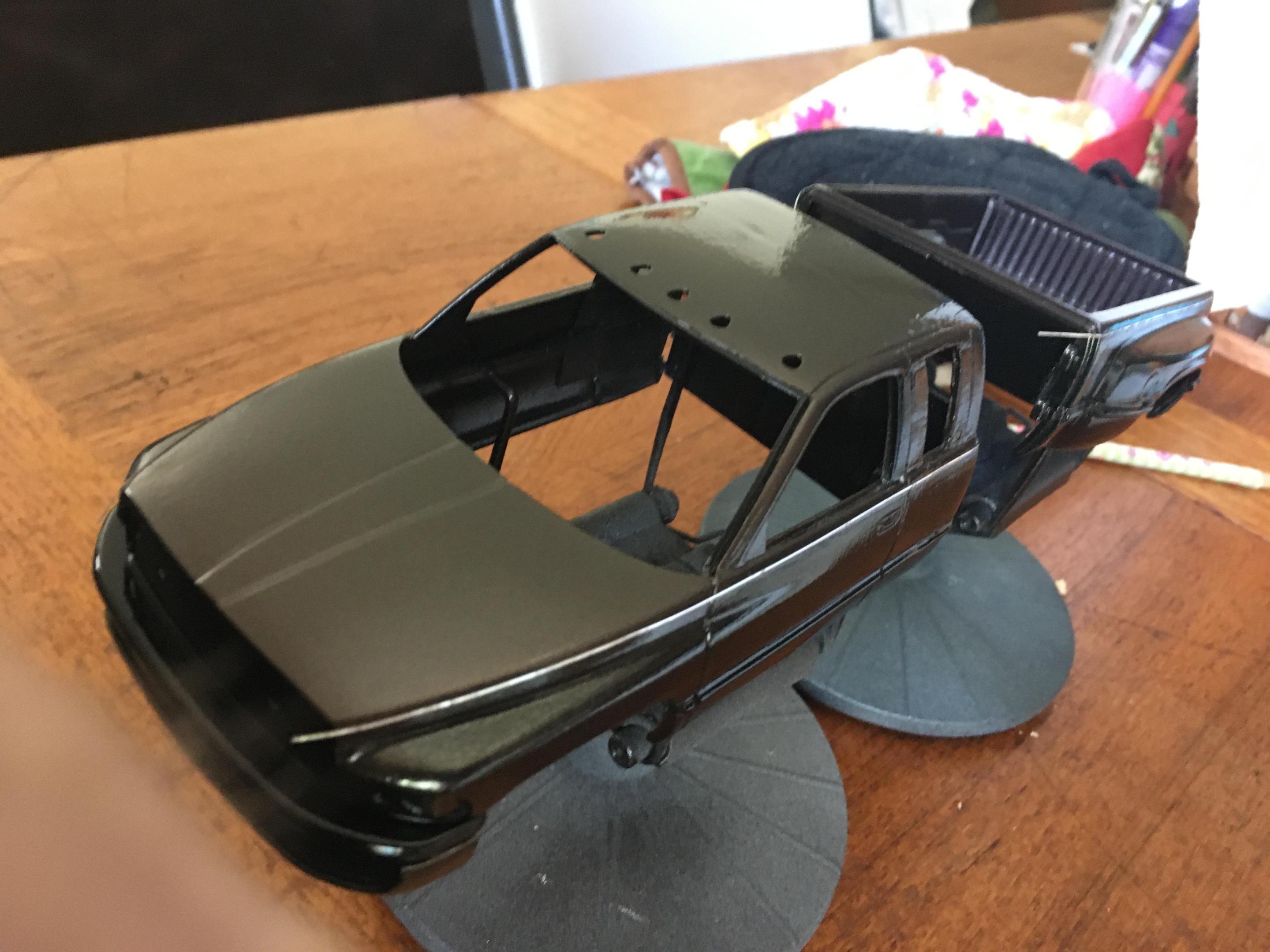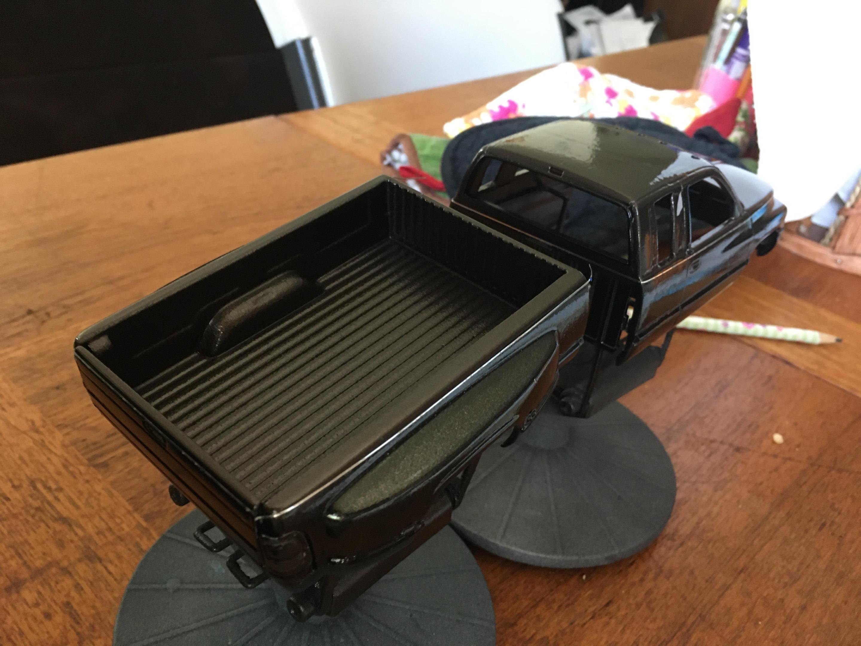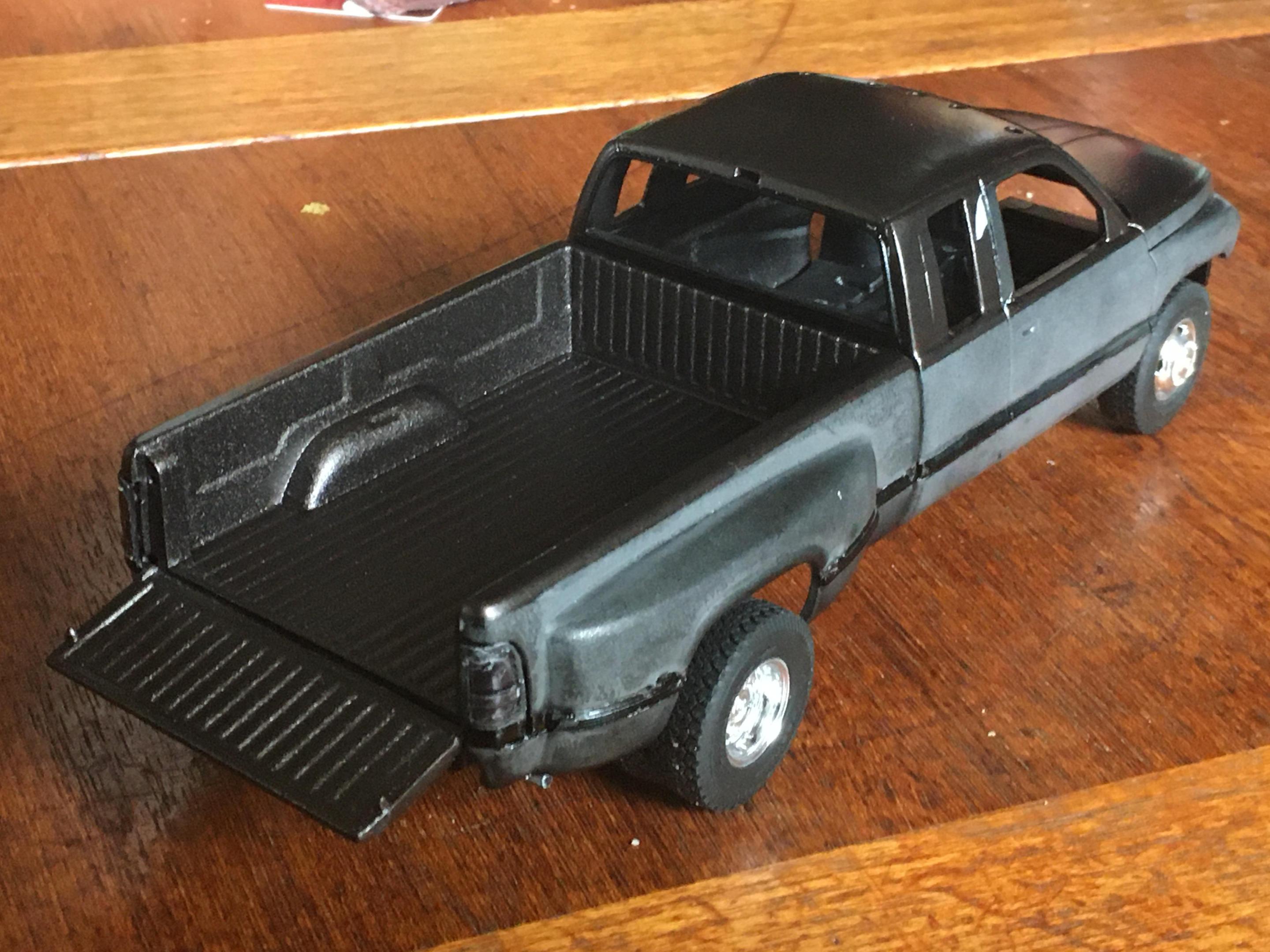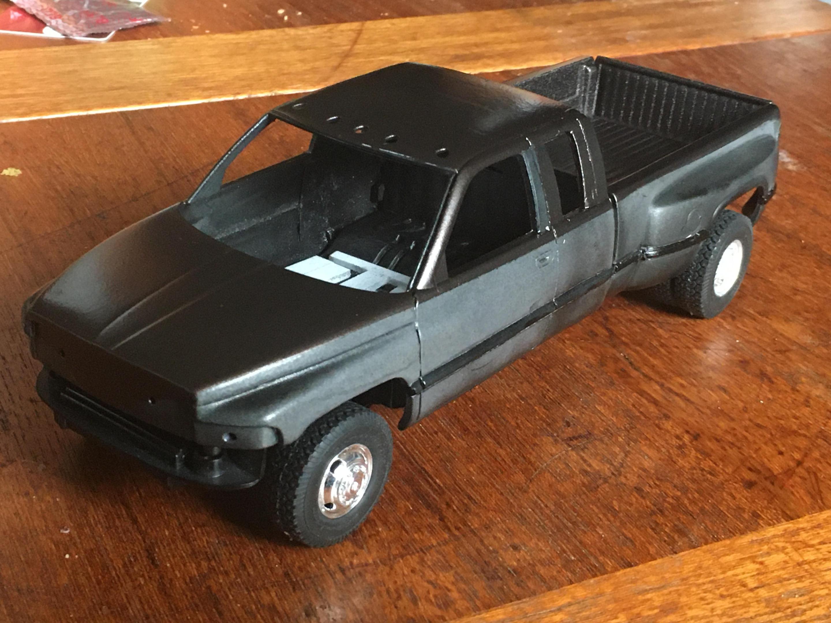 I have the truck painted. Now all I have to do is finish painting the front bumper, make the side rear windows, tint all of the windows, and detail paint the truck. I also need to finish up the interior as well. The tires are from Fireball Modelworks and I chose to do a body color spray in bed liner. -