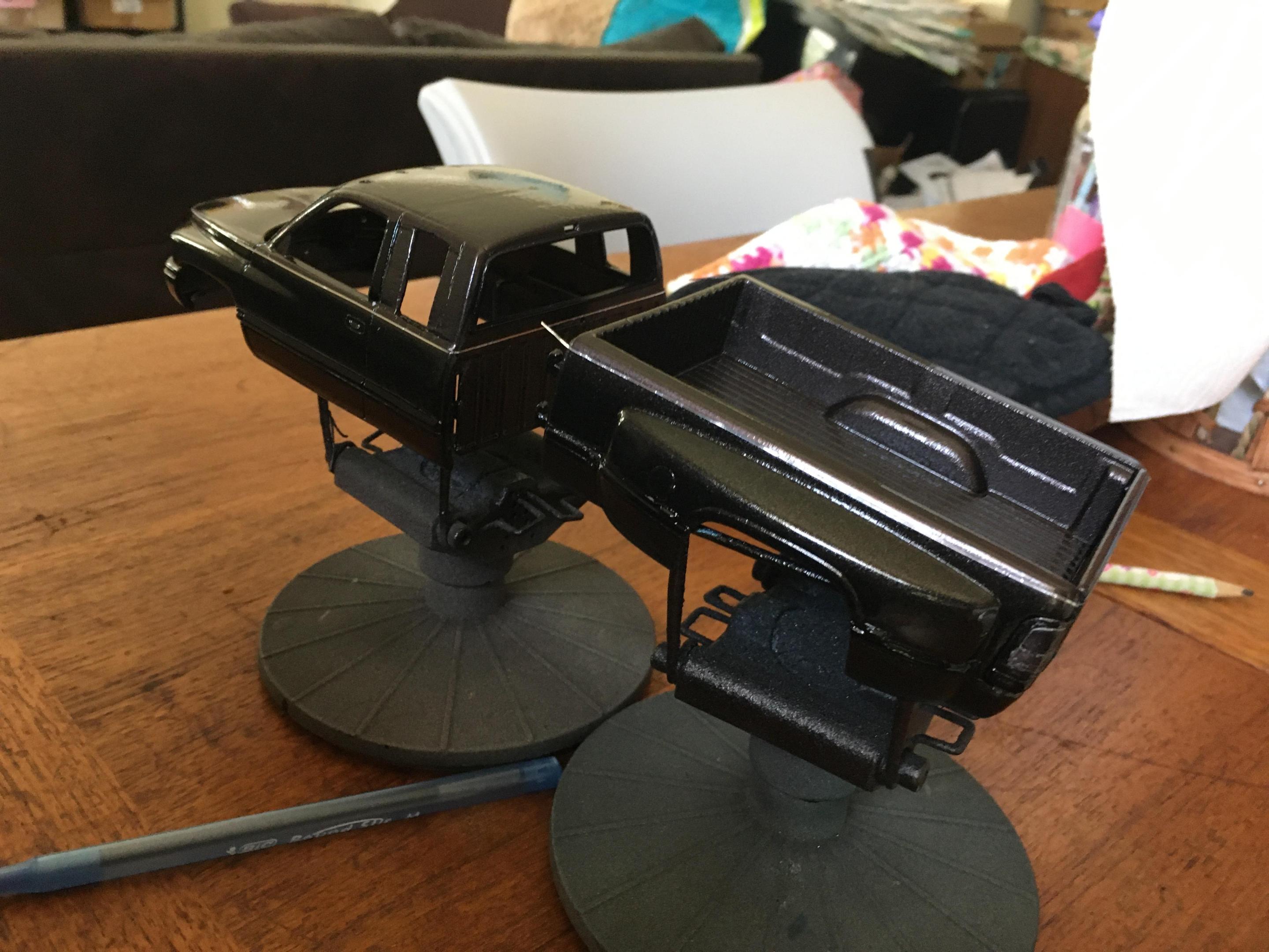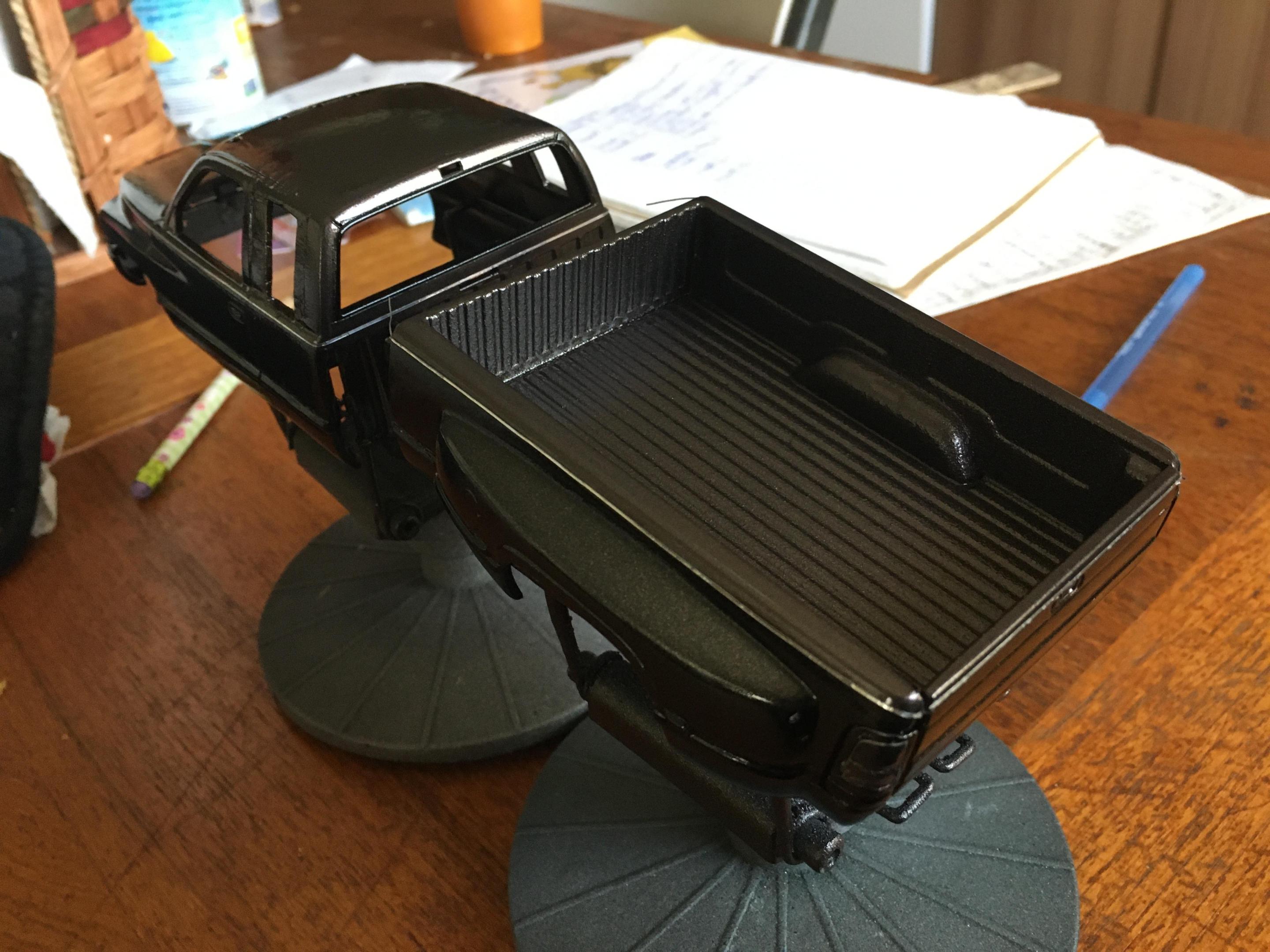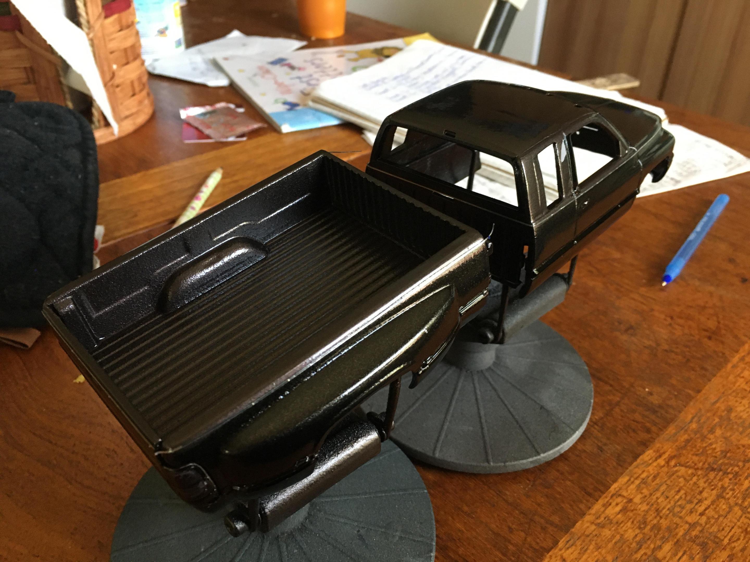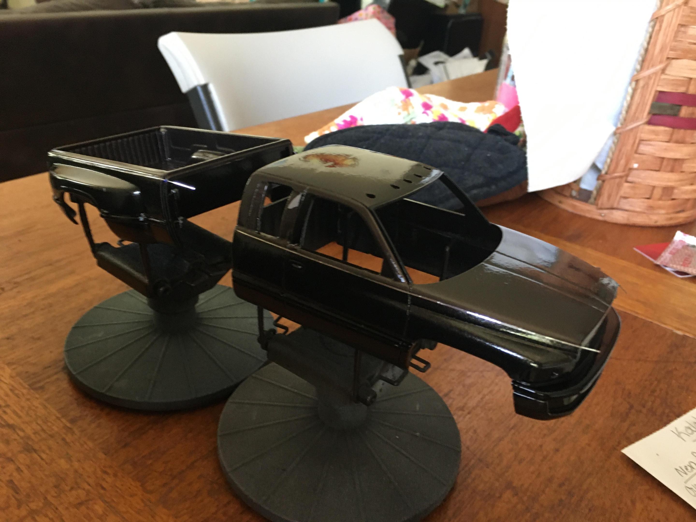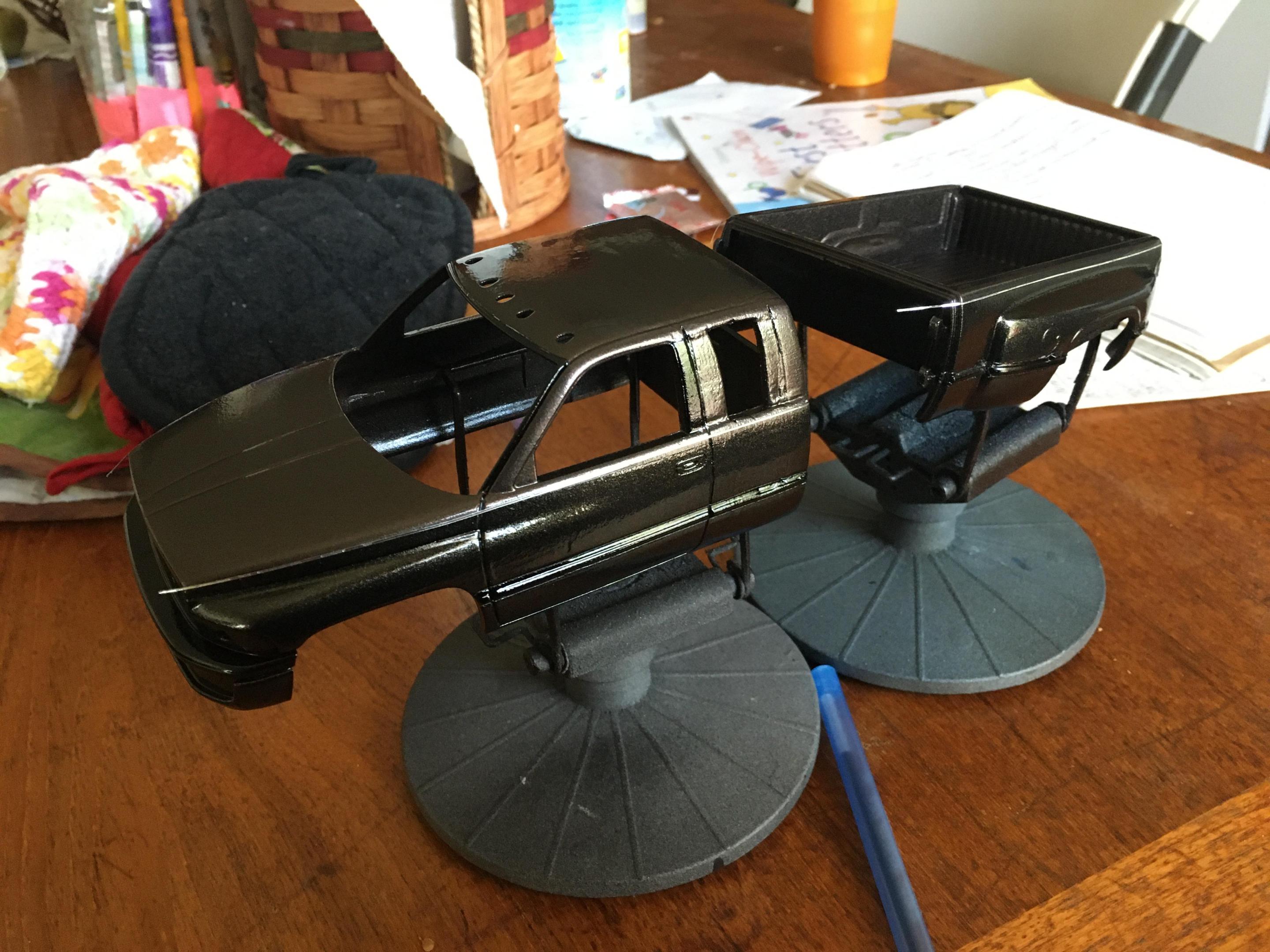 I have the truck painted. Now all I have to do is finish painting the front bumper, make the side rear windows, tint all of the windows, and detail paint the truck. I also need to finish up the interior as well. The tires are from Fireball Modelworks and I chose to do a body color spray in bed liner. -