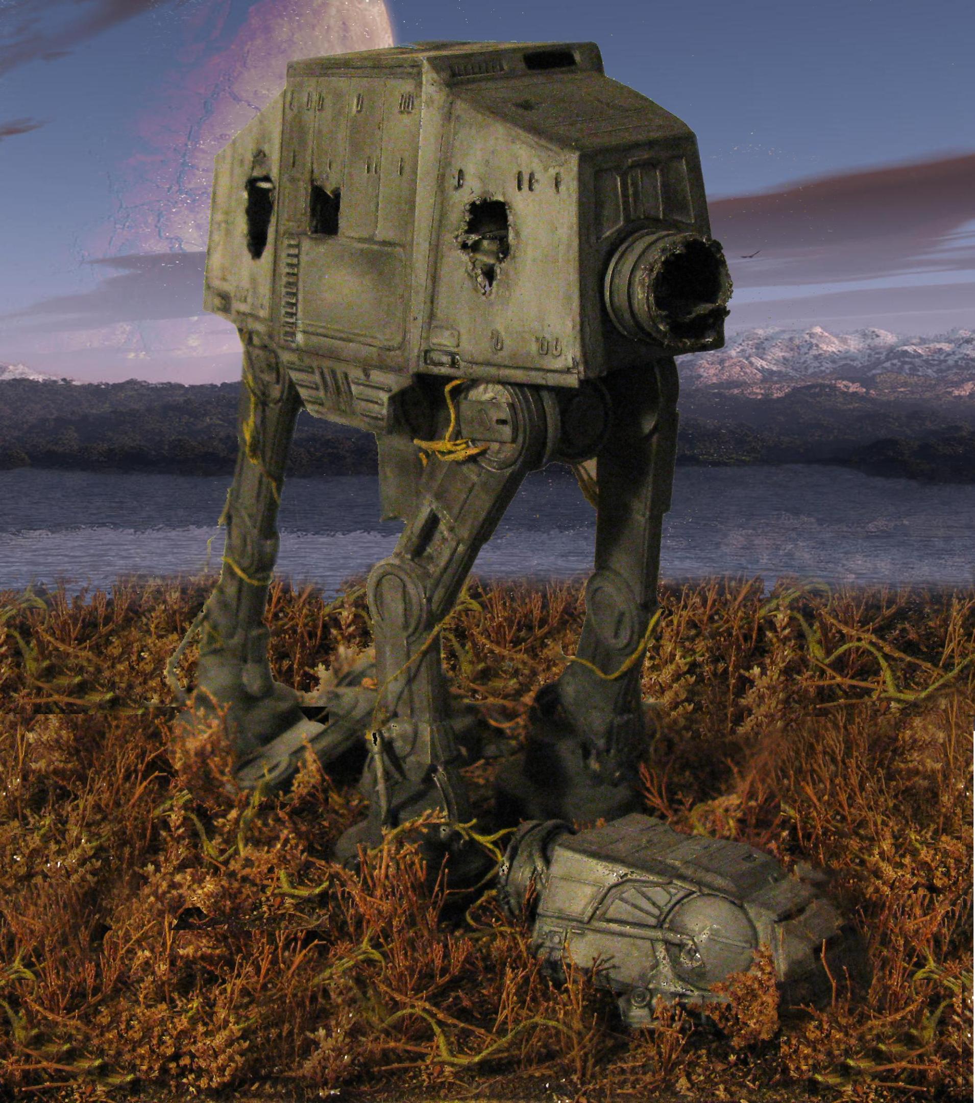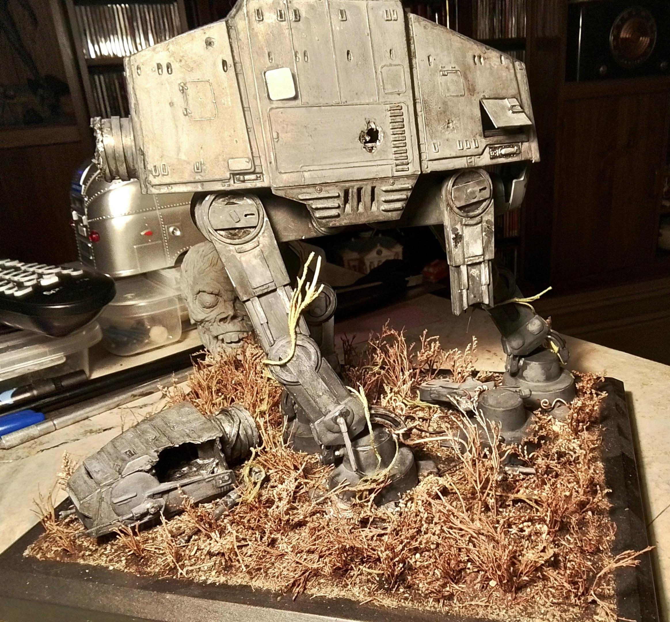 AMT 1968 Chevelle body mounted on a modified stocker chassis, with scratch built interior and roll cage. Rubber padding on roll cage is insulation from a coax cable. The window netting is hand-made from masking tape. The front and rear bars are scratch built from styrene tubing. Aftermarket "Hoosier" lettering on the tires. The dents were made by heating the body from the inside with a soldering iron, then pressing into the softened plastic with a hobby knife handle. The clay is actual yard clay, sifted to a fine powder, mixed with white glue and spattered from a toothbrush. The second picture has a background added with photoshop.
