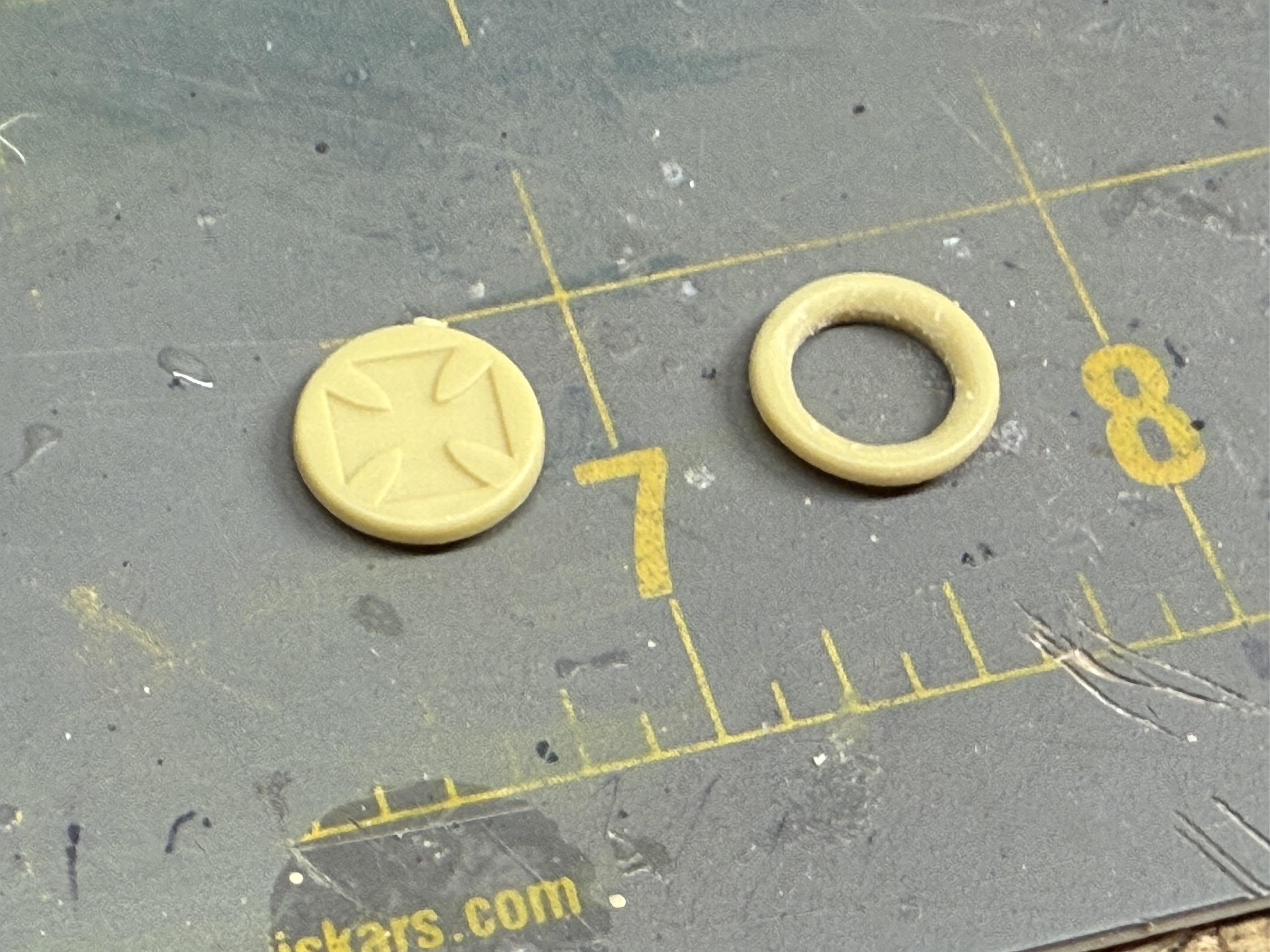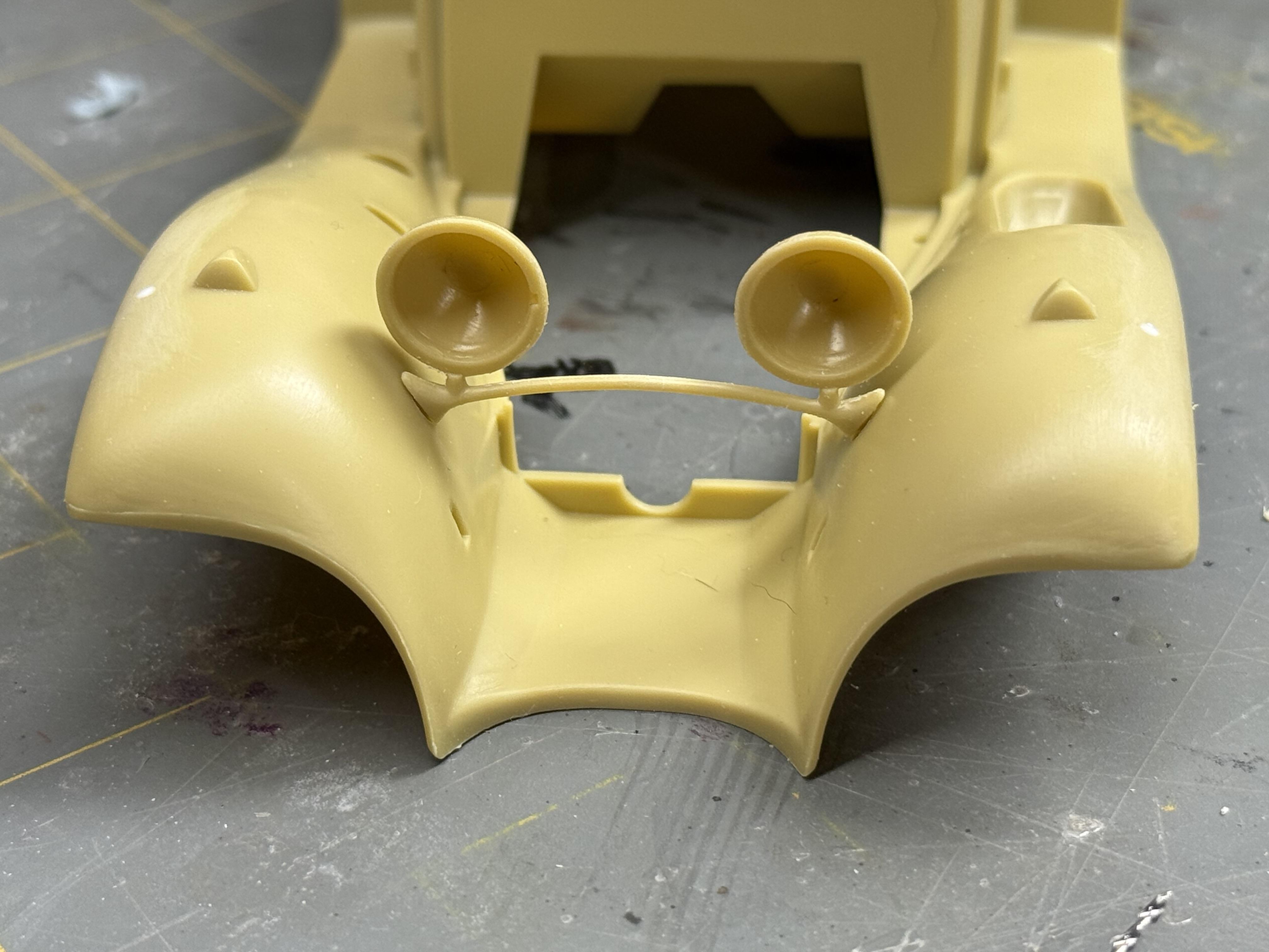 Mock up on chrome wheels and track. Loosing the military look and leaning into the hot rod look. Tedious work on headlights to keep the ring but remove the iron cross. Always the details that take time. -