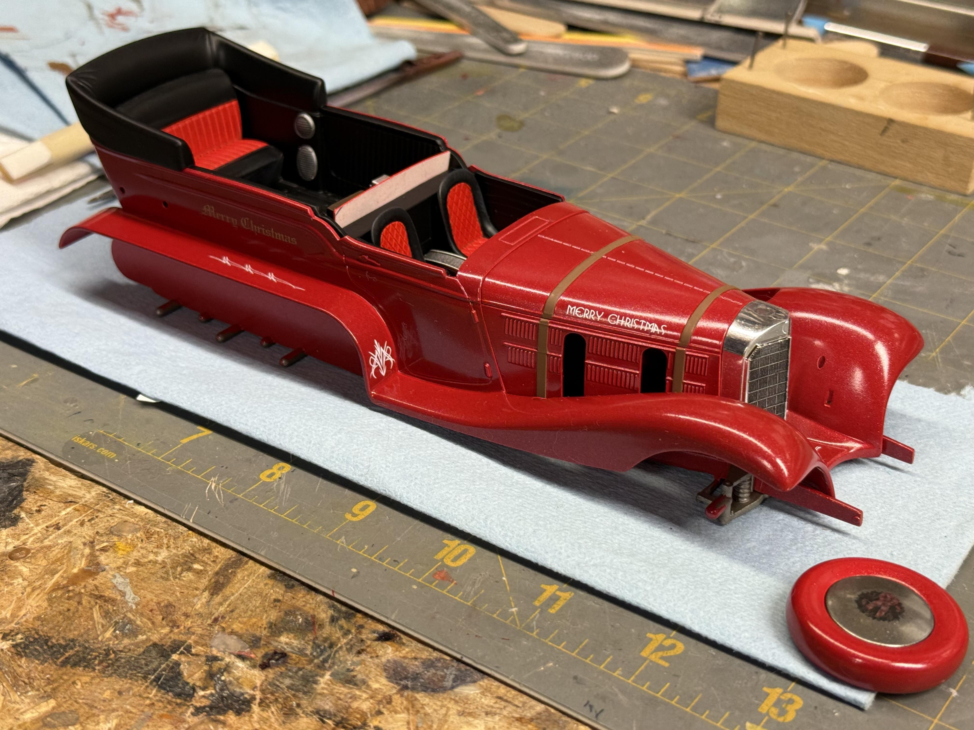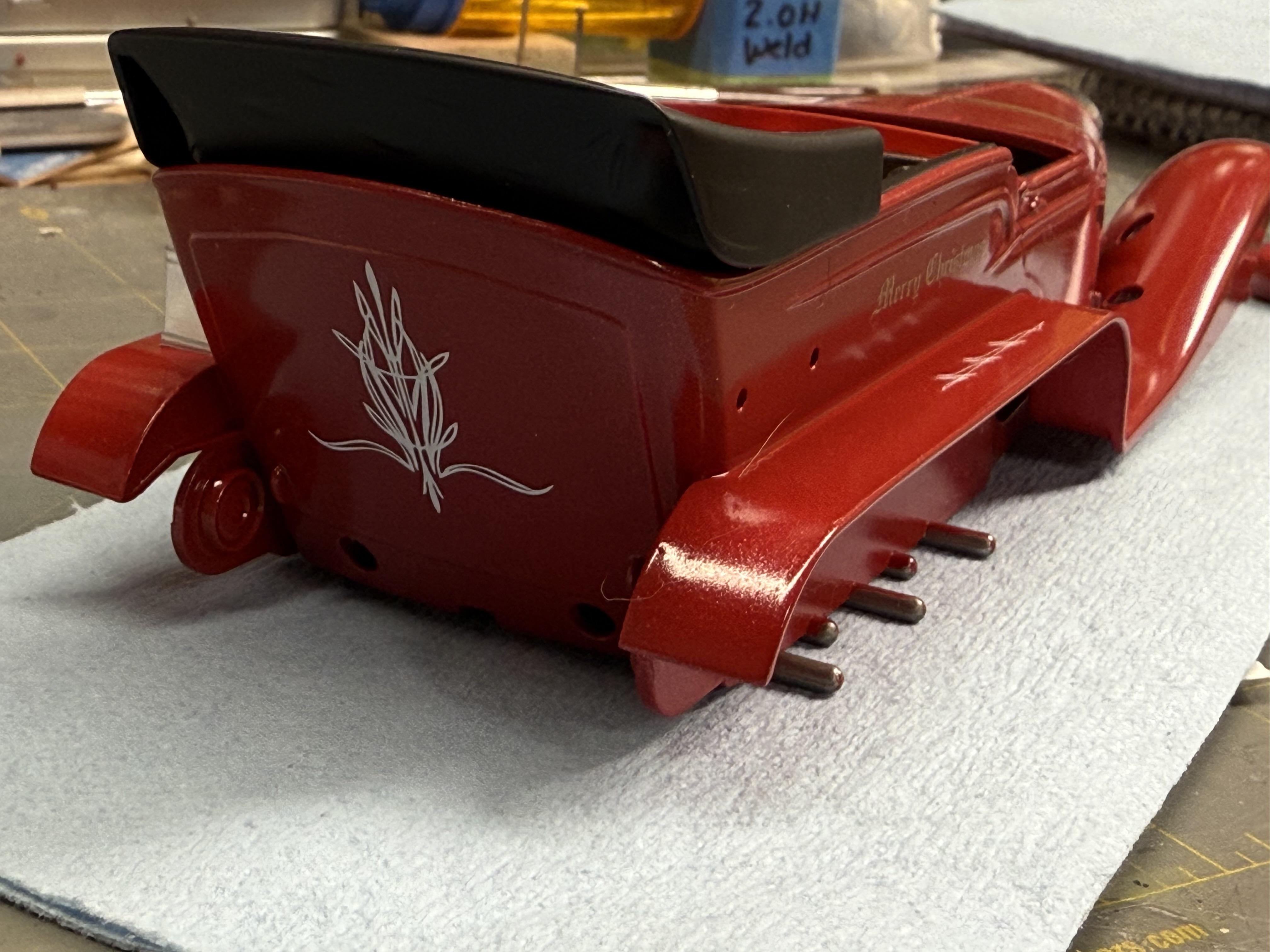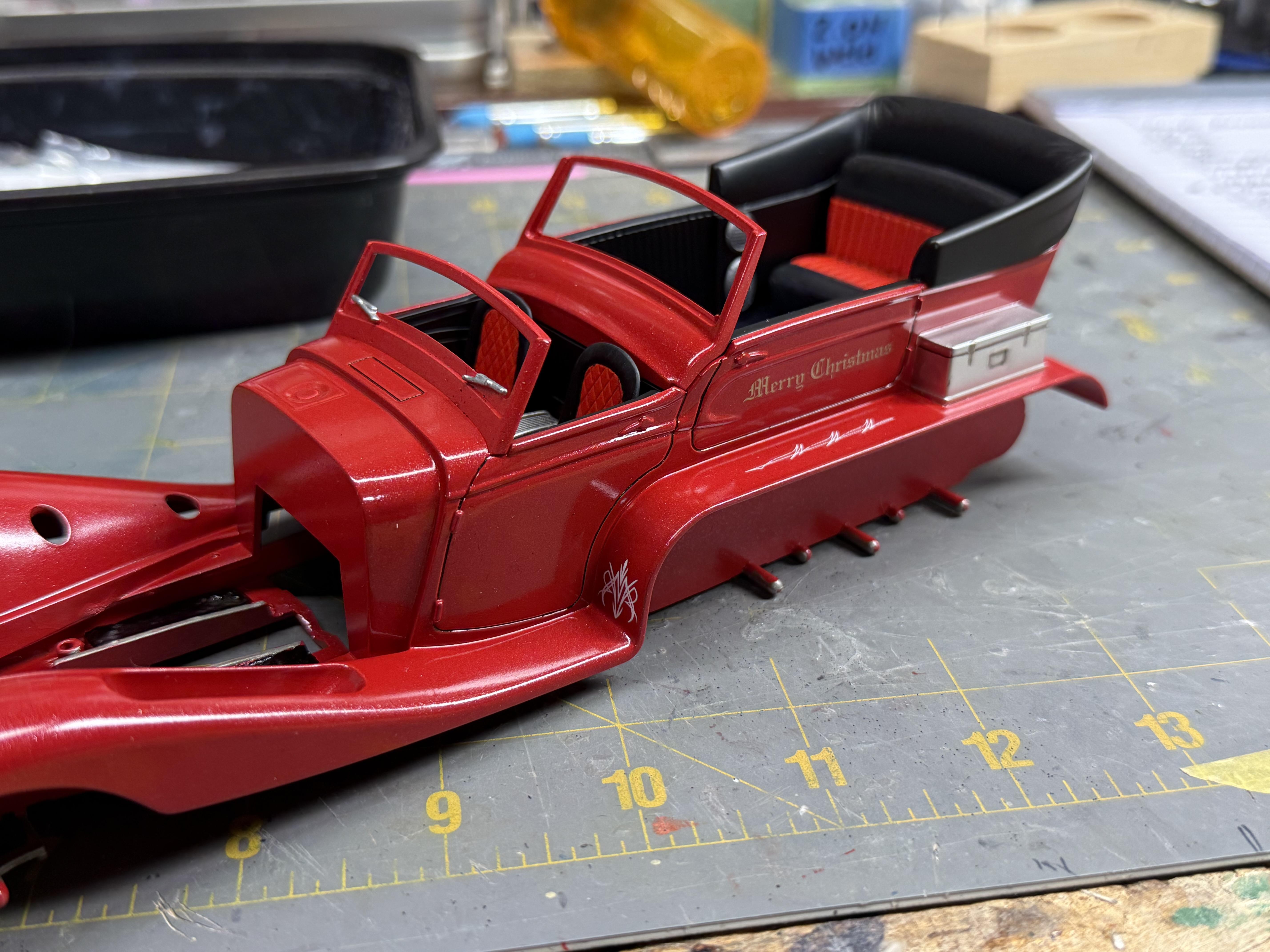 Base red is done, now wet sanding and then a pearl clear. A long way from done, but closer to the big night! Santa needs his ride! -