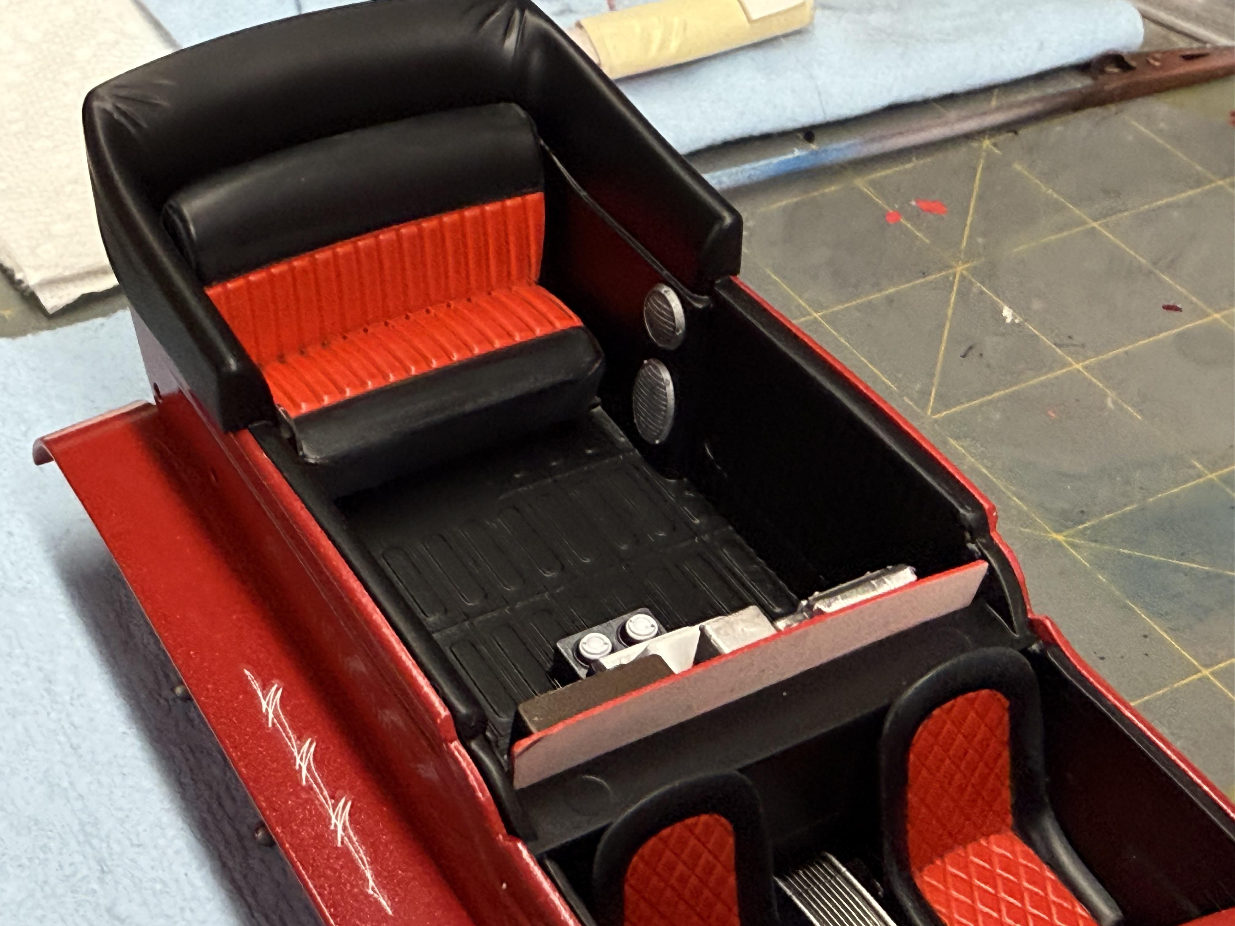 Working on the interior now. The front seat had the military look as it was the Rommel Rod. But if it is going to be a Hot Rod, it needs hot rod seats. And the VCG Resins Falcon arm rest looks super cool in there too. -