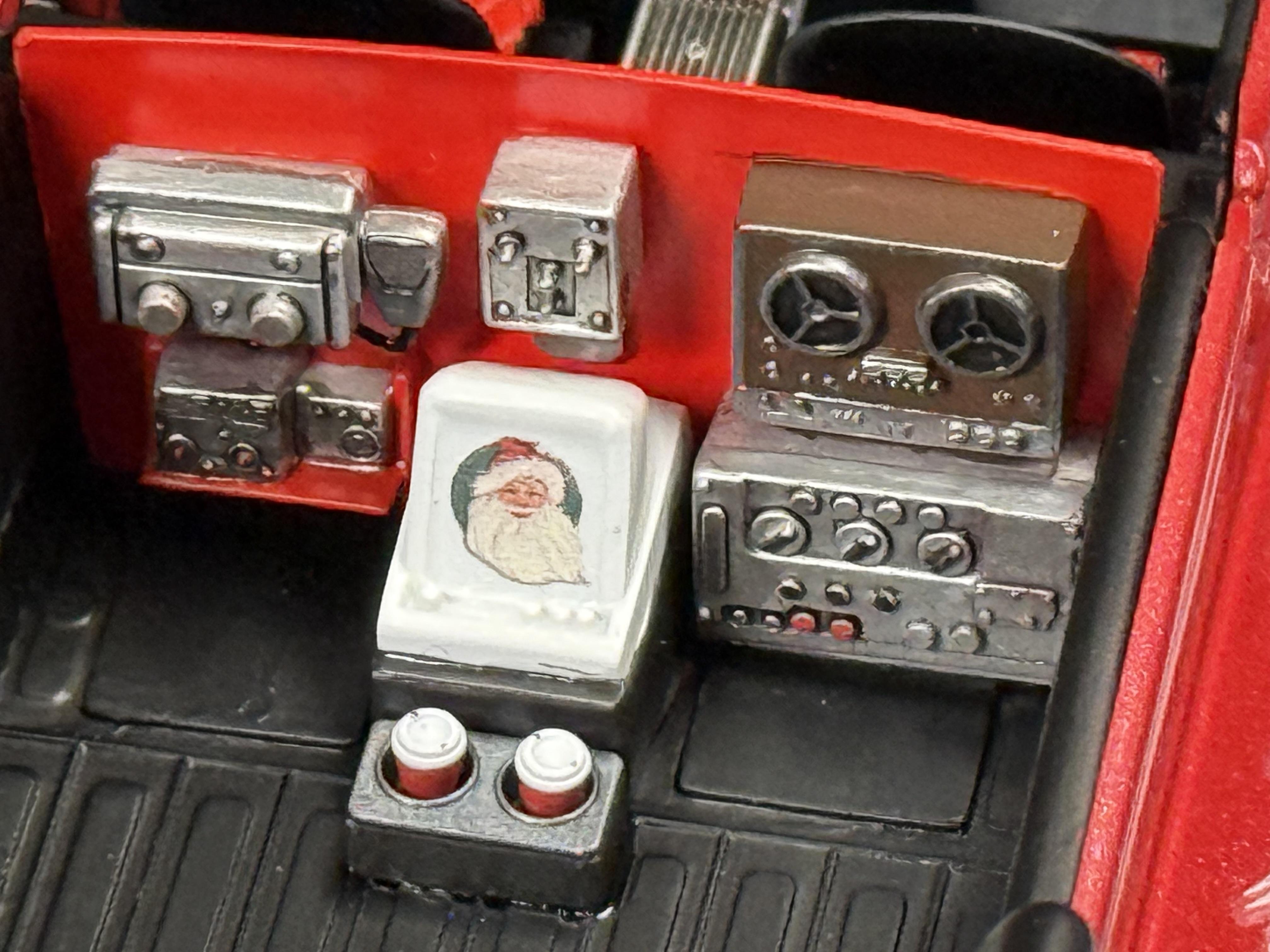 Changing it up from military to what Mr Claus would want to bring to Cars and Coffee! 1929 Ford bench seat, tv, reel to reel, telephone and a cb. The tracks looks so much better in chrome, and some Christmas lights for taillights and turn signals. -