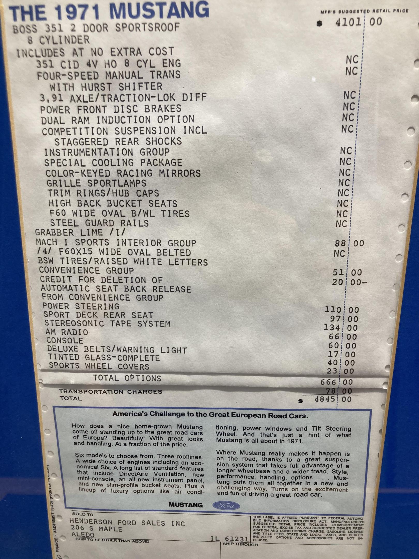 9. Hi, I am a little late to this thread but that was my Boss 351 they scanned for the model. It was ordered with Sports Wheel Covers for $23 according to the Marti report. The car is not perfect but overall pretty good. I have not heard when the model is coming out.